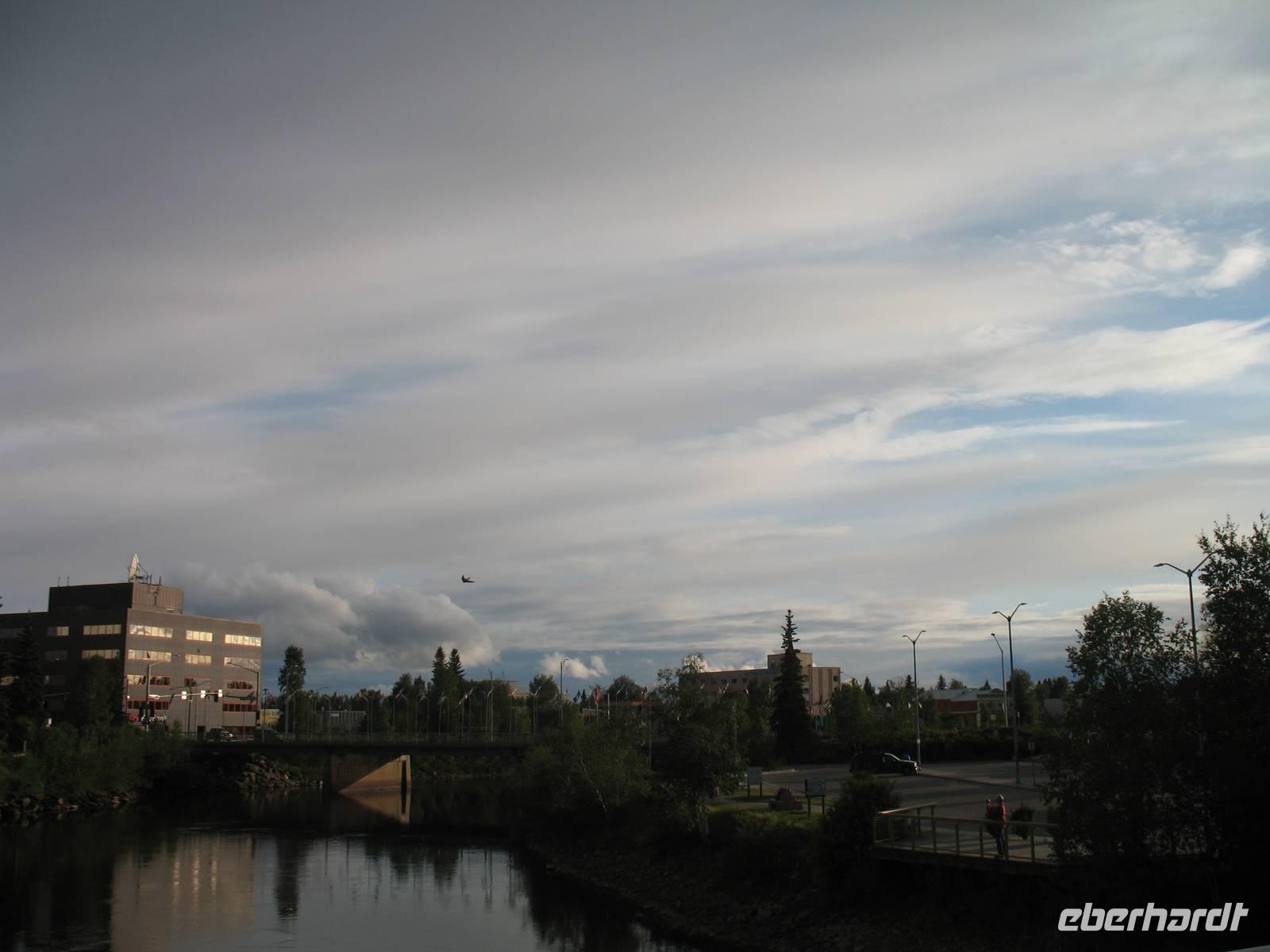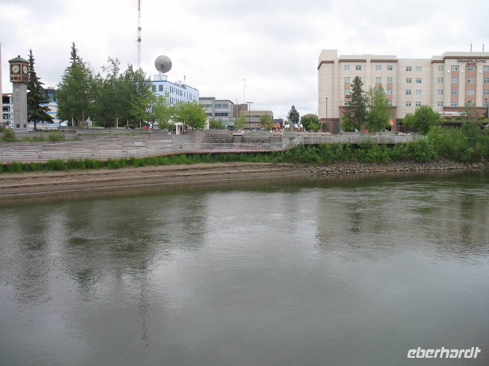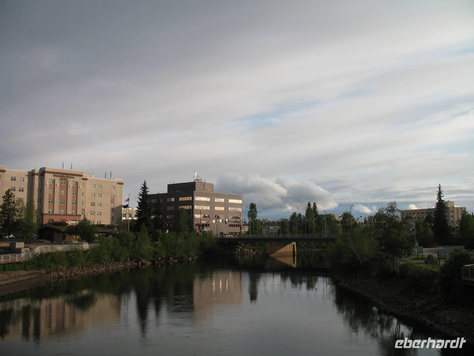 Dieser Tag steht ganz im Sinne der Frage: "Wo steht das Haus?" Dazu aber später mehr :-) Nach einer kurzen Nacht treffen wir uns alle mit unseren Koffern, um gemeinsam zum Bahnhof von Anchorage zu fahren. Das erste Highlight unserer spannenden Reise wird die Zugfahrt im Denali Star Gold Service von Anchorage nach Fairbanks sein, welche rund 568 Kilometer beträgt. Die Busfahrt zum Bahnhof dauert nur wenige Minuten und wir checken nach 07.00 Uhr unsere Koffer ein. Die freie Zeit bs zur Abfahrt 08.15 Uhr nutzen wir unter anderem zum Kauf von Ansichtskarten oder Getränken in der kleinen Bahnhofshalle. Dann geht es auch schon los ;-) Das Zugabteil besteht aus zwei Etagen. Auf der oberen Ebene sind unsere Sitzplätze. Wir haben das Glück, dass wir auf der Fahrt von Anchorage bis Denali freie Sitzplatzwahl haben. Während der Fahrt werden wir mit Frühstück, Mittagessen und Abendessen versorgt. Gegen 09.00 Uhr haben wir die Wahl zwischen einem herzhaften Frühstück mit Ei, Rentierwurst und Toastbrot, French Toast oder Jogurt. Denn Hunger haben wir jetzt auch!!! Dann genießen wir wieder die tolle Aussicht und traumhafte Landschaft. Jedes Zugabteil besitzt zudem eine überdachte Aussichtsplattform. Draußen ist es zwar windig und kühl, aber wir haben vorgesorgt und zudem warme Sachen eingepackt, obwohl wir diese Sachen die kommenden Tage nicht unbedingt benötigen werden ;-) Während wir unser Frühstück gern so früh wie möglich einnehmen, haben wir es mit dem Mittagessen nicht so eilig. Dank eines sehr leckeren Frühstücks kann Mittag ruhig noch warten! Kommen wir nun aber zur Frage: "Wo steht das Haus?". Über Lautsprecher ist uns gesagt worden, dass bald ein sehr interessantes Haus kommen soll, das berühmte Dr. Seuss House bei Willow. Das Besondere ist, dass es ausschaut, als wären mehrere Häuser übereinander gebaut wurden. Einige von uns haben daraufhin bei kühlem Wind auf der Aussichtsplattform gewartet, bis endlich dieses Haus zu sehen ist. Jedoch werden wir auch nach mehrmaligen Nachfragen bei der Sprecherin im Zug andauernd vertröstet, dass es doch gleich kommen soll. Letztendlich haben wir das Haus aber verpasst, da es leider nur bei den ersten Waggons rechtzeitig angekündigt wurde, bei uns ist dies leider zu spät erfolgt. Daher trägt dieser Tag den Titel: "Wo ist das Haus?" :-) Am Nachmittag gegen 14.00 Uhr begeben wir uns wieder in den Esswaggon auf der unteren Ebene. Das Mittagessen mit der Wahl zwischen Salat, Sandwich, Burger oder eine Art Schmorbraten ist genauso köstlich wie auch schon das Frühstück. Nach dem Essen genießen wir abermals die unglaubliche Aussicht bei einer sehr entspannten Zugfahrt. Einige erhaschen sogar einen kurzen Blick auf einen im Gras sitzenden Bären :-) Um 18.30 Uhr lassen wir uns ein weiteres leckeres Abendessen in Form von Weißfisch, Nudelpfanne, Hühnerbrust, Salat oder Suppe sowie ein besonders tolles Dessert schmecken. Dann erreichen wir auch schon unsere Endhaltestelle Fairbanks, wo wir um 20.00 Uhr ankommen. Wir holen unsere Koffer ab und fahren zum 2-Sterne-Plus-Hotel "Bridgewater Hotel" in Fairbanks, welches wir eine halbe Stunde später erreichen. Während der Großteil der Gäste sich nur noch auf ihre Zimmer zurückziehen möchte, unternehmen die anderen Reisegäste einen kleinen Spaziergang zum fünf Gehminuten entfernten "Golden Heart Plaza". Die Bergbaustadt Fairbanks ist besonders durch den ersten Goldfund 1902 des italienischen Einwanderers Felix Pedro bekannt. Das Pedro Monument zu seinen Ehren befindet sich heute rund 25 Kilometer von der Stelle der Stadt entfernt, wo er das Gold gefunden hatte. Damals zur gleichen Zeit ließ Captain E. T. Barnette zufällig eine Handelsstation am Flussufer des Chena River errichten. Zudem folgten nördlich von Fairbanks weitere beachtliche Goldfunde. Die Zeit des Goldrausches hatte also zu dieser Zeit begonnen! Nur ein Jahr später, nämlich 1903, hatte diese Stadt mit einer Dreiviertelmehrheit den Gemeindestatus erhalten. Nach unserem schönen Spaziergang freuen auch wir uns auf ein wenig Schlaf und wünschen eine gute Nacht!