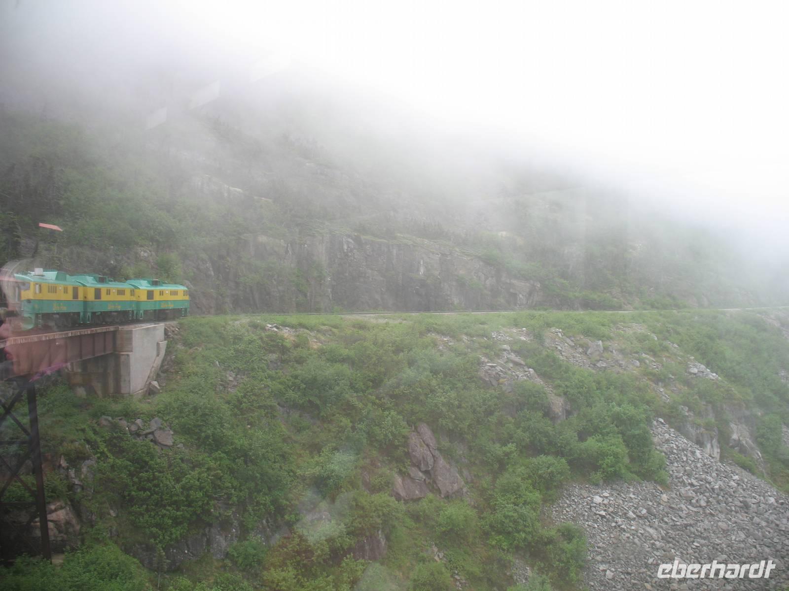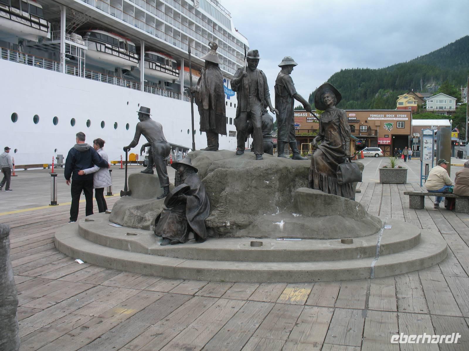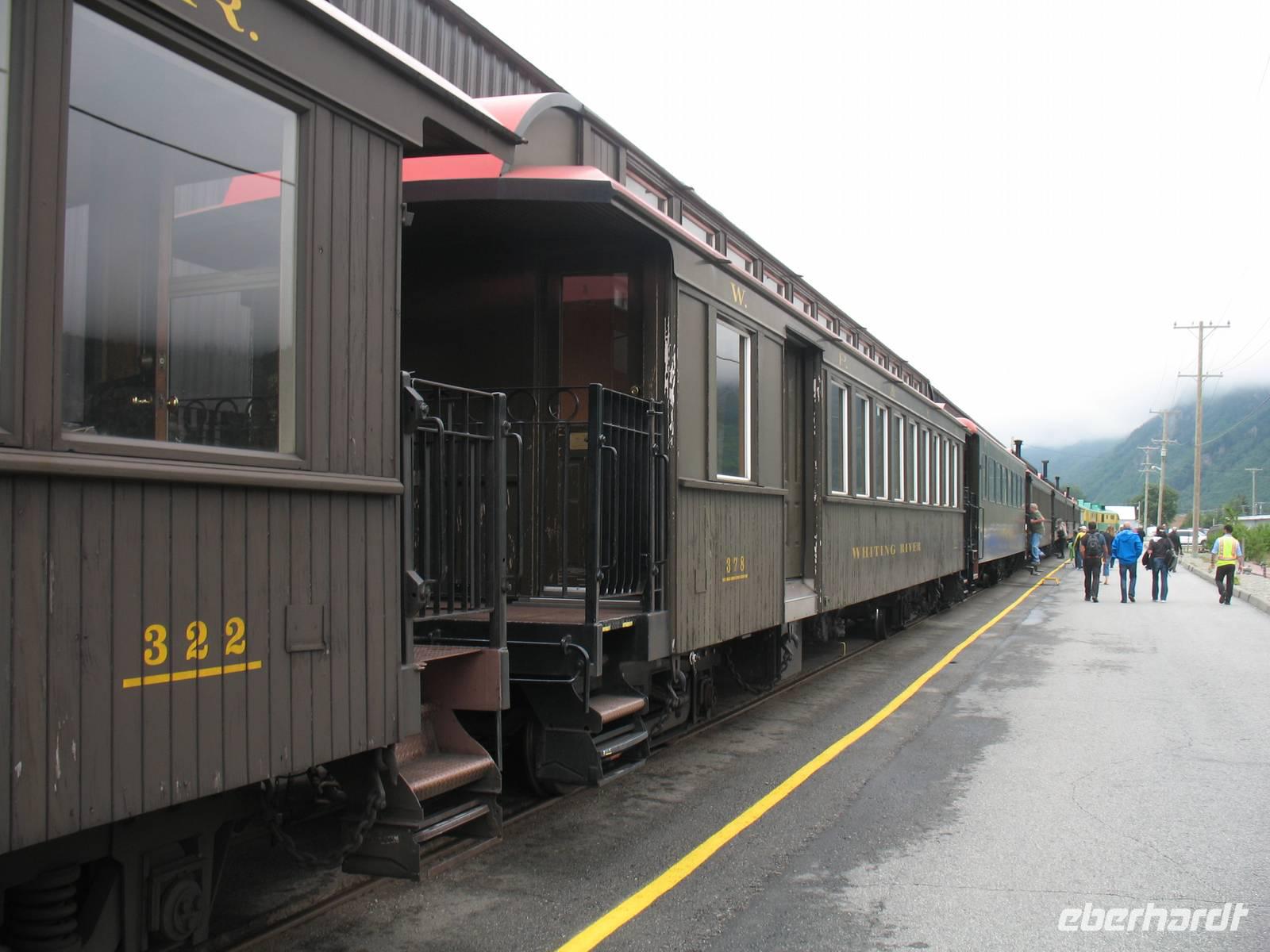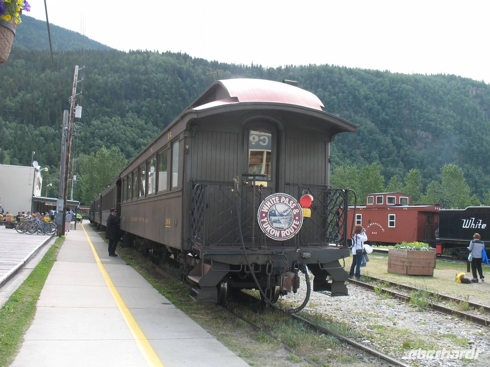 Unser heutiger Ausflug startet wieder sehr früh, so dass wir bereits gegen 06.45 Uhr frühstücken. Rund eine Stunde später treffen sich 15 Reisegäste zum gemeinsamen Ausflug "White Pass Scenic Railway" an der Rezeption auf Deck 5, um gemeinsam an Land zu gehen. Heute haben wir den Vorteil, einen deutschen Waggon zu haben, das heißt, die Übertragung im Zug ist in deutscher Sprache. Die Erklärungen und geschichtlichen Hintergründe während der Fahrt sind zudem mit Musik und Tiergeräuschen unterlegt. Dies gefällt uns wirklich richtig gut :-) Wir erfahren unter anderem, dass die Waggons Namen der schönsten Seen und Flüsse von Yukon, Alaska und British Columbia erhalten haben. Am 17. August 1896 wurde Gold in Klondike entdeckt, Ende Mai 1898 hatte der Bau der Route White Pass & Yukon begonnen und nur rund zwei Monate später am 21. Juli 1898 erfolgte der Einsatz der ersten Lokomotive. Die Zugfahrt dauert insgesamt 3,5 Stunden. Auf 32 Kilometer über dem Meeresspiegel steigt die Eisenbahn mit einer Erhebung von 3,9 Prozent auf über 900 Meter zum White Pass hinauf. Diese Schmalspurbahn besitzt ein drei Meter breites Gleisbett, die Schienen sind mit einer Spurweite von 914 Millimeter verlegt wurden und umfassen rund 177 Schienenkilometer. Die gesamte Strecke von Skagway bis zur Endhaltestelle Whitehorse in Kanada beträgt 110,4 Meilen. Wir werden aber nur bis zum White Pass fahren, also lediglich eine kleine Strecke von 20,4 Meilen bei einer Passhöhe von rund 873 Metern an der amerikanisch-kanadischen Grenze. Hier wird dann die Lokomotive umgehängt, die Stühle umgeklappt und die Seiten gewechselt :-) Während wir auf der Hinfahrt zum White Pass noch Nebel haben und die Aussicht nicht ganz so gut ist, erleben wir auf der Rückfahrt wieder Traumwetter. Aber wie sollte es auch anders sein, wir haben doch den Sonnenschein für unsere komplette Reise bestellt ;-) Die vorbeiziehende Landschaft ist wunderschön. Bei diesem Zug haben wir wieder die Möglichkeit, eine kleine Aussichtsplattform zu nutzen. Interessante Haltepunkte während unserer Fahrt sind zum Beispiel die Stationen "Denver" (5,8 Meilen), "Rocky Point" (6,9 Meilen), "Brackett Toad" (7,3 Meilen), "Buchanan Fels" (8,8 Meilen), "Black Cross Fels" (10,4 Meilen), "Stahlbrücke" (18,6 Meilen) und auch der "Pfad von 1898" (19,3 Meilen). Zudem passieren wir zwei Tunnel bei 16 Meilen und bei 18,8 Meilen. Gegen 11.30 Uhr erreichen wir den Bahnhof in Skagway. Während die Mehrheit der Gäste bereits jetzt aussteigt, besteht auch die Möglichkeit, zum Schiff zurückzufahren, Mittag zu essen und dann noch einmal in die Stadt zu gehen. Wir starten an diesem Tag erst um 17.00 Uhr in Richtung Ketchikan. In Skagway gibt es ebenfalls einen Saloon, obwohl derjenige in Juneau wohl eher originalgetreu erhalten ist. Einer der bekanntesten Persönlichkeiten dieses Örtchen ist der Kriminelle "Soapy" Smith, welcher seinen Namen aufgrund des Verkaufs spezieller Seifen erhalten hatte und auch durch sein Duell mit dem Landvermesser Frank H. Reid berühmt wurde. Weiterhin befinden sich viele Juweliere und Souvenirläden auf der Hauptstraße. In der Bibliothek ist zudem kostenloses WLAN vorhanden, wer dies eventuell benötigen sollte ;-) Spätestens 17.30 Uhr treffen sich einige Reisegäste wieder im Raum Borneo/Malaysia, um gemeinsam die wichtigsten Daten und Fakten für den Tagesauflug in Ketchikan am nächsten Tag zu besprechen. Den Abend lassen ein paar Gäste gemeinsam 20.00 Uhr im Menü-Restaurant "Four Seasons" bei sehr gutem Essen und leckeren Drinks ausklingen.