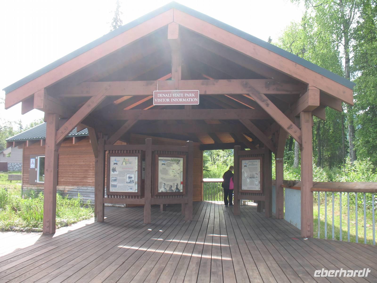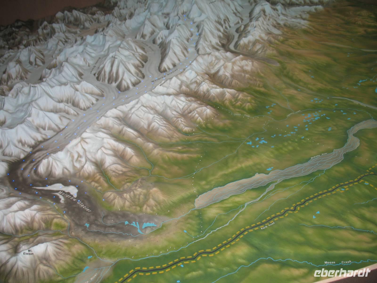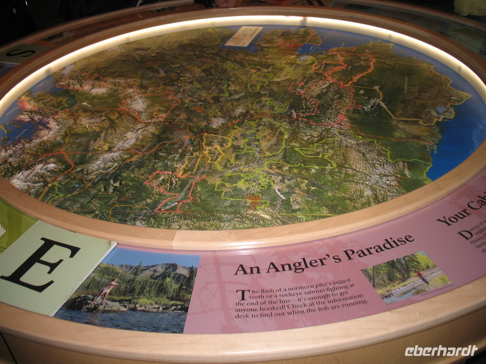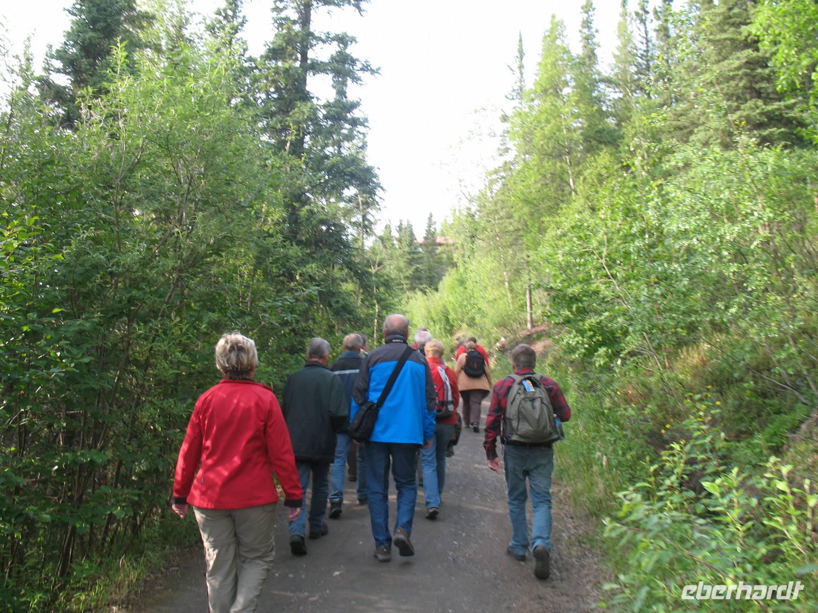 Gutgelaunt starten wir mit einem leckeren Frühstück in den Tag. Danach heißt es wieder Kofferladen, dazu treffen wir uns alle 08.30 Uhr am Bus. Während der Bus mit unserem Gepäck zur Touristeninformation vorfährt, unternehmen wir einen Stadtrundgang vorbei an der kleinen Kirche und dem "Golden Heart Plaza" bis zur Touristeninformation, von welcher wir ganz begeistert sind. Es gibt eine Menge Informationsmaterial, eine große 3D-Landkarte von Alaska und Nachbildungen zur Geschichte Alaskas. Kommen wir doch gleich zu ein paar Zahlen und Fakten. Unter anderem beinhaltet Alaska 17 der 20 höchsten Spitzen der USA und ist zudem weniger als drei Meilen von Russland entfernt. Bezüglich der Fläche ist der 49. Bundesstaat Amerikas größer als die vier größten Bundesstaaten zusammen. Zum Beispiel ist Kodiak die zweitgrößte Insel der USA. In Alaska sind über drei Millionen Seen zu finden. Zudem besitzt dieser Bundesstaat eine größere Küste als alle anderen US-Staaten zusammen. Wenn New York die gleiche Bevölkerungsdichte wie Alaska hätte, dann würden nur 16 Menschen in Manhatten wohnen!!!! Über die Hälfte der Bevölkerung lebt in Anchorage und Umgebung, mit rund 1.955 Quadratmeilen ist sie die größte Stadt Alaskas. Mehr als die Häfte der aktiven Gletscher weltweit gibt es in Alaska. Des Weiteren befinden sich 124 geothermische Gebiete in Alaska wie Chena, Circle, Melozi und Manley in der Nähe von Fairbanks, welche auch heiße Quellen aufweisen. Dies sind nur einige interessante Fakten über Alaska, dessen Geschichten und Mythen aber ebenso beeindruckend sind ;-) Bei unserem Rundgang sehen wir unterschiedliche Pflanzen und Bäume, besonders der Virginische Traubenkirschbaum "Choke Cherry" mit seinen weißen Blüten ist auffallend. Gegen 10.00 Uhr fahren wir zur Pipeline beim Alyeska Pipeline Visitor Center in Fairbanks. Hier legen wir einen Fotostopp von 20 Minuten ein. Danach führt uns unsere Reise weiter zum Supermarkt Fred Meyers in Fairbanks, wo wir unsere Mittagspause verbringen. Dieser Supermarkt ist einfach nur riesig und besonders die Auswahl an Obst und Gemüse ist großartig. Es gibt zudem eine Theke, wo bereits zubereitete Gerichte in individueller Menge gekauft und im Sitzbereich im Supermarkt gegessen werden können. Andere Gäste ohne gebuchter Halbpension haben hier die Möglichkeit, sich ausreichend mit Lebensmitteln, Salaten und Sandwich selbst zu versorgen. Gegen 12.30 Uhr fahren wir weiter zur Universität von Fairbanks mit kurzem Fotostopp. Rund eine Stunde später legen wir einen halbstündigen Zwischenstopp im Örtchen Nenana ein, bevor wir weiter nach Denali fahren. Einige Reisegäste spazieren durch den Ort, während andere Gäste sich einfach auf eine Bank setzen und die Sonnenstahlen auf ihr Gesicht scheinen lassen. Das Wetter verwöhnt uns nämlich :-) Während es in Deutschland eher kühl und regnerisch ist, haben wir strahlenden Sonnenschein. Aber wenn Engel reisen, dann lacht ja bekanntlich der Himmel! Die sonnigen Tage werden uns auf der Reise auch erhalten bleiben ;-) Am späten Nachmittag erreichen wir dann unser Hotel für die nächsten zwei Nächte, das 4-Sterne-Hotel "Grande Denali Lodge" in Parks Hwy, Denali. Das Hotel ist umgeben von großartiger Natur und besonders die ruhige Lage gefällt uns sehr, einfach perfekt zum Entspannen und um die atemberaubende Landschaft zu genießen :-) Die Gäste ohne gebuchter Halbpension sehen wir erst am nächsten Morgen wieder. Die Anderen haben rund zwei Stunden Freizeit bis zum Abendessen. Wir fahren gemeinsam mit dem Shuttle gegen 18.00 Uhr ins Restaurant "Denali Park Salmon". Unser Menüessen besteht aus Salat, Fish & Chips oder Surf & Turf sowie Kuchen. Dazu gibt es Wein, Bier und Softdrinks auf eigene Rechnung. Das Essen im sehr rustikalem und urigem Restaurant schmeckt uns gut. Während der Großteil der Gäste auf den Busshuttle wartet, spazieren zwei Gäste und Hannelore zum Hotel zurück. Der Weg wirkt dabei länger als gedacht :-) Unsere Spaziergänger sind aber noch vor uns am Hotel, also wollen wir am nächsten Tag die Strecke ebenfalls testen! Wieder zurück im Hotel freuen wir uns schon auf eine angenehme ruhige Nacht!