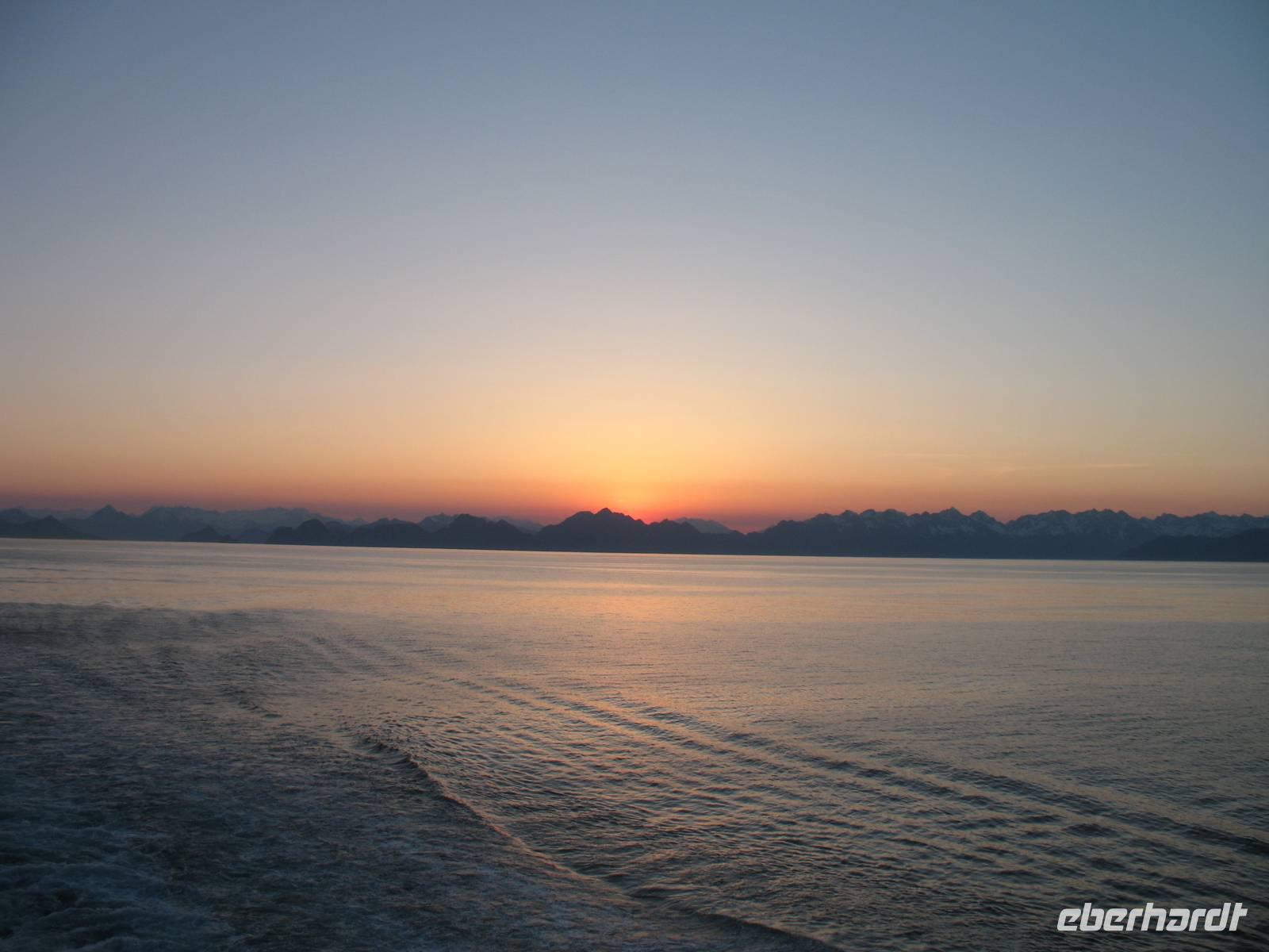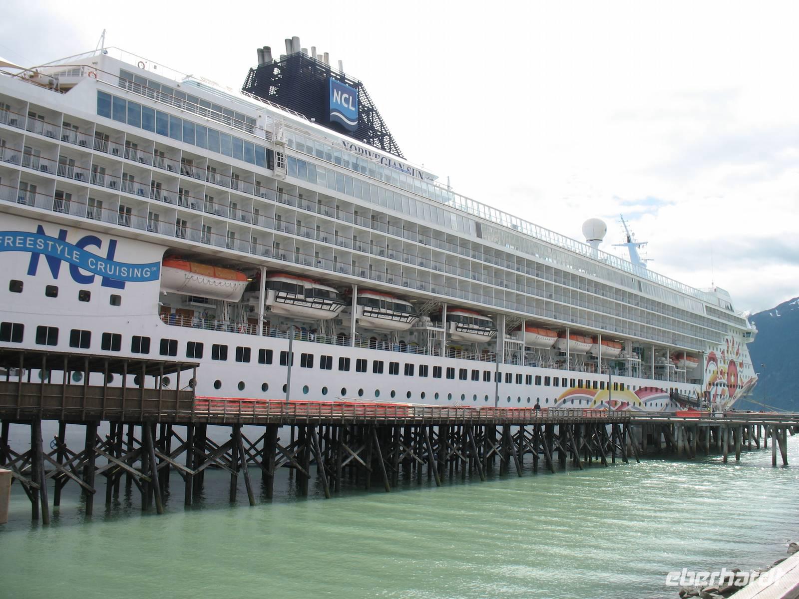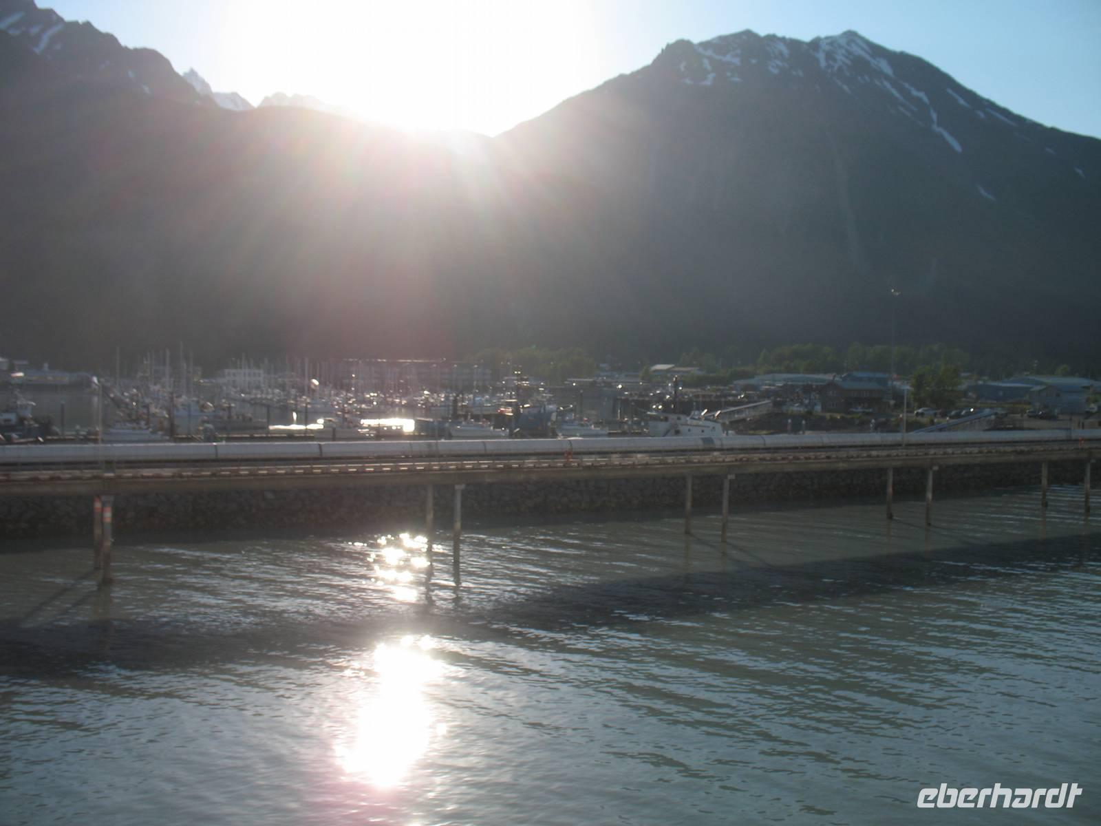 Am heutigem Tag werden wir wieder bei strahlendem Sonnenschein geweckt. Das Frühstück ist zwar ein wenig chaotisch, aber wir fahren heute auch weiter, daher lassen wir uns davon nicht die gute Laune verderben :-) Um 08.00 Uhr starten wir zu einem gemeinsamen Spaziergang zum Resolution Park. Danach geht es wieder zum Hotel zurück. Bevor wir die Koffer im Bus verladen, versehen wir sie noch mit den Kofferanhängern mit unserer Kabinennummer und Namen für die Einschiffung auf die Norwegian Sun. Denn heute Nachmittag startet schon unsere Kreuzfahrt durch die Inside Passage von Seward, Alaska bis nach Vancouver, Kanada. Dann starten wir mit dem Bus und treffen gegen 09.00 Uhr beim Alaska Native Heritage Center in Anchorage ein. Zuerst werden uns die verschiedenen Sportarten der Einheimischen erklärt und auch vorgeführt. Im Anschluss laufen wir durch das Außengelände, wobei wir auch kleine süße Husky-Babyhunde sehen. Nach unserem Rundgang erhalten wir eine Vorführung verschiedener Stammestänze und deren Bedeutung für die Einheimischen wird uns erklärt. Ungefähr um 11.30 Uhr starten wir in Richtung Seward. Unterwegs legen wir eine kurze Bio-Pause ein, bevor wir gegen 15.00 Uhr in diesem Ort ankommen. Wir unternehmen noch eine kleine Stadtrundfahrt. Dann fährt uns der Busfahrer auch schon zu unserem Kreuzfahrtschiff, die Norwegian Sun. Wir bedanken und verabschieden uns herzlich von Hannelore und wir wünschen ihr natürlich alles Gute. Danach geht es auch schon zum Check-In. Diejenige Gäste, welche gern mit Kreditkarte bezahlen möchten, müssen noch ihre Kreditkartendaten angeben. Zudem sollen alle auch ein Gesundheitsschein beim Check-In ausfüllen. Nachdem die formellen Dinge erlegt sind, geht es durch die Sicherheitskontrolle zum Schiff. Hier teilt sich die Reisegruppe bereits, aber wer möchte, nimmt später an einer gemeinsamen Schiffserkundung mit der Reisebegleitung teil. Für diejenigen, welche zum ersten Mal eine Kreuzfahrt unternehmen, kann das Schiff auf einen schon sehr überwältigend wirken. Aber nach ein oder zwei Tagen kennen sich alle ganz gut auf dem Schiff mit seinen zwölf Stockwerken aus :-) Am späten Nachmittag um 17.00 Uhr trifft sich ein Großteil der Gruppe zur gemeinsamen Schiffserkundung. Wir besichtigen die verschiedenen Bars, das Theater und die Bibliothek sowie die verschiedenen Restaurants. Die meisten Gäste essen heute im Buffet-Restaurant zu Abend. Um 20.30 Uhr findet die für jeden Passagier verpflichtende Sicherheitsübung statt, wobei der jeweilige Standort mit einem Buchstaben auf der Zimmerkarte aufgedruckt ist. Dabei treffen sich auch einige Gäste wieder, deren Zimmer nebeneinander oder in der Nähe liegen. Um 21.00 Uhr legt das Schiff ab. Besonders schön ist der traumhafte Sonnenuntergang mit Blick auf das weite Meer. Heute können wir sicher super gut schlafen und von den kommenden Abenteuern träumen :-)