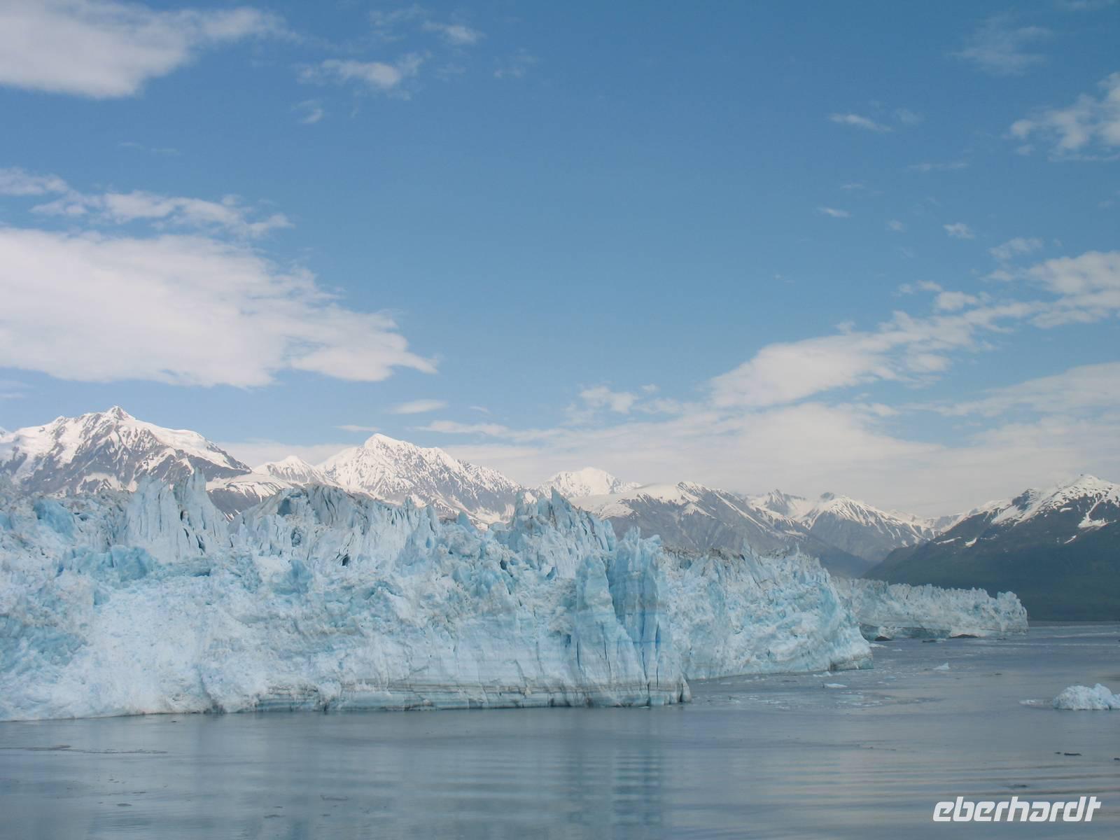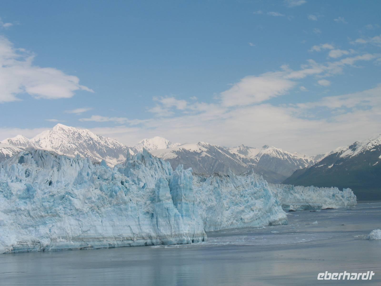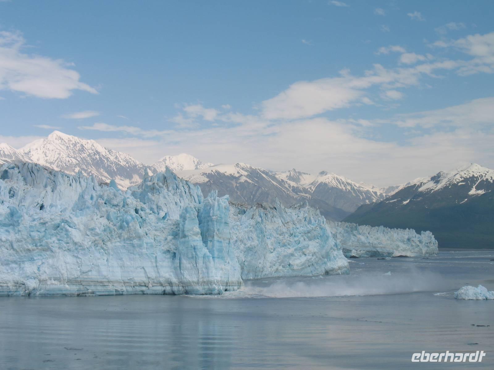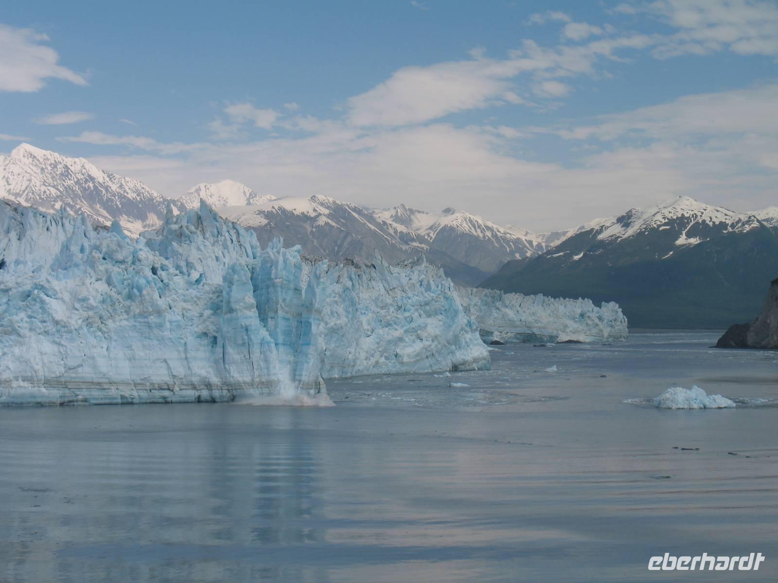 Unseren ersten Tag auf See verbringen wir ganz entspannt auf dem Schiff. Wir genießen ein leckeres Frühstück mit Blick auf das Meer entlang der Inside Passage. Gegen 13.00 Uhr sollen wir am bekannten Hubbard-Gletscher vorbeikommen, welcher sich in der Elias-Kette und der Grenzlinie Alaska/Yukon-Territorium befindet. Der Gletscher wurde bereits 1130 durch Übermittlungen der Yakutat-Indianer erstmals erwähnt. Die Quelle des Hubbard-Gletschers liegt im Yukon-Territorium, von hier ist der Gletscher 122 Kilometer lang, dabei endet er im Disenchantment Bay und Yakutat Bay. Die Stirnseite ist mit über zehn Kilometern am breitesten. Um eine gute Sicht auf den Gletscher zu haben, nehmen wir uns eine Liege oder gehen rechtzeitig auf das Aussichtsdeck. Aber wie es immer so ist mit der Natur und dem Fahrtverlauf, die Ankunft am Hubbard-Gletscher verzögert sich. Folglich gehen einige Reisegäste um 14.00 Uhr zum Mittagessen oder entspannen beim Lesen eines tollen Buches. Um 15.00 Uhr ist es dann endlich soweit, wir erblicken den Hubbard-Gletscher. Als besonderes Highlight sehen wir zudem wie der Gletscher kalbt, riesige Eisbrocken stürzen in das Yakutat- Bay ab, wahrlich ein einzigartiges Naturschauspiel :-) Dieser Teil des Gletschers, welcher mehr als 100 Meter über den Meeresspiegel liegt, kalbt regelmäßig in bestimmten Zeitabständen. Nach der ganzen Aufregung lohnt es sich, das riesige Kreuzfahrtschiff mit seinen vielen Attraktionen weiter zu erkunden, dafür eignet sich dieser Tag auf See perfekt. Um 17.30 Uhr treffen wir uns im Raum Borneo/Malaysia bei der Schiffsbibliothek, um kurz das gemeinsame Ausflugsprogramm am nächsten Tag zu besprechen. Danach genehmigen wir uns ein leckeres Abendessen entweder im Buffet- oder im Menü-Restaurant mit deutscher Speiskarte! Anschließend schauen sich die Gäste unter anderem die tolle Show im Theater an oder gönnen sich einen Drink in der Bar "Windjammer". Morgen werden wir dann Icy Strait Point besichtigen, wir freuen uns schon ;-)