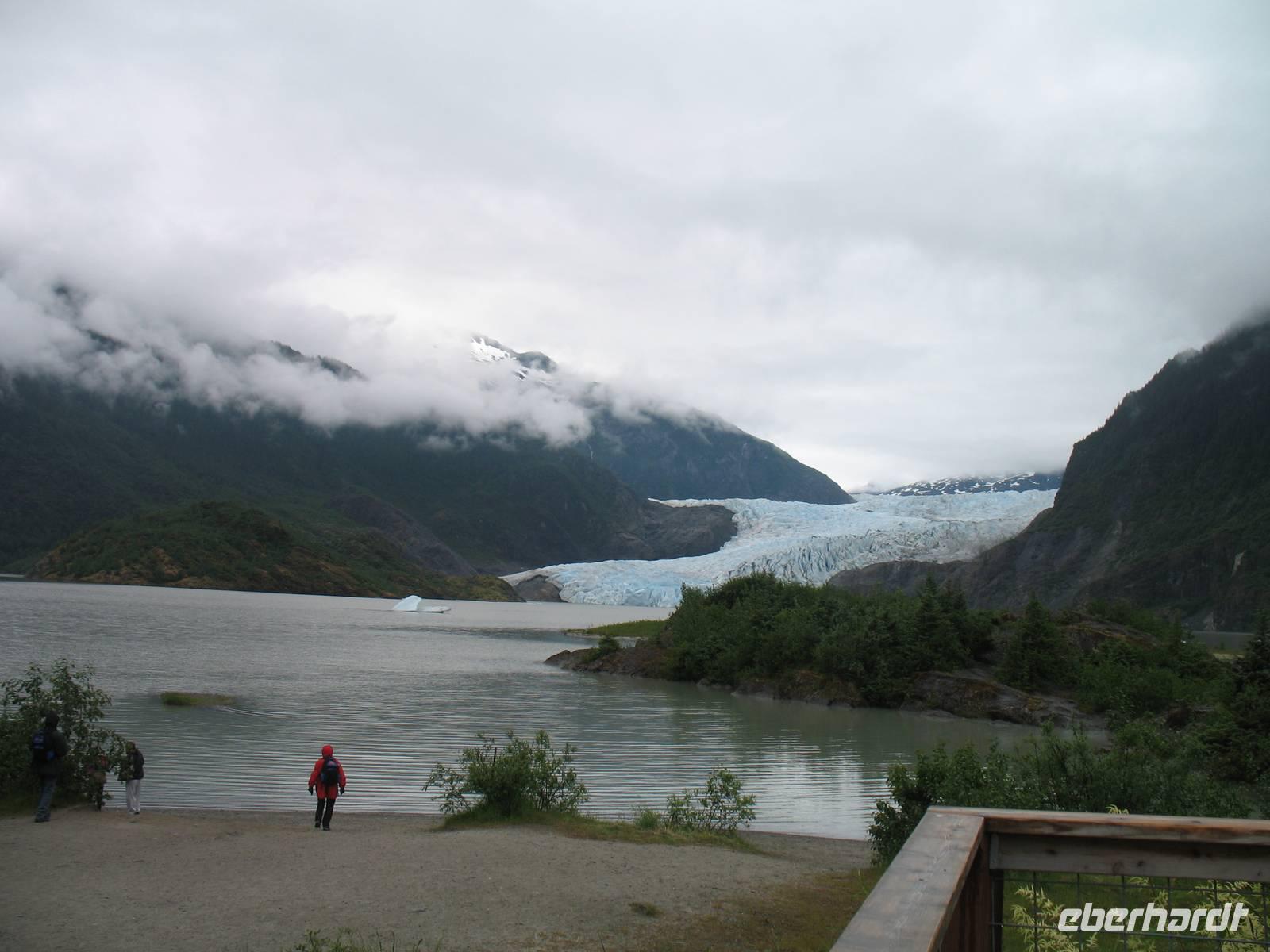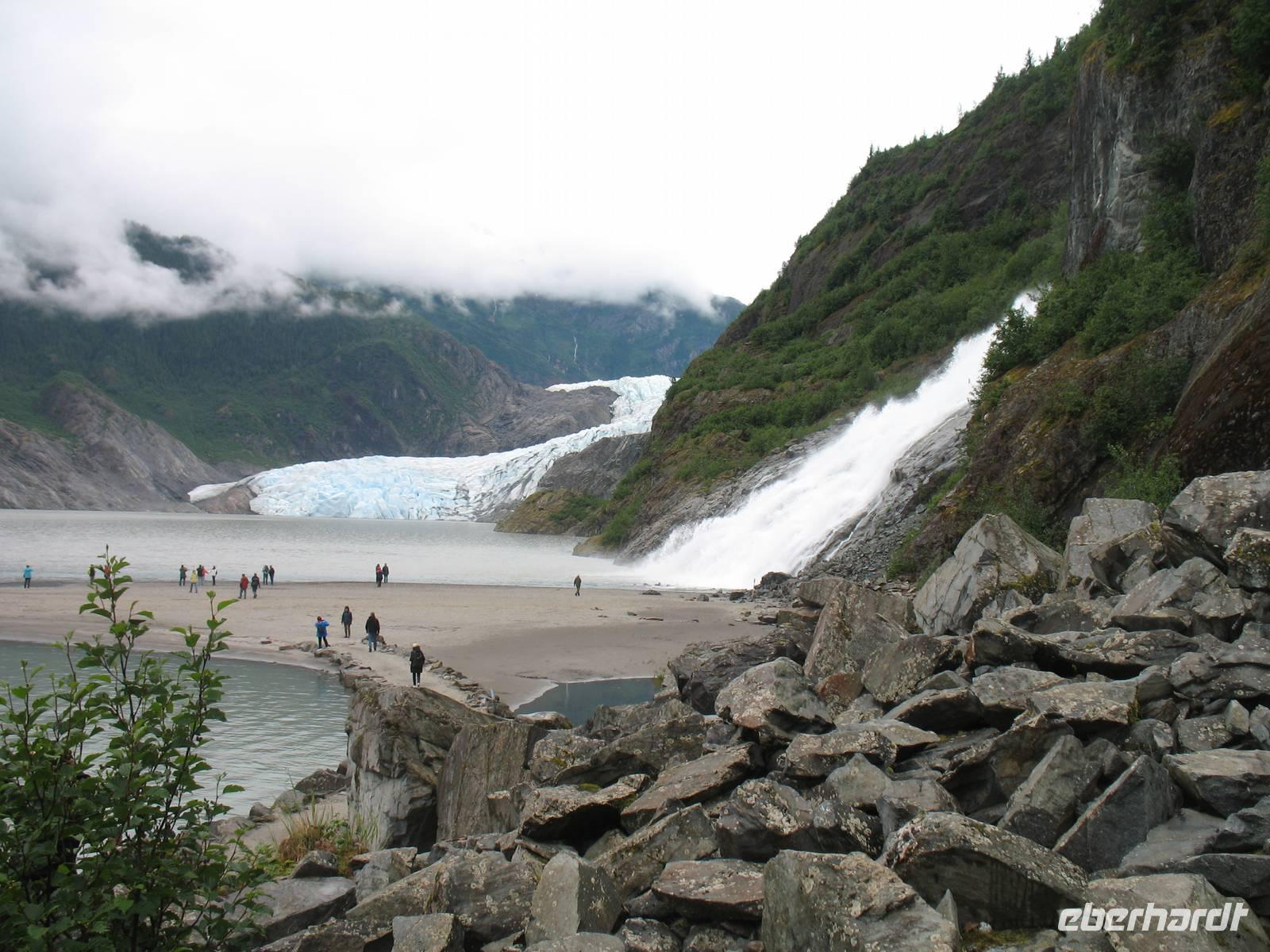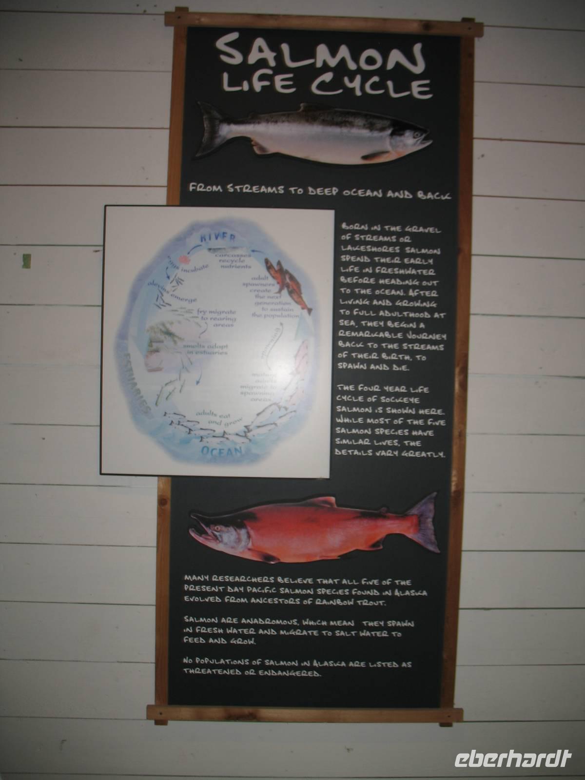 Heute haben wir wieder ein sehr frühes Frühstück, da wir Juneau bereits um 07.00 Uhr erreichen. Die Reisegruppe trifft sich um 07.15 Uhr bei der Rezeption, um gemeinsam an Land zu gehen und beim Alaskan Juneau Dock (AJ Dock) auf unseren Transfer zum Mendenhall-Gletscher und zur Lachsaufzuchtstation zu warten. Um 07.45 Uhr beginnt unser Ausflug auch schon. Auf der Fahrt zeigt uns unsere Busfahrerin Peggy wichtige Sehenswürdigkeiten wie das Alaska State Museum, den Red Dog Saloon, das Regierungsgebäude, das Governor's House, das Alaska State Capitol oder auch die Pendelbahn Mount Roberts Tramway in Juneau. Die zwei Waggons dieser Pendelbahn, einer mit Raben-Motiv, der andere natürlich mit Adler-Motiv, bewegen sich parallel im Jig-back auf einem Schmalspur-Kabel von zwei Zoll mit einer Tragkraft von mehr als 300 Tonnen. Geografisch gesehen, liegt Juneau zwischen Mount Juneau und dem Kanal Gastineau im Alexanderarchipel und sie wurde 1959 zur Hauptstadt Alaskas ernannt. Berühmheit und auch ihren Namen erlangte die Stadt durch den ersten Goldfund von Joe Juneau und Richard Harris 1880 aufgrund eines Hinweises des Indianer-Häuplings Kowee vom Auk Tlingit-Stamm. Es enstand die erste moderne Siedlung, deren Namensgebung etwas verwirrend ist. Zuerst hat sie den Namen Harrisburg erhalten, später wurde sie aber unbenannt in Juneau, obwohl Kowee ihr eigentlicher Name war zu Ehren des Indianer-Häuplings aufgrund dessen Hilfe bei der Goldsuche. Verwirrent? Vielleicht ein wenig ;-) Damals hatte es hier die größten Goldminen der Welt gegeben, unter anderem zählten die Treadwell Mine, die Greens Creek Mine und die AJ Mine dazu. Zum Beispiel wurde früher in der AJ Mine Gold bis zu 3,5 Millionen Unzen (1 Unze= 20 bis 30 US-Dollar oder rund 28 Gramm Gold) gefördert. Rund 45 Minuten später erreichen wir auch schon den Mendenhall-Gletscher. Nur als Randnotiz: Das Glacier Bay befindet sich ungefähr 80 Kilometer Richtung Westen entfernt. Wir werden eineinhalb Stunden später wieder am Eingang abgeholt. Der frühere Name dieses 21 Kilometer vom Stadtzentrum Juneau entfernten Gletschers war Auke, nach einem Tlingit-Stamm benannt. Seinen jetzigen Namen hat er zu Ehren des amerikanischen Wissenschaftlers Thomas Corwin Mendenhall erhalten. Der Gletscher misst eine Höhe von rund 67 Metern und Breite von 2,4 Kilometern. Das Juneau Icefield ist circa 4.000 Quadratkilometer groß, der Mendenhall ist neben Taku, Eagle oder Herbert nur einer der 38 weiteren größeren und über 100 kleineren Ausläufern. Interessant ist auch, dass sich die Gletscher des Juneau Icefield nicht wie andere Gletscher weltweit in hohem Maße zurückziehen, zum Beispiel beim Mendenhall sind es rund zehn bis fünfzehn Meter im Jahr. Über 19 Kilometer von seinem Urspungsort Juneau Icefield erstreckt sich der Mendenhall-Gletscher. Zuerst unternehmen wir einen gemeinsamen Spaziergang zum Wasserfall "Nugget Falls". Das Wetter schaut anfangs gar nicht gut aus und es hat ganz leicht geregnet. Aber nach wenigen Minuten ist es aufgeklart. Angekommen bei den Wasserfällen haben wir ein tolles Fotomotiv auf Gletscher und Wasserfall zusammen. Wirklich ein wunderschöner Anblick :-) Danach besuchen wir noch das Mendenhall-Gletscher Visitor Center mit Ausstellungsstücken, einem interessanten Film über diesen Gletscher, einem Observatorium mit Teleskopen und einer Aussichtsplattform. Gegen 10.00 Uhr fahren wir auch schon weiter zur Lachsaufzuchtstation "Macaulay Salmon Hatchery". Es gibt fünf verschiedene Arten des Pazifischen Lachses: Ketalachs "Chum", Rotlachs "Sockeye", Königslachs "King", Silberlachs "Silver" und Buckellachs "Pink". Deren unterschiedlichen Größen sind mit Hilfe unserer fünf Finger festzuhalten, zum Beispiel entspricht der "King Salmon" dem Mittelfinger, da er der größte und bedeutendste Lachs ist. Die Lachsaufzuchtstation gehört zur Organisation "Douglas Island Pink & Chum", kurz DIPAC, mit vier in Betrieb stehenden Lachszuchten rund um Juneau. Die Wichtigkeit dieser Zuchtstationen besteht darin, dafür zu sorgen, dass aufgrund der größeren Auslassung an Lachsen ins Meer allgemein die Grundgesamtheit der Lachse in Alaska steigt. Eine Mitarbeiterin der Station zeigt und erläutert uns die wichtigsten Etappen der Lachsaufzuchtstation. Die jungen Lachse werden bereits mit nur ein paar Zentimetern Länge ins Meer ausgelassen. Die Auslassung von bis zu 130 Millionen Lachsen jährlich wird auch als "Ocean Ranching" bezeichnet. Zur Fortpflanzung kehren die erwachsenen Lachse nach ein bis zu vier Jahren im Pazifischen Ozean an ihre Geburtsstätte circa Anfang Juli zurück. Während 130 Millionen Lachse ausgelassen werden, liegt die erwartete Quote der Rückkehrer aufgrund der anstrengenden, teilweise langen Reise ohne Nahrungsaufnahme und Gefahren wie Raubtieren bei ein bis zwei Millionen. Bei ihrer Rückankunft springen sie dann die Fischleiter aus mehreren aneinander gereihten Becken mit leichter Steigerung auf einer Länge von 150 Metern hinauf. Interessant ist allerdings, dass die jungen Lachse während ihrer "Prägungszeit" von vier bis sechs Wochen sich ihren Geburtsort so gut einprägen, dass sie ohne irgendwelche Hilfsmaßnahmen an diesen Ort als erwachsene Lachse zurückkommen. Bei der Zucht werden dann die Eier der zurückkehrenden erwachsenen Lachse entnommen, künstlich befruchtet und in den Brutschrank gelegt. Zum Beispiel befinden sich auf 650 Tabletts rund 180.000 Eier. Aber warum gibt es diese Aufzuchtstationen? Die hohe Überlebenschance in den Brutkästen ist ein Grund dafür. Während im Zuchtbetrieb ein Chance von fast 95 Prozent besteht, überleben nur fünf bis zehn Prozent in freier Natur, da sie dort verschiedenen Gefahren ausgesetzt sind. Diese gemeinnützige Zuchtstation wird nicht staatlich finanziert, sondern sie leben einerseits vom Verkauf ihrer Produkte im eigenen Shop der "Macaulary Salmon Hatchery" und andererseits aus dem Verkauf der nach dem Laichen verendeten Lachse als Hundefutter