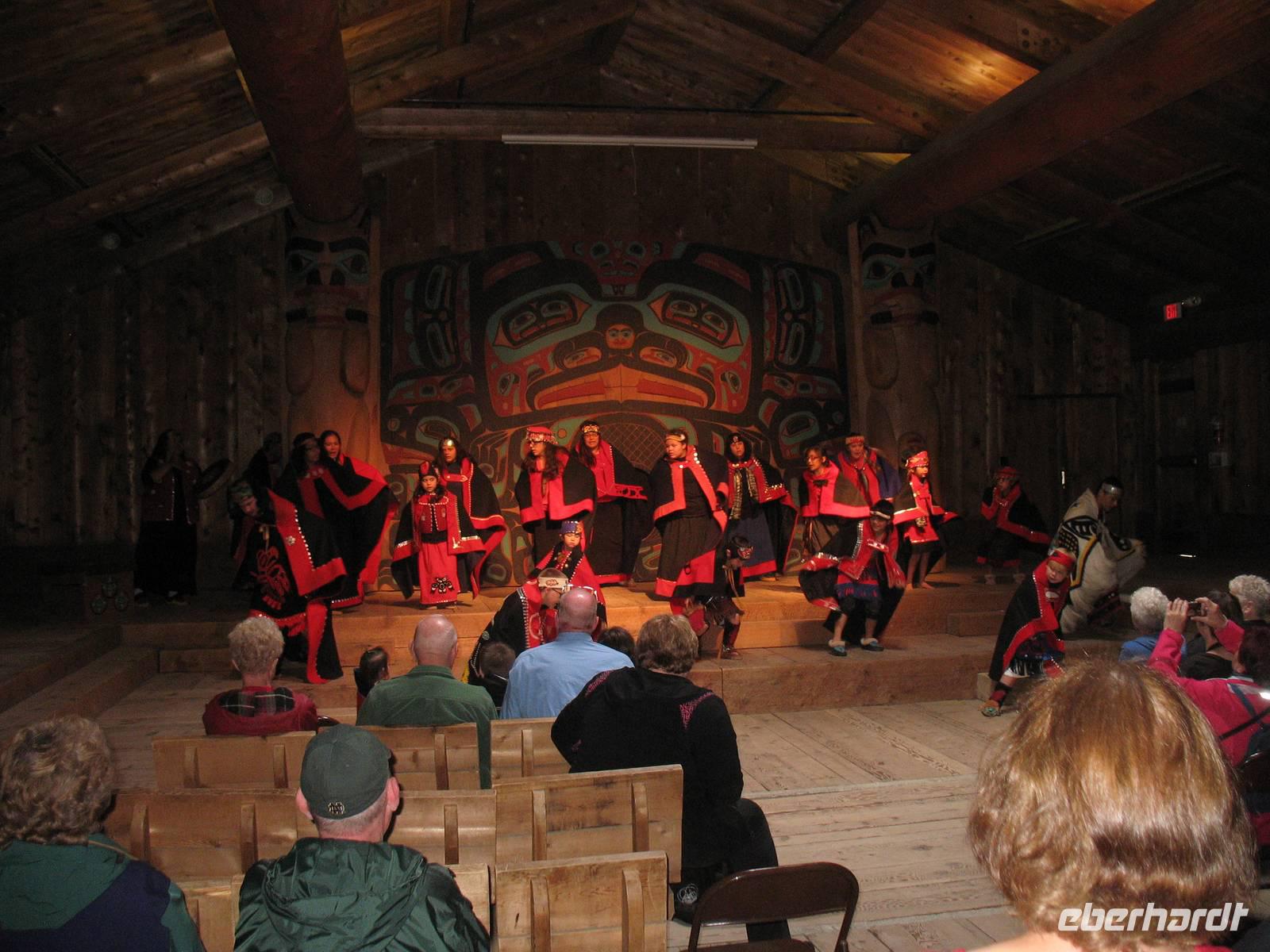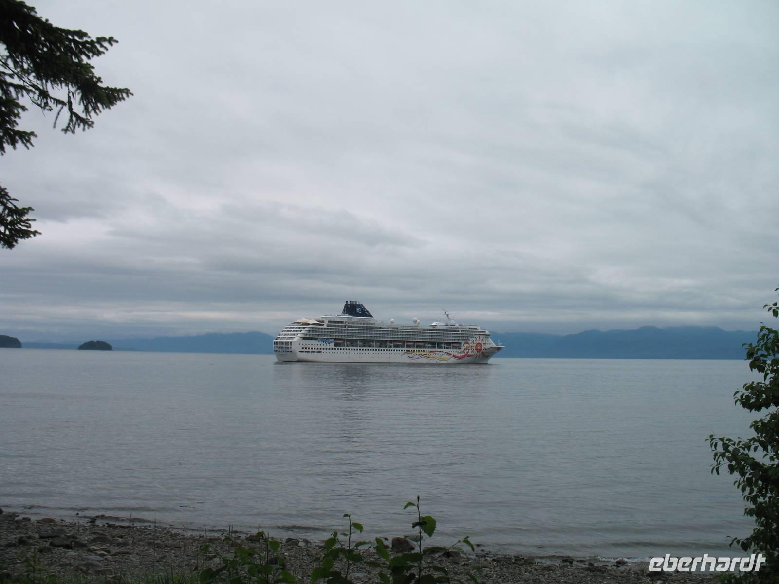 Nach einem ausgiebigen Frühstück und für einige Gäste auch ein leckeres Mittagessen trifft sich die Hälfte der Reisegruppe zum gemeinsamen Ausflug "Waldbahn & Stammestanz Kombination" in Icy Strait Point an der Rezeption auf Deck 5. Dieses Örtchen befindet sich rund 80 Kilometer in westlicher Richtung von Juneau und circa 22 Kilometer vom Glacier Bay Nationalpark entfernt. Interessant ist auch, dass der Ort lediglich im Rahmen einer Kreuzfahrt besucht werden darf. Heute hält das Schiff nicht direkt im Hafen, so dass wir an Land in einem Boot für über 100 Personen tendern werden. Diese Fahrt dauert rund 15 bis 20 Minuten. Bis zum Beginn unseres Ausflugs haben wir noch ein wenig Freizeit im Hafen, welcher in der Nähe des Dorfes Hoonah der Tlingit-Indianer liegt. Das Wort "Tlingit" wird eigentlich "Clink-it" ausgesprochen und kann mit "Menschen" übersetzt werden. Dieser Indianerstamm hatte zuerst mit russischen Händlern Kontakt, denen sie zwar ablehnend gegenüber standen, die Indianer-Frauen sich aber dennoch später den russischen Männern zuwanden. Nach und nach haben sich weitere Menschen unterschiedlicher europäischer Länder wie Irland und Norwegen in Alaska angesiedelt. Hauptnahrungsmittel war selbstverständlich der Lachs, welcher von den Männern mit Netzen oder auch Speeren gefangen und von den Frauen geräuchert und getrocknet wurden. Die Ureinwohner waren Jäger und Sammler, also haben sie auch Hirsche, Bären und andere Tiere verspeist. Als Transportmittel nutzten die unter anderem große seefeste, aus rotem Zeder hergestellte Kanus bis zu 15 Meter lang mit einem Transport von bis 40 Menschen, welche besonders für längere Fahrten gedacht waren. Kleinere, rund 3 Meter lange Kanus dienten hauptsächlich zum Jagen und Fischen. Die Tlingit feierten das sogenannte Gaben-Fest "Potlatch", lebten nach strengen Regeln, deren Vergehen streng bestraft wurden. Sie haben gern gesungen und getanzt, einziges Musikinstrument war die Trommel. Eine Vorführung ihrer Tänze werden wir heute noch bestaunen :-) Im Hafen von Icy Strait Point treffen wir auch diejenigen Gäste, welche dieses Örtchen auf eigene Faust erkunden oder einen Ausflug zur Walbeobachtung unternehmen. In der freien Zeit besichtigen wir unter anderem die 1912 errichtete Konservenfabrik Hoonah Packing Co. mit Souvenirladen und einem Museum mit vielen geschichtlichen Hintergründen und Bildern aus den 30er Jahren. Diese Lachskonservenfabrik war früher weltweit eine der produktivsten Fabriken. Um 13.20 Uhr fahren wir zuerst mit der offenen Waldbahn am Meer entlang. Hier wachsen sehr viele Bäume wie "Sitka Spruce" (rund 49 Meter hoch) oder "Western Hemlock" (rund 70 Meter hoch), größte Unterschiede bestehen in den verschiedenen Zapfenformen und auch der Baumhöhe. Des Weiteren wird uns berichtet, dass bis zu 250 Zentimeter Regen pro Quadratmeter im Jahr fallen. Bis zur Wendestelle mitten im grünen Regenwald fahren wir mit der kleinen Waldbahn rund 40 Minuten, hier legen wir einen viertelstündigen Fotostopp ein. Während unserer Fahrt und auch bei unserem Stopp sehen wir viele der berühmten Weißkopfseeadler und ihre Nester in den hohen Bäumen. Dann geht es auch schon wieder auf dem gleichen Weg zurück. Das Wetter ist super und die Waldfahrt wirklich entspannend. Danach gehen wir gegen 15.00 Uhr zum "Heritage-Center-Theater", um eine tolle Vorführung der Stammestänze zu besuchen. Es werden uns drei Tänze gezeigt, welche uns die Geschichte und Mythen der Tlingit-Indianer näher bringen sollen. Dazu gehört auch die Erzählung der Kreation von Sonne, Mond und Sterne durch den Raben. Natürlich werden die Gäste im Abschluss eingeladen, selbst mitzutanzen ;-) Eine Stunde später tendern wir zum Schiff Norwegian Sun zurück. Um 17.30 Uhr treffen wir uns abermals, um den gemeinsamen Tagesauflug aller Gäste in Juneau am neunten Tag zu besprechen. Der Abend verläuft ähnlich wie am Vortag mit einem leckeren Abendessen als Buffet oder Menü. Den Tag lassen wir wieder mit einer interessanten Abendshow im Theater oder bei einem Drink und guter Piano-Musik an der Bar ausklingen.