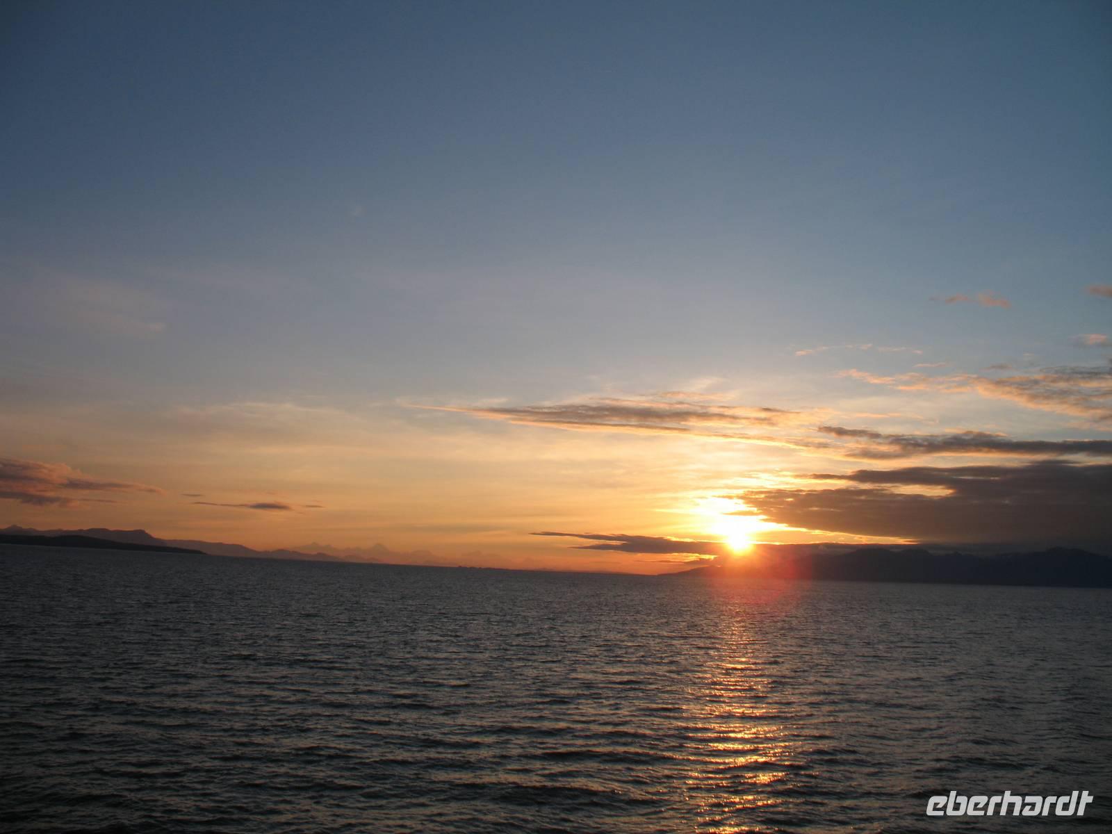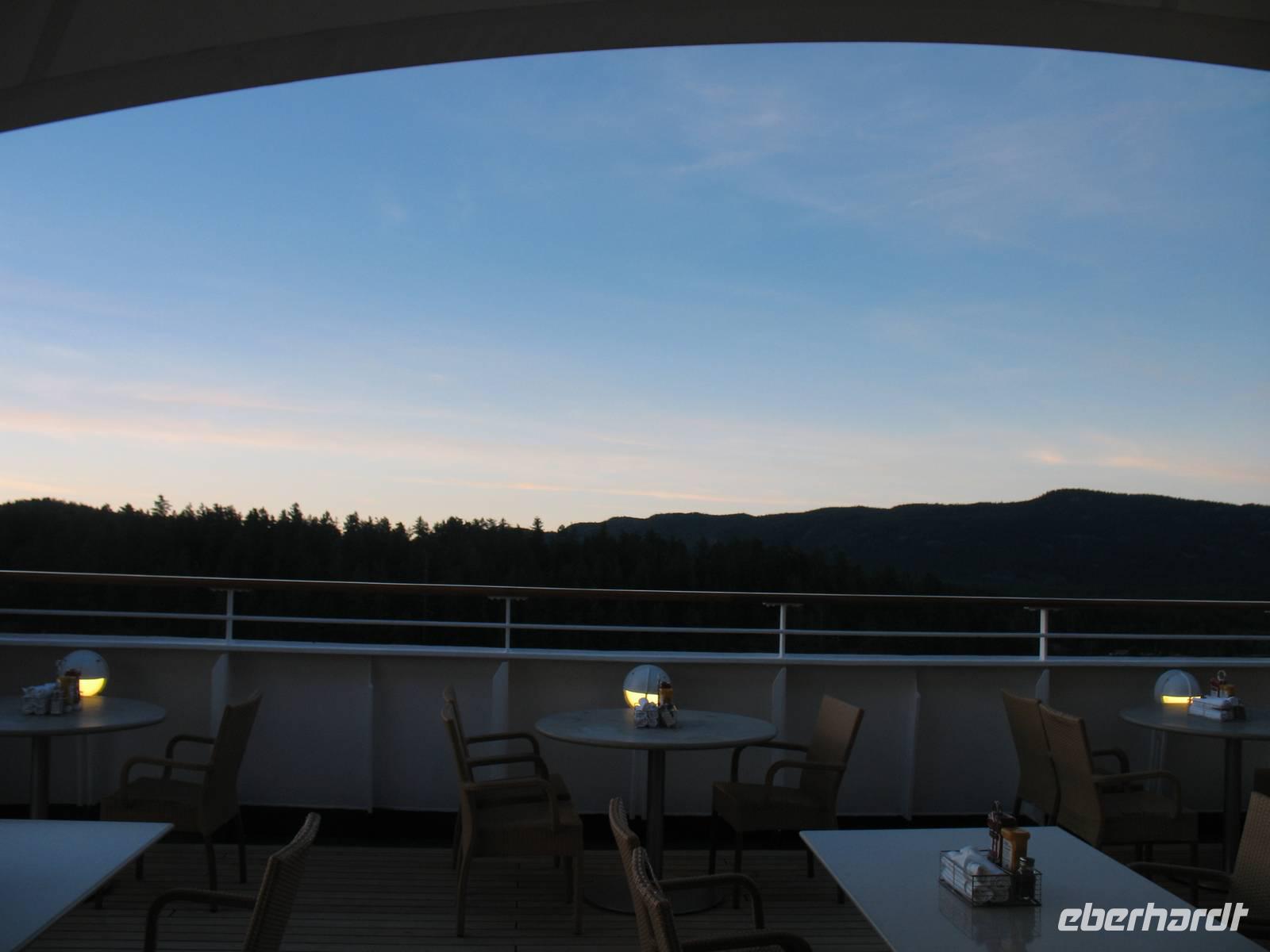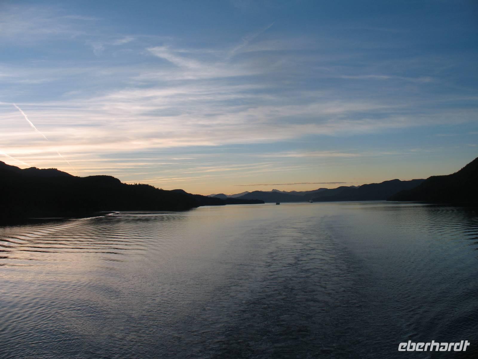 Unseren letzten Tag auf See verbringen wir genauso entspannt auf dem Schiff wie am ersten Tag, obwohl wir uns jetzt wahrscheinlich schon viel besser orientieren können :-) Während wir den Hubbard-Gletscher super schön betrachten konnten, versteckt sich der Saywer-Gletscher hinter einer dicken Nebelwand, welche erst später auflockert. Wir genießen den Tag mit Fahrt durch die atemberaubende Landschaft der Inside Passage. Bevor wir Alaska verlassen und uns die nächsten Tage das traumhafte West-Kanada anschauen, hier noch ein Fazit wissenswerter Daten: Das Motto in Alaska lautet "Norden der Zukunft", also "North to the Future", und die Hautpstadt ist Juneau. Gekauft wurde Alaska 1867 von Russland, am 3. Januar 1959 wurde es zum amerikansiche Bundesstaat erklärt und der Staat ist über 1.717.854 Quadratkilometer groß. Die Hauptwirtschaftszweige sind Öl, Tourismus und Fischfang. Nationalsport ist das Hundeschlittenrennen, Nationalvogel das Moorschneehuhn "Willow Ptarmigan", Nationalblume das Vergissmeinnicht "Forget-me-not", Nationaledelstein der Jade, Nationalfisch der Alaska Königslachs "Alaska King Salmon" und Nationalbaum die Fichte "Stika Spruce". Zum Abschluss also Wissenwertes zu Alaska kurz und kompakt zusammengefasst ;-) Gegen 17.30 Uhr treffen wir uns ein letztes Mal im Raum Borneo/Malaysia bei der Schiffsbibliothek, um kurz die Ausschiffung und das gemeinsame Programm des nächsten Tages zu besprechen. Danach genehmigen wir uns alle zusammen ein leckeres Abendessen im Menü-Restaurant "Seven Seas". Zuvor gibt es noch ein gemeinsames Gruppenfoto auf der Schiffstreppe, auch unsere deutschsprachige Ansprechpartnerin Anke von der Norwegian Sun ist dabei ;-) Das Essen im Menü-Restaurant ist abermals sehr lecker und wir werden sogar von ein paar Delfinen begleitet. Nach dem Abendessen schauen sich einige Gäste unter anderem die Abschlusshow im Theater an oder sie gönnen sich einen Abschiedsdrink in der Bar oder im Außenrestaurant. Wir freuen uns bereits auf Morgen, denn nicht nur Alaska wollen wir kennenlernen, auch den Westen Kanadas gibt es noch für uns zu entdecken :-)