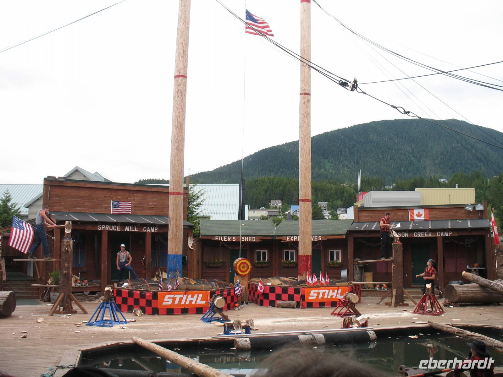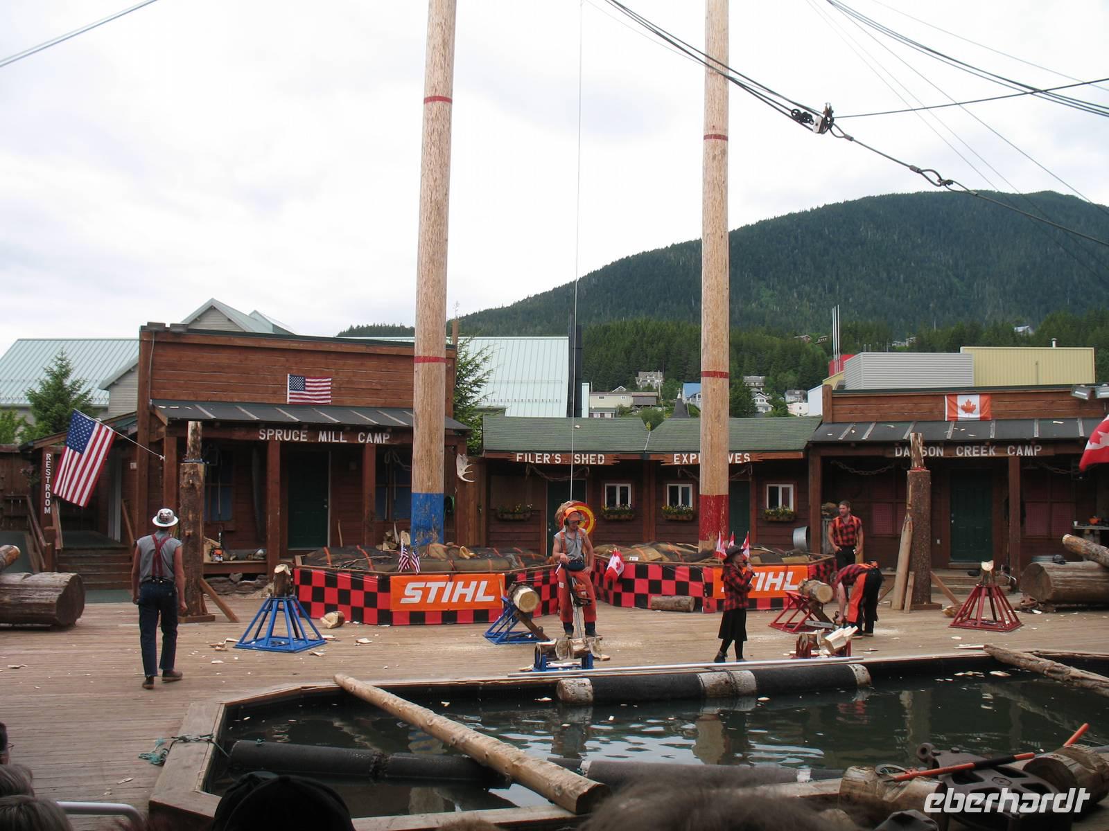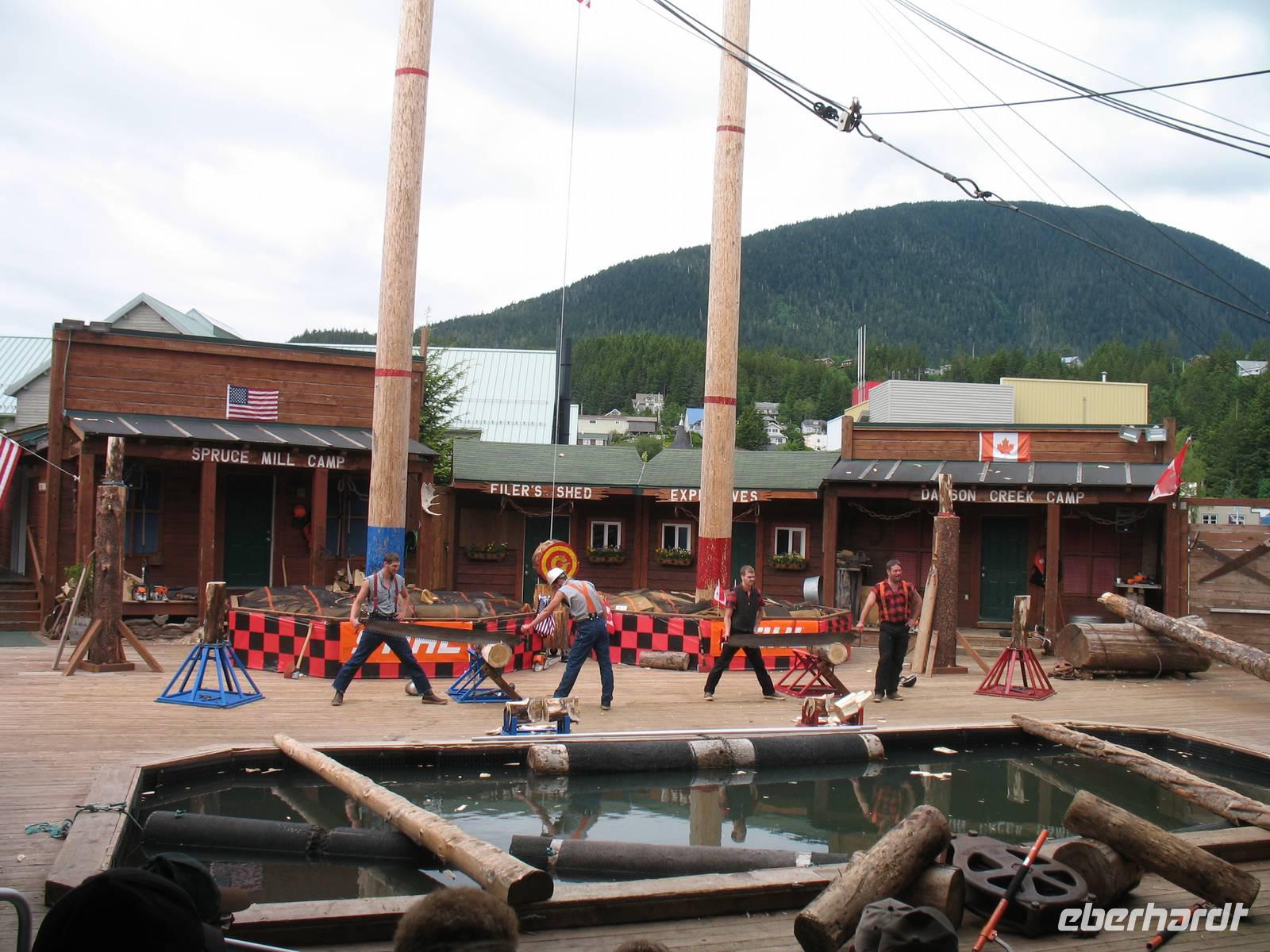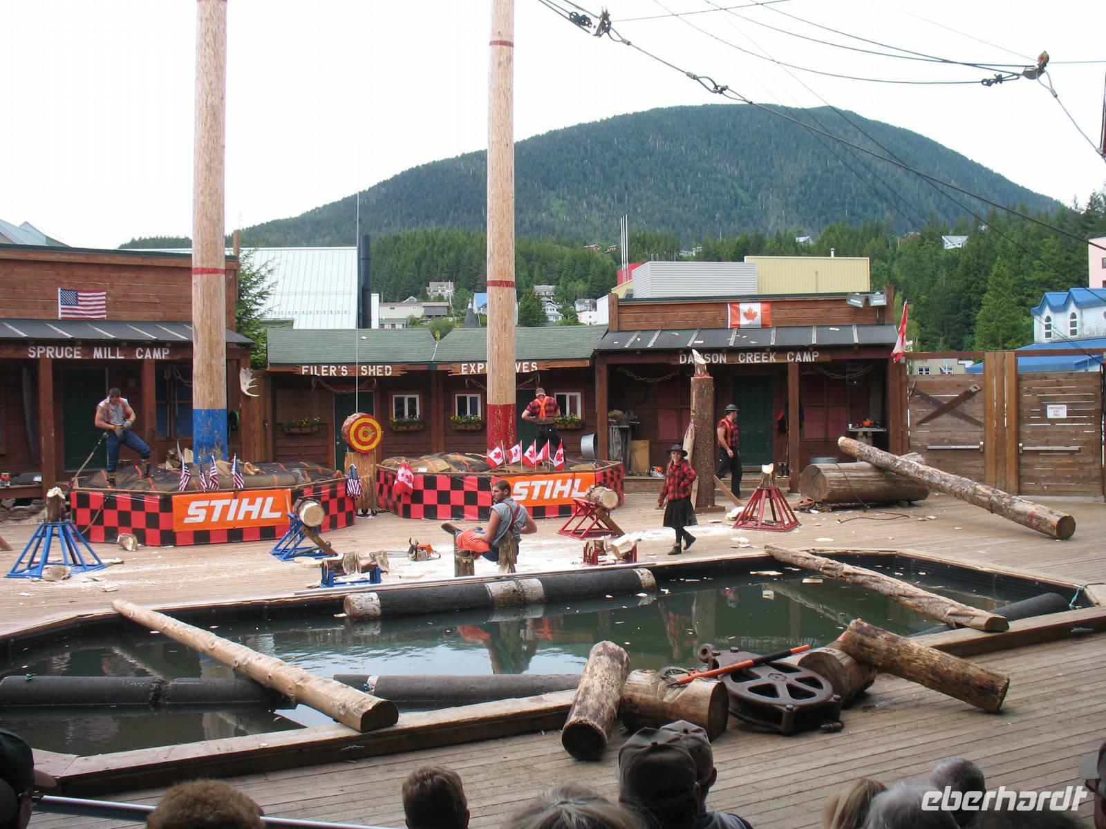 Ketchikan werden wir erst gegen 13.00 Uhr erreichen. Daher gönnen wir uns ganz entspannt ein leckeres Frühstück und eventuell auch ein schmackhaftes Mittagsessen. Wir treffen uns 12.45 Uhr bei der Rezeption, um gemeinsam an Land zu gehen für unseren Ausflug "Saxman Native Village & Lumberjack Show". Das bunte Örtchen Katchikan, dessen Häuser teilweise auf Holzpfählen errichtet wurden, wird auch als "Hauptstadt der Lachse" bezeichnet. Zudem befindet sich hier eine der größten weltweiten Totempfahlsammlungen. Zuerst besuchen wir die typisch amerikanische Lumberjack-Show. Hier tritt ein kanadisches gegen ein amerikanisches Team in verschiedenene Disziplinen gegeneinander an. Dazu gehören unter anderem das Sägen, Hochklettern und Drüberlaufen von Baumstämmen sowie sich gegenseitig mit "dummen Sprüchen" aufzuziehen und während der einzelnen Wettkämpfe zu verunsichern. Ein Team besteht jeweils aus zwei Männern, sie werden vom jeweiligem Publikum mit Anfeuerungsrufen und Geschrei unterstützt, typisch amerikanisch also :-) Diese Show ist zum Unterhalten, zum Spaß haben, oder kurzum einfach nur lustig anzuschauen! Anschließend besuchen wir das eingetragene Dorf der Ureinwohner Tlingit, das "Saxman Native Village". Dies ist ein Museum, welches Totempfähle der umliegenden Indianerclans beherbergt, wobei diese teilweise über 100 Jahre alt sind. Sie werden liegend geschnitzt, bei einem besonderem Fest wie das Potlatch aufgerichtet und sie spiegeln zum Beispiel die Familienchronik wieder. Gefertigt werden die Pfähle aus rotem Zeder, also dem "Baum des Lebens". In Ketchikan leben die drei großen Indianer-Stämme Tsimshian, Tlingit und Haida. Der Ort gehört zu den 100 besten Küstlergemeinden der USA. Im "Saxman Native Village" angekommen, wird uns zuerst ein interessantes Einführungsvideo gezeigt. Danach spazieren wir zum Theater, wo uns weitere Stammestänze gezeigt werden, wieder anders als die bisher gesehenen Tänze. Des Weiteren betrachten wir die riesigen Totempfähle. Besonders eine Kopie des Lincoln-Pfahls, dessen Original steht im Alaskan State Museum in Juneau, sticht uns ins Auge. Die 1883 fertiggestellte Replika mit dem Bild des 16. amerikanischen Präsidenten Abraham Lincoln ist ein Andenken daran, als die Ureinwohner das erste Mal andere "weiße" Menschen gesehen hatten. Typische geschnitzte Tiere der Totempfähle sind der Bär, Adler, Donnervogel, Lachs, Frosch, Biber oder auch der Killerwal. Teilweise stehen diese Tiere für die einzelnen Clans wie der Biber-Clan oder Adler-Clan. Natürlich sei an dieser Stelle auch erwähnt, dass das Tlingit-Volk in zwei übergeordnete Indianerstämme, auch Moieties genannt, unterteilt ist. Auf der einen Seite sind das die Adler und auf der anderen Seite die Raben. Diese zwei Moieties bestehen zudem aus mehreren kleinen Clans. Für uns eher nicht mehr vorstellbar in der heutigen Zeit ist es, dass eine Heirat innerhalb eines der beiden Stämme verboten ist. Gehört die Frau dem Stamm der Raben an, dann darf sie also nur einen Mann aus dem Adler-Stamm heiraten. Ein neugeborenes Kind wird immer bei der Mutter, deren Vorfahren und Verwandten aufwachsen. Aber wie haben die Ureinwohner gelebt? Teilweise wohnten sie bis zu 100 Menschen zusammen in großen, aus Holz gebauten Gemeinschaftslanghäusern. Die Abtrennung der einzelnen Clans war anhand verschieden geschmückter Wände erkennbar. Die Totempfähle mit typischen Verzierungen des jeweiligen Clans wurden dabei oftmals als Hauspfosten verwendet. Zudem werden sie beim typischen Fest der Ureinwohner, dem Potlatch, aufgestellt. Während früher der Gastgeber dieses Fest zum Vorzeigen seines wirtschaftlichen Reichtums veranstaltete, dienen sie heute hauptsächlich als Familientreffen mit Festessen, Tänzen, Erzählungen und Geschichten vergangener Abenteuer und Mysterien sowie auch zu Namensgebungen. Zuletzt werden uns in der Schnitzerei die Farben und Instrumente zur Herstellung gezeigt und deren Bedeutung und Funktionen erläutert. Die klassischen Farben schwarz, blaugün und rötlich-braun werden sparsam verwendet, da die großartige Schnitzarbeit im Mittelpunkt stehen soll. Ein Andenken für unsere geliebten Daheimgebliebenen kann im Souvenirshop erworben werden. Dann fahren wir wieder ins Zentrum zurück. Eigentlich ist Ketchikan die regenreichste Stadt Alaskas, aber da wir unterwegs sind, lacht der Himmel und wir bleiben vom Regen verschont :-) Nach dem Ausflug haben wir noch individuell die Möglichkeit, Ketchikan zu besichtigen. Interessant ist sicherlich die Creek Street, welche eigentlich ein hölzerner Steg ist. Bekanntheit erlangte diese Straße besonders dadurch, dass sie das ehemalige Rotlichtviertel der Stadt war. Früher war Dolly Arthur die beliebteste "Dame" im Viertel, deren damaliges Haus wurde dann zum Bordell-Museum umgebaut. Wieder auf dem Schiff zurück, findet am Abend keine Besprechung statt, da wir am zwölften Tag einen entspannten Tag auf See genießen können. Einige Gäste finden sich später aber zusammen, um sich gemeinsam ein leckeres Menü im Restaurant "Four Seasons" zu gönnen und den Tag Revue passieren zu lassen.