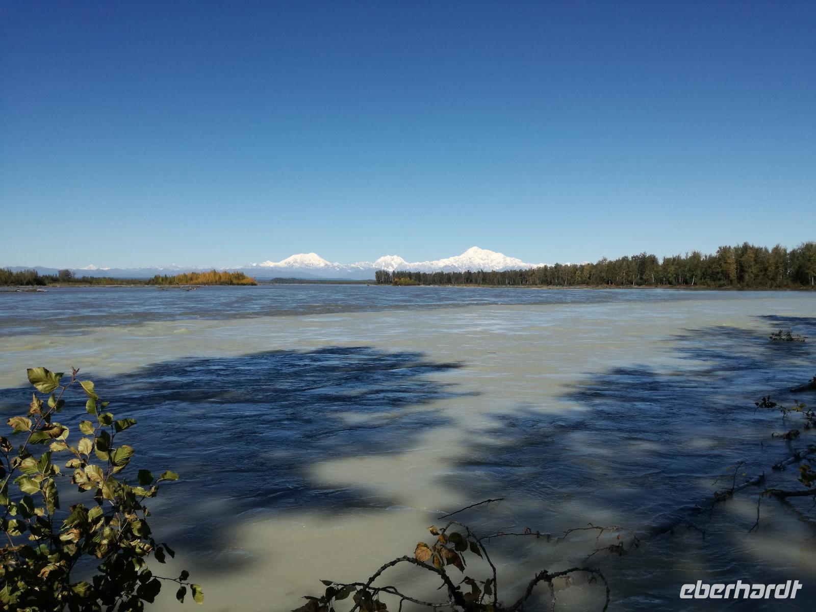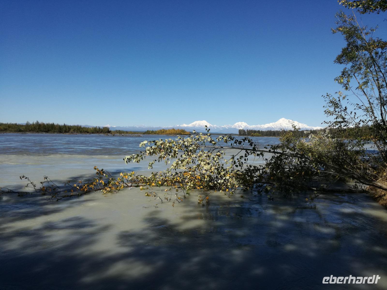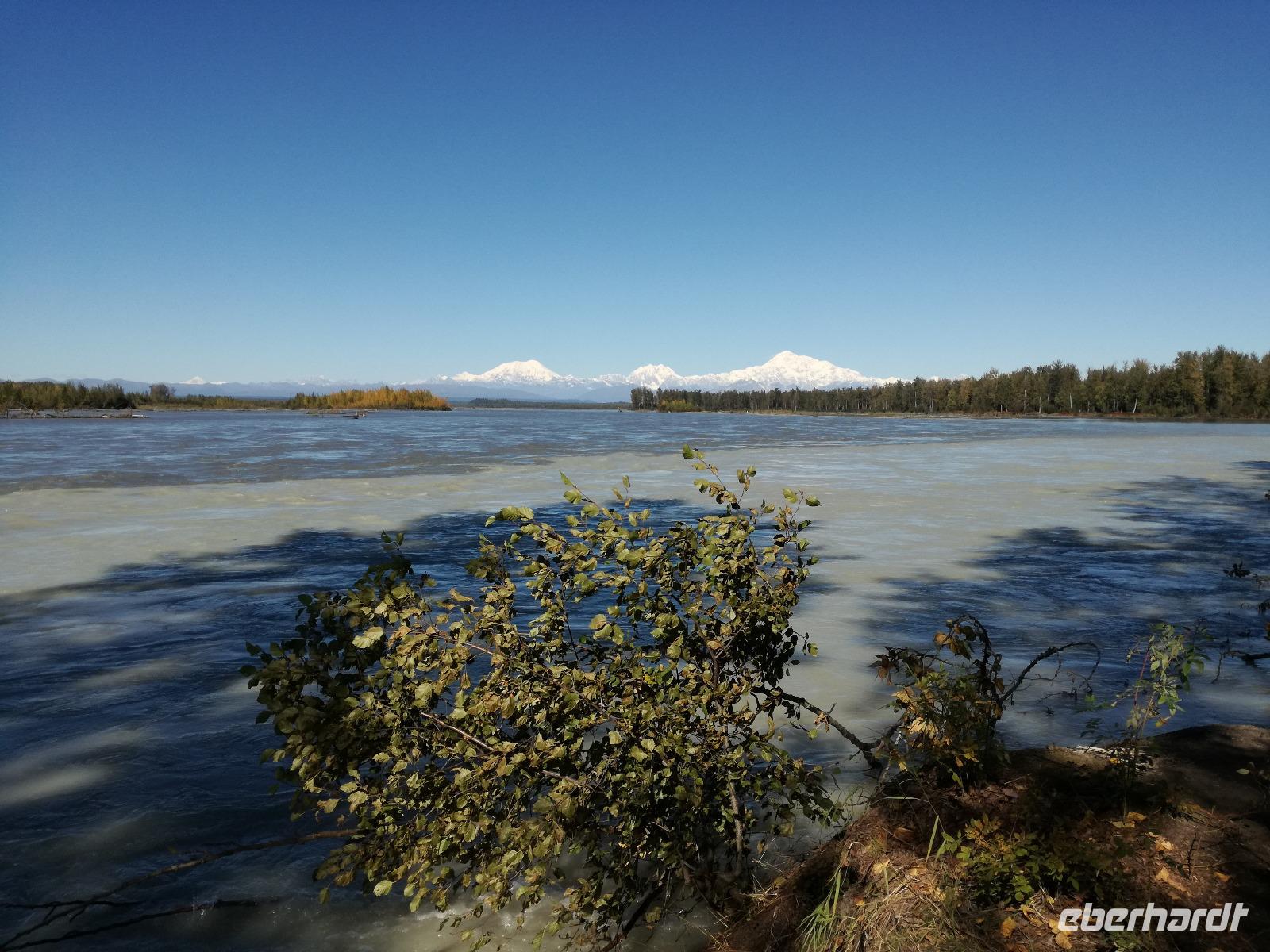 Mit Verspätung in Talkeetna angekommen begeben wir uns gleich auf die "Sightseeingtour". Wir schlendern durch die gut überschaubaren Straßen bis zum Flussufer. Hier haben wir einen tollen Blick zum Denali und die danebenliegenden Berge.