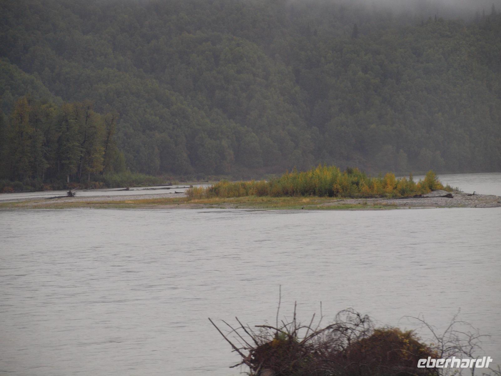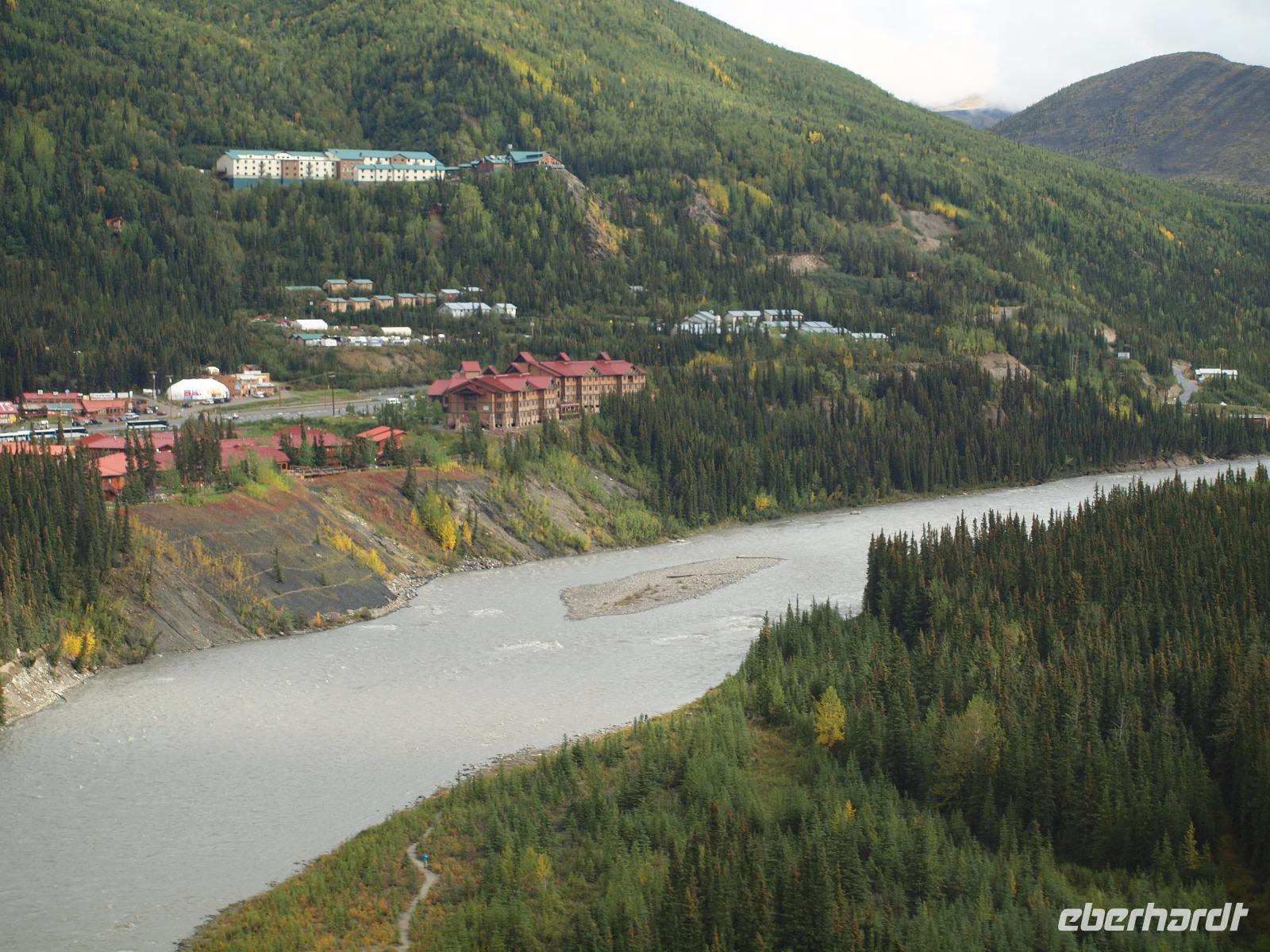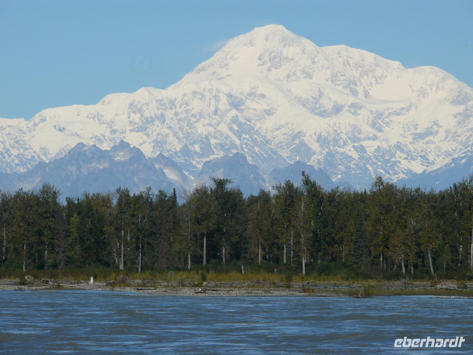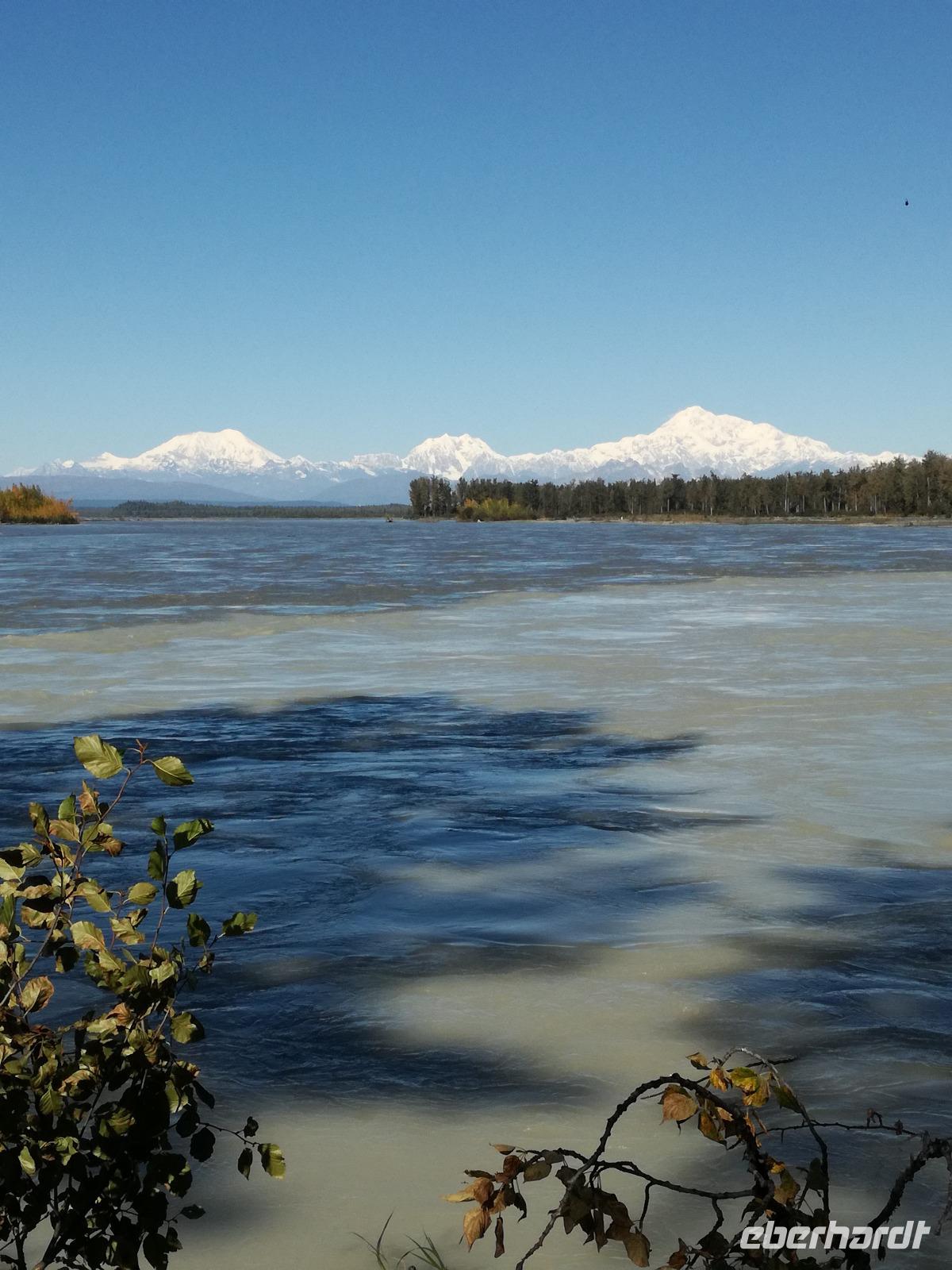 Mit Verspätung in Talkeetna angekommen begeben wir uns gleich auf die "Sightseeingtour". Wir schlendern durch die gut überschaubaren Straßen bis zum Flussufer. Hier haben wir einen tollen Blick zum Denali und die danebenliegenden Berge.