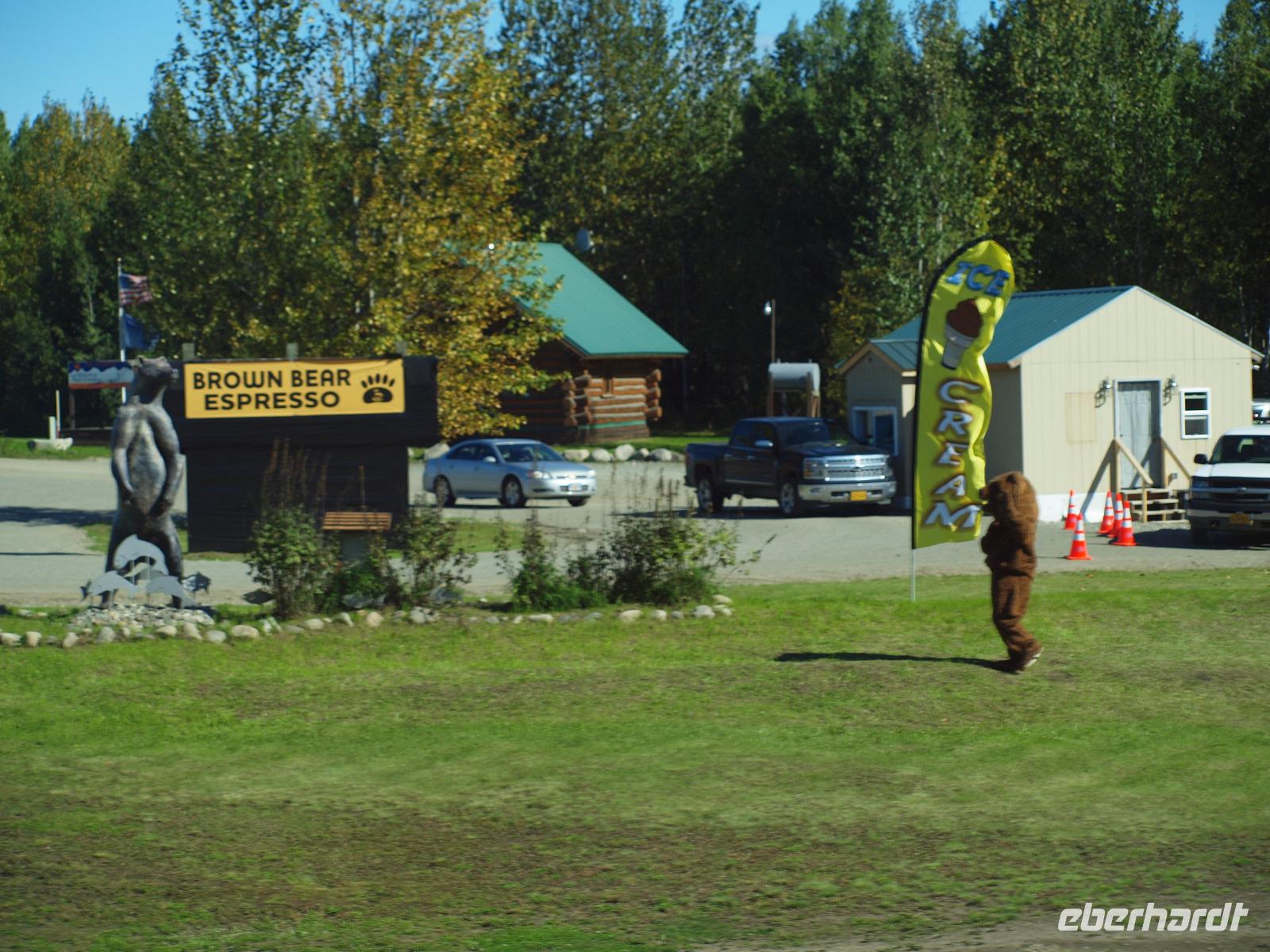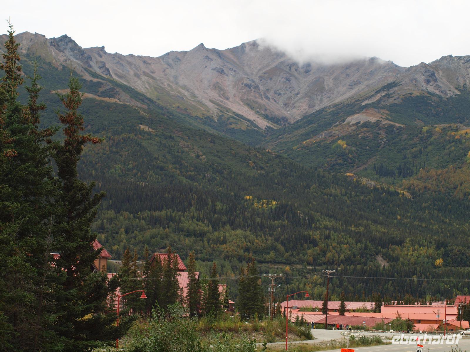 Auf dem Weg kommen wir an Nenana vorbei, diese haben wir auch schon gestern während der Zugfahrt gesehen. Wir halten beim Besucherzentrum und bleiben etwa 30 Minuten. Heute treffen wir hier sogar auf echte Schlittenhunde. Einen weiteren Stopp legen wir bei einer Brauerei in Healy ein. Richtig urig ist es hier und als Attraktion haben die Besitzer hier einen Nachbau des "Magic Bus", bekannt durch das Buch und den Film "Into the Wild" auf dem Grundstück. Mittlerweile kam auch die Sonne aus ihrem Versteck und wärmt uns mit ihren Strahlen wieder auf... Am späten Nachmittag erreichen wir Denali. Das kleine touristische Örtchen ist das Tor zum Nationalpark und besteht hauptsächlich aus einer Straße und mehreren Souvenirshops. Wir fahren zum Besucherzentrum vom Denali Nationalpark, hier haben wir die Möglichkeit einen Kurzfilm über den Park zu sehen und uns die Ausstellung anzusehen. Gegen 16:00 Uhr checken wir dann in unser Hotel "Denali Bluffs" für die nächsten zwei Nächte ein. Das Hotel ist nur ca. 5 Minuten vom "Zentrum" entfernt, wir spazieren in die kleine "Downtown". Gegen 18:45 Uhr treffen wir uns alle wieder und gehen ins Restaurant "Salmon Bake". Das Essen im sehr rustikalen und urigen Restaurant schmeckt uns sehr gut, aber nach einem langen und tollen Tag freuen wir uns auch auf unser wohlverdientes Bett.
