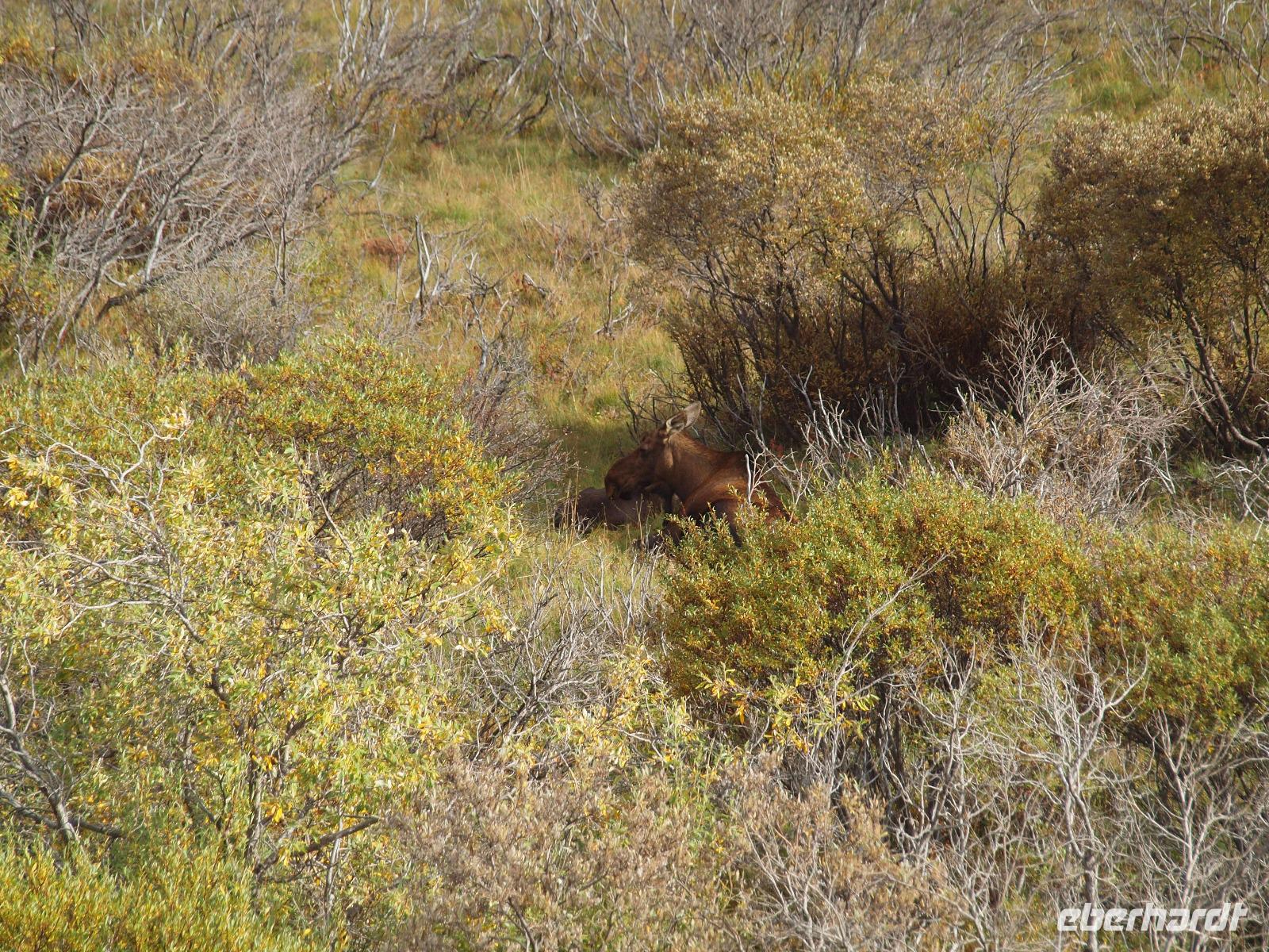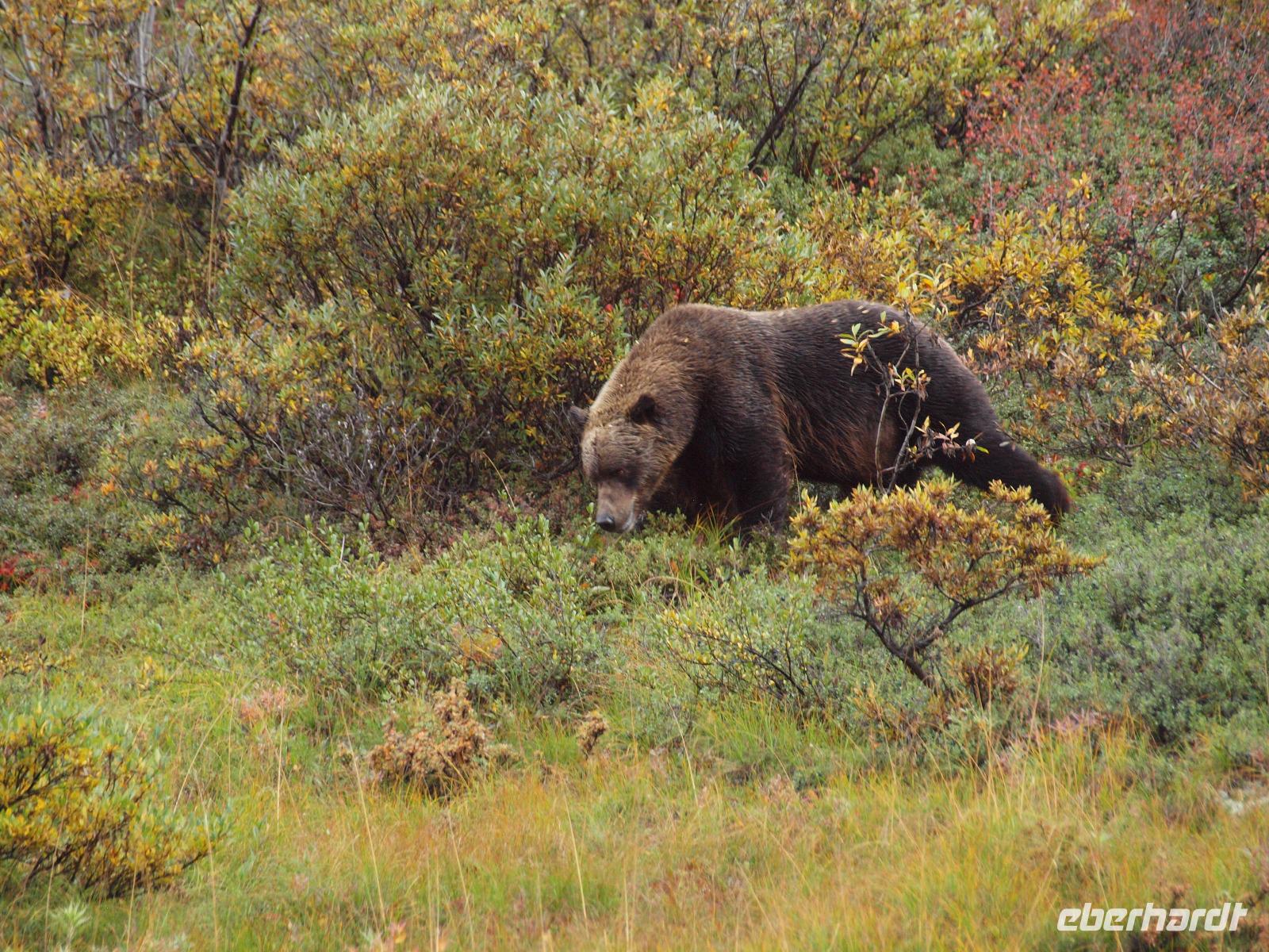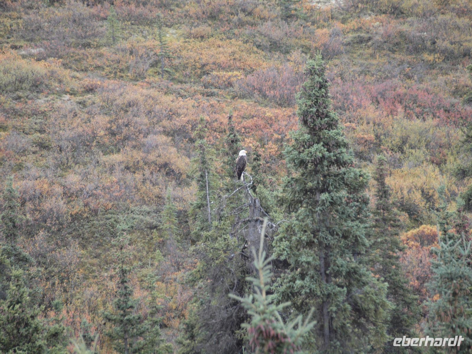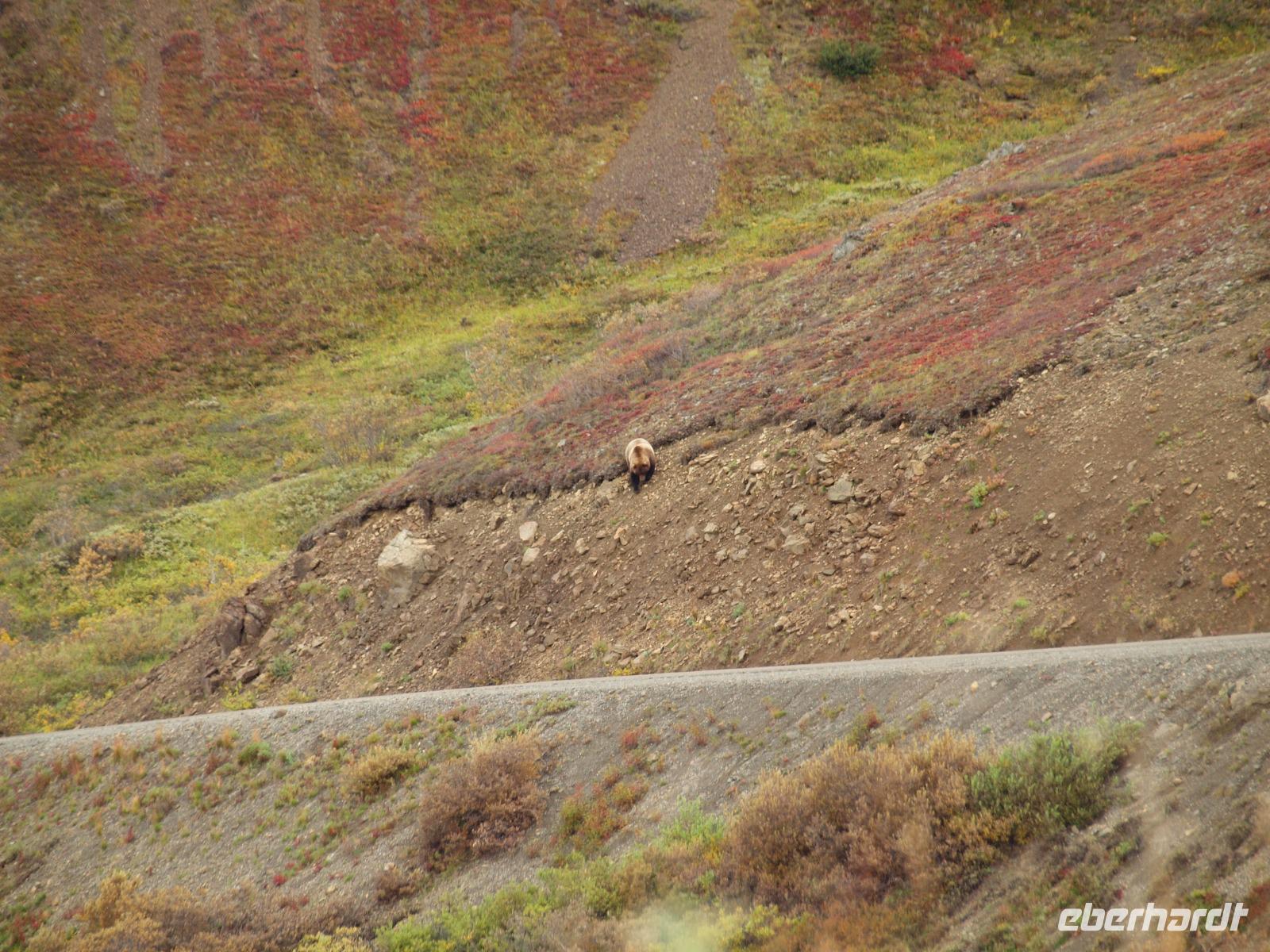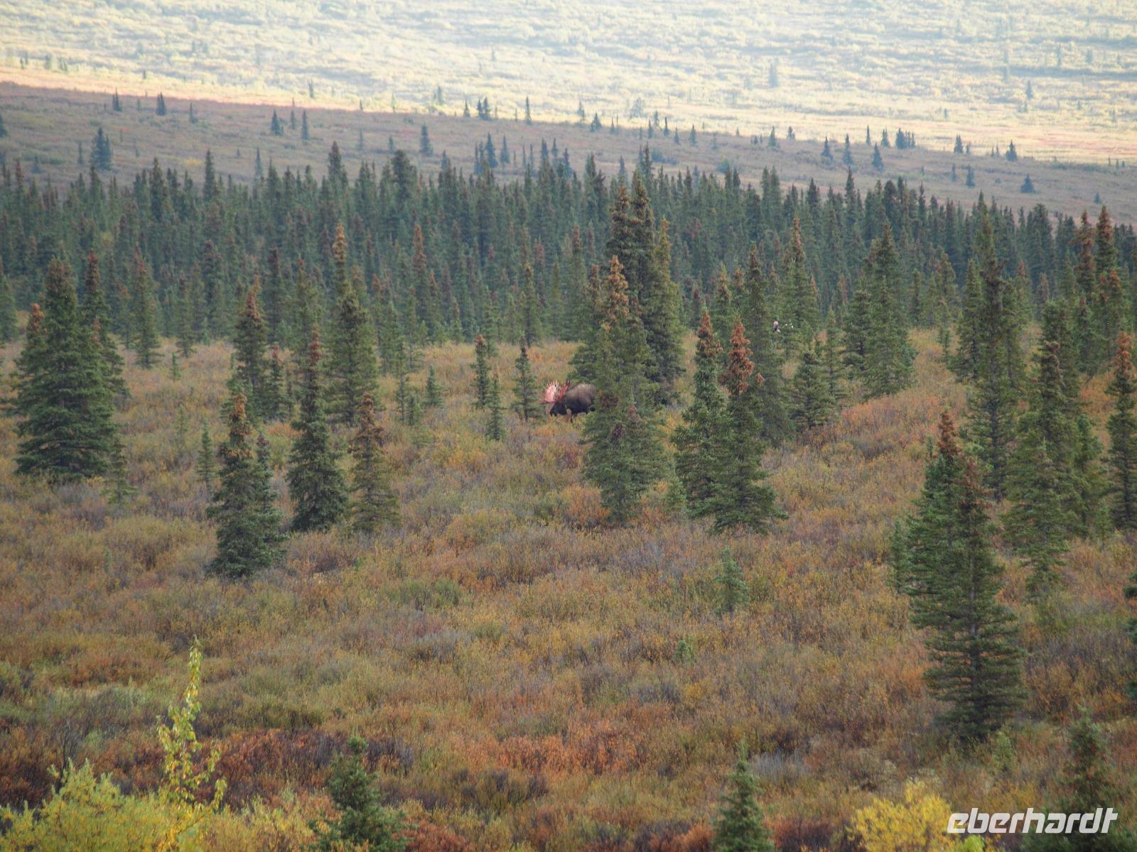 Der frühe Vogel fängt den Wurm... In unserem Fall hoffen wir allerdings auf Bär, Elch, Karibu und Co. Kurz nach dem Frühstück werden wir von Kirsty abgeholt. Sie wird uns heute zusammen mit Charlie, ihrem treuen Bus, durch den Nationalpark bis nach Kantishna bringen. Nach einer kleinen Einsammelrunde durch Denali fahren wir in den Park hinein. Kirsty gibt uns noch (lebens-)wichtige Sicherheitshinweise für den Tag und dann sehen wir auch nach ein paar Kilometern den ersten Parkbewohner, ein riesiger Elchbulle grast unweit der Straße zwischen den Bäumen. Das Klicken der Fotoapparate lässt für die nächsten fünf Minuten nicht ab. Langsam aber sicher bewegt sich Charlie vorsichtig weiter, nahezu lautlos... Ein toller Einstieg in den Tag! Bis zu unserer ersten Pause sehen wir ein Prachtexemplar von Weißkopfseeadler und einige Karibus. Kirsty erklärt uns die verschiedenen Vegetationszonen des Parks. Im Moment fahren wir durch die Taiga, charakteristisch dafür: immergrüne Bäume gemischt mit Pappeln, Espen und Birken. Sobald wir die Baumgrenze erreicht haben, wird die Taiga von der Tundra abgelöst, also nur noch selten Bäume und immer mehr Sträucher, Büsche und Gräser und Moose. Und dann ist er plötzlich da... ein Grizzly! Wir sind begeistert. Mehr Worte findet man in diesem Moment nicht. Natürlich verbringen wir viel zu wenig Zeit bei ihm, aber wir müssen weiter, die letzten Fotos werden geschossen.