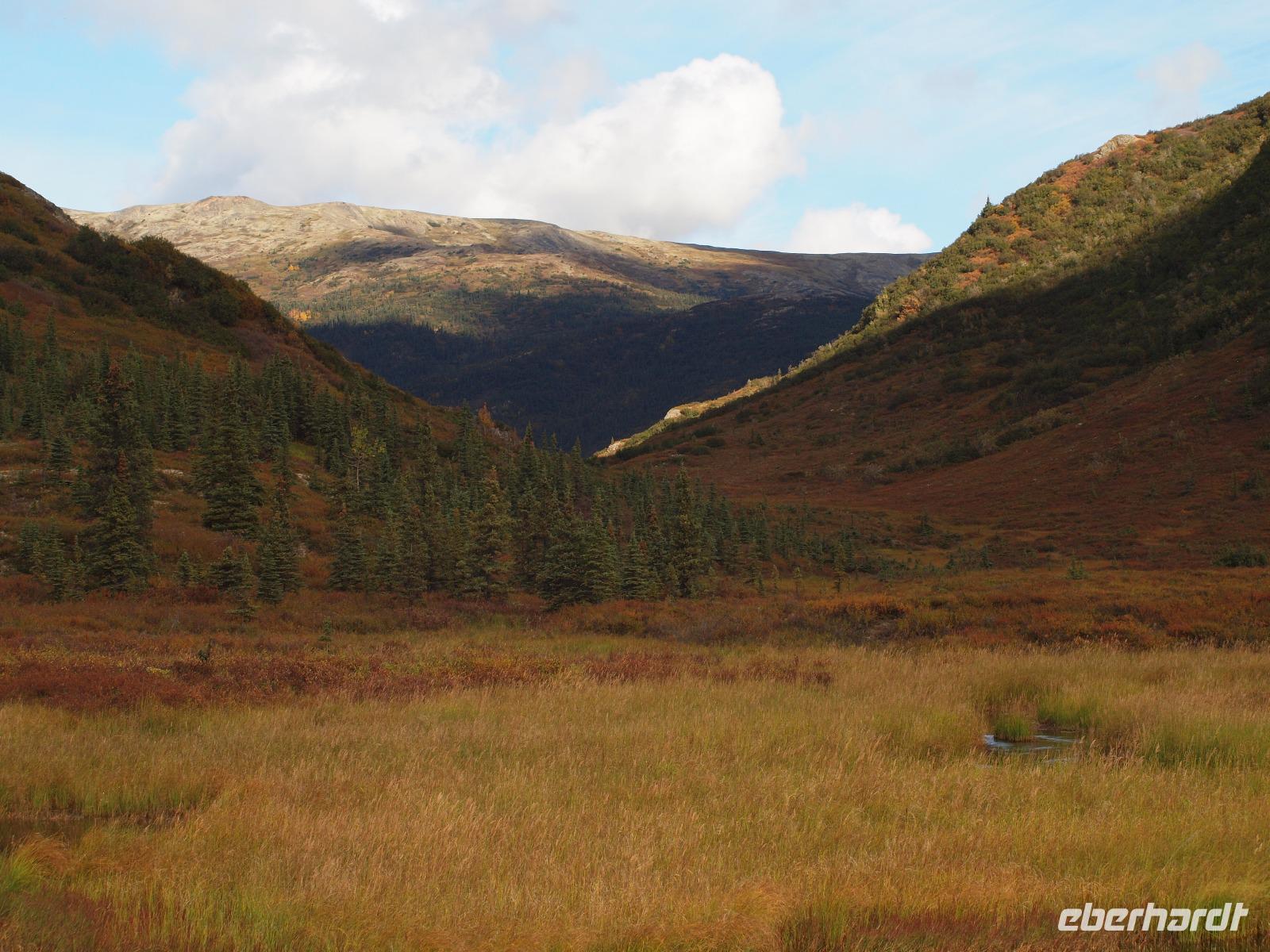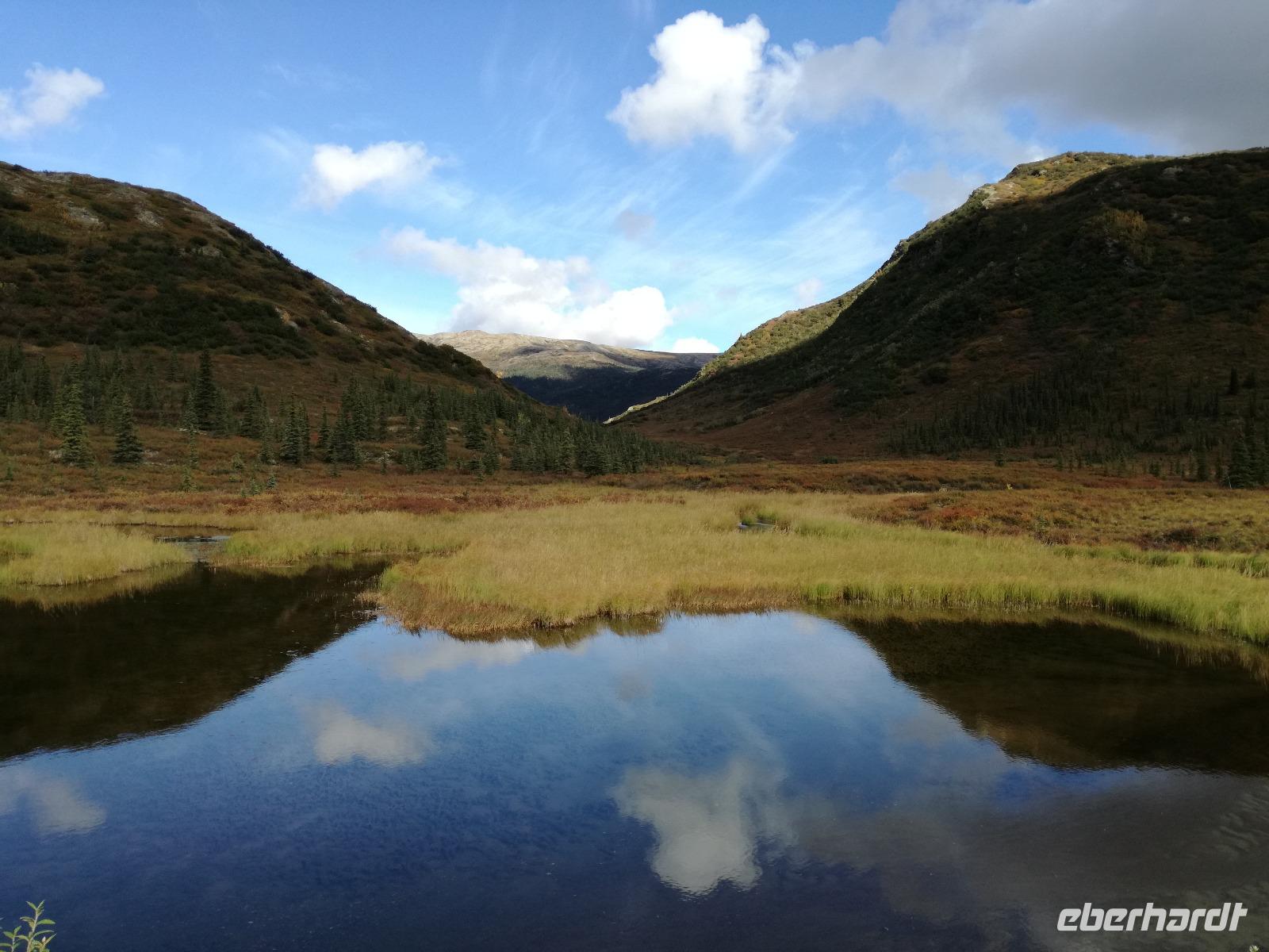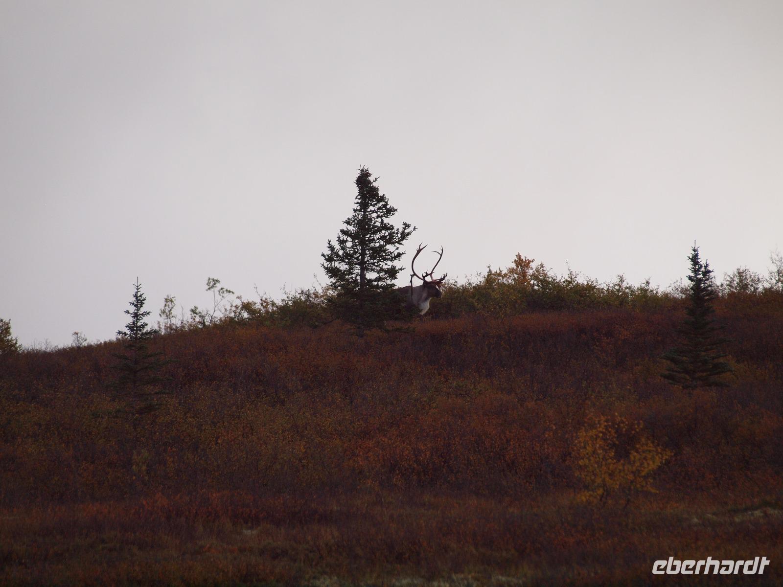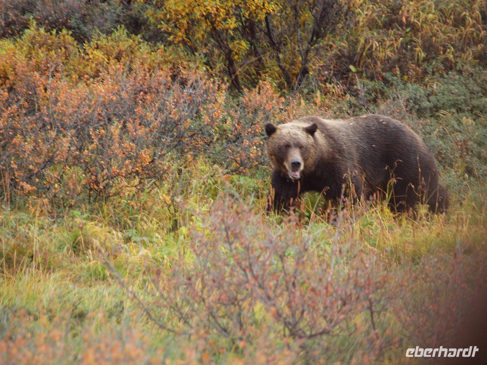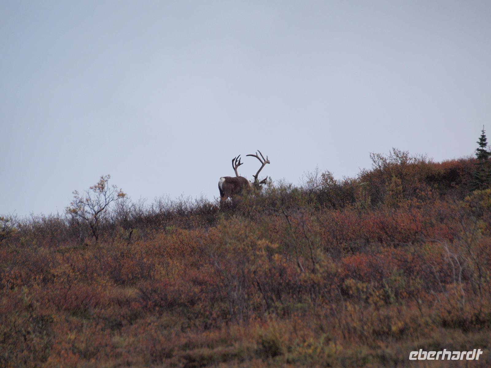 Der frühe Vogel fängt den Wurm... In unserem Fall hoffen wir allerdings auf Bär, Elch, Karibu und Co. Kurz nach dem Frühstück werden wir von Kirsty abgeholt. Sie wird uns heute zusammen mit Charlie, ihrem treuen Bus, durch den Nationalpark bis nach Kantishna bringen. Nach einer kleinen Einsammelrunde durch Denali fahren wir in den Park hinein. Kirsty gibt uns noch (lebens-)wichtige Sicherheitshinweise für den Tag und dann sehen wir auch nach ein paar Kilometern den ersten Parkbewohner, ein riesiger Elchbulle grast unweit der Straße zwischen den Bäumen. Das Klicken der Fotoapparate lässt für die nächsten fünf Minuten nicht ab. Langsam aber sicher bewegt sich Charlie vorsichtig weiter, nahezu lautlos... Ein toller Einstieg in den Tag! Bis zu unserer ersten Pause sehen wir ein Prachtexemplar von Weißkopfseeadler und einige Karibus. Kirsty erklärt uns die verschiedenen Vegetationszonen des Parks. Im Moment fahren wir durch die Taiga, charakteristisch dafür: immergrüne Bäume gemischt mit Pappeln, Espen und Birken. Sobald wir die Baumgrenze erreicht haben, wird die Taiga von der Tundra abgelöst, also nur noch selten Bäume und immer mehr Sträucher, Büsche und Gräser und Moose. Und dann ist er plötzlich da... ein Grizzly! Wir sind begeistert. Mehr Worte findet man in diesem Moment nicht. Natürlich verbringen wir viel zu wenig Zeit bei ihm, aber wir müssen weiter, die letzten Fotos werden geschossen.