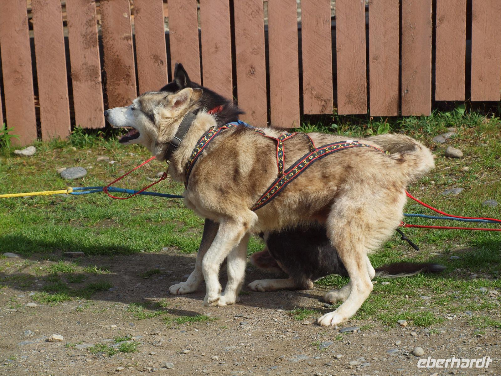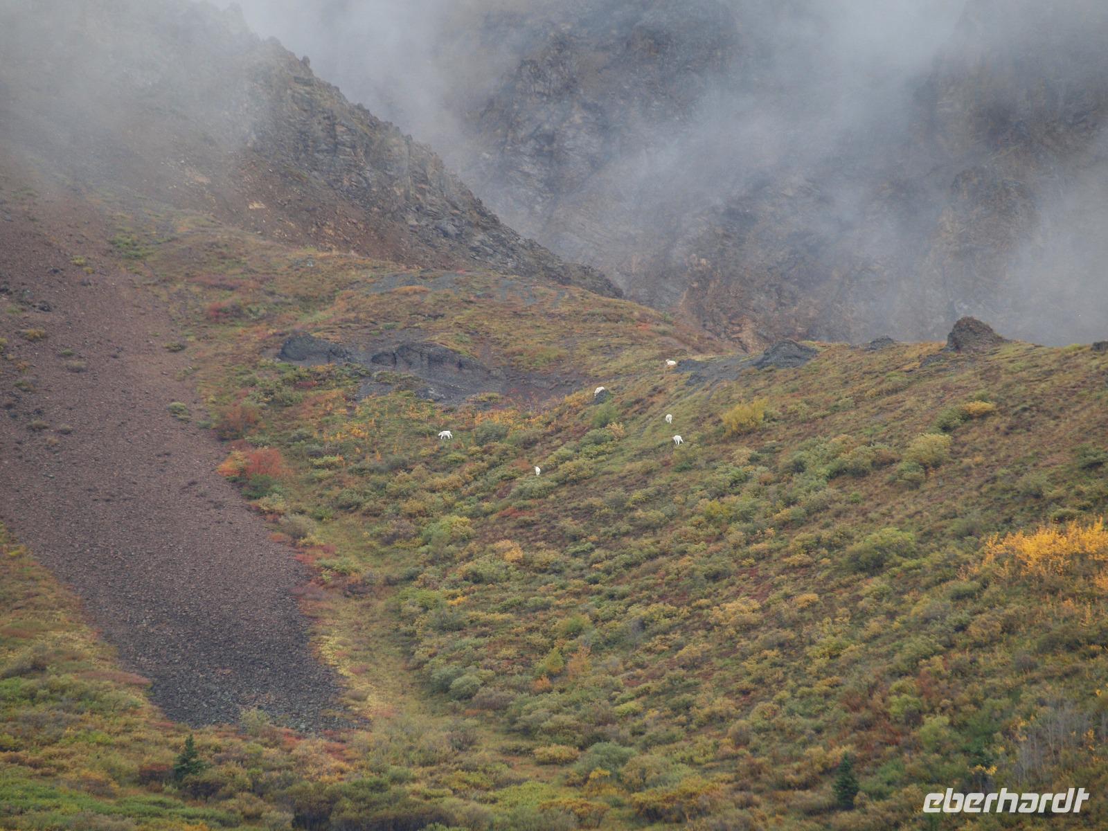 Unseren nächsten Foto-Stopp legen wir beim Polychrome Pass ein. Unterwegs zum Eielson Visitor Center sehen wir noch ein paar Karibu und Dall-Schafe. Diese sind übrigens der Grund, weshalb dieser Nationalpark im Jahre 1917 gegründet wurde. Um den Bestand der Dall-Schafe vor Wilderern zu schützen. Im Herzen des Parks liegt auch der höchste Berg Nordamerikas, der Denali, früher Mount McKinley, mit einer Höhe von 6.195 Metern. Wir sehen von ihm leider nicht viel. Beim Besuchercenter angekommen machen wir für ca 20 Minuten eine Pause. Wobei sich diese Pause unfreiwillig um ein paar Minuten verlängert, weil sich ein weiterer Grizzly die Mühe gibt unsere volle Aufmerksamkeit auf sich zu ziehen. So viele Wildtiere und wir haben noch nicht mal die Hälfte des Tages hinter uns, unglaublich! Wir fahren weiter zum Kantishna Roadhouse, hier bleiben wir für eine Weile, bekommen einen Mittagssnack und können beim Goldschürfen unser Glück herausfordern oder den Hundeschlitten bei einer kleinen Vorführung zusehen...