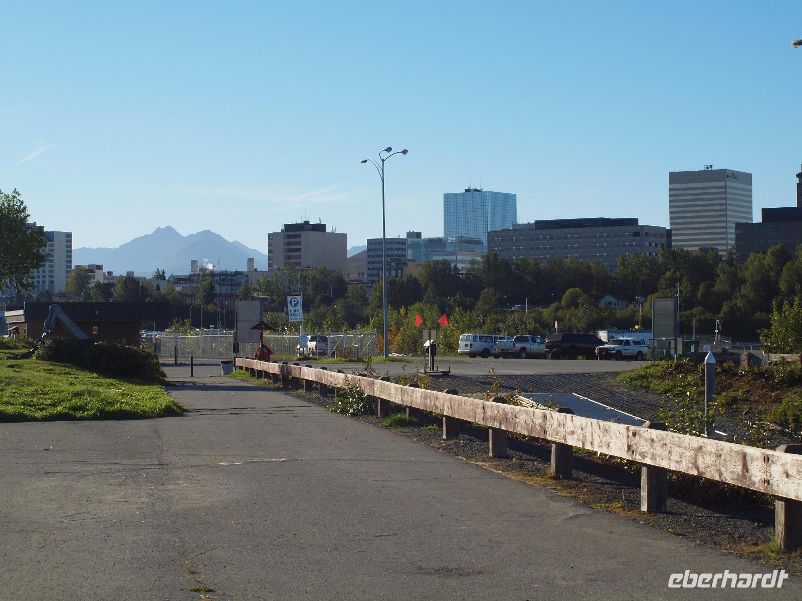Nach dem Frühstück unternehmen wir eine Stadtrundfahrt durch Anchorage, von dieser Stadt hatten wir ja zu Beginn der Reise noch nichts, außer dem Flughafen gesehen.