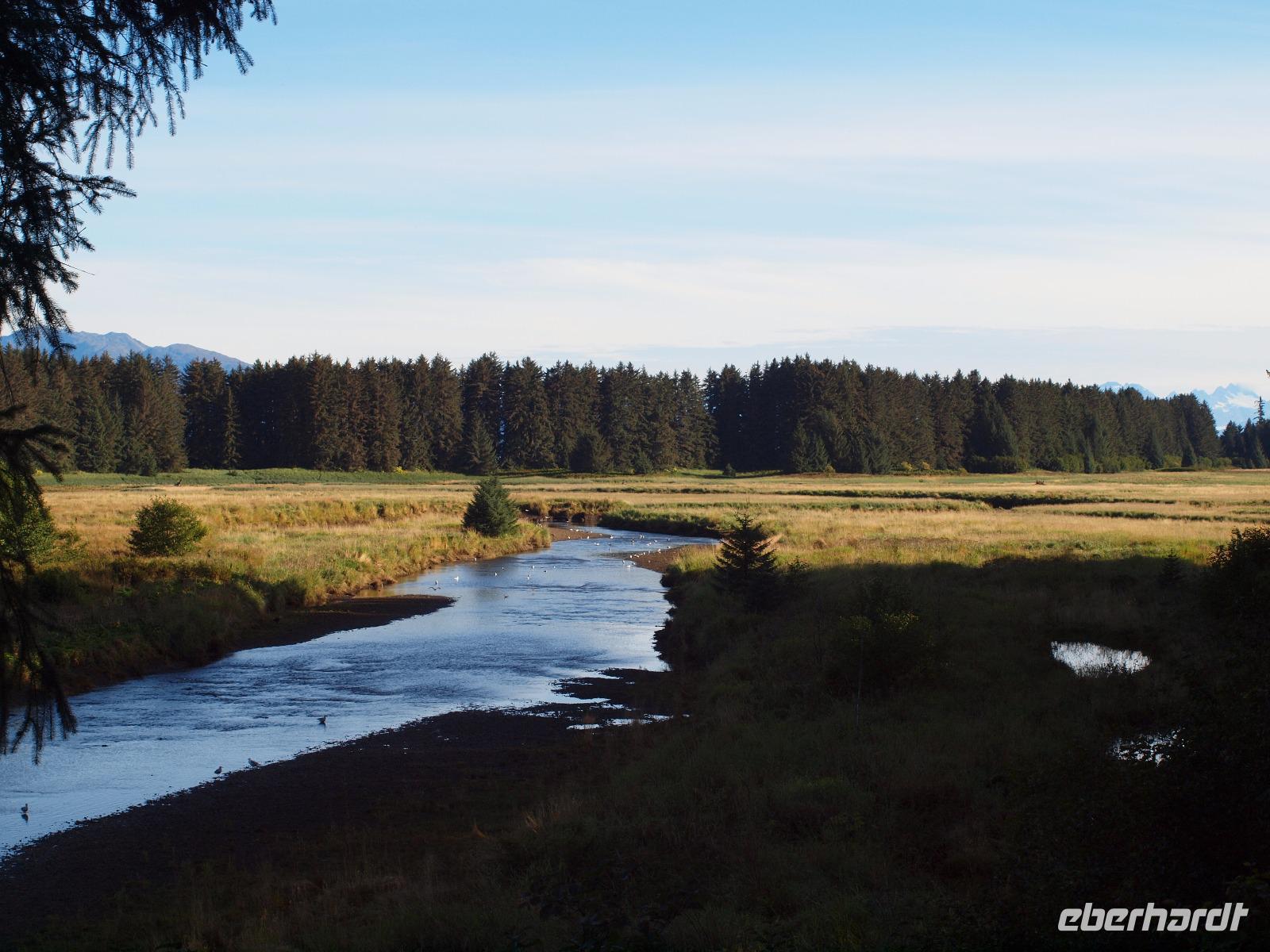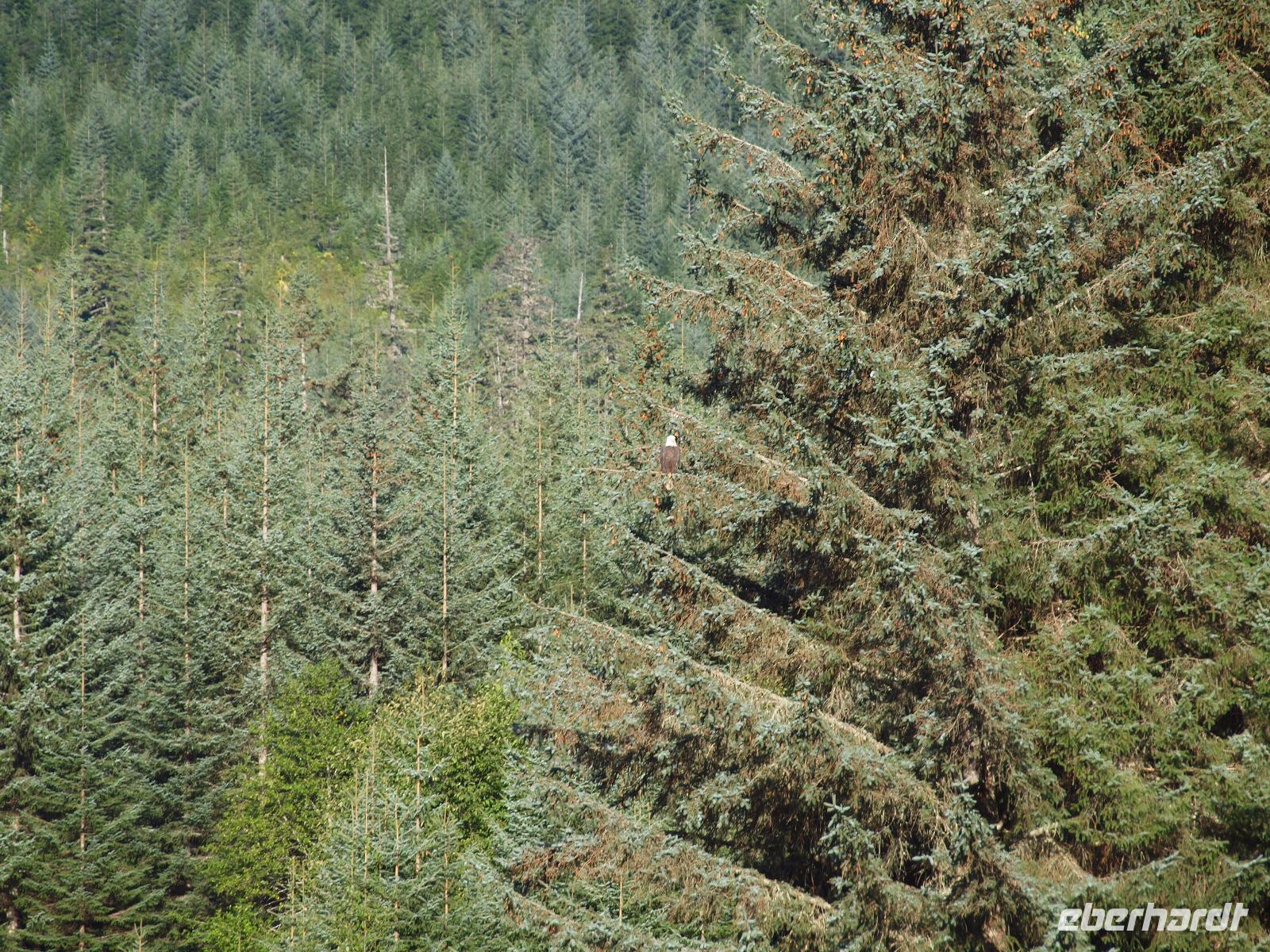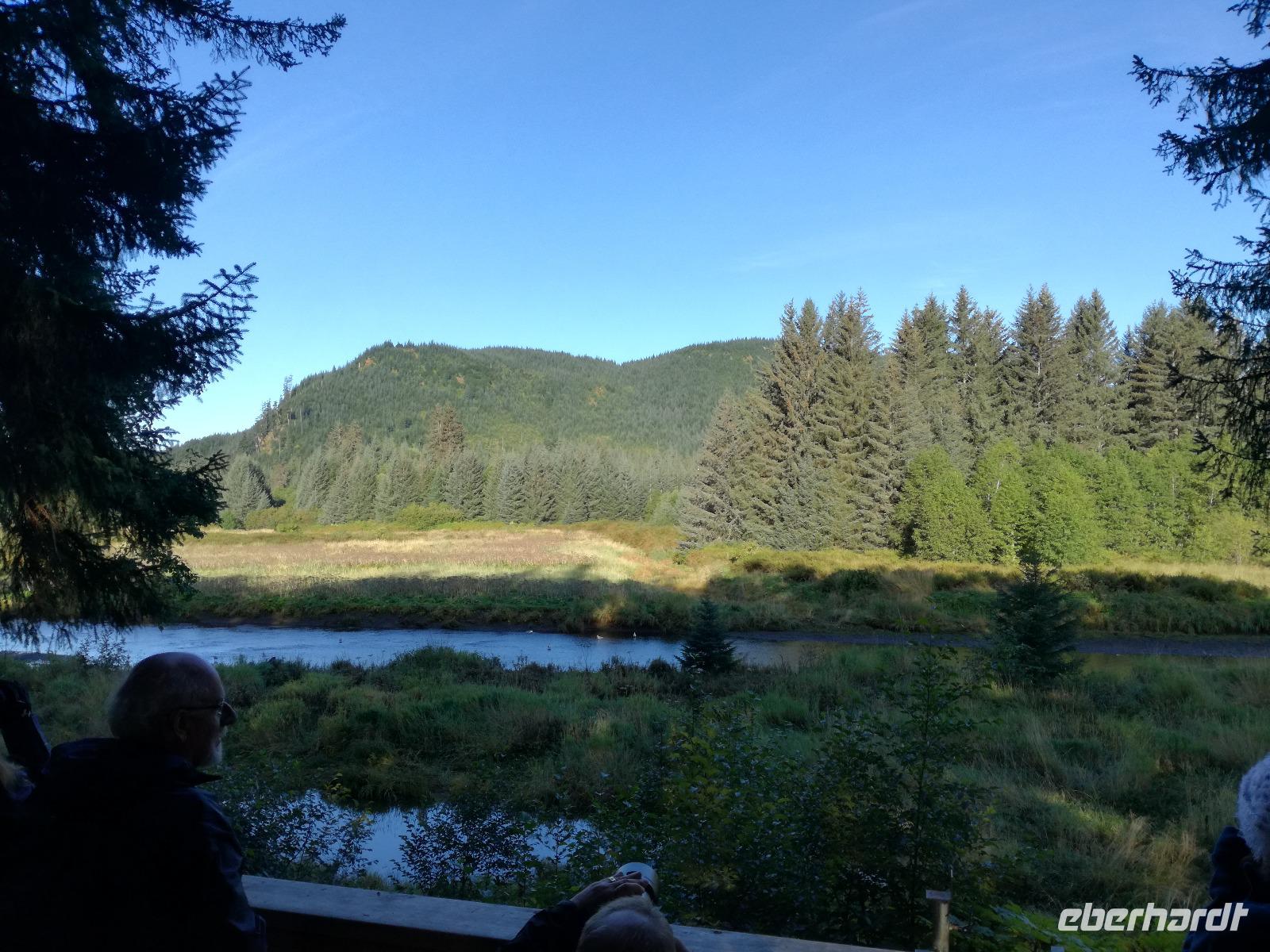 Wir haben insgesamt drei Aussichtsplattformen zur Verfügung um die ganze Umgebung ausgiebig zu beobachten. Im großen Nadelbaum auf der anderen Seite des Bachs sehen wir sogar einen Weißkopfseeadler mit einem Jungtier.