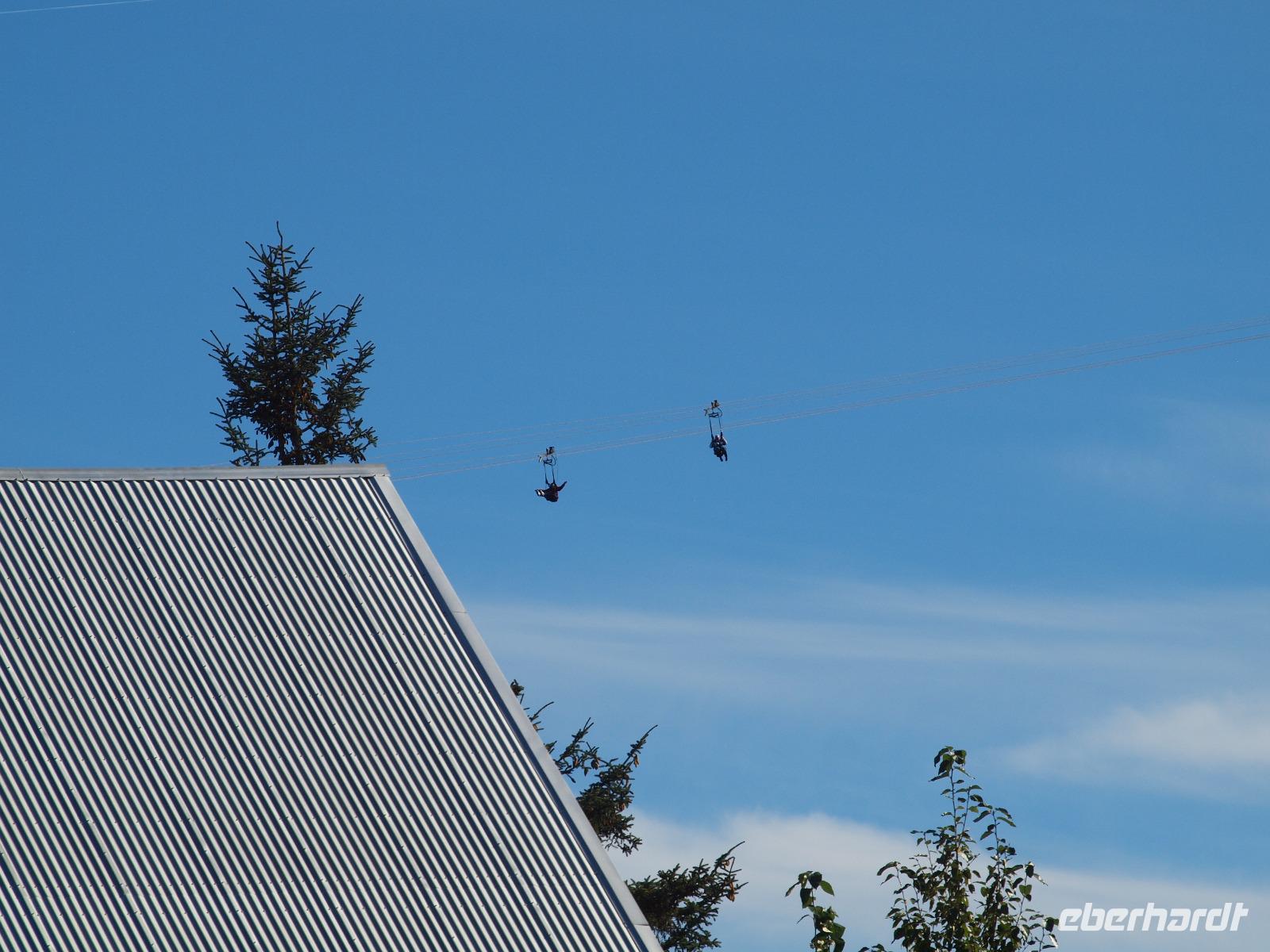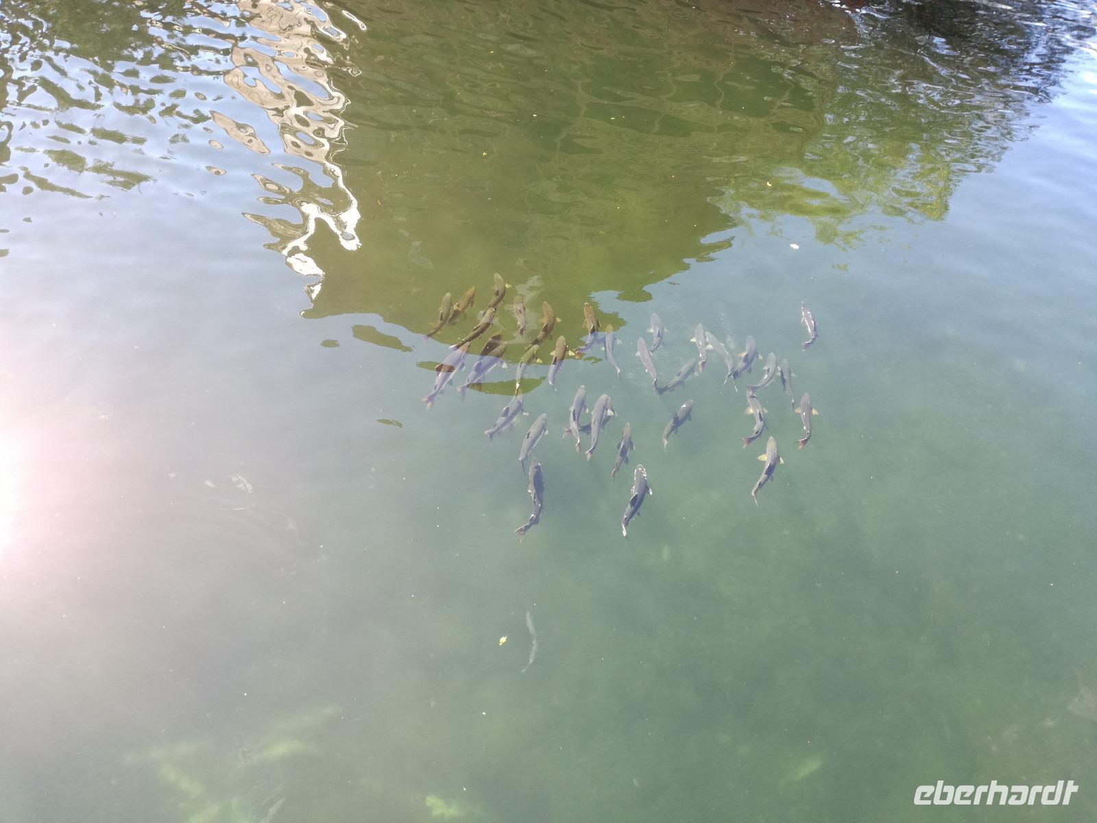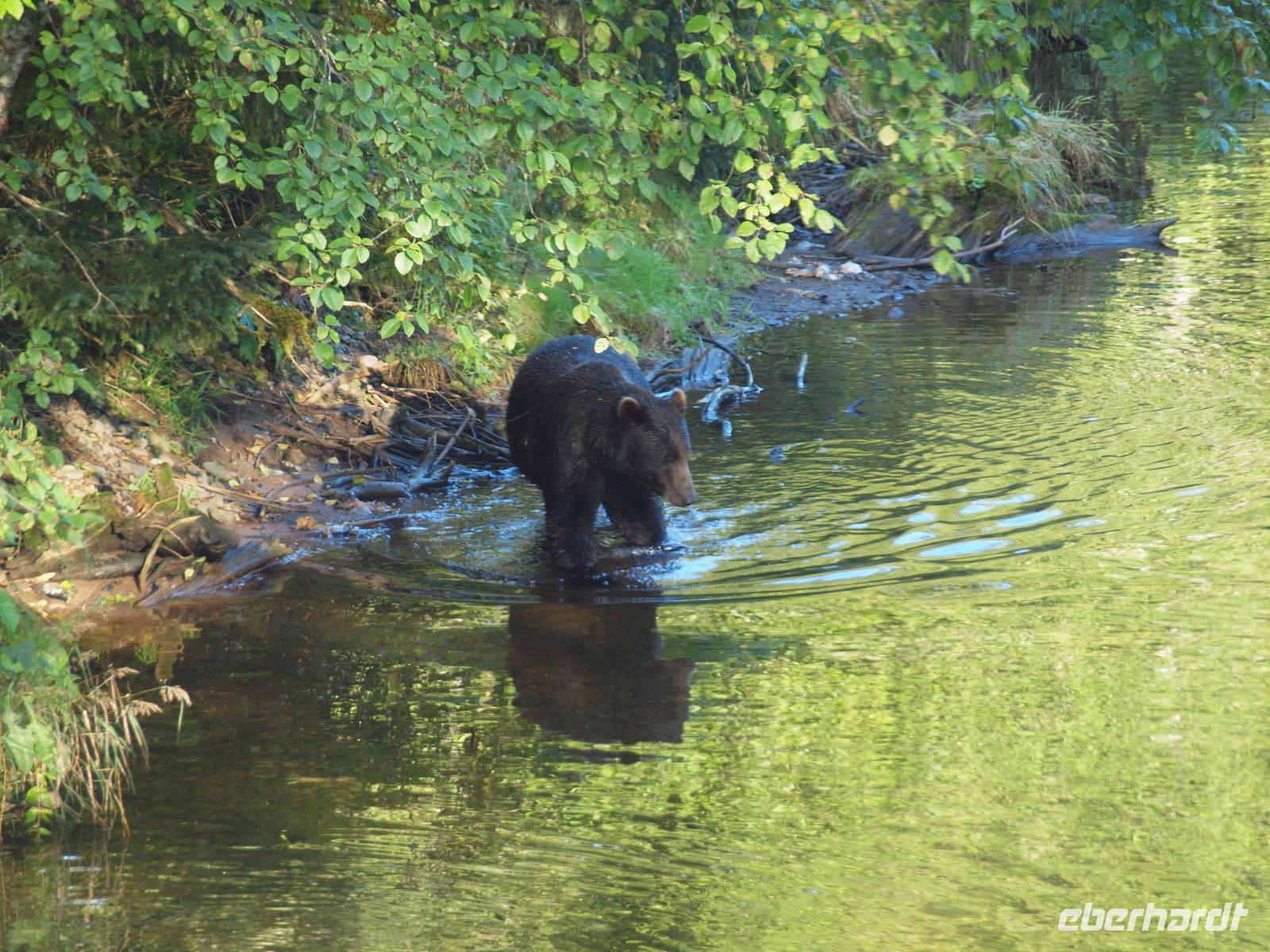 Wir haben insgesamt drei Aussichtsplattformen zur Verfügung um die ganze Umgebung ausgiebig zu beobachten. Im großen Nadelbaum auf der anderen Seite des Bachs sehen wir sogar einen Weißkopfseeadler mit einem Jungtier.