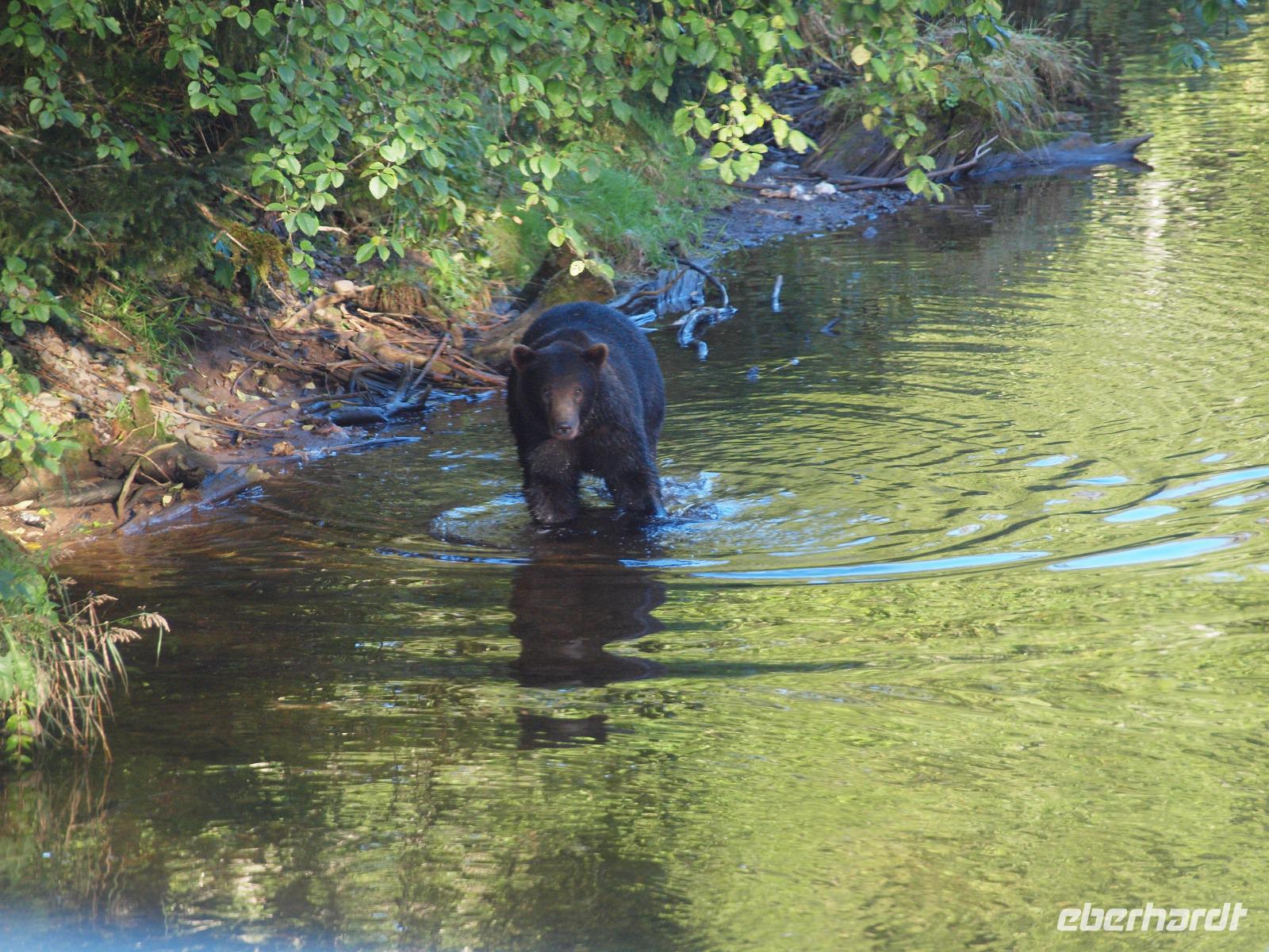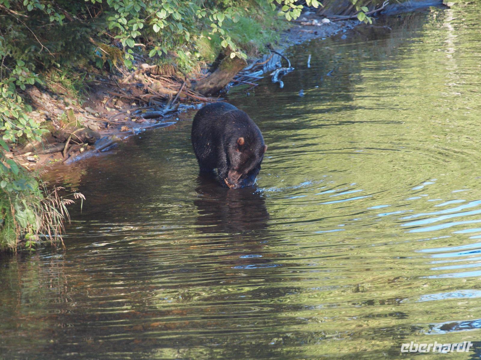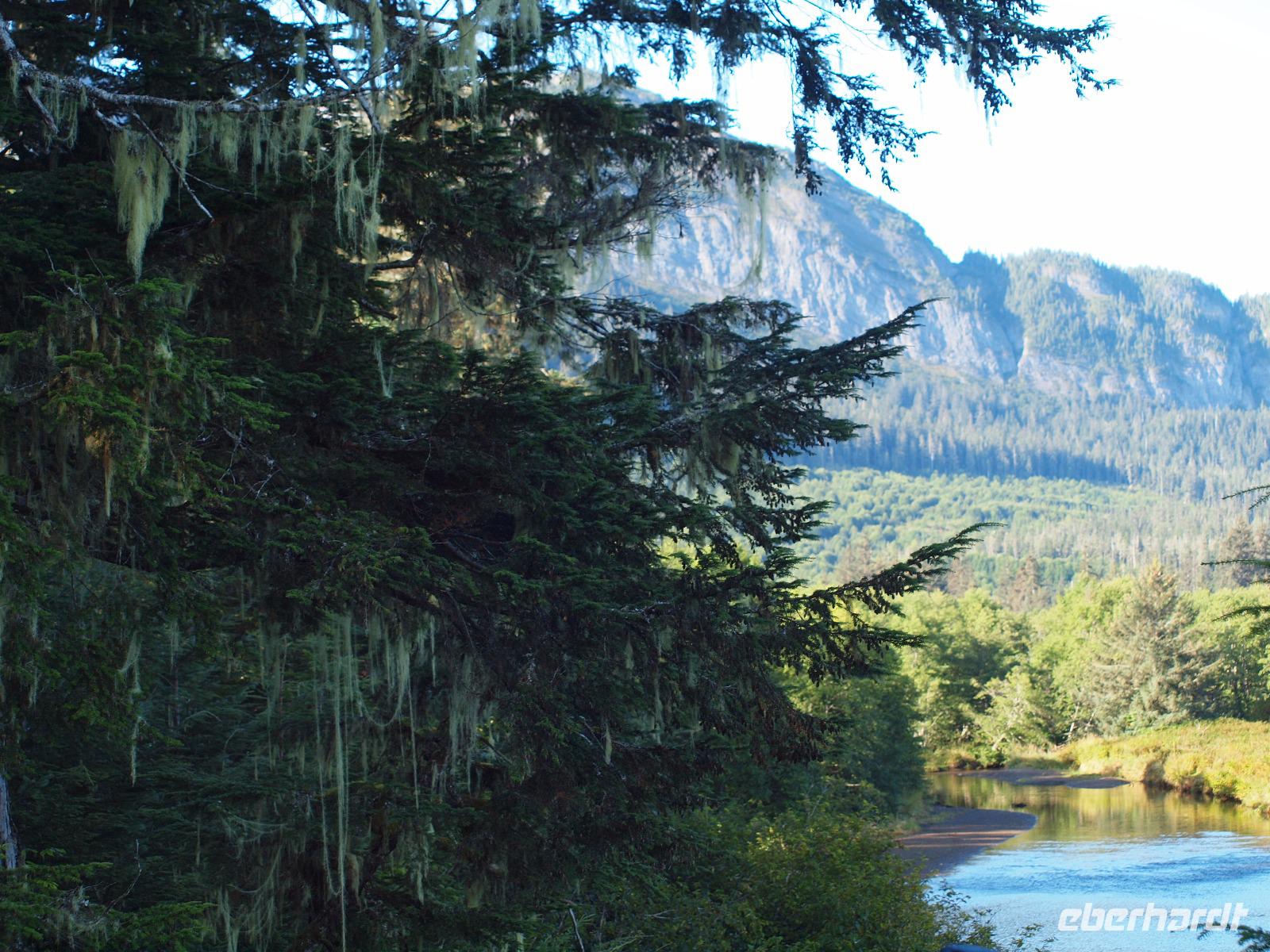 Wir kommen sehr früh auf der kleinen Insel an. Es ist ziemlich frisch heute und im Adventure Center angekommen warten wir, dass unser Ausflug "Wahles and Wildlife" los geht. Wir werden von unserem Guide abgeholt und gemeinsam gehen wir zum Bus. Die Hauptgemeinde Hoonah liegt nur ein paar Minuten vom Hafen entfernt und innerhalb eines Augenaufschlages waren wir auch schon wieder aus der Gemeinde draußen. Wir fahren zuerst in ein kleines abseits gelegenes Waldstück. Bevor wir dieses jedoch erreichen, sehen wir beim Überqueren einer Brücke einen Braunbären im Fluss. Erst scheint es als sei er verschwunden, doch nach ein paar Augenblicken kommt er zurück und genießt es förmlich vor versammelter Mannschaft seinen Fisch zu fressen. Nun geht es aber weiter in den Wald. Wir bekommen einen echten Ranger zur Seite gestellt und begeben uns über einen Pfand in die wilde Wildnis!