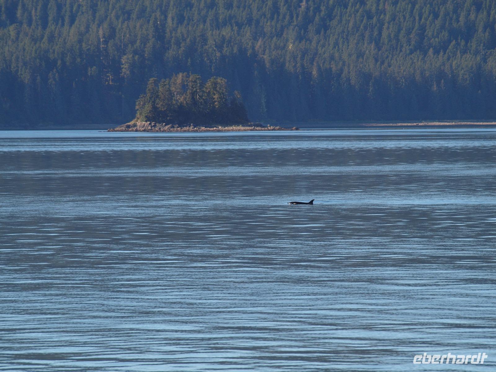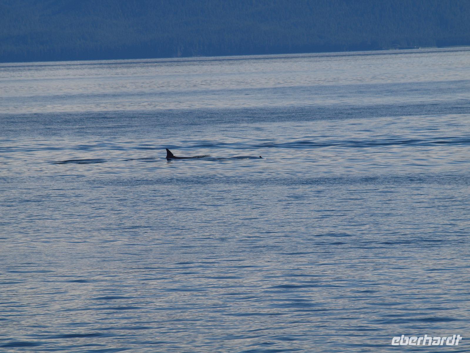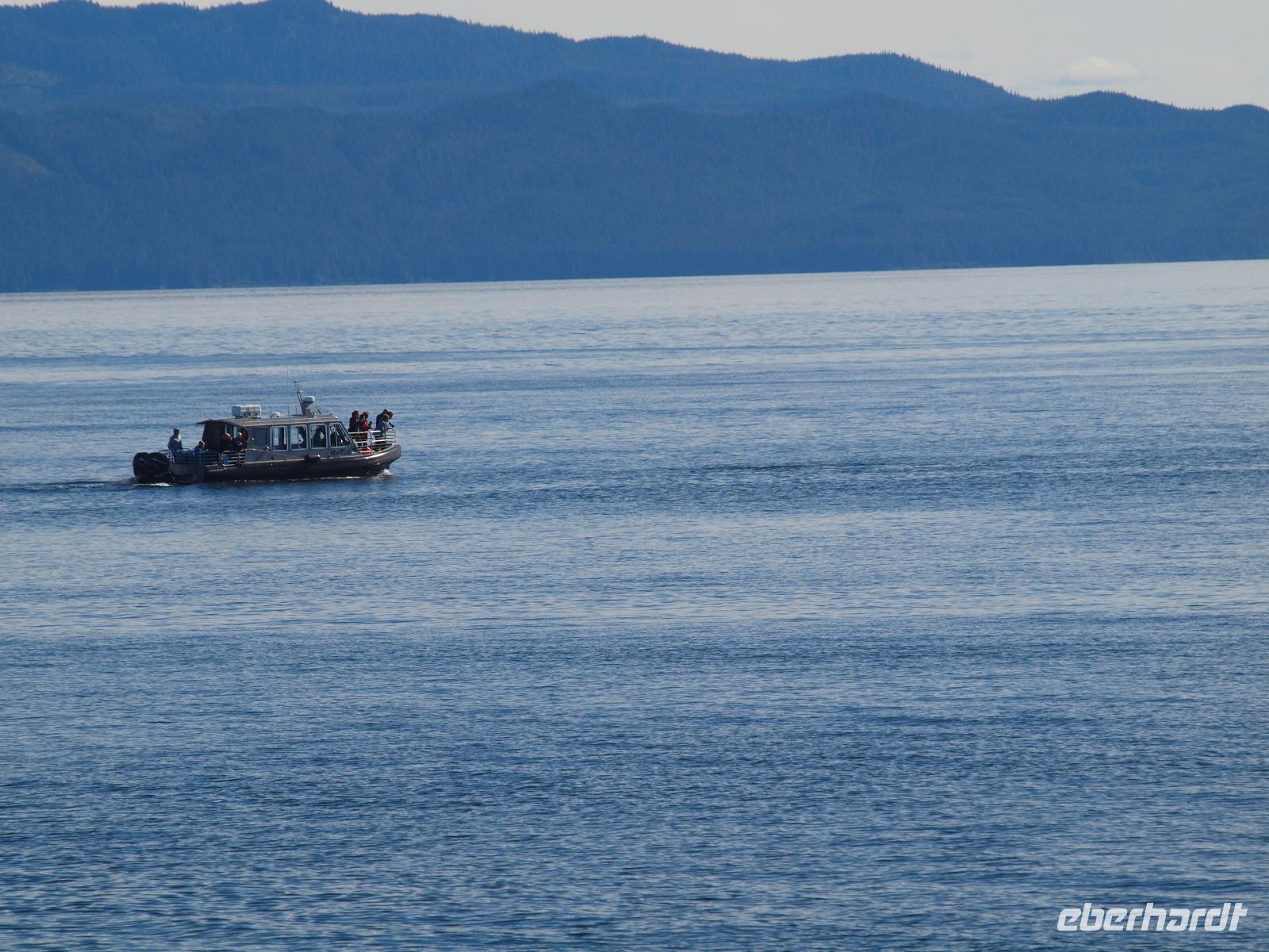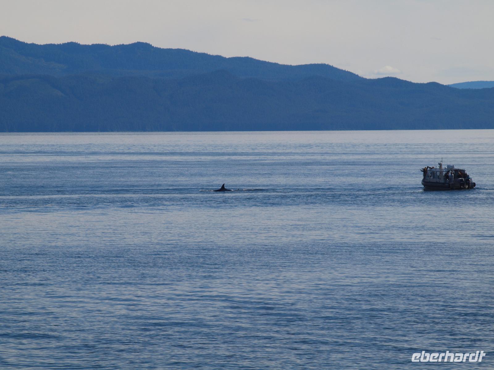 Nach diesem Abstecher in den Wald heißt es nun wieder zurück aufs Wasser, Wale beobachten. Die Bootstour dauert noch nicht sehr lange und schon werden wir langsamer... was ist da nur los? Der Kapitän teilt uns über die Lautsprecher mit, dass er die erste Überraschung für uns hat... Orcas! Wahnsinn, direkt vor uns schwimmen sie! Wir können es kaum glauben. Ein paar von uns haben die Chance ein oder zwei gute Bilder von den Tieren zu schießen. Wir verbringen ca eine halbe Stunde, dann müssen wir weiter, so sind die Vorschriften. Wir fahren wieder ein gutes Stück, immer weiter weg von Icy Strait Point und genießen die warem Sonnenstrahlen bei herrlicher Kulisse. Kurz darauf werden wir wieder langsamer... Buckelwale. Ziemlich weit weg und mehr als die Fluke und ein paar Fontänen sieht man leider nicht, aber es waren Buckelwale! Auf dem Rückweg haben wir die Hoffnung die Orcas noch einmal zu sehen, leider ohne Erfolg.