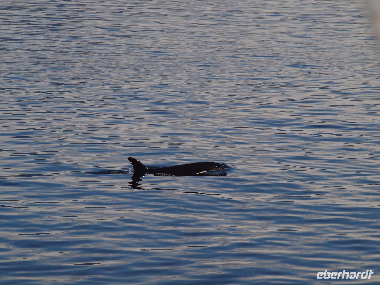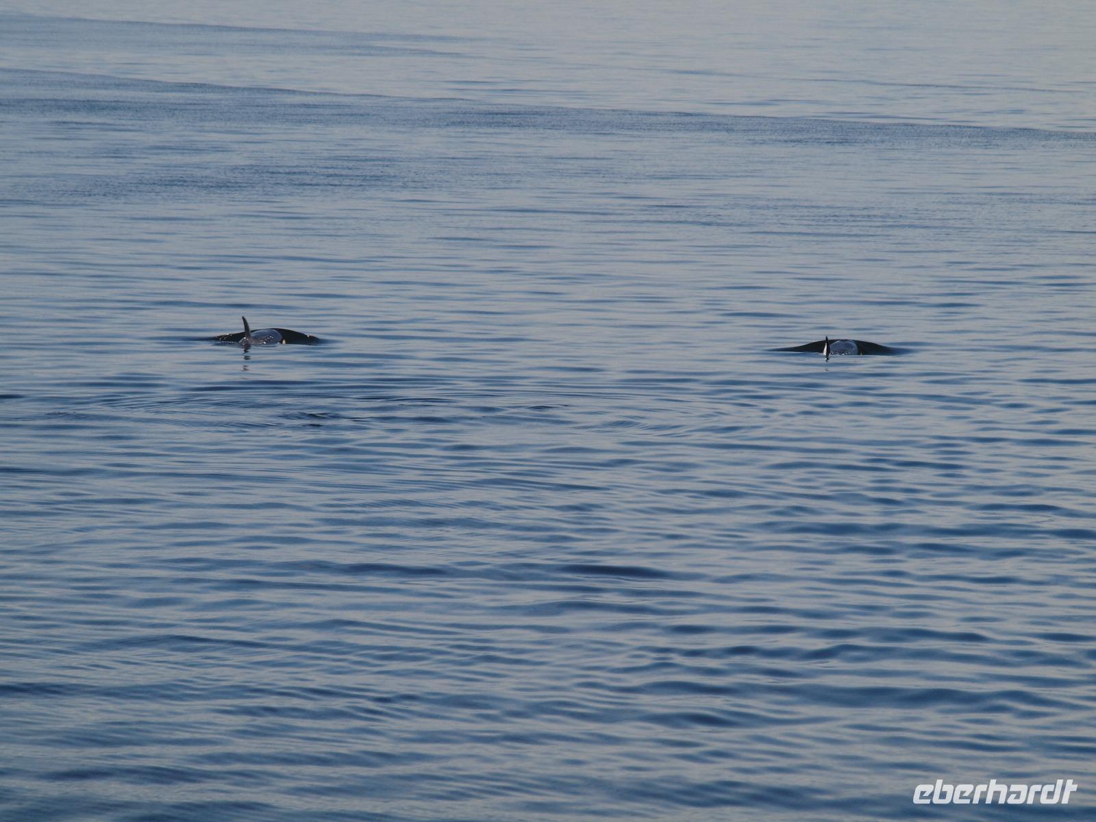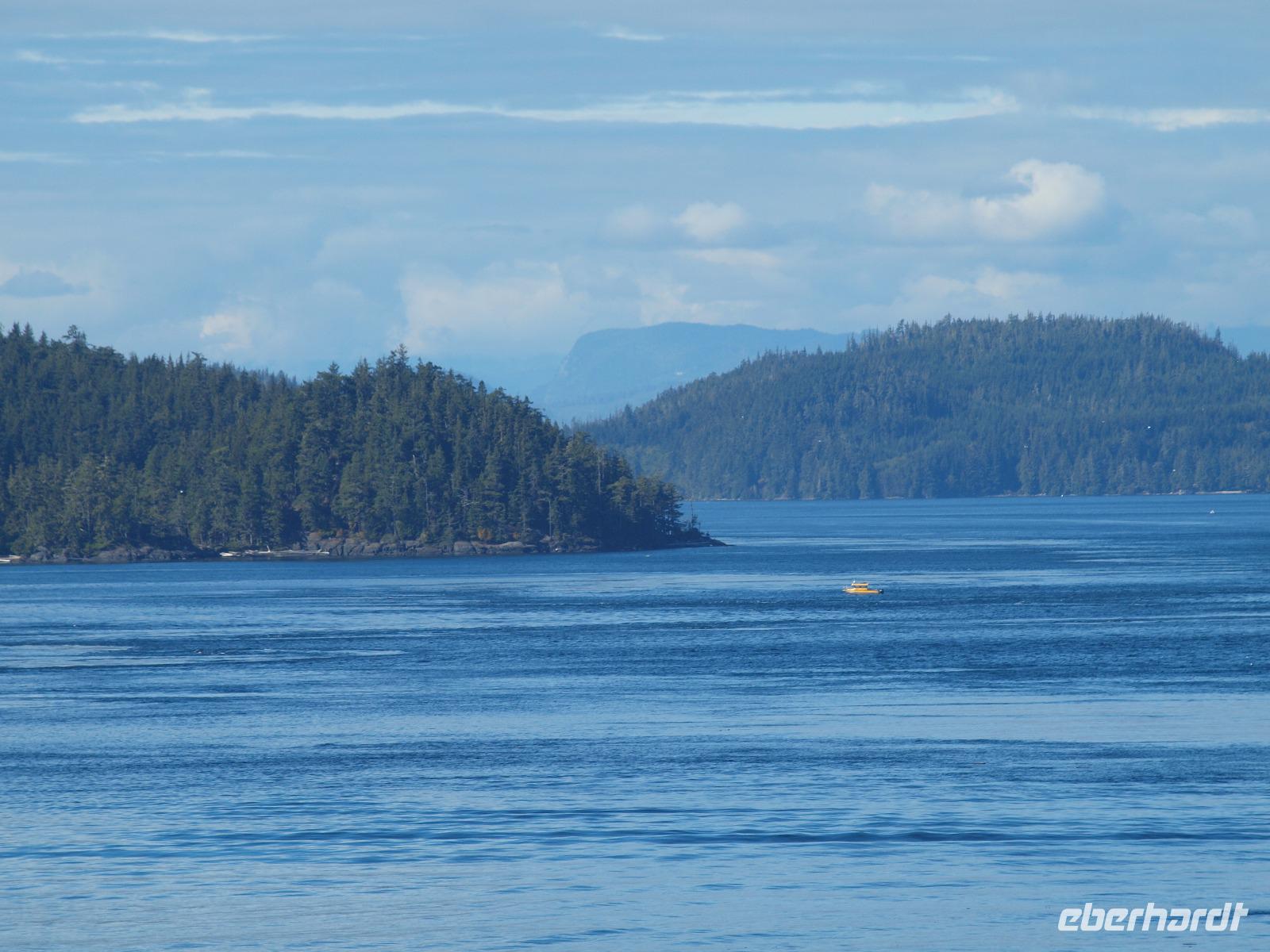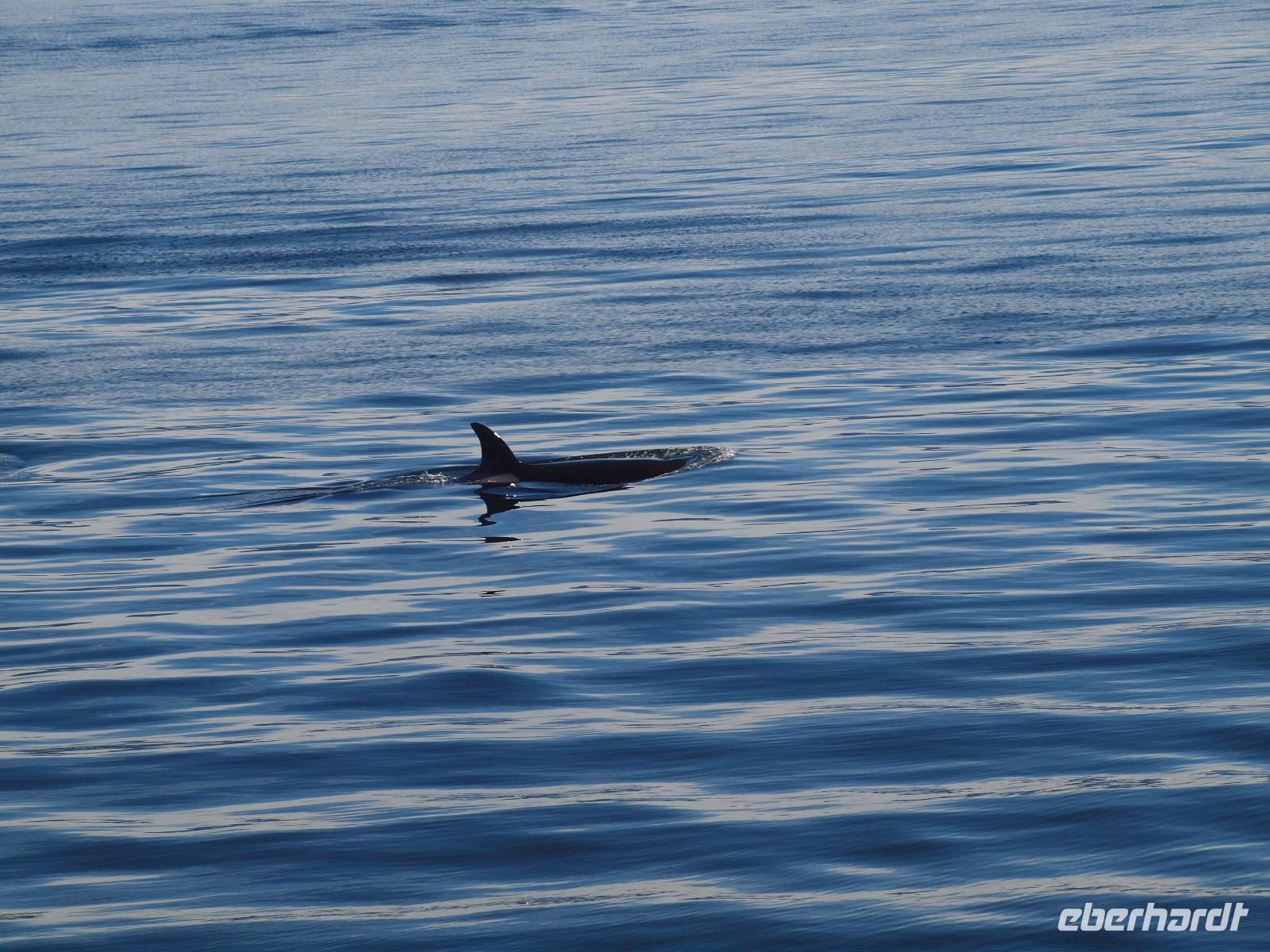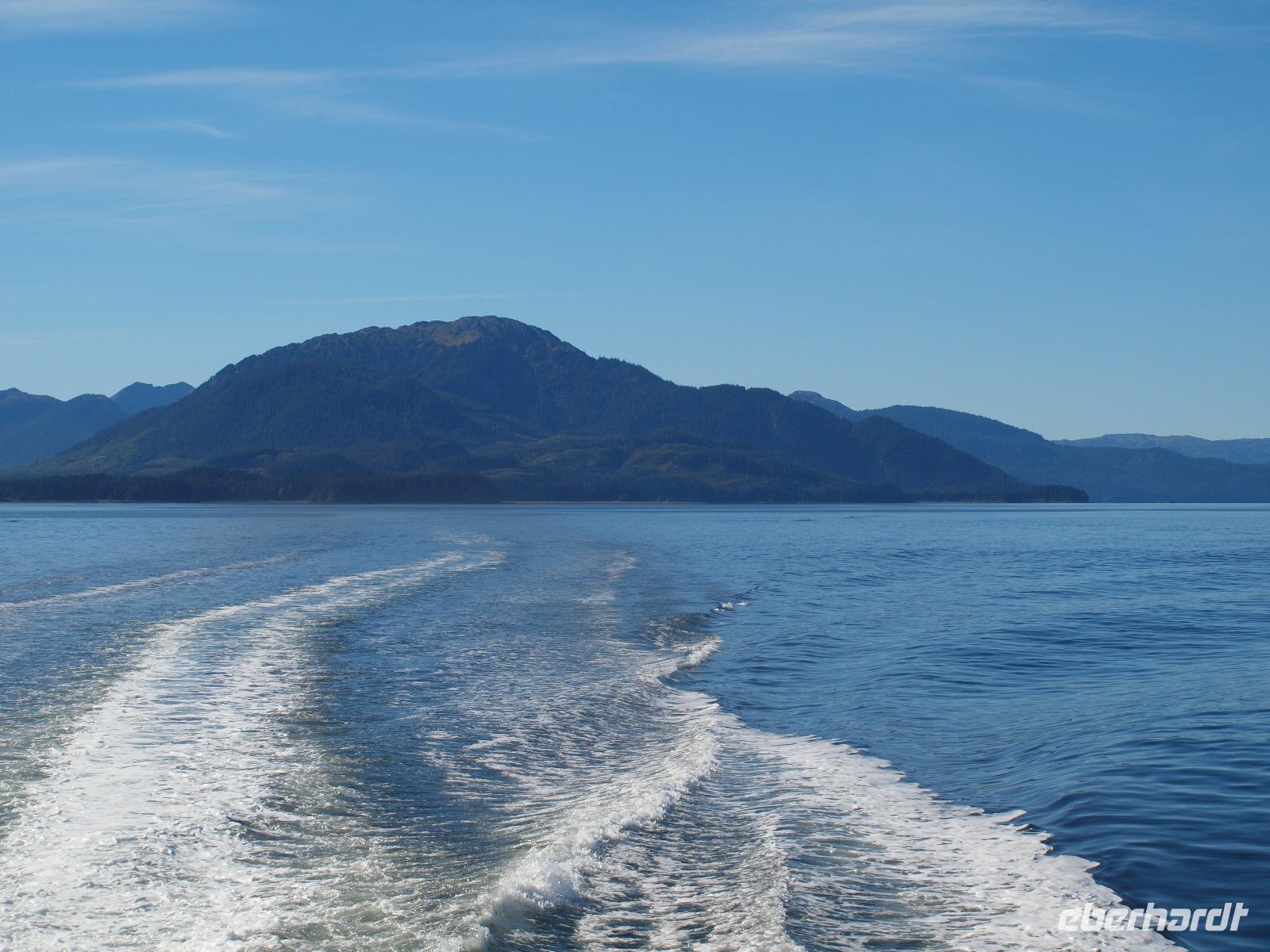 Nach diesem Abstecher in den Wald heißt es nun wieder zurück aufs Wasser, Wale beobachten. Die Bootstour dauert noch nicht sehr lange und schon werden wir langsamer... was ist da nur los? Der Kapitän teilt uns über die Lautsprecher mit, dass er die erste Überraschung für uns hat... Orcas! Wahnsinn, direkt vor uns schwimmen sie! Wir können es kaum glauben. Ein paar von uns haben die Chance ein oder zwei gute Bilder von den Tieren zu schießen. Wir verbringen ca eine halbe Stunde, dann müssen wir weiter, so sind die Vorschriften. Wir fahren wieder ein gutes Stück, immer weiter weg von Icy Strait Point und genießen die warem Sonnenstrahlen bei herrlicher Kulisse. Kurz darauf werden wir wieder langsamer... Buckelwale. Ziemlich weit weg und mehr als die Fluke und ein paar Fontänen sieht man leider nicht, aber es waren Buckelwale! Auf dem Rückweg haben wir die Hoffnung die Orcas noch einmal zu sehen, leider ohne Erfolg.