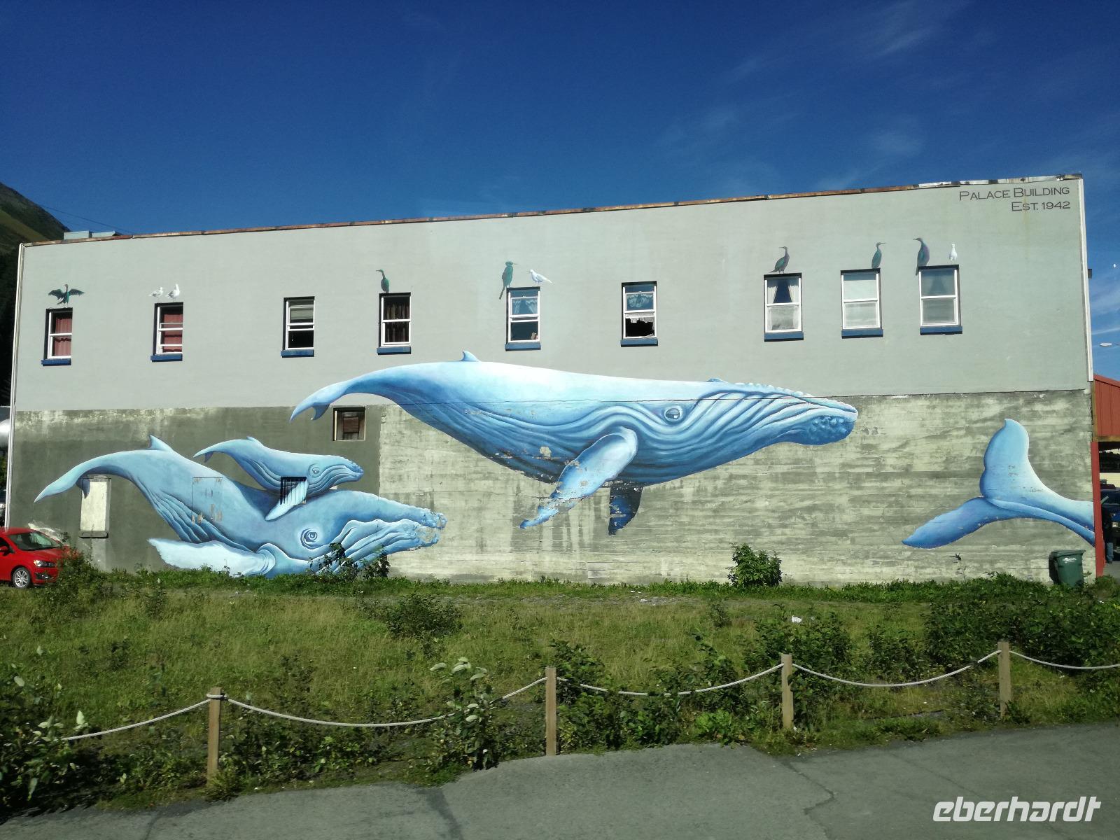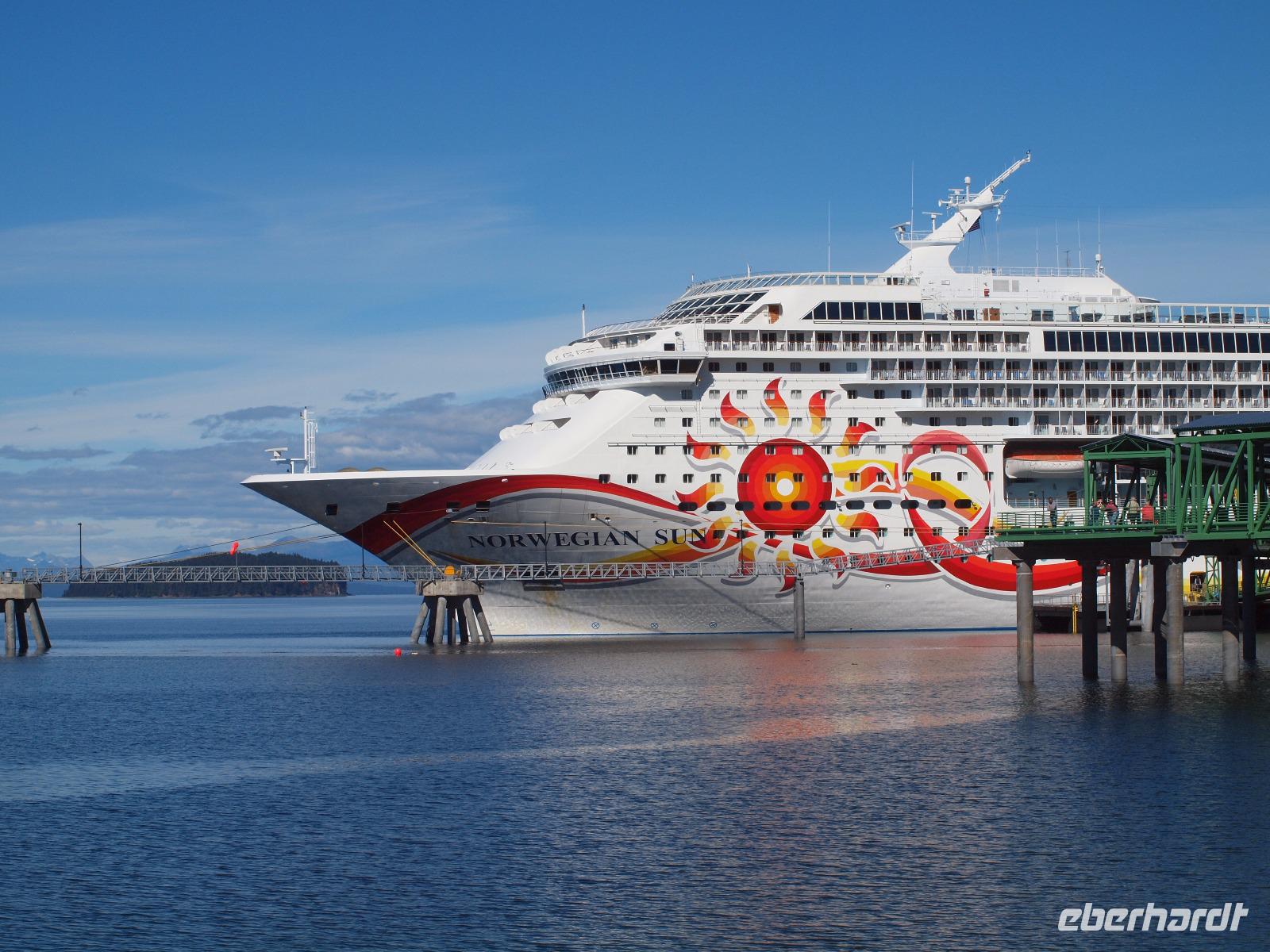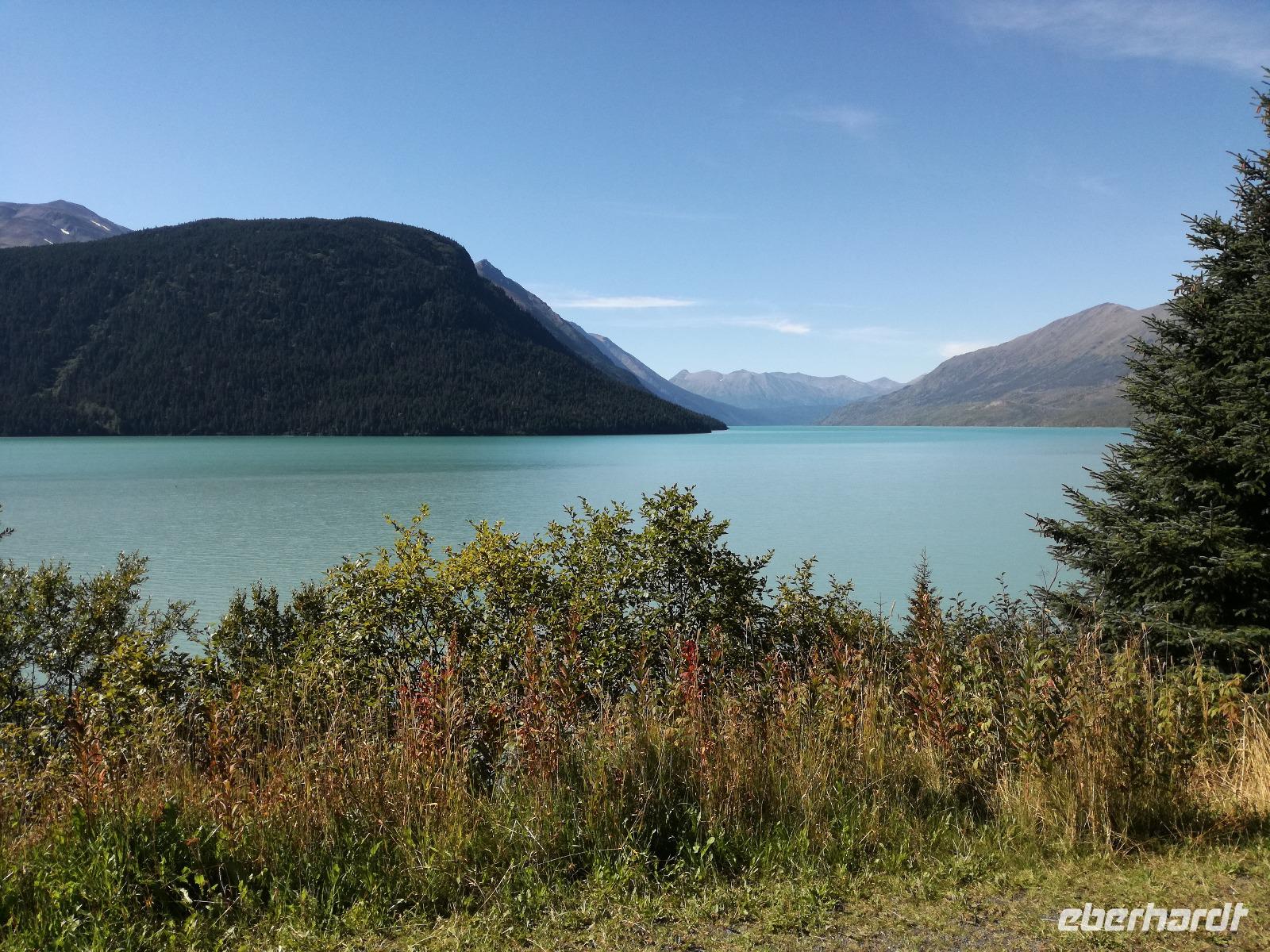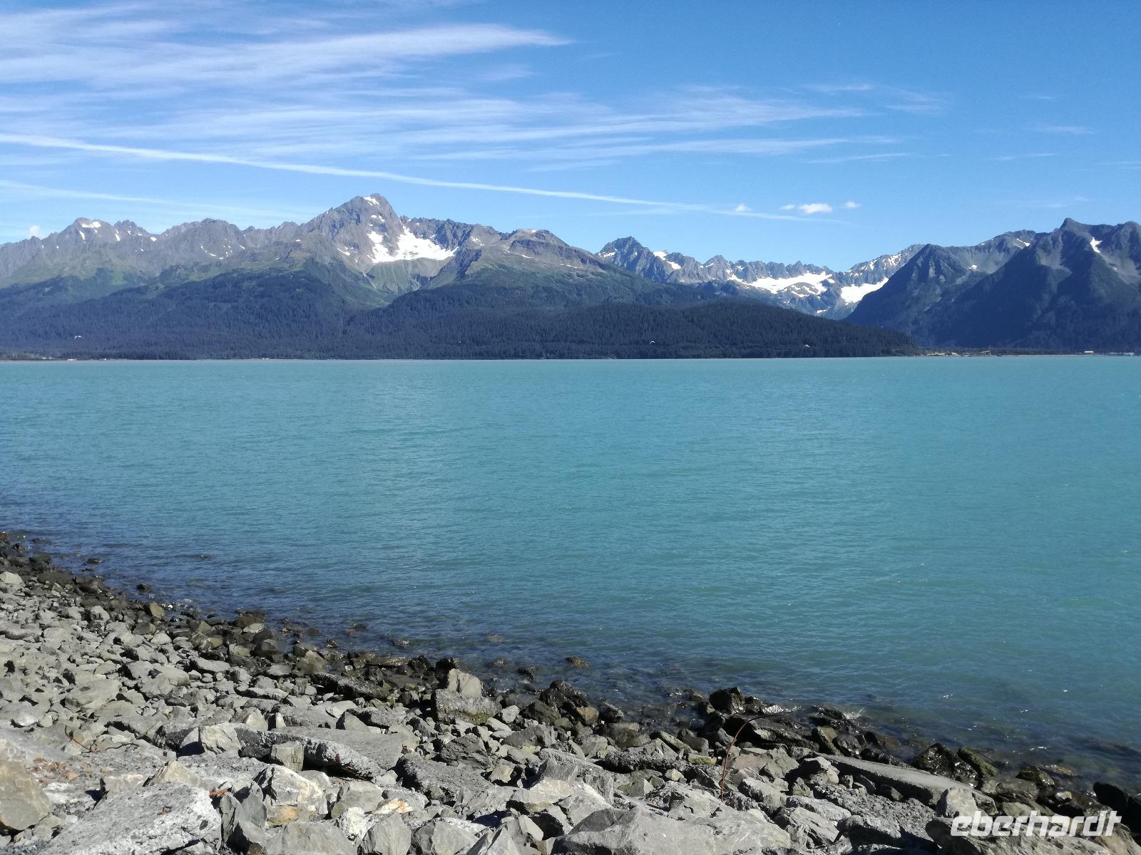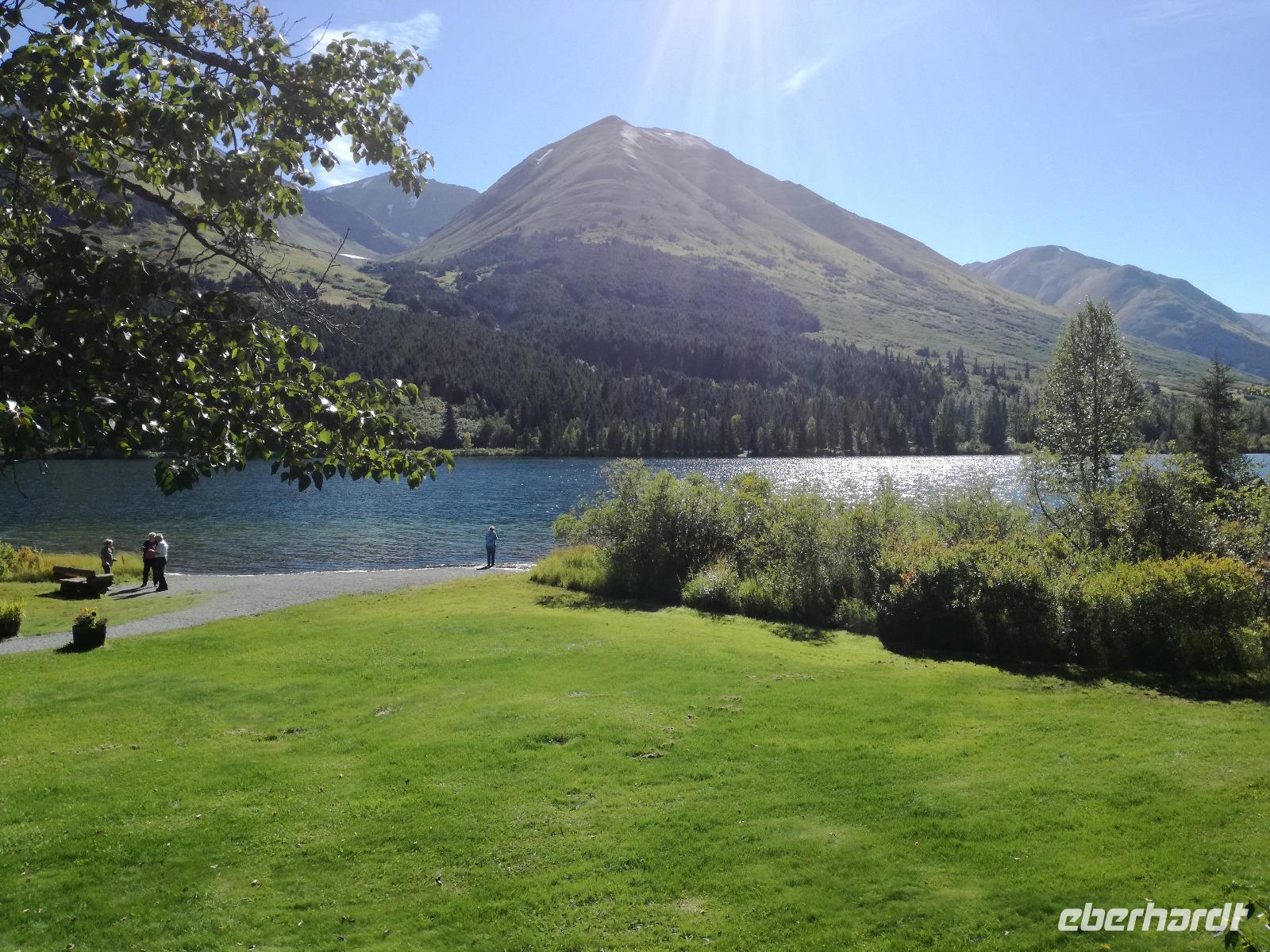Unsere Fahrt führt uns am Kenaisee entlang und an einem Aussichtspunkt, von dem man mit etwas Glück Belugawale sehen kann. Wir haben heute wohl nur Glück mit dem Wetter, kein weißer Marshmallow weit und breit zu sehen...Wir halten für einen kleinen Snack an einer Raststätte, hier gibt es das wohl beste Eis in ganz Alaska, Speiseeis wohlgemerkt ;-) Auf der Terrasse verweilen wir gern für ein zwei Minuten länger, bevor es weiter in Richtung Seward geht. Um halb drei erreichen wir die kleine Hafenstadt und sehen auch schon unser Kreuzfahrtschiff, es scheint das höchste "Haus" der Stadt zu sein... Doch bevor wir aufs Schiff gehen, drehen wir noch eine kleine Ehrenrunde in Seward und genießen die frische Seeluft, wie es scheinbar auch einem Seeotter gefäält, den wir von weitem auf dem Wasser trieben sehen. Doch langsam aber sicher heißt es Abschied nehmen. Anna bringt uns bis zum Kreuzfahrtterminal. Wir bedanken und und verabschieden uns sehr herzlich von ihr und treten einem neuen Abschnitt unserer Reise entgegen.