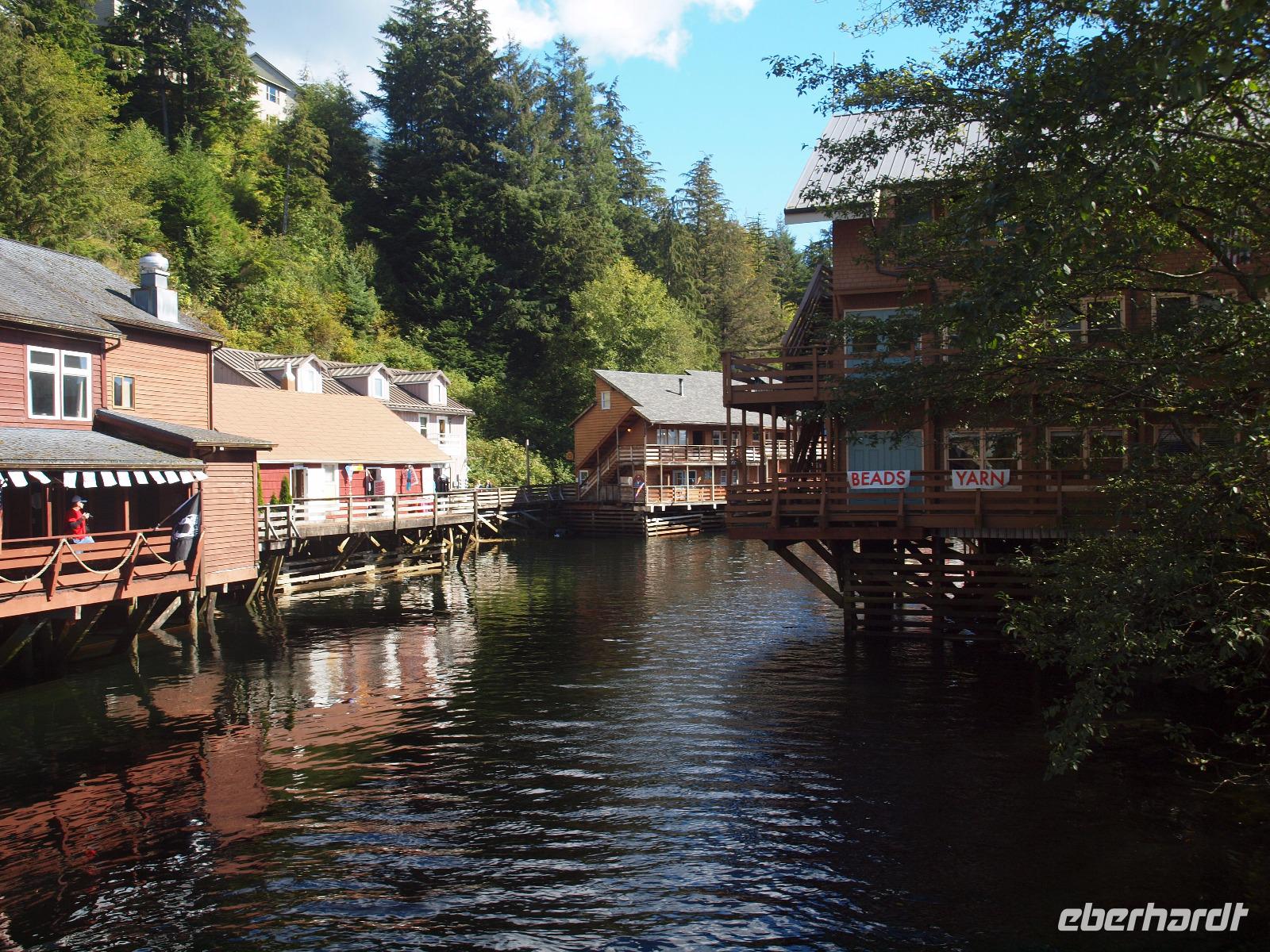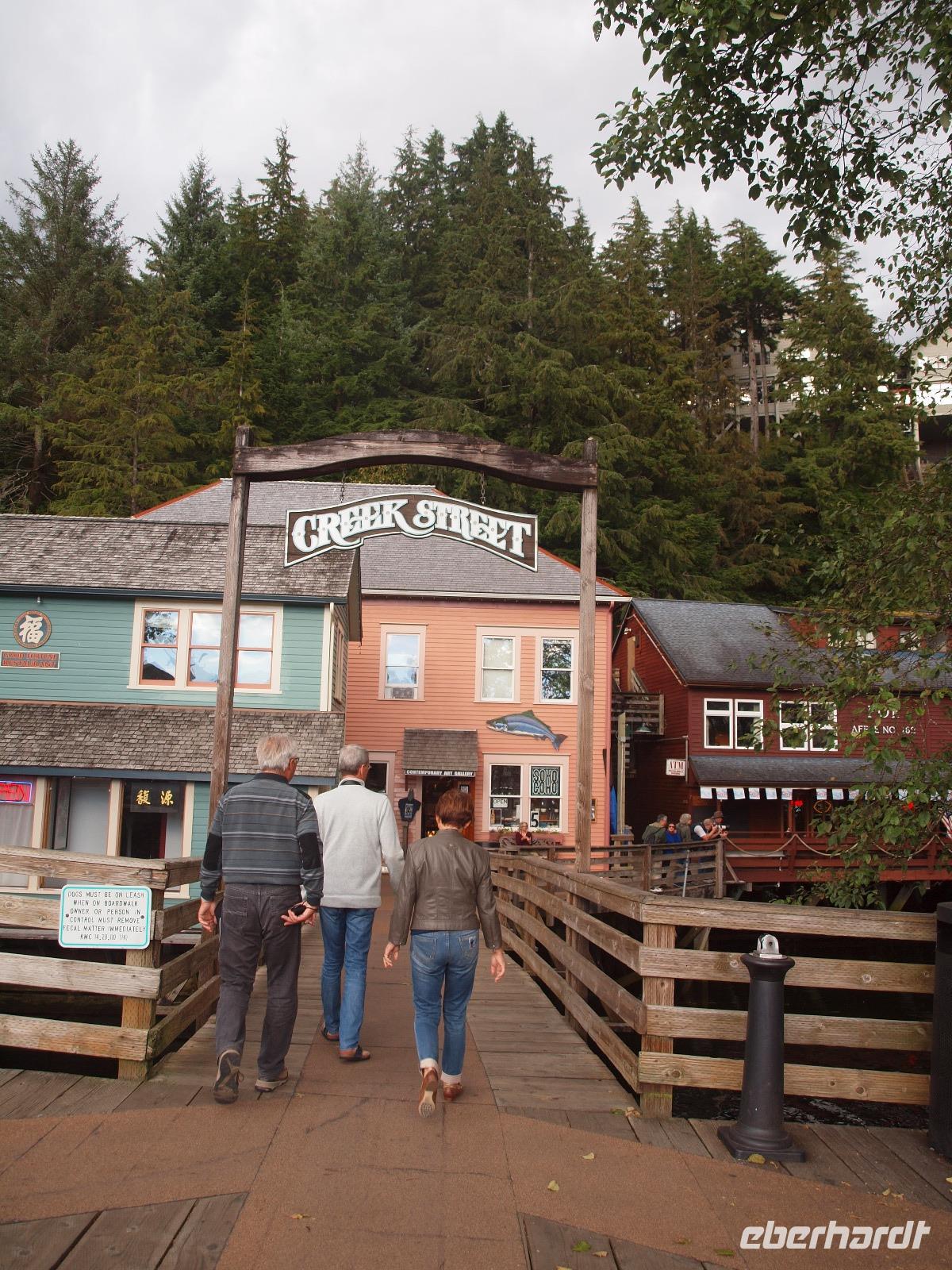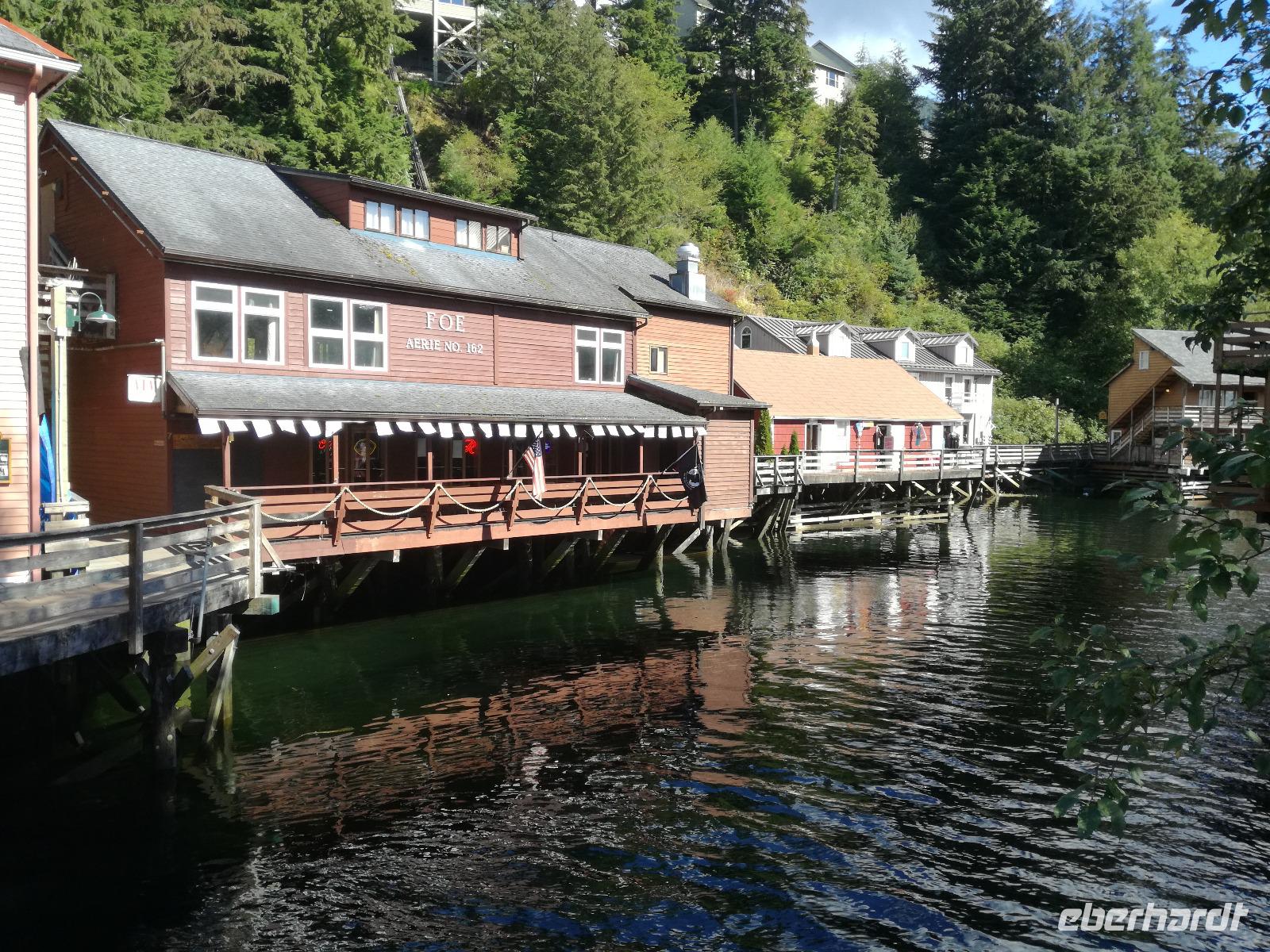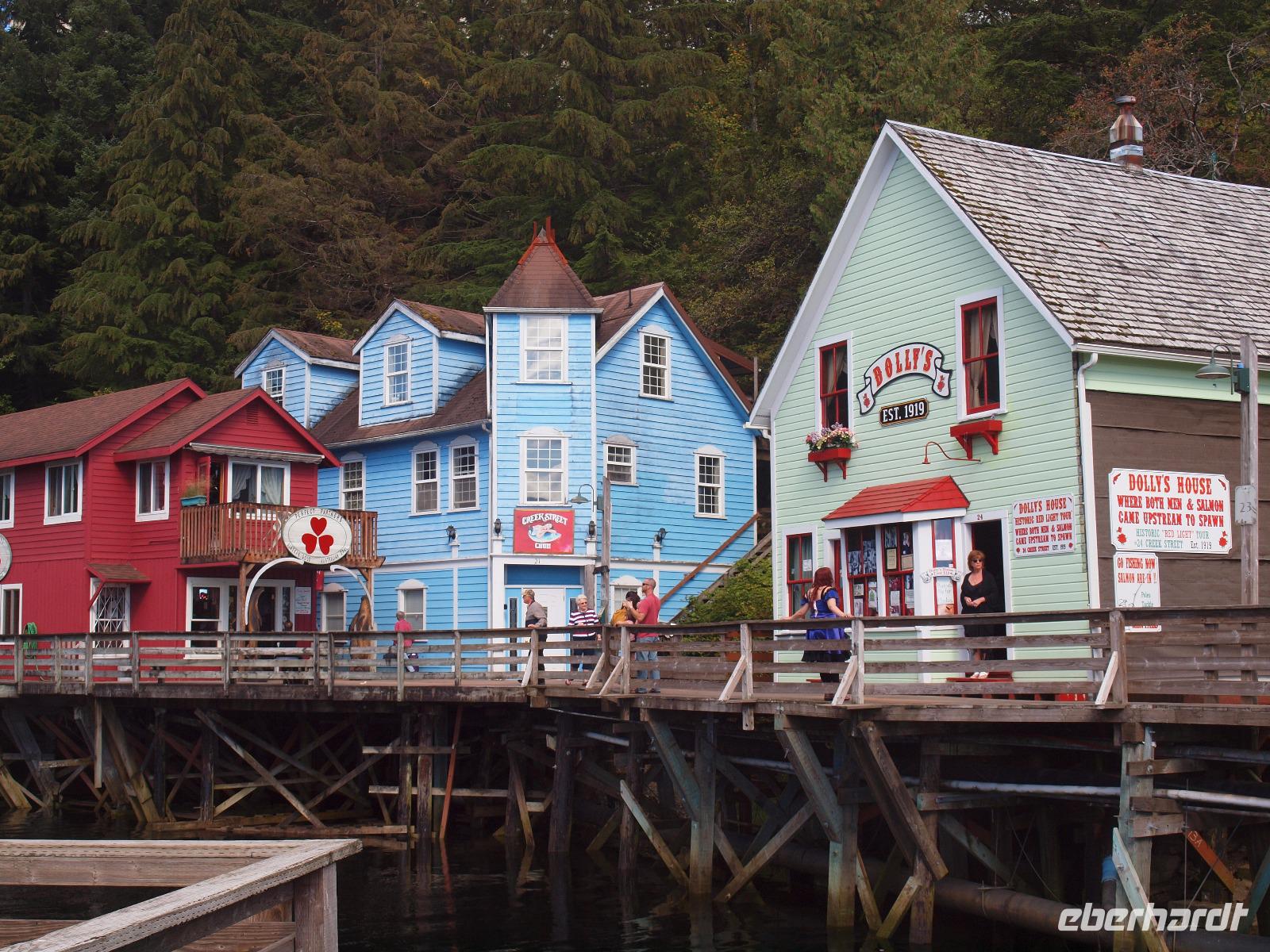 Wir erreichen Ketchikan erst gegen 13:00 Uhr, ein paar von uns werden den Tag hier zum Angeln nutzen, die anderen gehen mit mir zusammen von Bord um sich die Stadt etwas näher anzuschauen. Wir laufen zur Creek Street, die etwa 300m lange, auf Stelzen erbaute Straße schlängelt sich entlang des Flusses "Ketchikan Creek". Hier entstand mit Beginn des Bergbaus ein Rotlichtviertel und große Teile der Gehälter der Bergleute wurden wieder ausgegeben. Heute sind in den Stelzenhäusern vor allem kleine Museen, Souvenirgeschäfte und Kunstgalerien zu finden. Wir bummeln zwischen den Souvenirläden umher und machen auch einen kleinen Abstecher in Dollys House. Danach trennen wir uns auf um individuell weiter zu gehen. Ein paar Gäste begleite ich bis zum Totem Heritage Center. Hier gibt es eine Ausstellung zum Thema Totem, deren Bedeutung und Bau. Anschließend fahren wir mit dem öffentlichen Bus wieder zurück in die Stadt und nutzen die letzten Minuten bevor die Läden schließen für die Souvenirjagd.