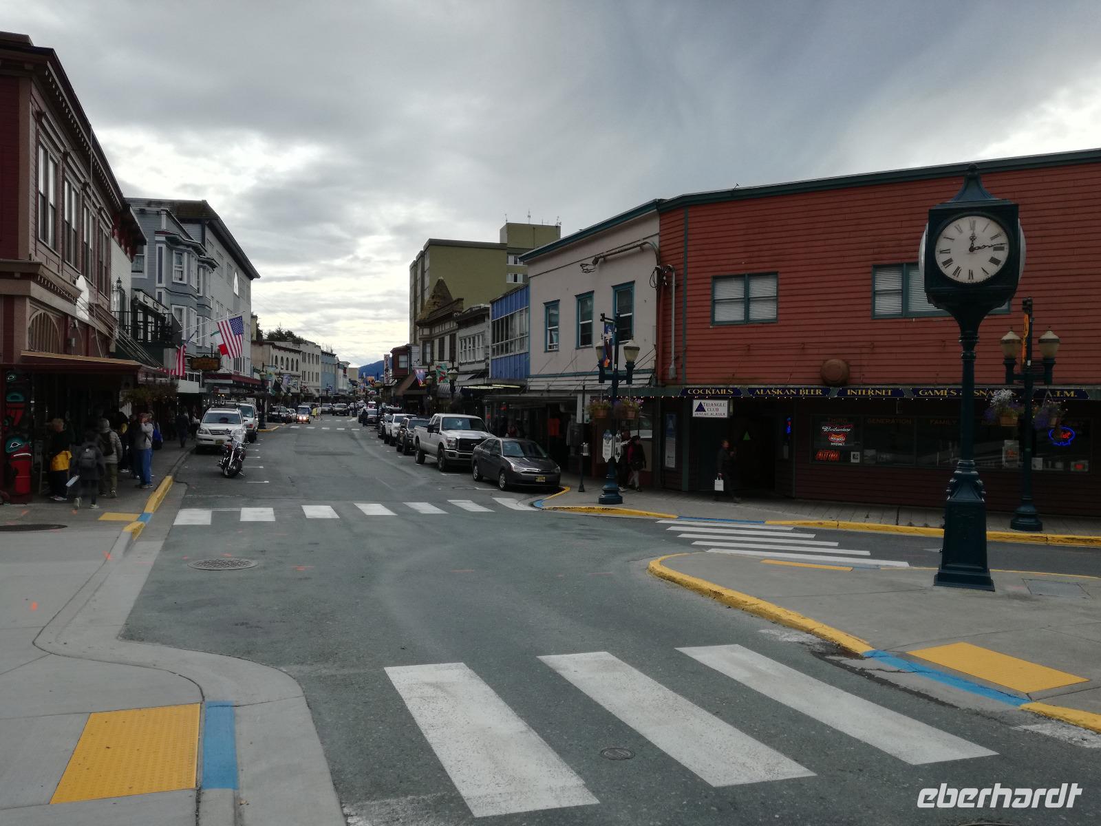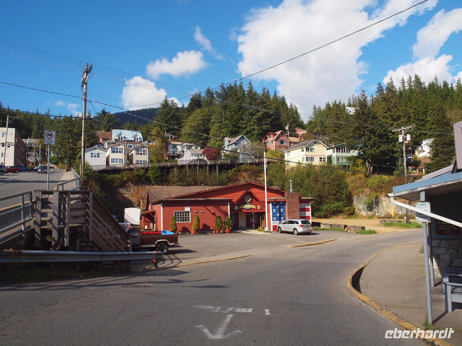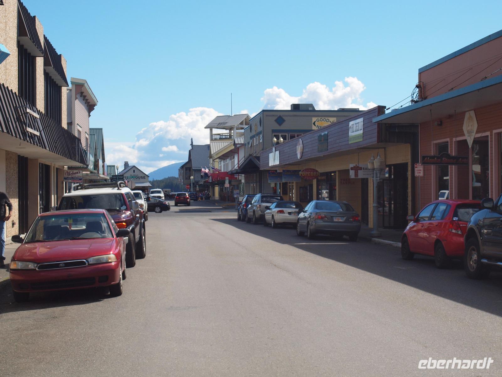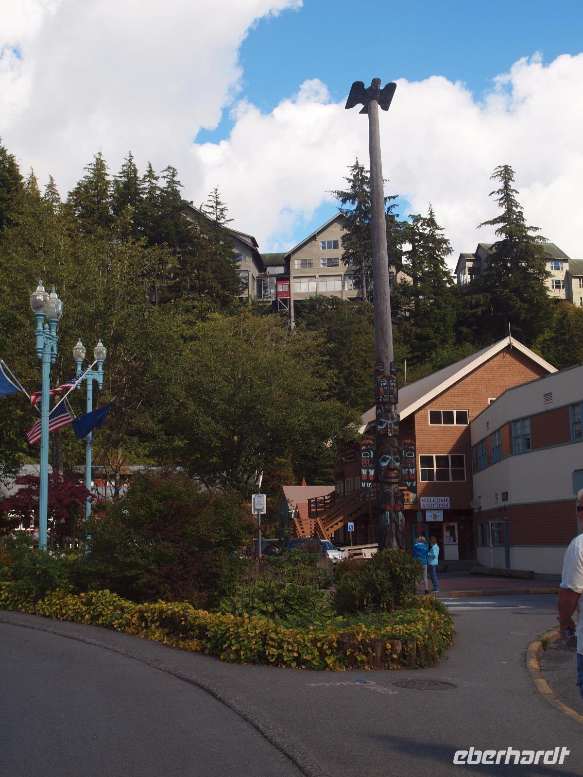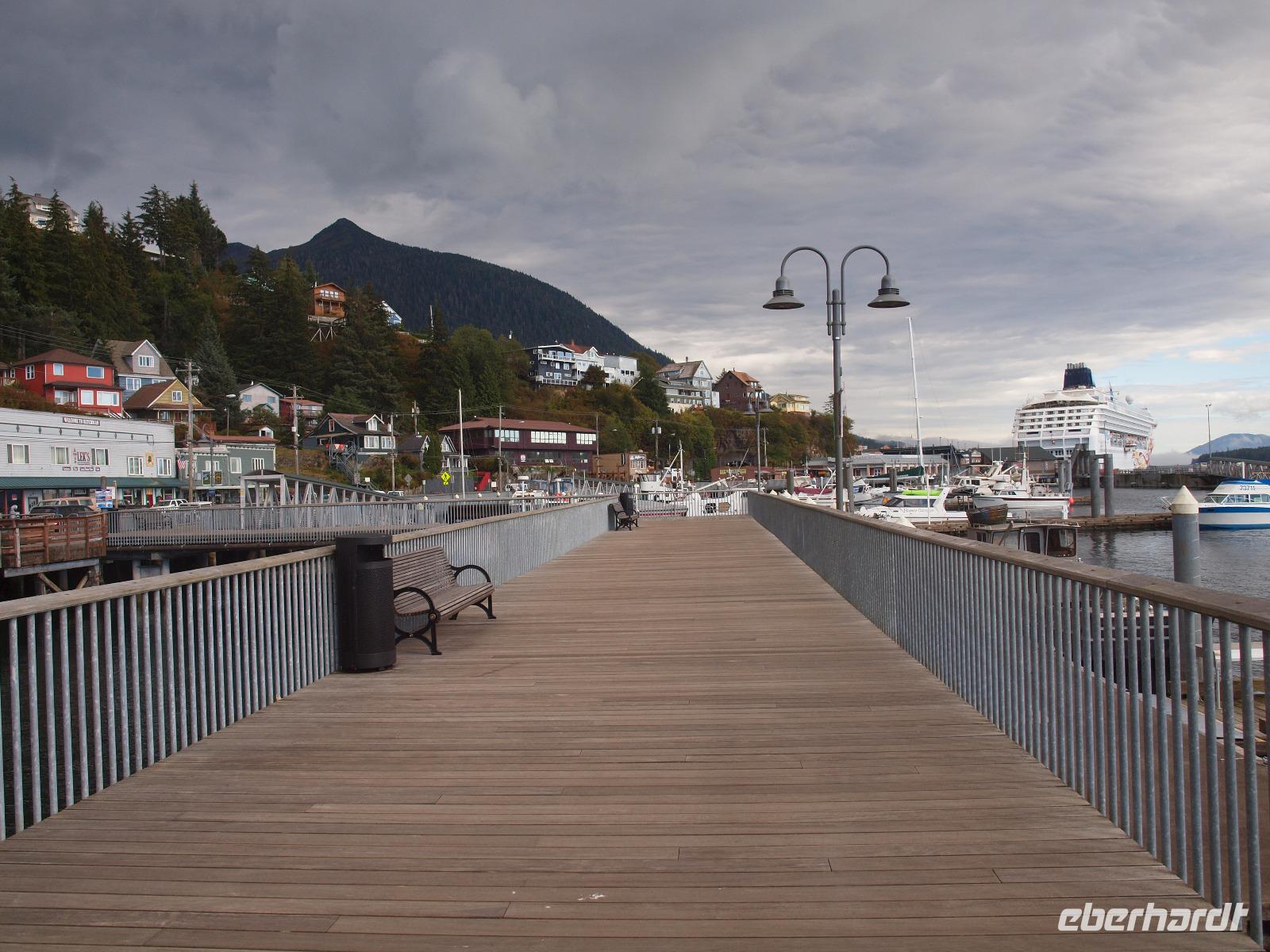 Wir erreichen Ketchikan erst gegen 13:00 Uhr, ein paar von uns werden den Tag hier zum Angeln nutzen, die anderen gehen mit mir zusammen von Bord um sich die Stadt etwas näher anzuschauen. Wir laufen zur Creek Street, die etwa 300m lange, auf Stelzen erbaute Straße schlängelt sich entlang des Flusses "Ketchikan Creek". Hier entstand mit Beginn des Bergbaus ein Rotlichtviertel und große Teile der Gehälter der Bergleute wurden wieder ausgegeben. Heute sind in den Stelzenhäusern vor allem kleine Museen, Souvenirgeschäfte und Kunstgalerien zu finden. Wir bummeln zwischen den Souvenirläden umher und machen auch einen kleinen Abstecher in Dollys House. Danach trennen wir uns auf um individuell weiter zu gehen. Ein paar Gäste begleite ich bis zum Totem Heritage Center. Hier gibt es eine Ausstellung zum Thema Totem, deren Bedeutung und Bau. Anschließend fahren wir mit dem öffentlichen Bus wieder zurück in die Stadt und nutzen die letzten Minuten bevor die Läden schließen für die Souvenirjagd.