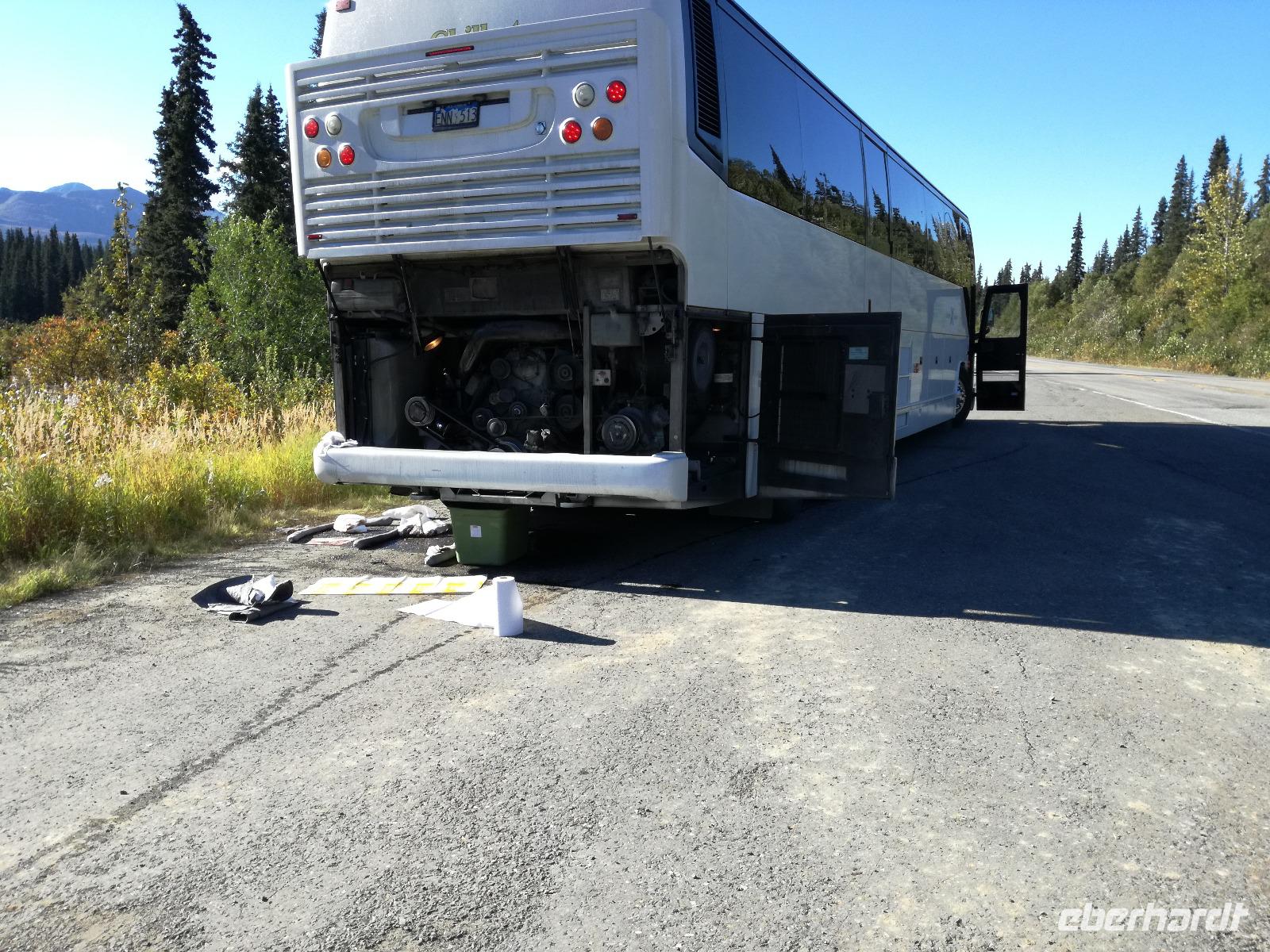 Mit freier Sicht zu unserer rechten Seite auf den Denali fahren wir den Highway weiter entlang. Plötzlich halten wir wieder, irgendetwas scheint nicht zu stimmen... Und ja, wir haben mitten in der Pampa von Alaska eine Panne. Henry schafft es, den Bus in eine Wendeschleife zu rollen und kümmert sich gleich mit Anna zusammen um den Schaden. Wir schätzen, dass wir hier für etwa eineinhalb Stunden fest sitzen, bevor uns jemand abholen kann. Wir sind alle trotzdem positiv gestimmt und versuchen die Situation mit Humor zu nehmen. In der Zwischenzeit halten ein paar Busse mit an um nachzusehen ob sie nicht helfen können, leider ohne viel Erfolg. Doch irgendwann kommt Lindy mit seinem Bus und hält an. Sein Bus ist leer. Er muss, wie wir, nach Talkeetna, dort holt er seine Gäste vom Zug ab. Welch ein Glück, er nimmt uns mit! Im Handumdrehen sind die Koffer umgeladen. Ein kleines mulmiges Gefühl bleibt dennoch, jetzt muss Henry allein zurück bleiben...