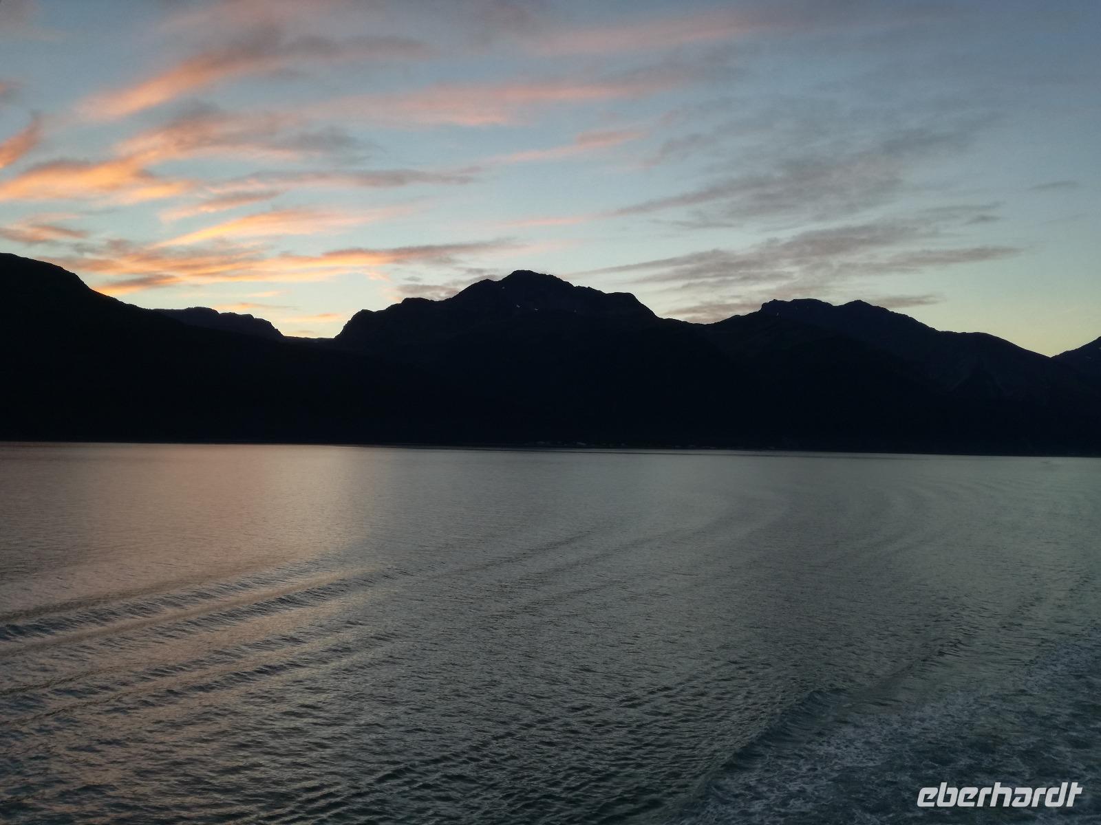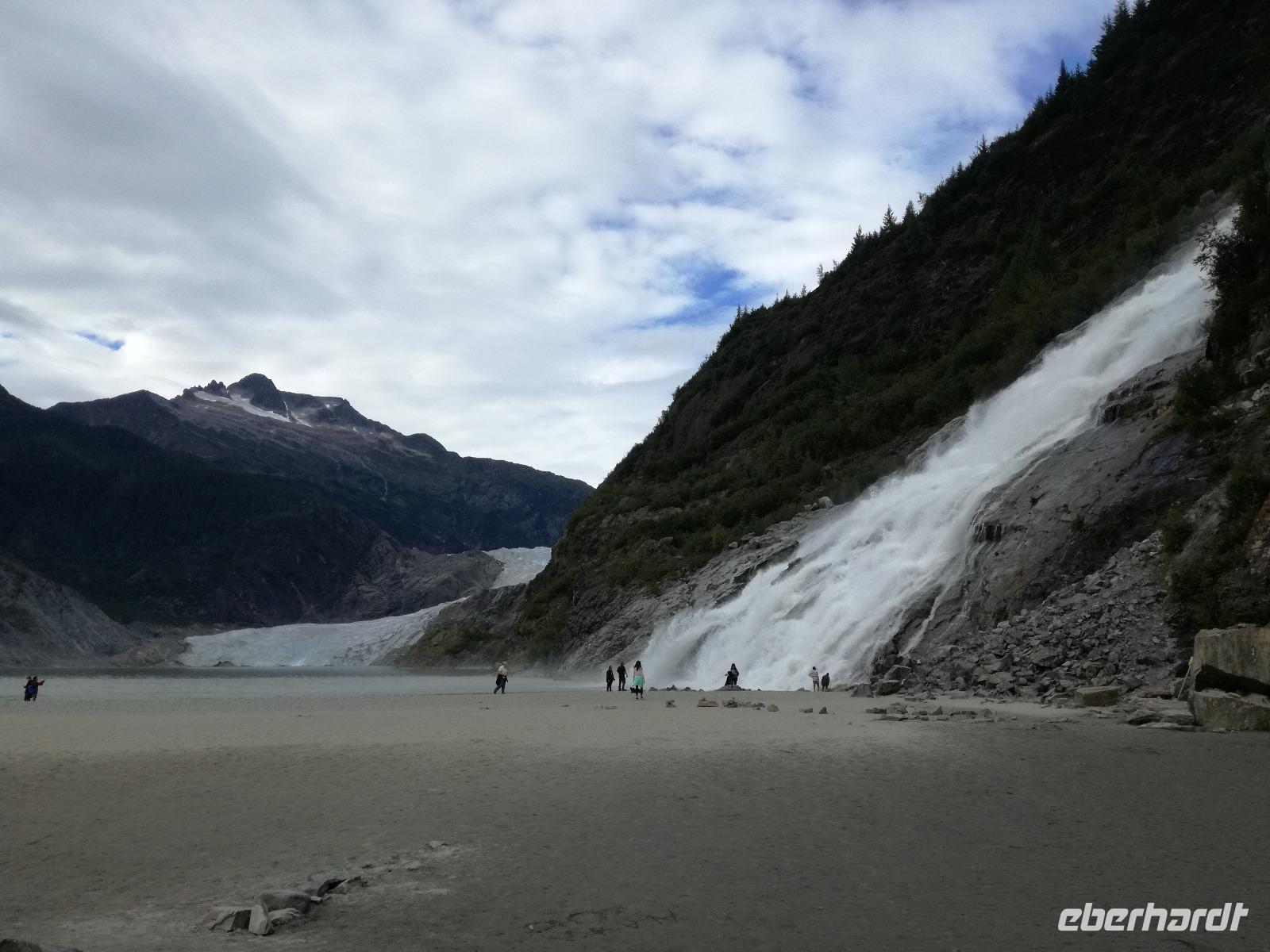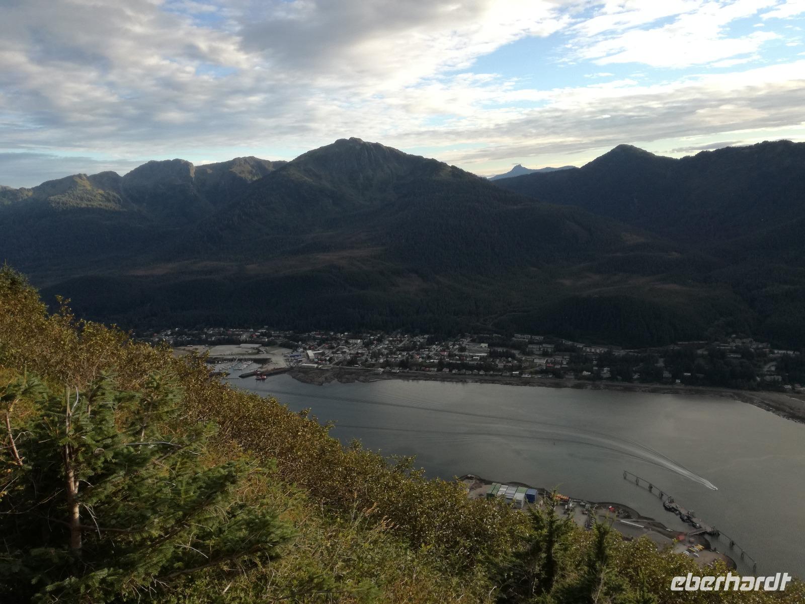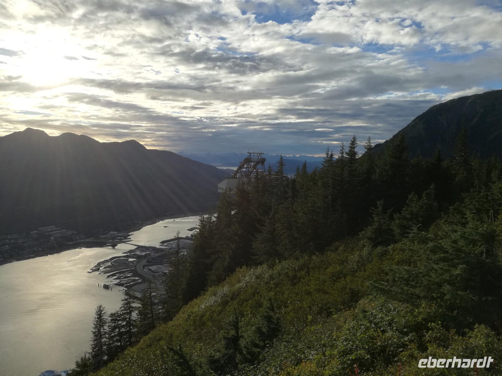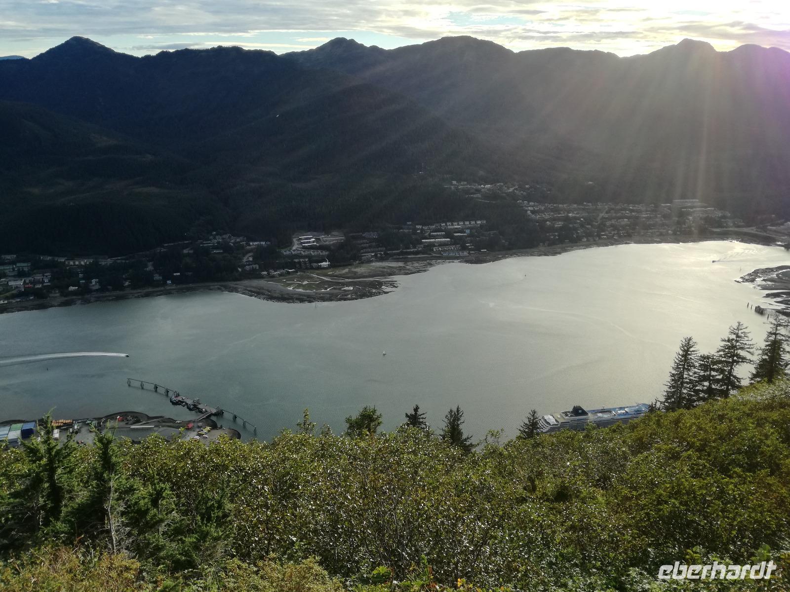 Wir fahren weiter zum Mendenhall Gletscher, unterwegs legen wir noch eine kurze Pause am Supermarkt ein, Regel Nummer 1 auch hier wieder: es wird nur um Bus gegessen!Am Gletscher angekommen haben wir gute 1,5 Stunden Zeit die Umgebung zu erkunden. Auch hier gibt es wieder ein Besucherzentrum, aber die Meisten von uns treibt es zum Wasserfall, den Nugget Falls. Die Mutigen unter uns bahnen sich ihren eigenen Weg am Fluss entlang und finden dort auch Bärenspuren... Zurück im Bus müssen wir dann auch schon wieder zum Schiff zurück. Wir bedanken und verabschieden uns von Peggy und nutzen die abendliche Dämmerung für eine Auffahrt zum Mount Robert. Von hier hat man eine tolle Sicht über den Kanal und die im Hafen liegende Schiffe, auch Lady Baltimore, ein Weißkopfseeadler ist das ein oder andere Foto wert.