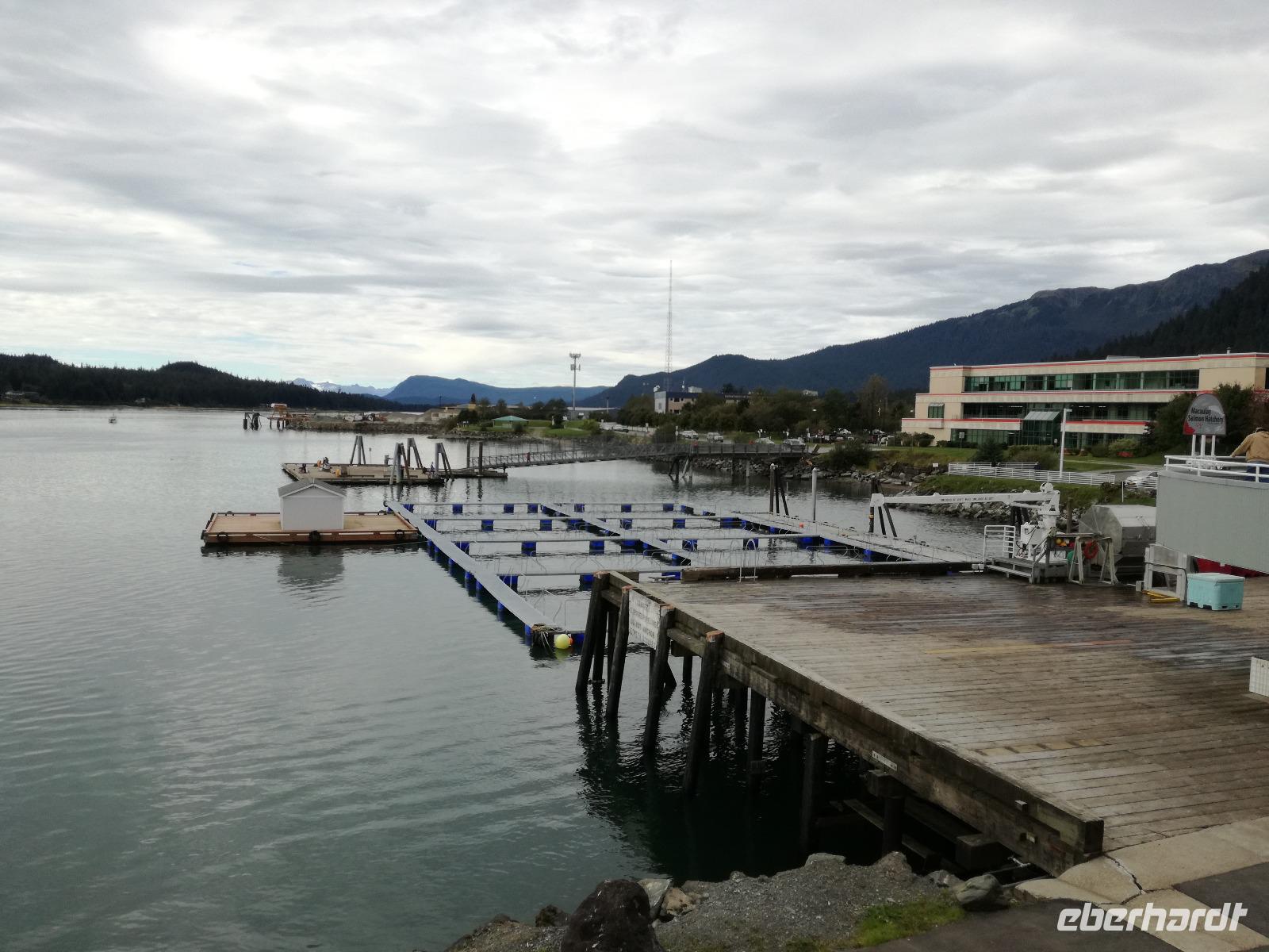 Gegen 10:00 Uhr erreichen wir den Hafen von Juneau, die Hauptstadt Alaskas. Die meisten von uns gehen schon jetzt von Bord um endlich wieder festen Boden unter den Füßen zu spüren. Ich begleite ein paar Gäste in die Stadt und treffe mich später zum vereinbarten Treffpunkt an Bord mit denen, die noch nicht am Pier sind. Punkt 14:00 Uhr steht unser Bus am Pier für unseren ersten Ausflug. Peggy, unser Driverguide, fährt uns zuerst zur Lachsstation. Nach etwa 20min. erreichen wir Aufzuchtstation "Macaulay Salmon Hatchery". Es gibt hier fünf verschiedene Arten des Pazifischen Lachses: Ketalachs, auch "Chum" genannt, Rotlachs "Sockeye", Königslachs "King", Silberlachs "Silver" und Buckellachs "Pink". Deren unterschiedlichen Größen kann man sich mit Hilfe der fünf Finger darstellen. Hier entspricht der Mittelfinger zum Beispiel dem "King Salmon", da er der größte und bedeutendste Lachs ist. Die Wichtigkeit der Zuchtstationen besteht darin, dafür zu sorgen, dass der Bestand der Lachse in Alaska steigt. Ein Mitarbeiter der Station zeigt und erläutert uns die wichtigsten Etappen der Lachsaufzuchtstation. Über die Fischtreppe bis hin zu den Babylachsen. In einem zusammenfassenden Video am Ende der Tour wird nochmal gezeigt, wie die ausgewachsenen Lachse in der Station ankommen, gefangen und ausgenommen werden und die Babies "erzeugt" werden. Das ganze dient am Ende der Fischerei, dem Hobbyangler und der Tierwelt.