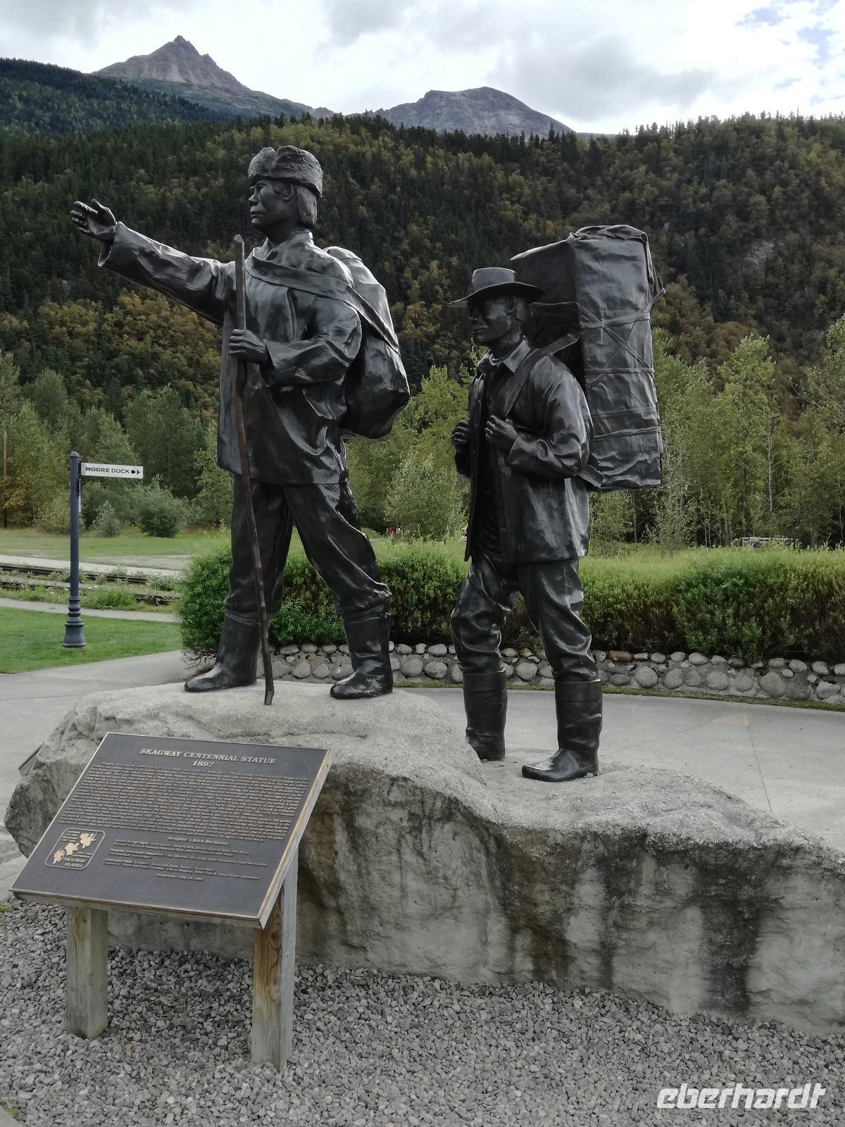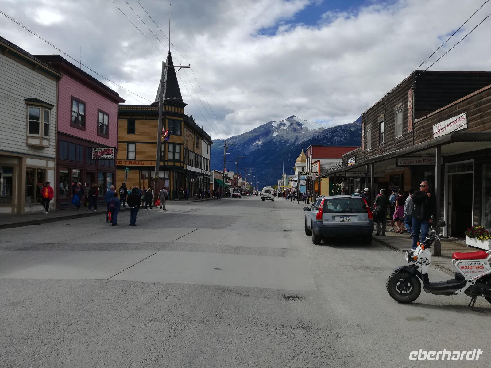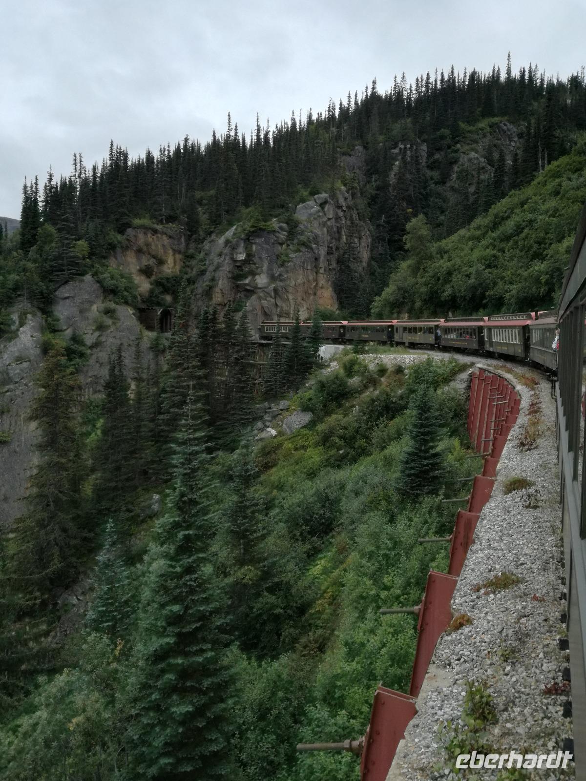 Schon sehr früh legt unser Schiff heute in Skagway an. Unsere Gruppe wird heute an verschiedenen Ausflügen teilnehmen, ich begleite die Meisten während des Vormittags und wir gehen bereits 07:30 Uhr von Bord und laufen nur wenige Meter bis zur Bahnstation. Um 08:00 Uhr startet unser Zug in Richtung Kanada. Die White Pass und Yukon Route startet in Skagway bei null Höhenmetern und ist etwa 178 km lang, sie endet in Whitehorse, Yukon. Wir werden heute allerdings nur bis zur kanadischen Grenze, bis zum White Pass, auf ca. 873 Höhenmeter fahren. Unterwegs kommen wir an verschiedenen Stationen vorbei. Unser Guide erklärt uns übers Mikrofon die verschiedenen Stationen und erzählt uns vom Bau der Eisenbahn. Der Bau der Eisenbahn wurde im Mai 1898 begonnen und bereits am 21. Juli des Jahres konnten, nach einigen Problemen mit Soapy Smith, einem lokalen Bandenchef, die ersten 6,4 Kilometer Strecke bis Boulder eröffnet werden. Bereits im Februar 1899 erreichte der erste Personenzug den White Pass. Wir genießen die Fahrt und schießen ab und zu tolle Fotos von der Landschaft. Ein sehr beliebtes Motiv stellten die Bridal Veil Falls und die Stahlbrücke kurz vor unserer Endstation dar. Auf dem Rückweg bekamen wir die Lok vor die Nase und klappen die Rückenlehnen zur anderen Seite, Seitenwechsel! Und dann sehen wir sogar noch einen Schwarzbären auf einem Stein sitzen... Ja, wirklich!Zurück in Skagway bummeln wir noch ein bisschen durch die Straße(n) der kleinen Stadt und versuchen das ein oder andere Souvenir zu ergattern. Um 17:00 Uhr legt unser Schiff wieder ab und wir steuern den nächsten und letzten Hafen in Alaska an. Am Abend versammelt sich alles noch einmal an Deck um die ersehnten Polarlichten zu bestaunen. Einfach faszinierend!