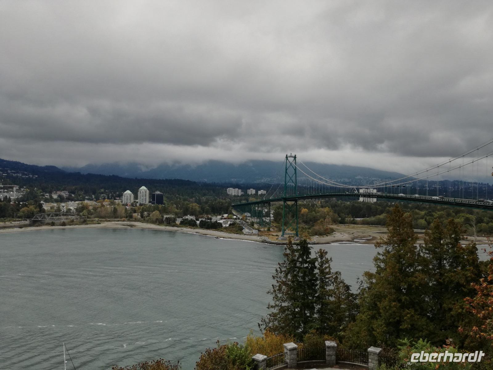 Die Fahrt geht weiter nach Gastown, in das älteste Stadtviertel von Vancouver, wir steigen in der Nähe des Denkmals von Gassy Jack aus, welchem das Stadtviertel seinen Namen verdankt. Von hier gehen wir zu Fuß weiter die Water Street entlang. Bei der Dampfuhr warten wir so lange, bis um 11:45 Uhr diese ihr Bestes zur Show gibt. Am Canada Place, dem Hotel über dem Kreuzfahrtterminal, steigen wir wieder in den Bus ein. Wir fahren nun in den Stanley Park, eine grüne Oase unweit des Zentrums. Hier trifft man sich zum Radfahren oder Joggen, zum Picknicken mit der ganzen Familie und zum ausspannen. Wir steigen am sogenannten "Hallelujah Point" für einen Fotostopp aus. Von hier haben wir einen tollen Blick auf die Skyline von Vancouver. In der Nähe steht auch eine Sammlung von Totempfählen, geschnitzt im 19. oder 20. Jahrhundert von Angehörigen verschiedener Nordwestküsten-Indianerstämme. Von unserem nächsten Aussichtspunkt können wir direkt auf die Lions Gate Brücke, die nach Norden und zu den Stadtteilen Norgate und West Vancouver führt. Nach diesem Stopp fahren wir nun zu unserem Hotel, das Empire Landmark Hotel. Um die Zeit bis zum Abendessen auszuschöpfen treffen wir uns wenig später wieder in der Lobby und laufen zusammen Richtung Canada Place. Hier hat uns Gini empfohlen den 4D-Film "Fly over Canada" anzuschauen. Der Schlange nach zu urteilen muss es dieser Film ja wirklich in sich haben... Und ja, das hat er auch. Obwohl wir zu Beginn sehr skeptisch sind, gehen wir begeistert, etwas nass, aber strahlend aus dem Kino wieder raus. Ein tolles Erlebnis! Gemeinsam laufen wir zurück zum Hotel und am Abend treffen wir uns dann in er obersten Etage im Restaurant "Claud 9" zum Abendessen, von hier haben wir eine 360°-Aussicht über ganz Vancouver.
