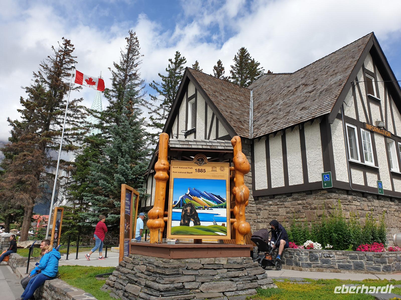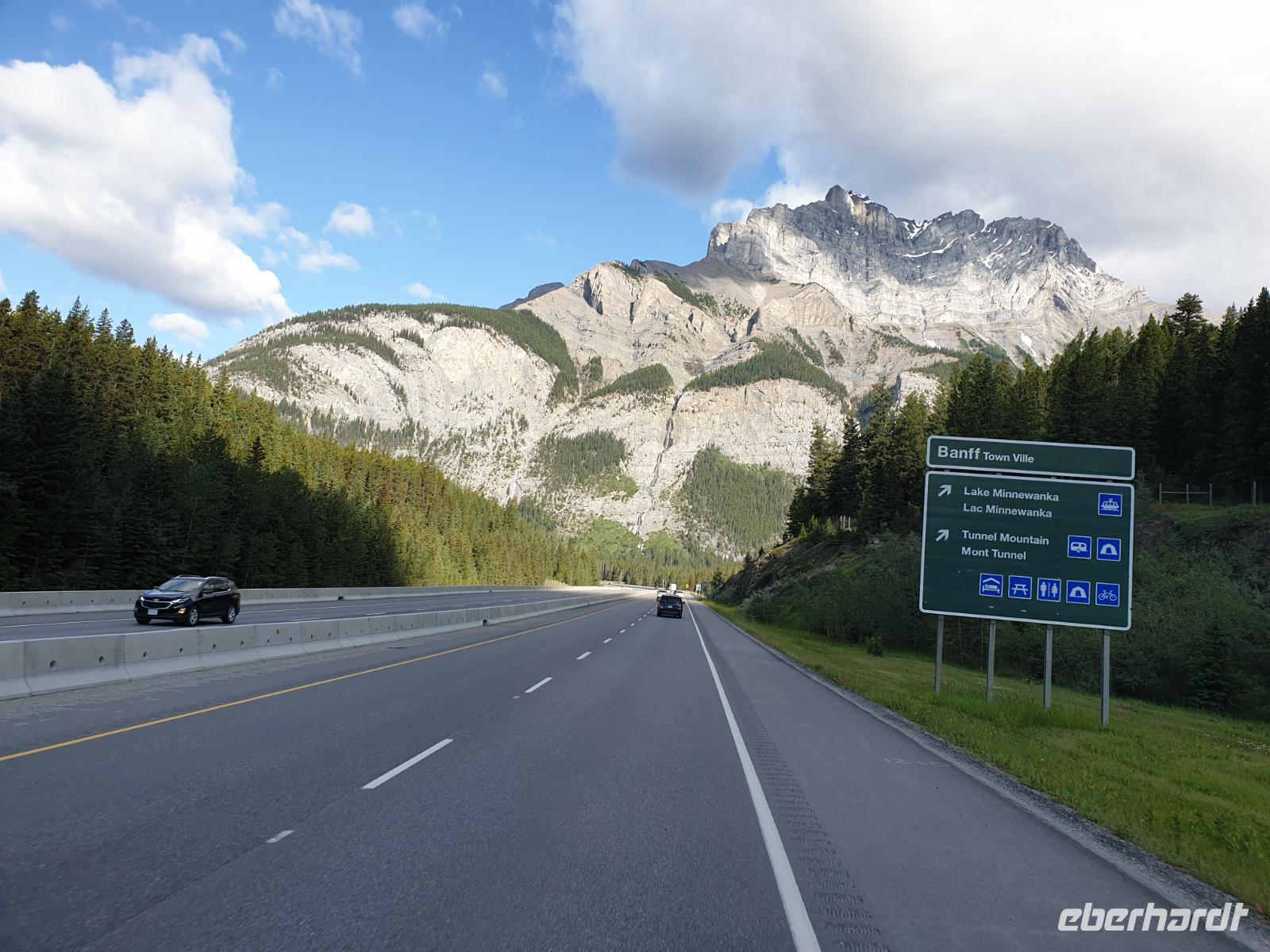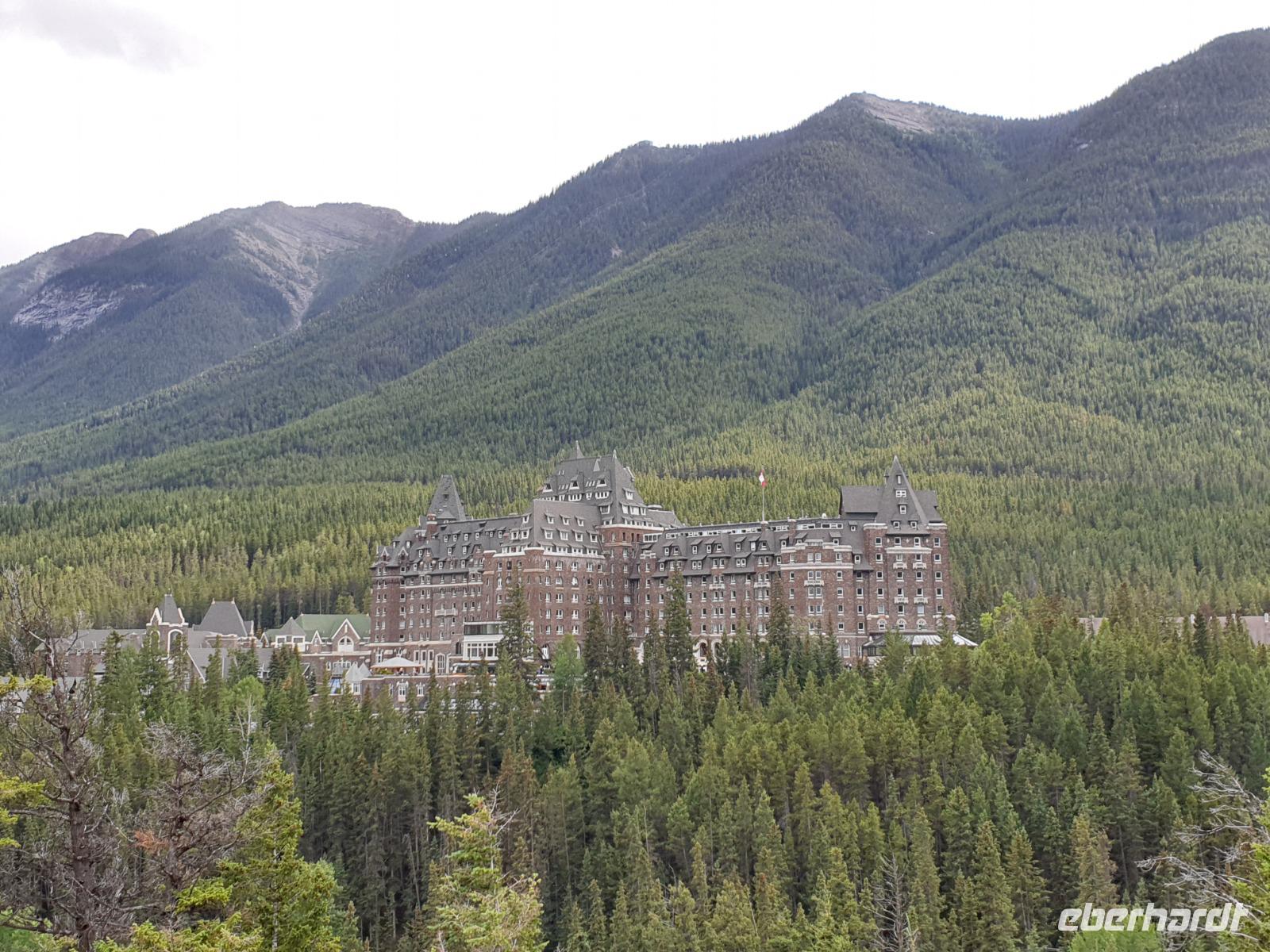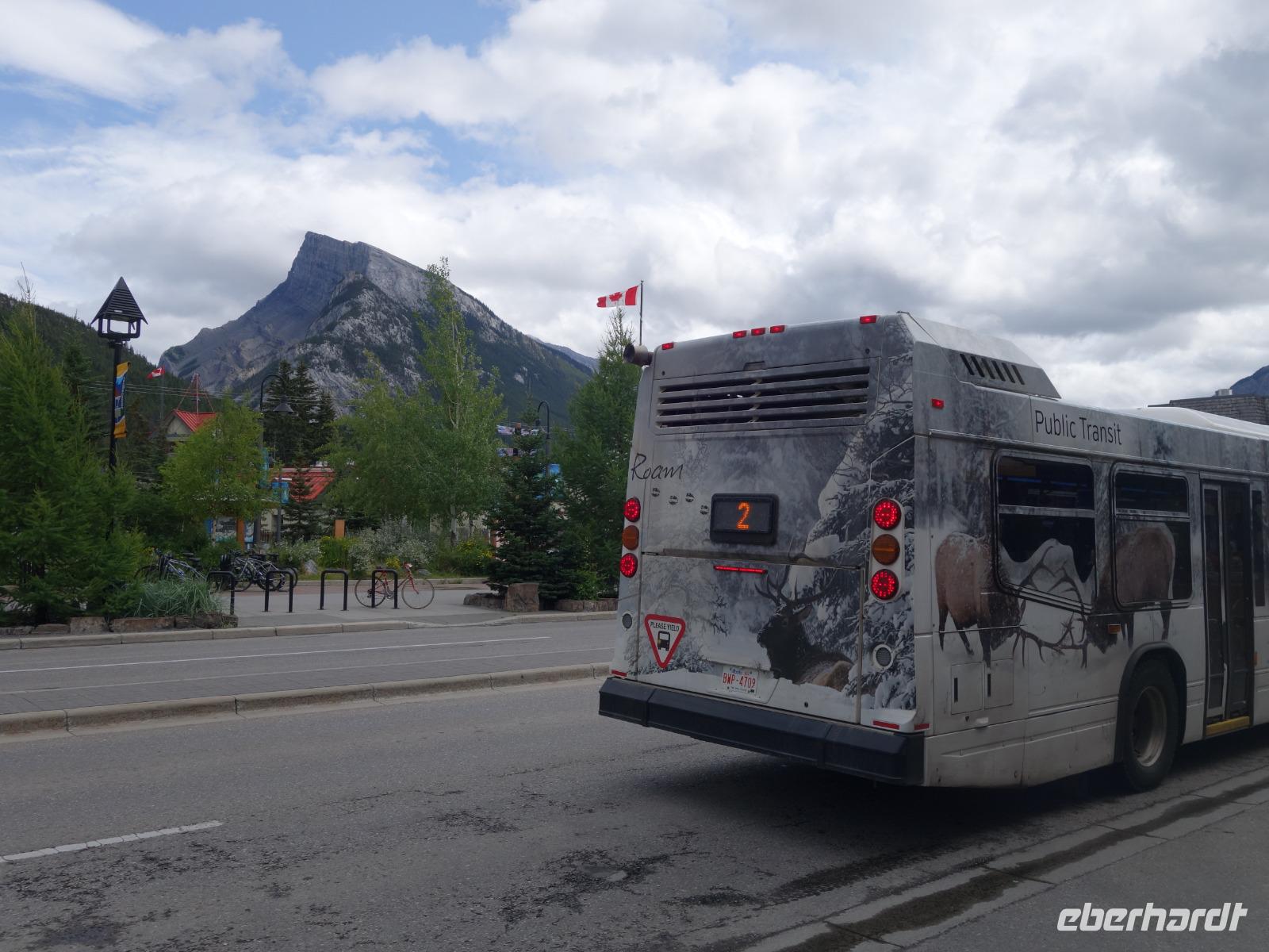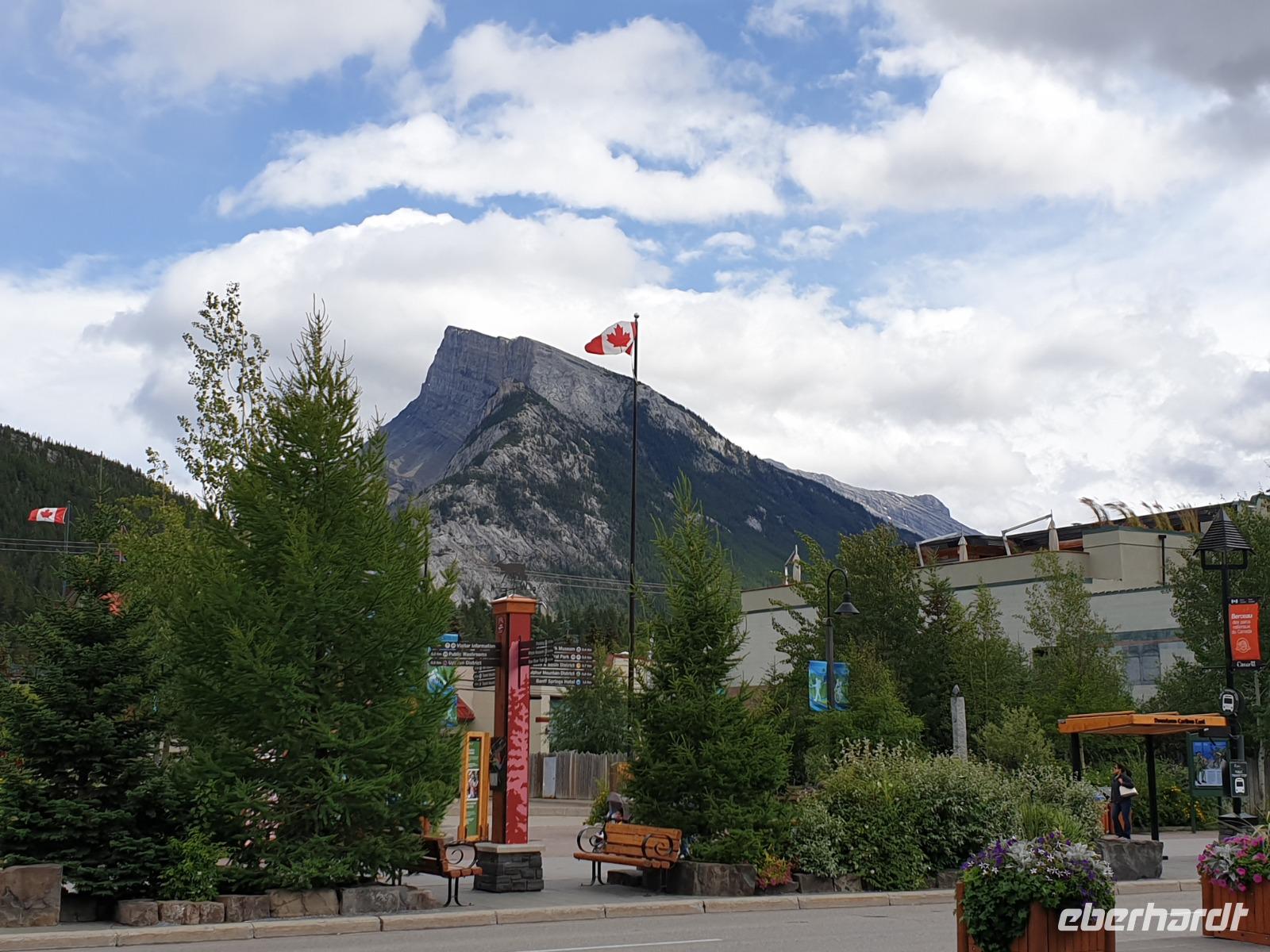 Weiter geht es für uns in die Stad nach Banff selbst. Der kleine Ort mit ca. 7.500 Einwohnern liegt malerisch eingebettet in einem Tal umgeben von den vier Gipfeln des Mount Norquay (2.523m) und Mount Rundle (2.948m) sowie den Sulphur (2.451m) und Cascade Mountain (2.998m). Das kleine Städtchen lädt zum schlendern und Kaffee trinken ein. Im Winter zieht es vor allem Skifahrer hierher. Insbesondere das Luxus Schloss Hotel „Banff Springs Hotel" zieht immer wieder Leute in seinen Bann.