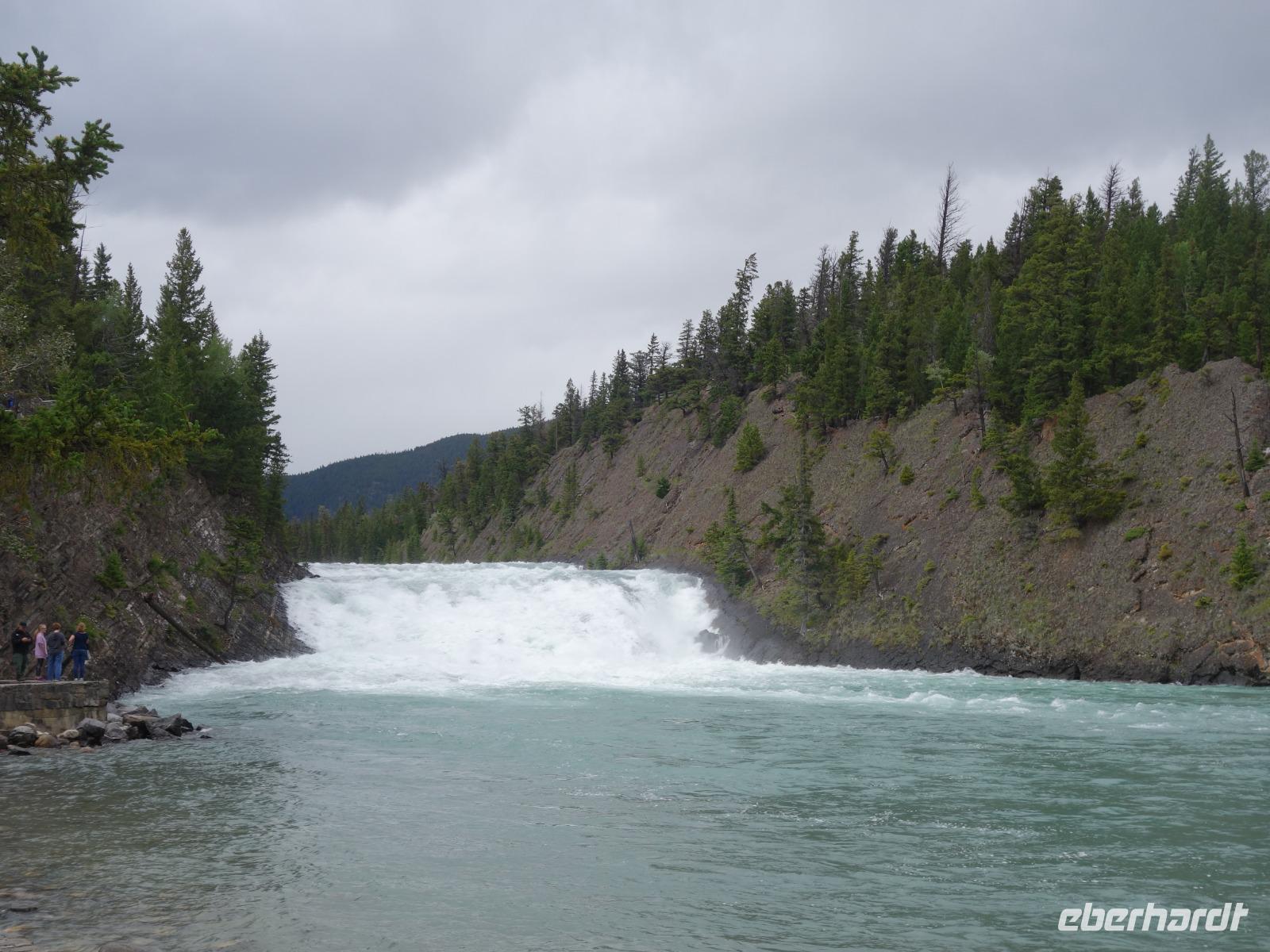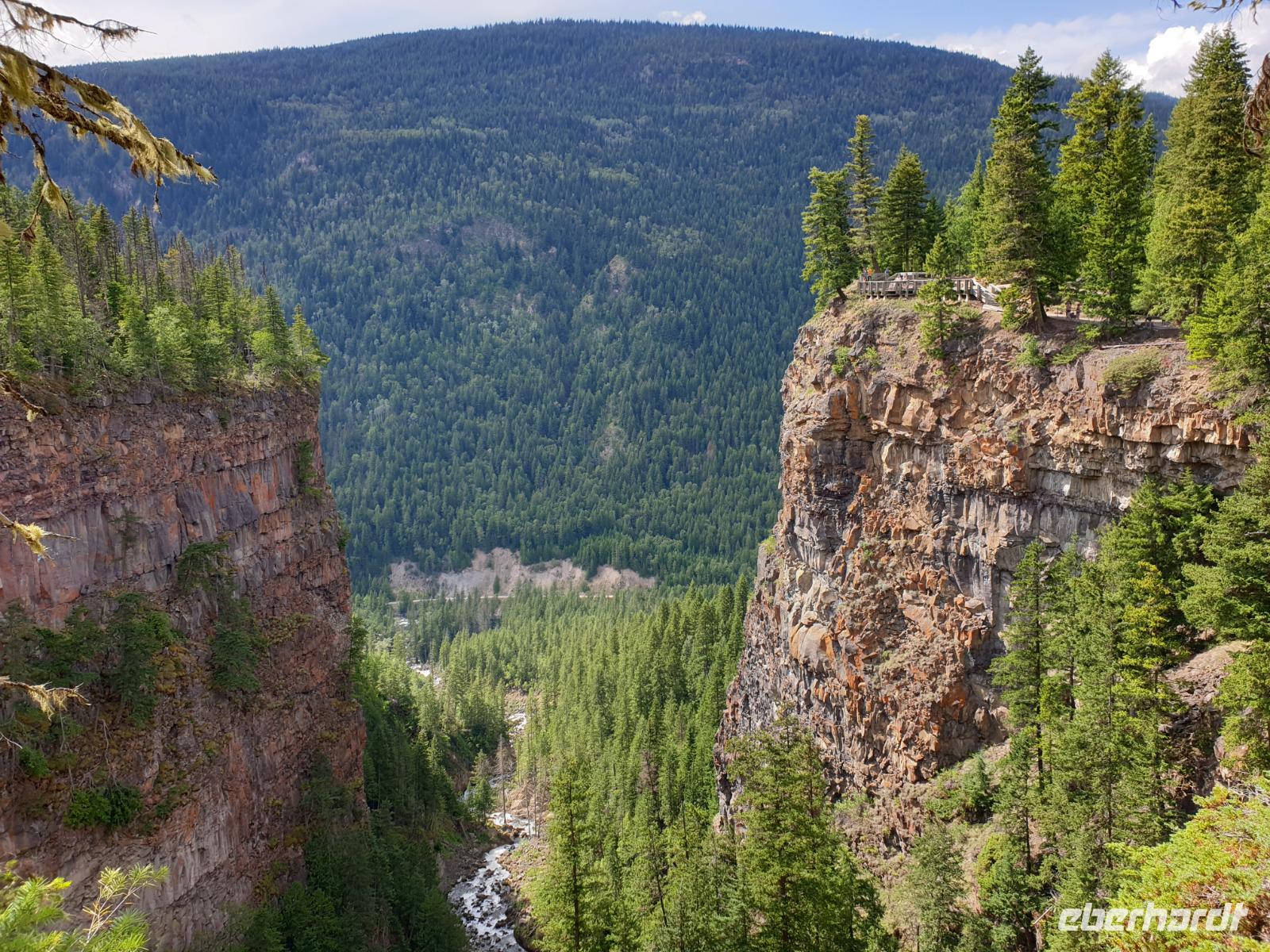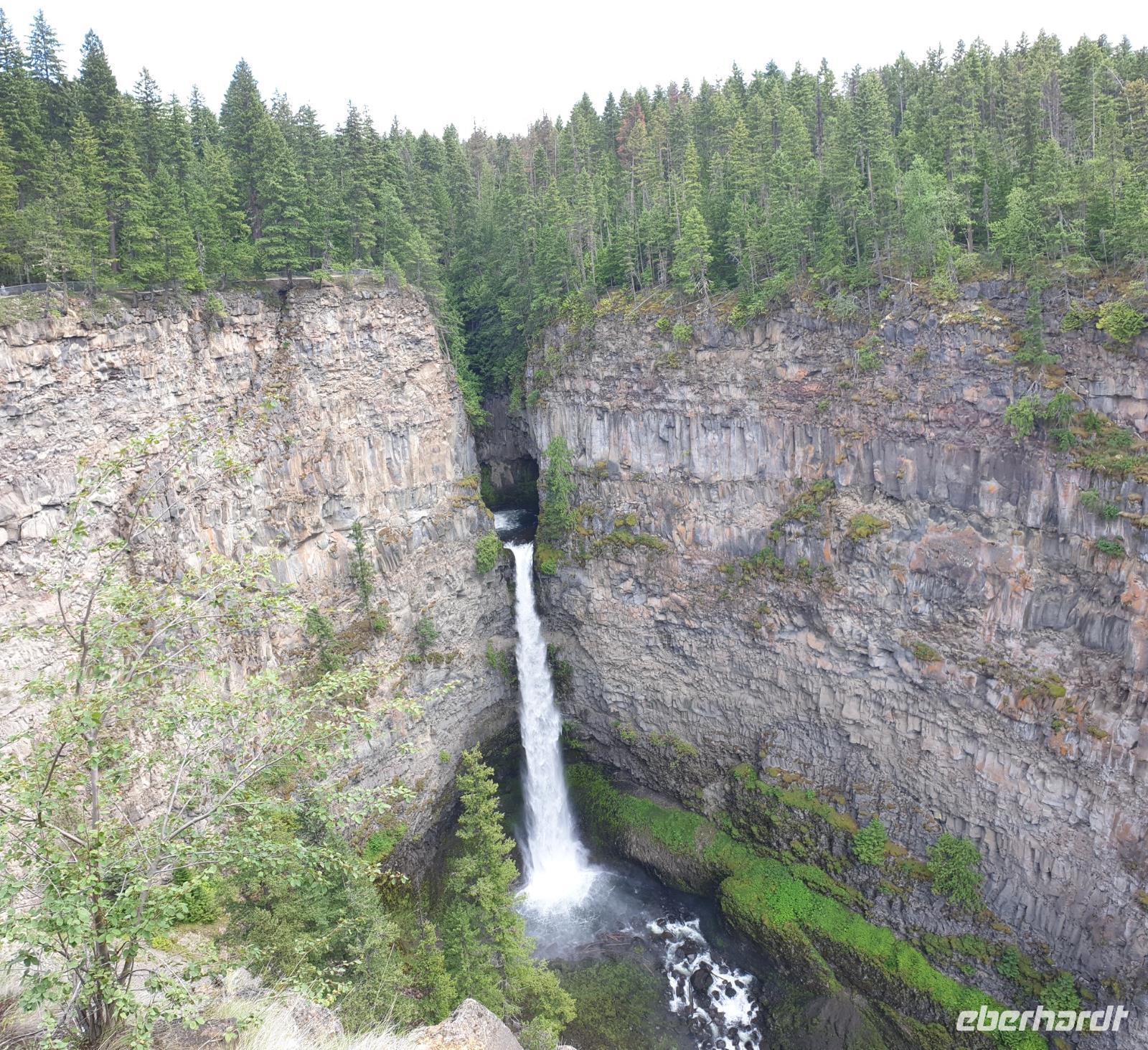 Unseren letzten Stopp und Spaziergang legen wir an den Helmcken Wasserfällen ein. Einer der schönsten Attraktionen des Wells Gray Provincial Park sind eben diese Helmcken Wasserfälle, deren Wassermassen 137m über senkrecht abfallende Klippen hinunter in einen Kessel donnern. Ein 2km lange Weg führt uns nordseitig am Wasserfall vorbei und an den Rand der steilen Schlucht bis wir von unserem Bus wieder eingesammelt werden und unsere Fahrt fortsetzen können.