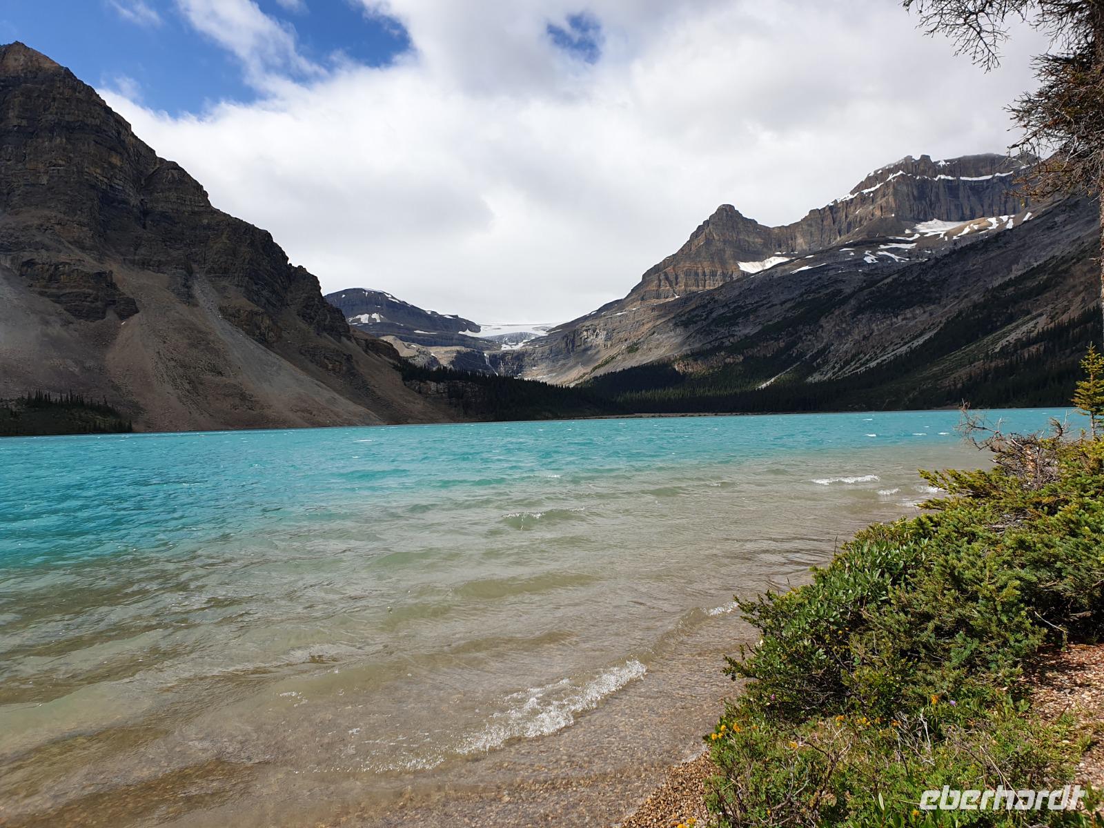 Wir starten den Tag und durchqueren erstmal den Banff National Park Richtung Lake Louise, um dann weiter in den Jasper National Park zu kommen. Unser erster Stopp auf dem Icefield Parkway ist der Bow Summit auf 2.135m am Fuße des Peyto Gletscher. Der Peyto Gletscher füllte einst das gesamte Tal aus, aber heute ist nur noch die Gletscher Zunge samt Peyto Lake zu sehen. Kürzlich hat man en 3.000 Jahre altes Holz unter dem Eis gefunden, was darauf schließen lässt, dass hier früher alles einmal bewaldet gewesen sein muss. Der Lake Peyto fasziniert mit seinem blauen Wasser. Warum der See so blau ist? Das Gletscher Wasser ist für sich genommen ziemlich matschig und voll mit kleinen Steinen und Sedimenten. Wenn der Strom langsamer wird setzen sich aber die Sedimente mehr und mehr im Delta ab und das Gletschermehl (ein feiner Staub) bleibt zurück im Wasser und absorbiert die blauen und grünen Lichtstrahlen der Sonne - des führt zu der speziellen blauen Farbe des Wassers in vielen Gletscherseen.
