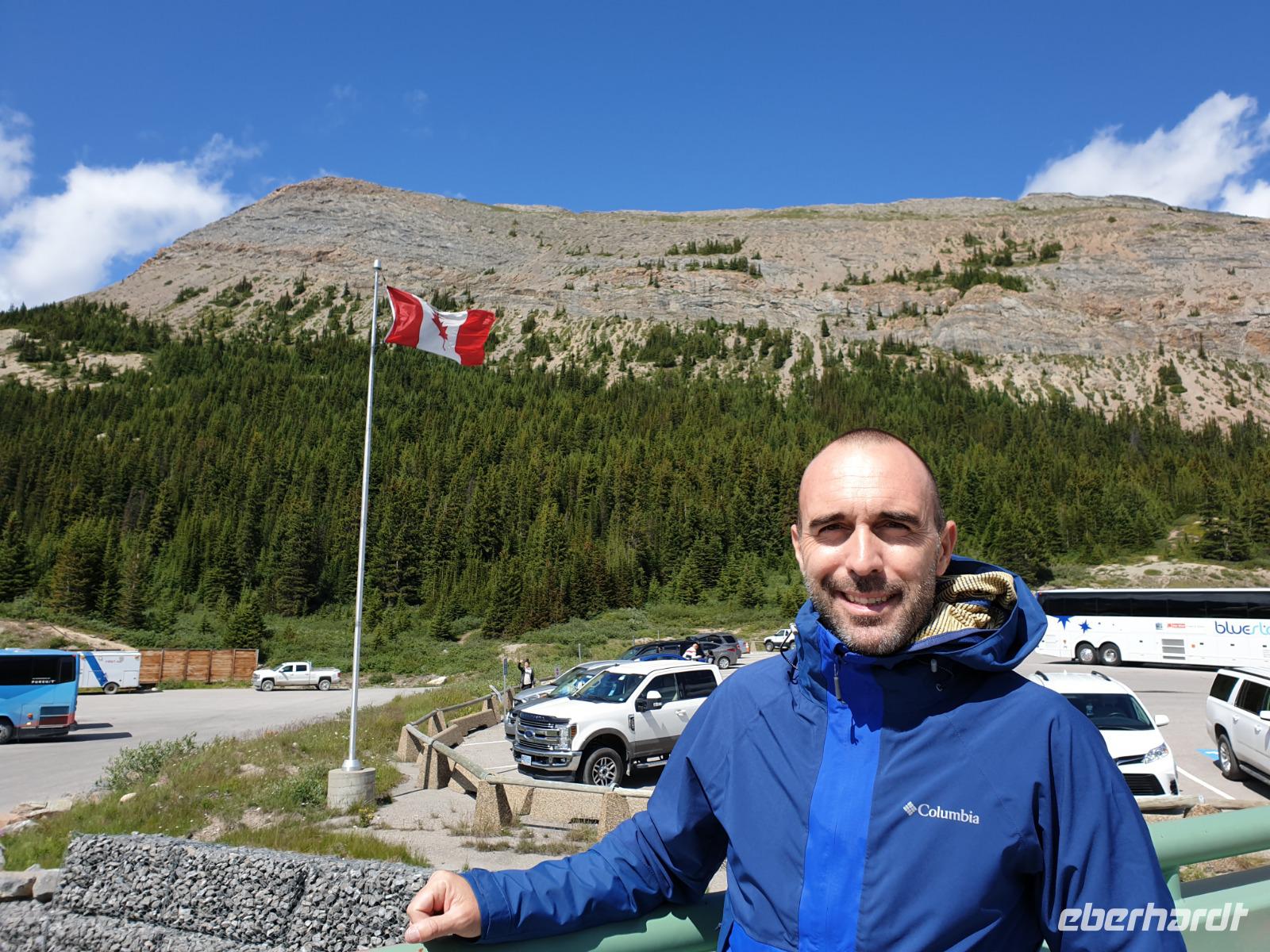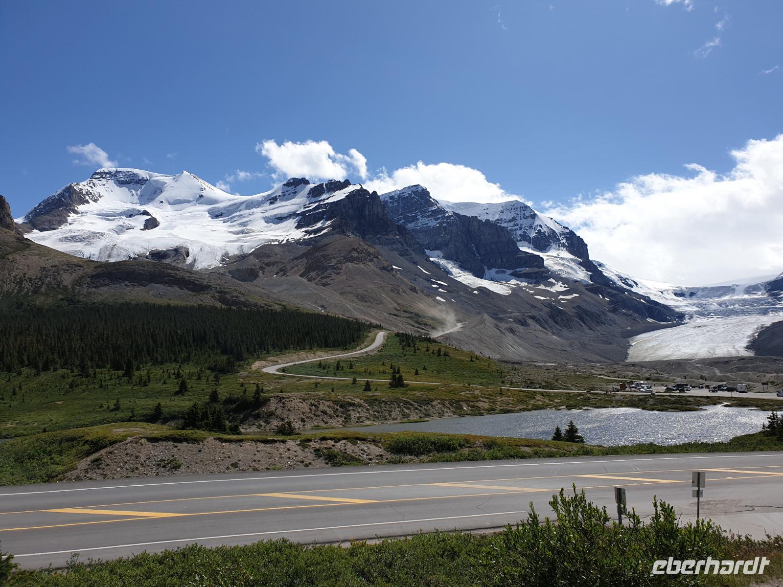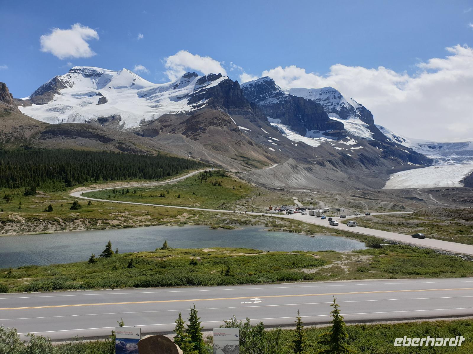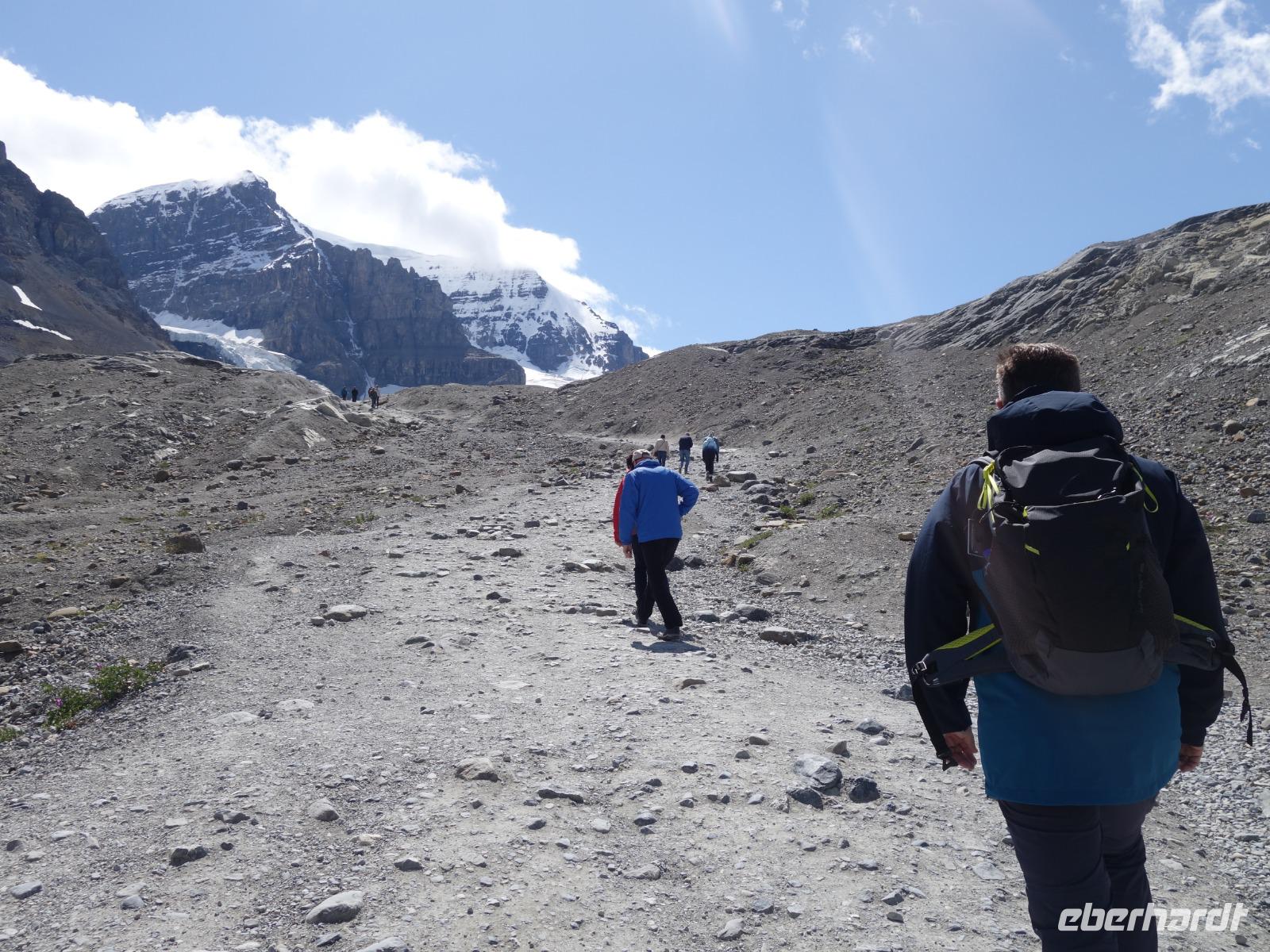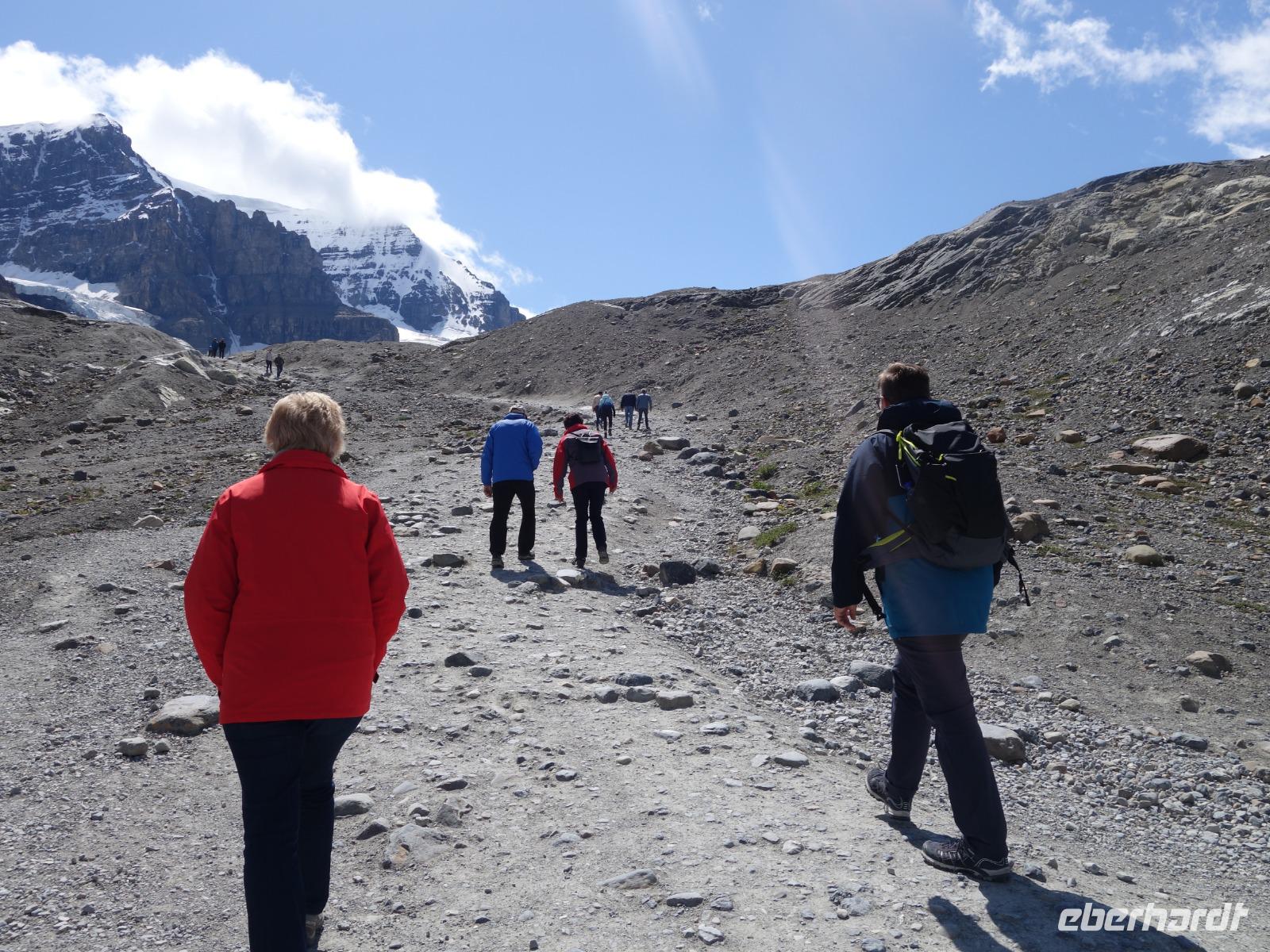 Das Eisfeld selbst liegt verborgen vor unseren Augen in der Höhe der Berge. Der Athabasca Gletscher ist hingegen von der Straße und dem Besucherzentrum gut sichtbar. Ein Teil der Gruppe fährt in großen Spezialbussen mit überdimensional großen Reifen über die südöstliche Gletschermoräne auf die Gletscherzunge. Eine echte Abenteuerfahrt und ein einmaliges Gefühl den Gletscher in einer sicheren Zone betreten zu können. Die andere Gruppe kann individuell den Fuß des Gletschers erreichen.