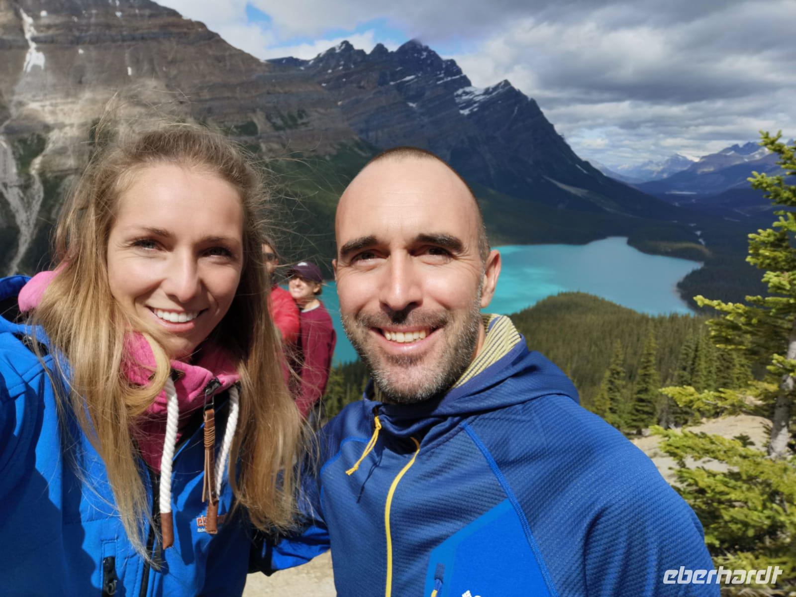 Unser Verkehrsmittel ist heute aber der Bus und der bringt uns direkt in den Banff Nationalpark. Hier führt uns der Icefield Parkway Richtung Norden bis wir unser erstes Highlight des Tages erreichen, den Lake Louise. Diesen wunderschönen Bergsee erreichen wir zu Fuß und genießen das klar blaue Wasser inmitten einer Bergkulisse - allerdings bei kühlen Temperaturen. Wir spazieren am See entlang, vorbei am Nobelhotel „The Fairmount Chateau Lake Louise" und atmen die klare, frische Luft ein. Nicht weit vom Lake Louise und vielleicht farblich noch ein bisschen reizvoller befindet sich der Morraine Lake (14km entfernt und 150m höher). Das Umfeld hier ist noch ursprünglicher als beim Lake Louise.