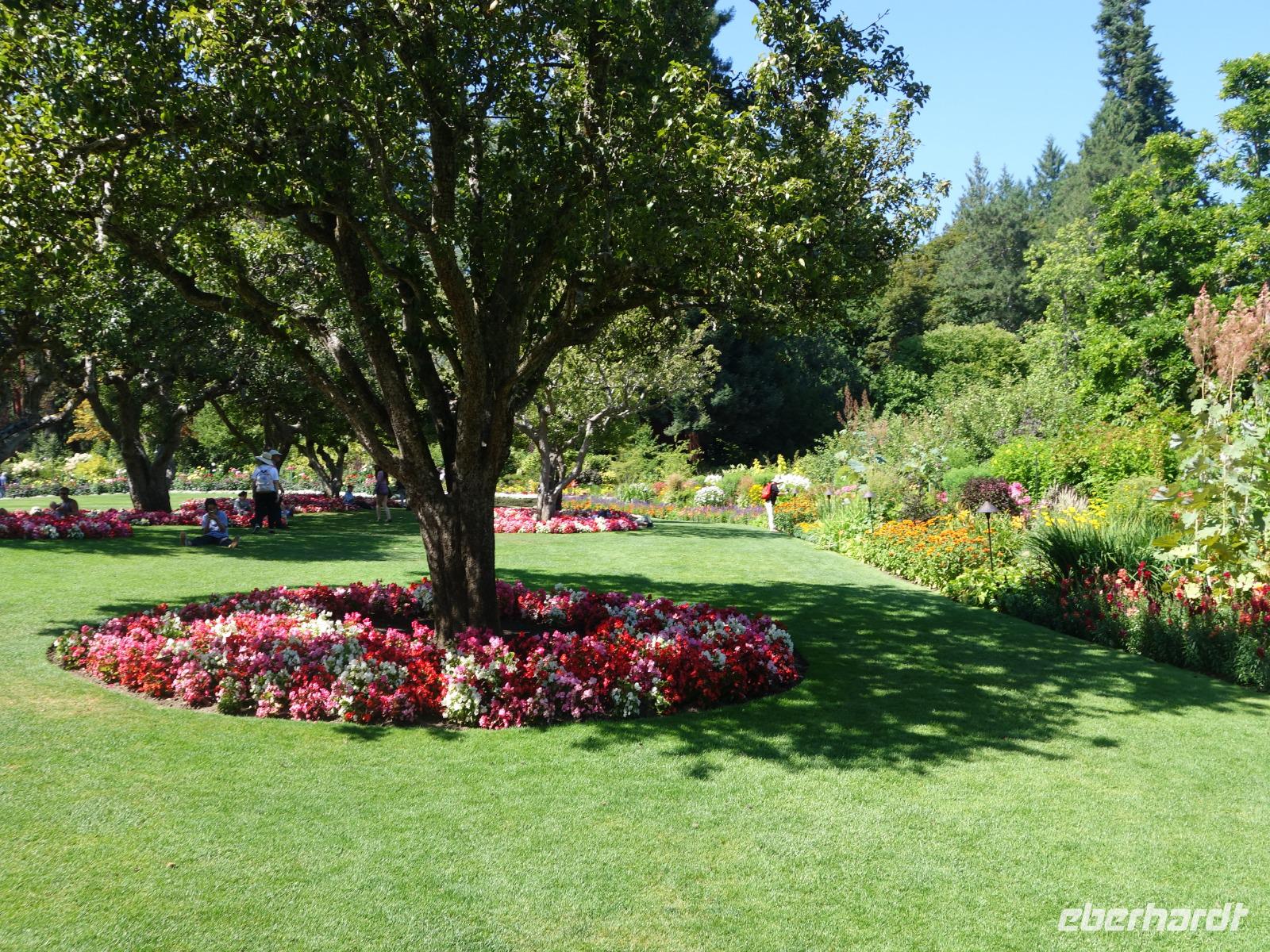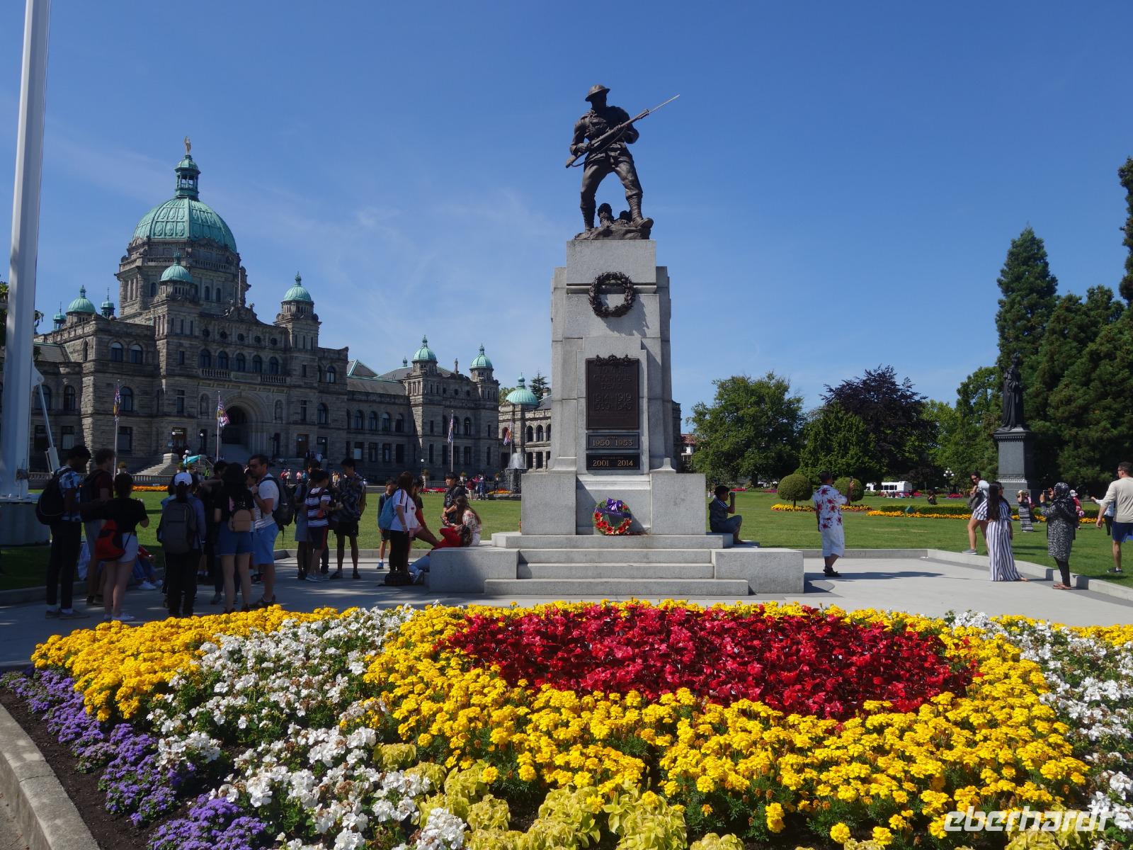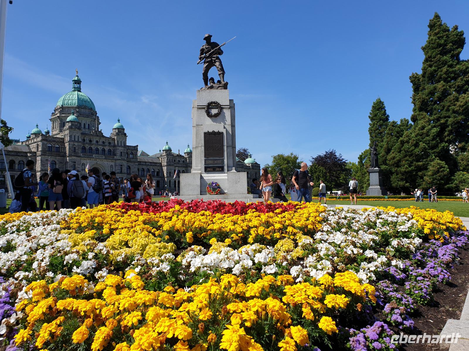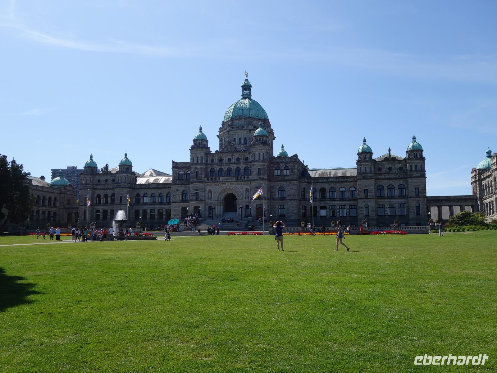 Der Tag beginnt für die Ausflügler sehr früh - um 6.30 Uhr frühstücken und um 7.30 Uhr gemeinsam mit Gudrun und Benjamin loszufahren, da um 9 Uhr die Fähre Richtung Swartz Bay erreicht werden muss. Wir setzen mit der Fähre auf die Insel Vancouver Island über. Während die Fahrt kann man draußen an die Sonne sitzen und die Landschaft genießen. In Swartz Bay sind wir um 10.30 Uhr. Nach der Überfahrt auf Vancouver Island erkunden wir erstmal die Provinzhauptstadt Victoria mit seinen prächtigen Gebäuden und herrlichen Grünanlagen. An der äußersten Südspitze von Vancouver Island befindet sich die Hauptstadt Victoria der Provinz British Columbia. Am Inner Harbour präsentiert sich das prächtige Parlamentsgebäude inmitten gepflegter Grünanlagen. Von der Spitze der Kuppel glänzt die Statue von Captain George Vancouver, der die nach ihm benannte Insel als Erster umrundete. Wichtig hier ist das Parlament-Regierungsgebäude und die Hauptstraße mit Hafen zum Bummeln. Wir haben dafür genug Freizeit, um alles in Ruhe zu erleben bis wir uns wieder treffen, um gemeinsam zum Butchart Gardens zu fahren.