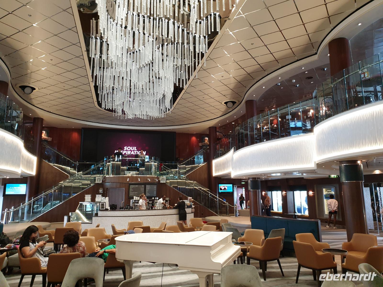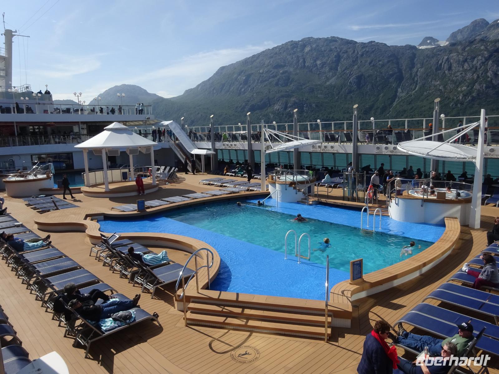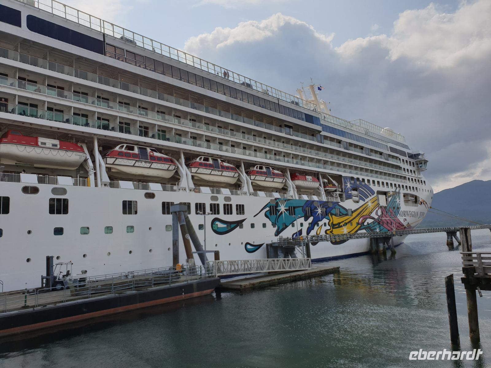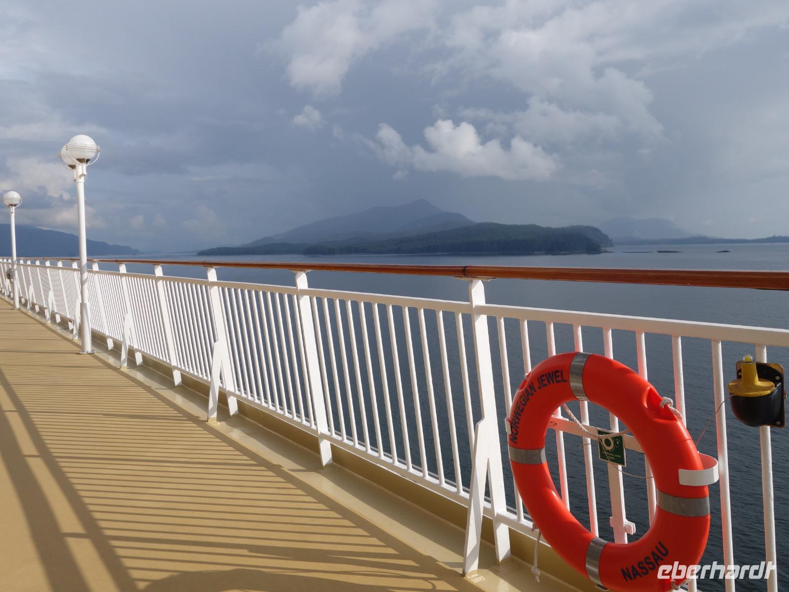 Unser erster Tag auf See. Zur Orientierungshilfe auf dem Schiff machen wir erst einmal eine kleine Führung mit Monika, unserer deutschsprachigen Ansprechpartnerin auf dem Schiff. Die „Norwegian Jewel" wurde 2005 in Deutschland bei der Meyer Werft in Papenburg nicht weit von Hamburg fertiggestellt. Der Bau dauerte 2 Jahre und die Schiffsdame kostete 420 Millionen US Dollar (heute ca. 475 Mill. €). Auf dem Schiff ist Platz für ca. 2.300 Passagiere und ca. 1.200 Crew Mitglieder aus 60 verschiedenen Ländern. Heute haben wir genug Zeit, um das Schiff voll und ganz zu erkunden und zu genießen bevor es dann an den nächsten Tagen auf Landgang geht. Zu sehen gibt es außerdem immer etwas, da wir ganz nah an der Küste entlangfahren und auf unserem Weg nach Ketchikan zahlreiche Passagen durchqueren wie bspw. die Seymour Enge (engste Stelle: 750m).