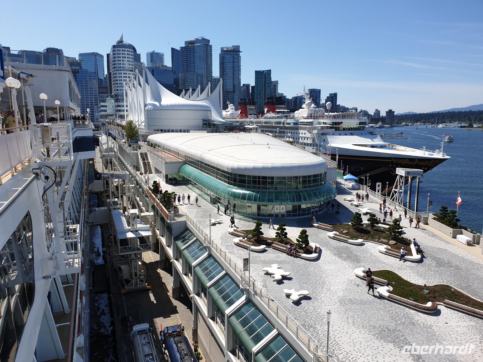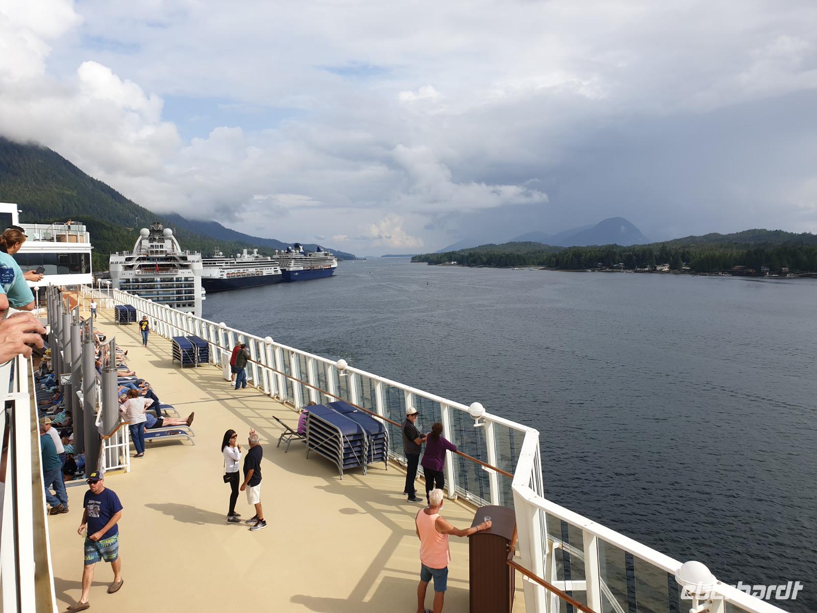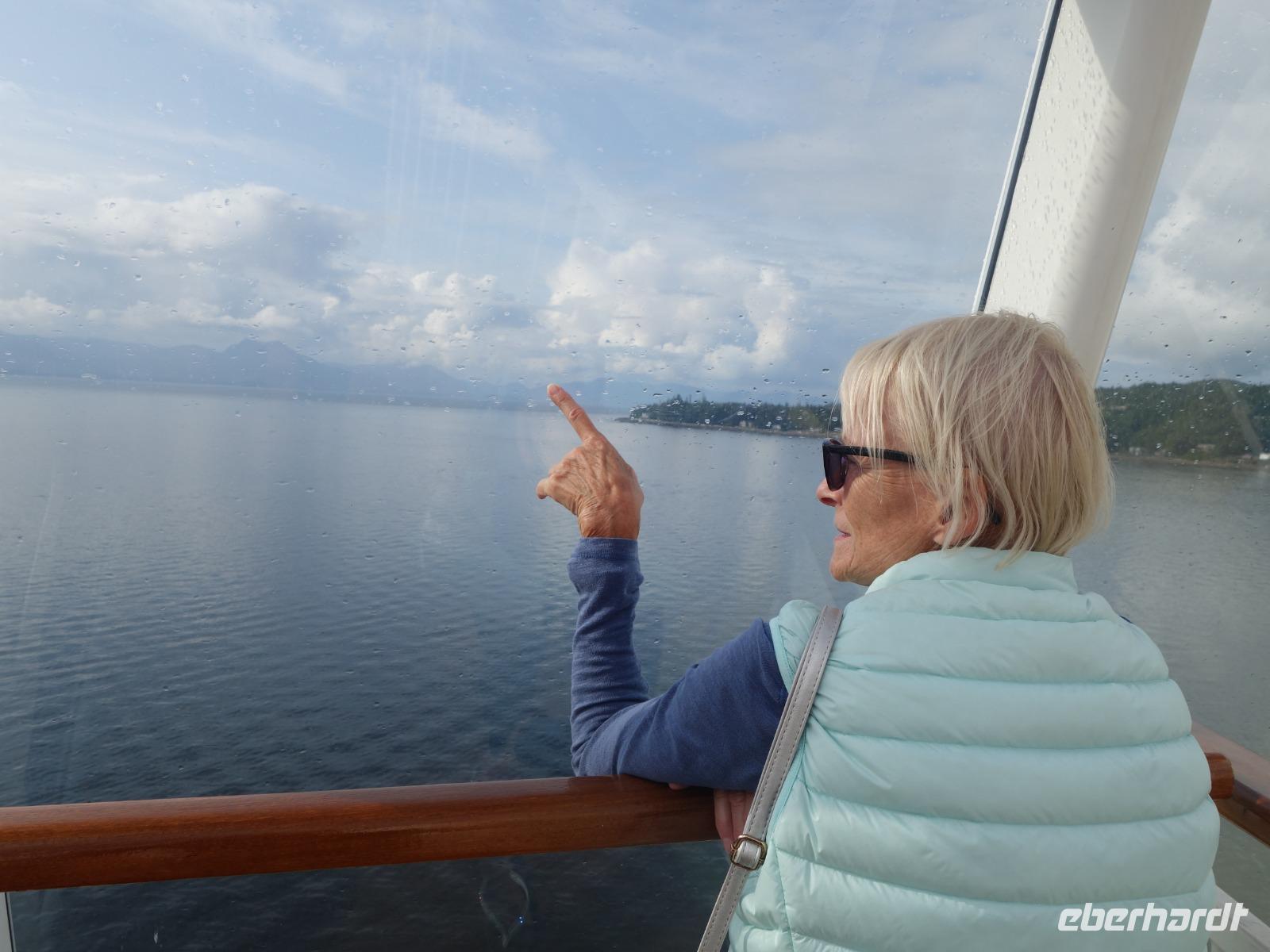 Heute beginnt der zweite Teil unsere große Rundreise - die Alaska Kreuzfahrt mit der „Norwegian Jewel" über Ketchikan, Juneau und Skagway bis Seward auf der sogenannten Inside Passage. Atemberaubende werden vor uns Tage liegen - aber erstmal müssen wir uns mit dem Schiff vertraut machen. Wir genießen auf Deck die letzten warmen Sonnenstrahlen in Vancouver bevor es weiter in den Norden geht und kälter werden wird.