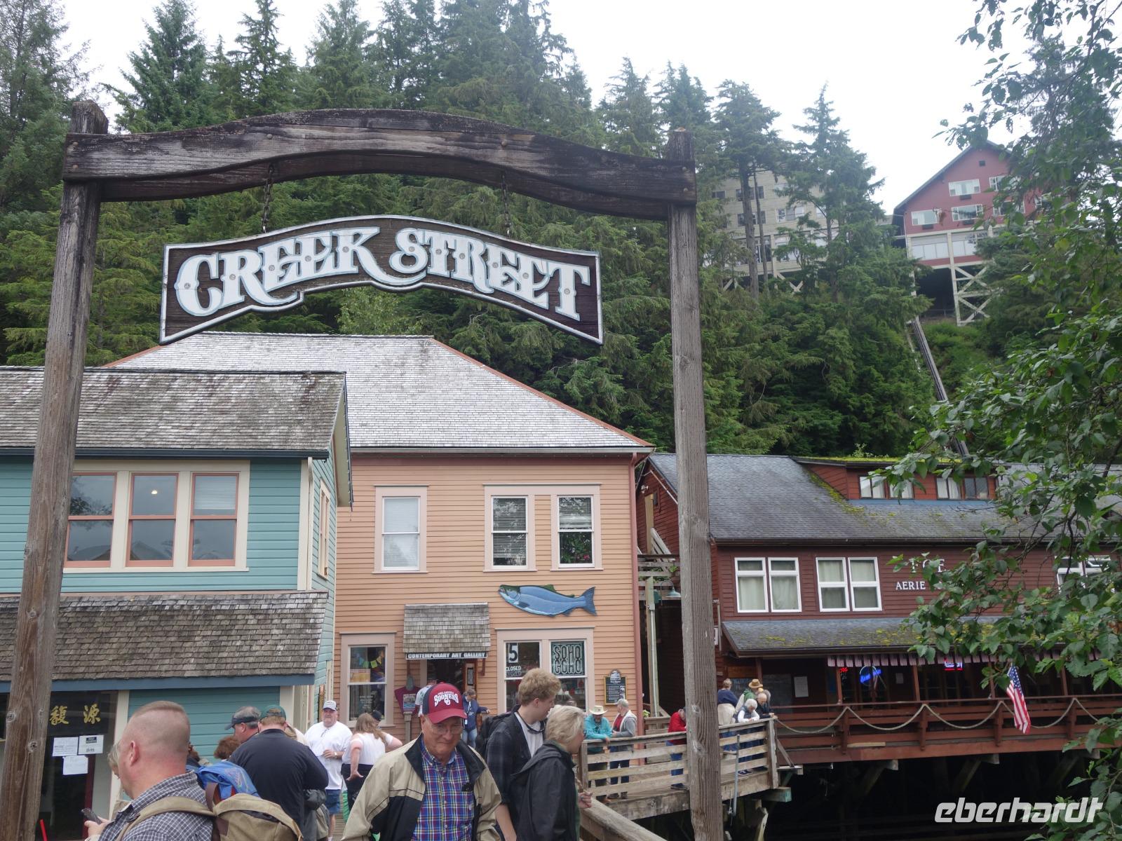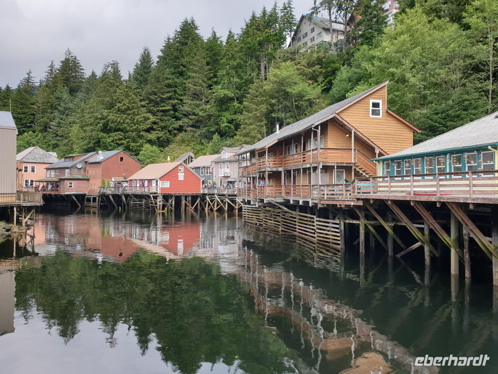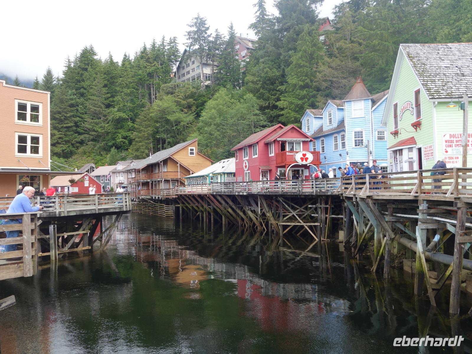 Auf unserem Spaziergang durch Ketchikan passieren wir auch die „Creek Street". Das ehemalige Rotlichtviertel von Ketchikan ist eine Reihe von Holzhäusern an einem auf Pfählen gebauten Plankenweg. Hier wurden 1900 die Bars und Freudenhäuser verbannt und es wurde zu einem feucht- fröhlichen Treffpunkt für Goldgräber, Holzfäller und Seeleuten. Wir setzen unseren Rundgang fort vorbei am Zentrum für Totempfähle und einer kleinen Lachsaufzuchtstation. Viel interessanter und schöner ist es allerdings die Lachse in ihrer natürlichen Umgebung zu beobachten, wie bspw. an einer der zahlreichen Brücken oder der sogenannten Lachsleiter, wo die Tiere versuchen die Stromschnellen zu überqueren.