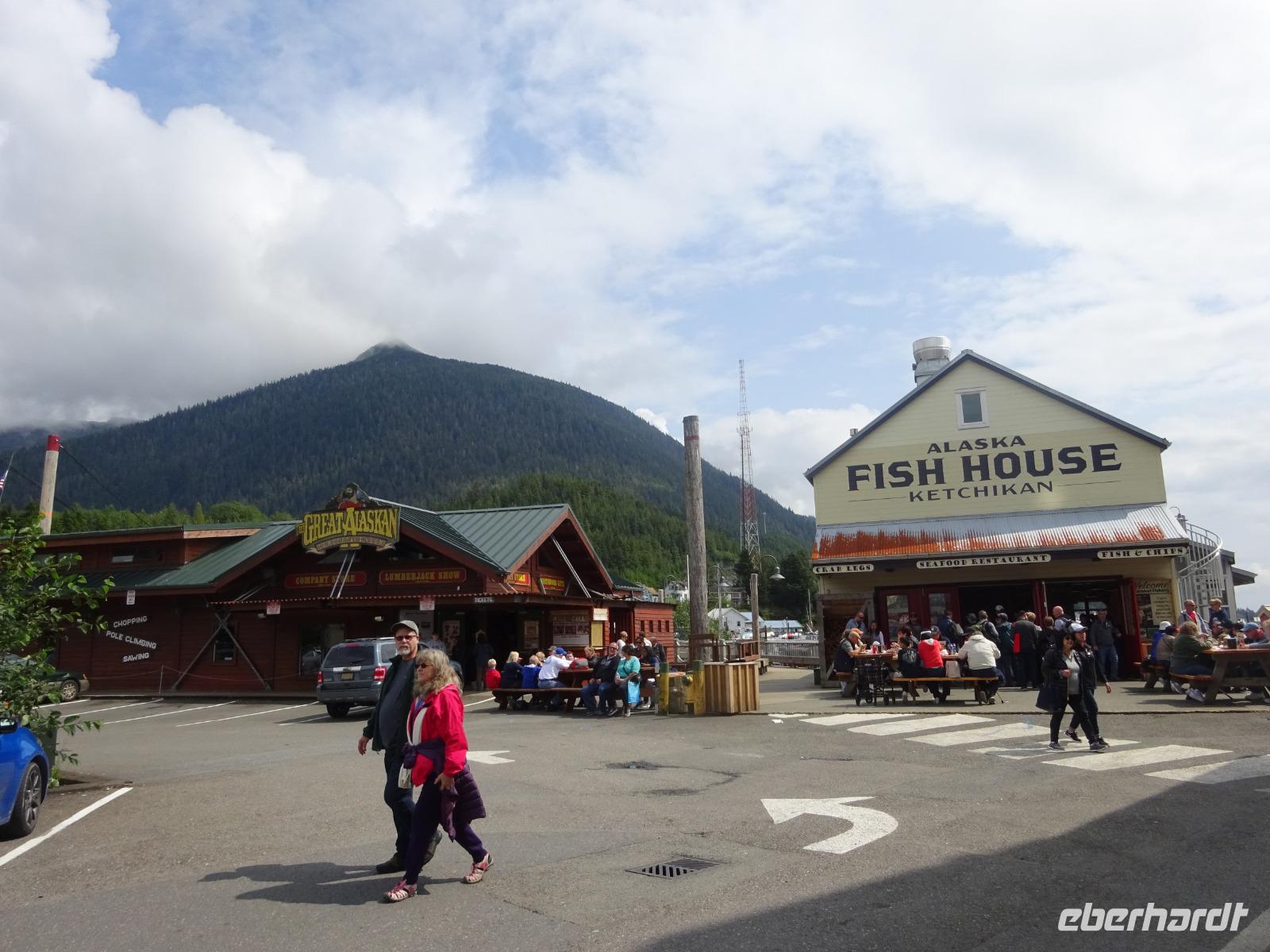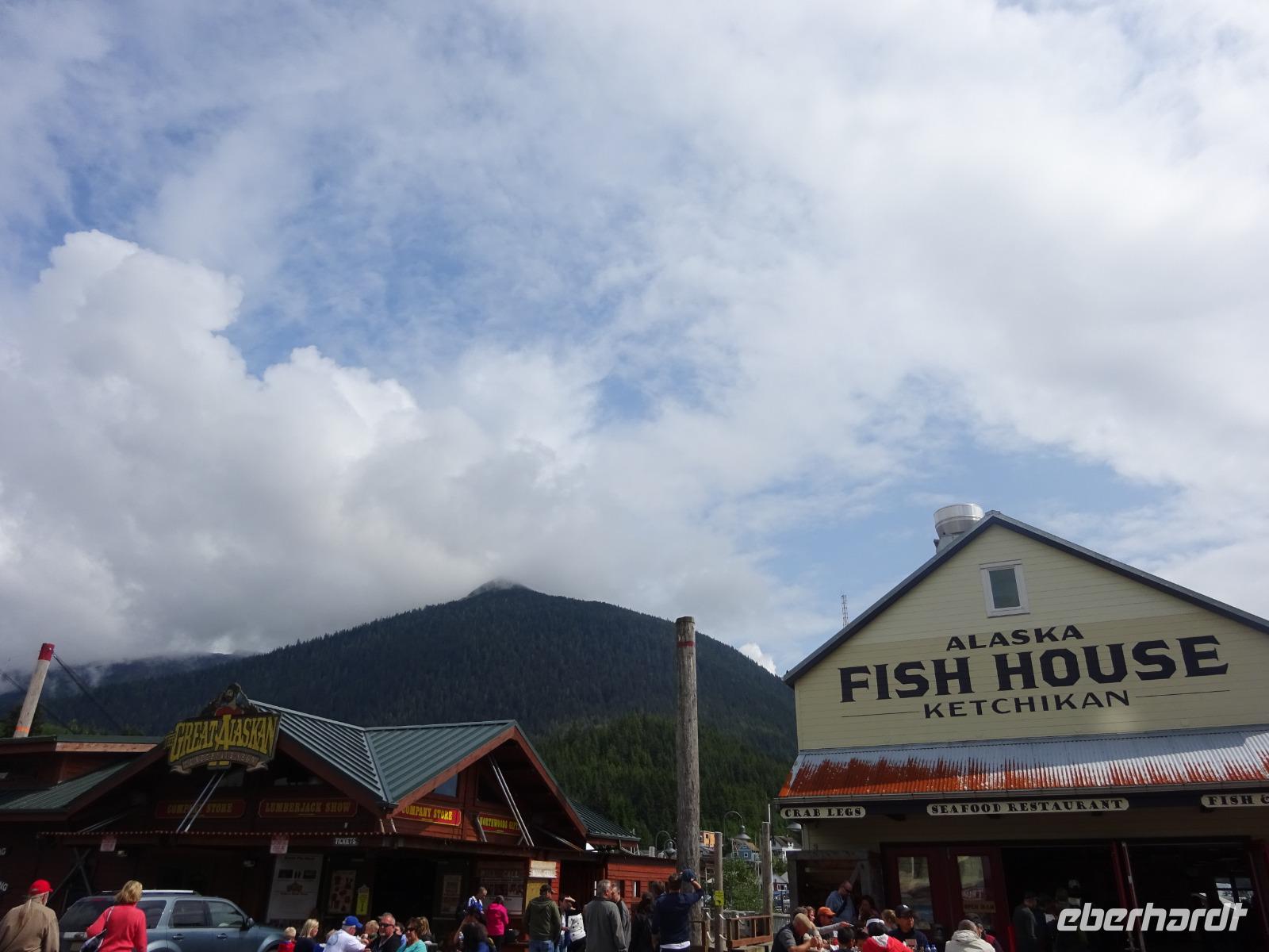 Ketchikan ist die südlichste Stadt in Alaska mit ca. 13.000 Einwohnern und lebt eben auch hauptsächlich vom Fischfang. Von hier gehen jährlich Millionen von Lachs in die ganze Welt, welche man auch in der Stadt an allen Ecken kaufen und probieren kann. Die erste Lachsverarbeitungsfabrik entstand 1886 bis dann 1898 das erste Gold gefunden wurde und mehr Leute auf der Suche nach dem goldenen Reichtum nach Ketchikan kamen.