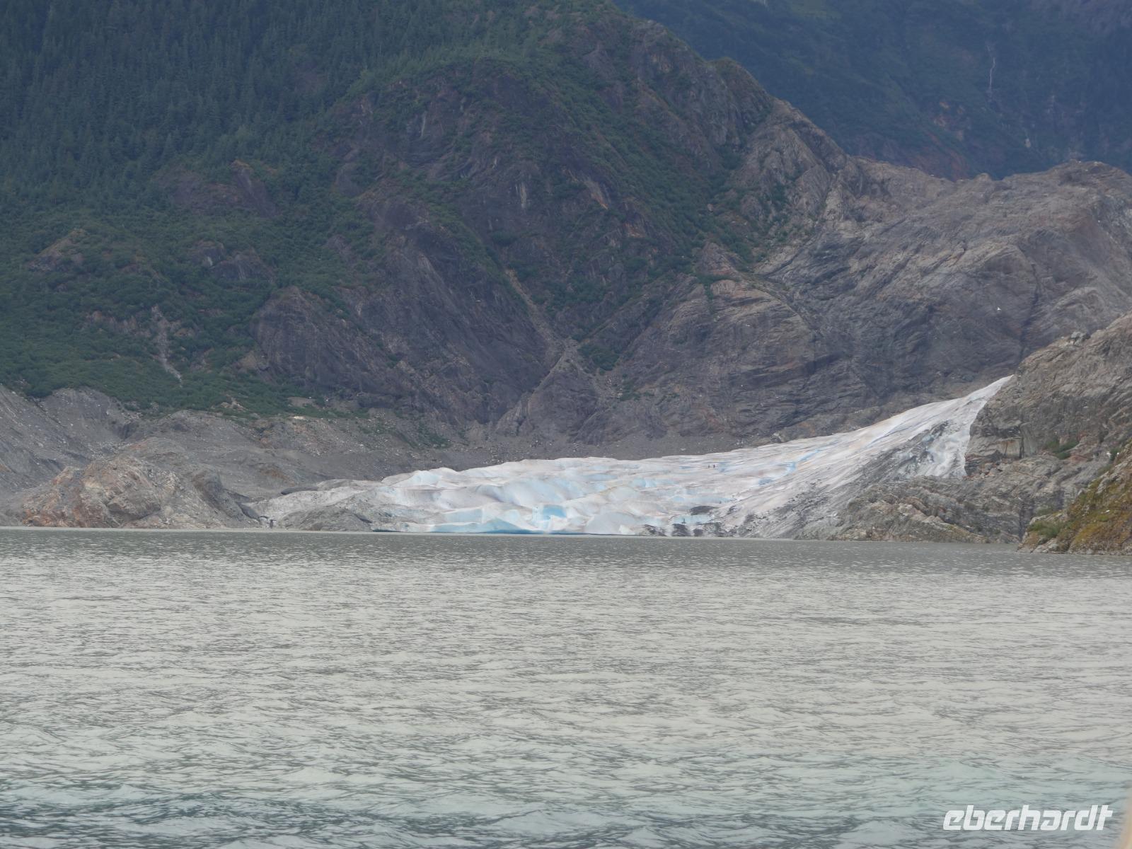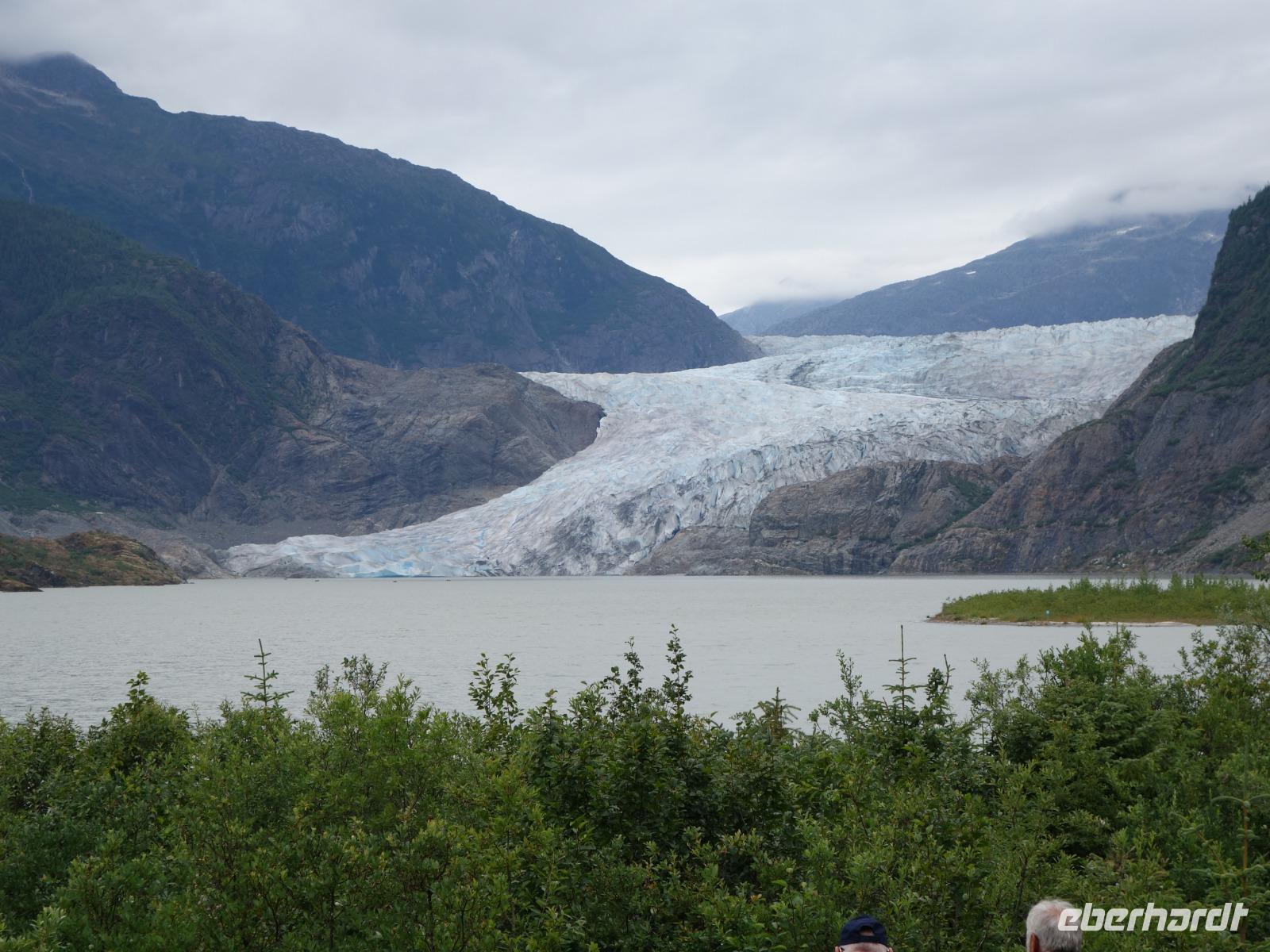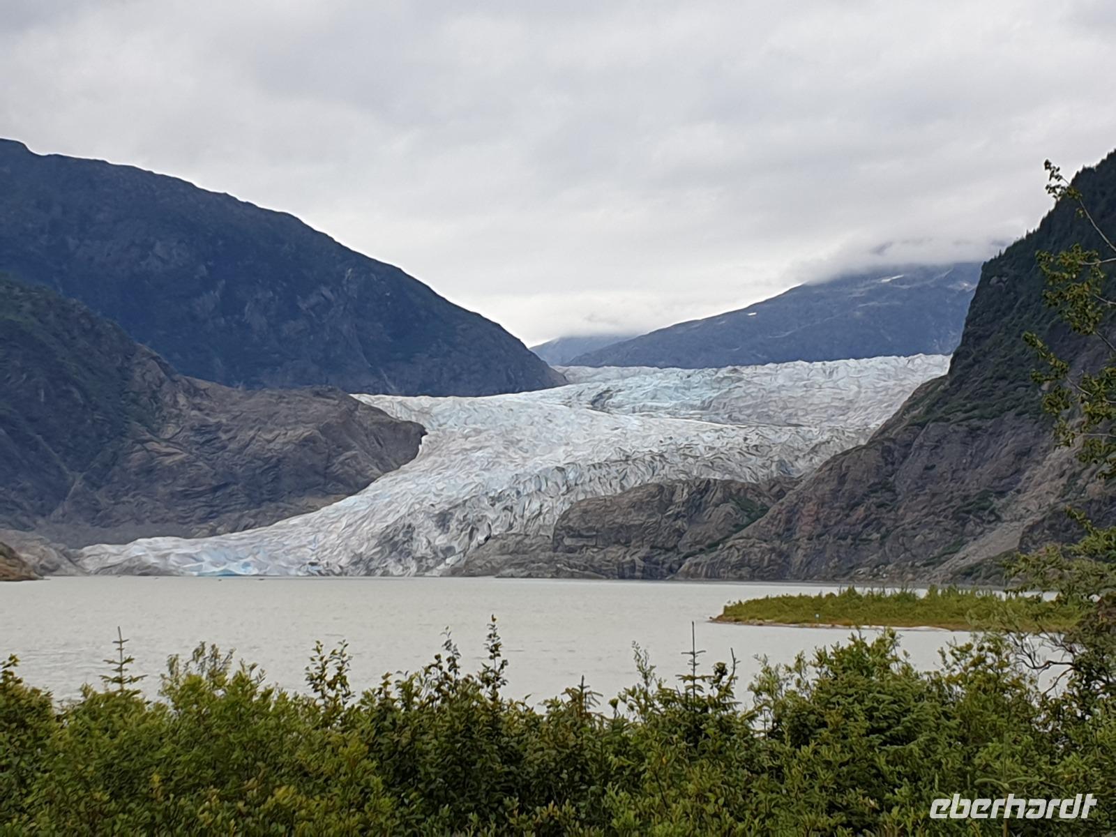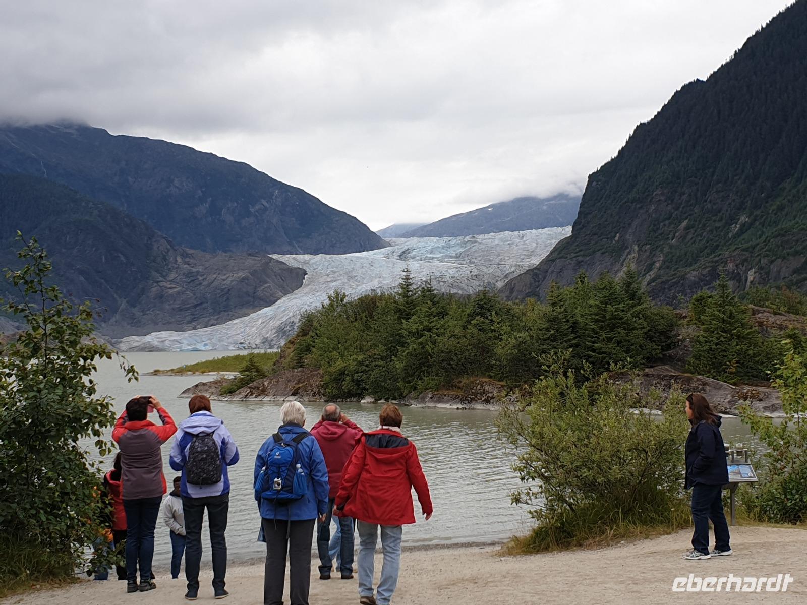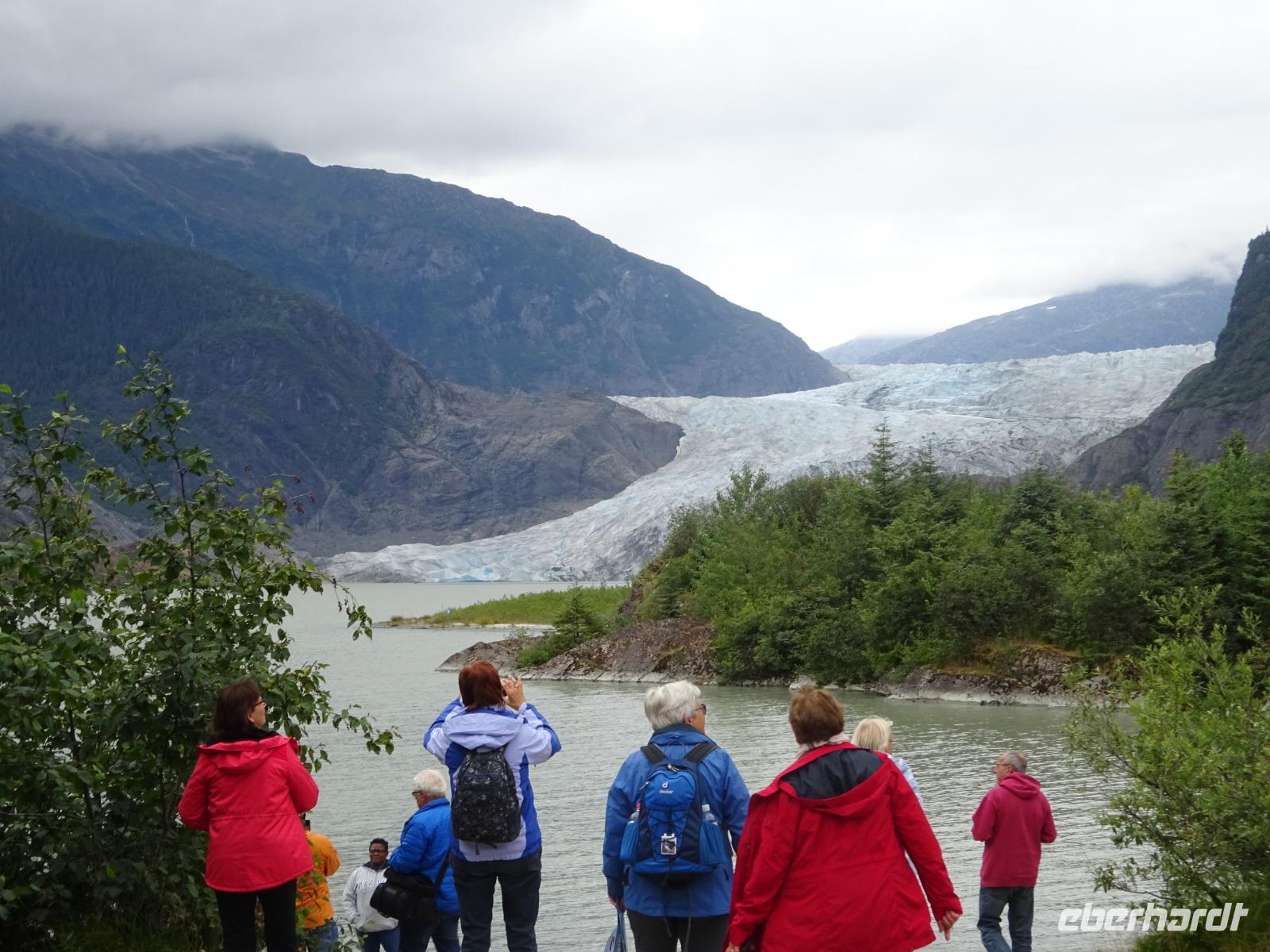 Unser erster Stopp des Tages ist der Mendenhall Gletscher, ca. 20km von Juneau entfernt. Inmitten des Tongass Nationalparks befindet sich das immer noch große Juneau Eisfeld mit ca. 4.000km², welches sich nach Osten bis in die kanadische Provinz British Columbia erstreckt. Der Gletscher ist ca. 12km lang, 2,4km breit und ca. 67m hoch. Sein Eis erreicht eine Dicke von bis zu 1.370m. Das Eis an manchen Stellen schimmert noch in wunderbaren Blautönen, die sich mit der Fotokamera kaum einfangen lassen. Die einzigartige Kristallstruktur lässt alle Farben außer Blautöne von dem Licht absorbieren. Dieser Gletscher zieht sich - im Vergleich zum Athabasca Gletscher nur 10-15m pro Jahr zurück. Das heißt, dass er bei diesem Tempo nicht nur durch seine Größe noch mindestens 200 Jahre brauchen wird, bis er sich ganz zurückgezogen hat. Das der Mendenhall Gletscher nicht schneller schrumpft liegt im Besonderen aber an dem günstigen Klima. Feuchte Luft steigt in Richtung Berge auf und kühlt ab, Schnee fällt (ca. 30m Neuschnee jedes Jahr). Da die Sommer nicht so heiß sind, schmilzt der Schnee kaum und es bilden sich dadurch neue Eisschichten.