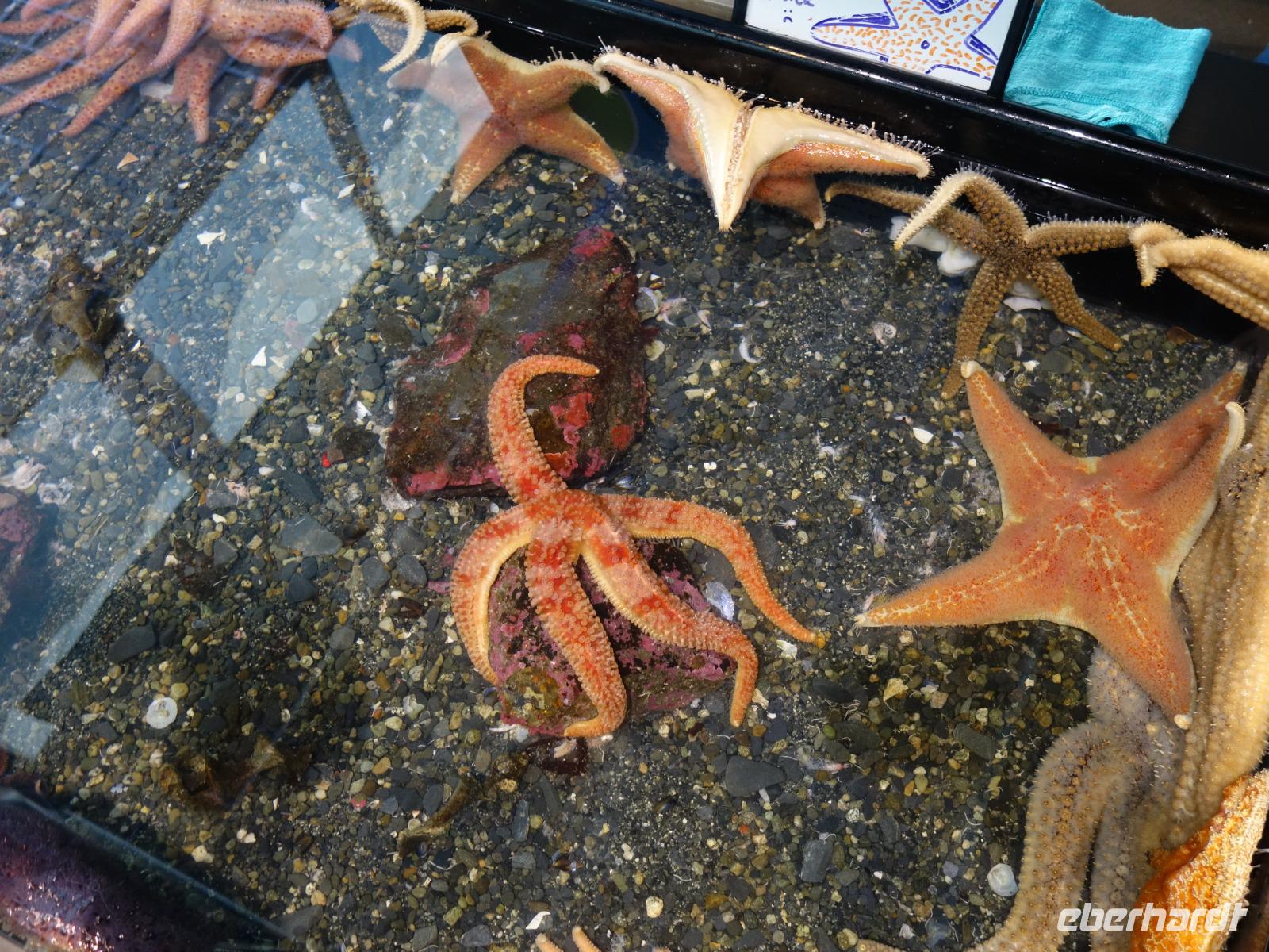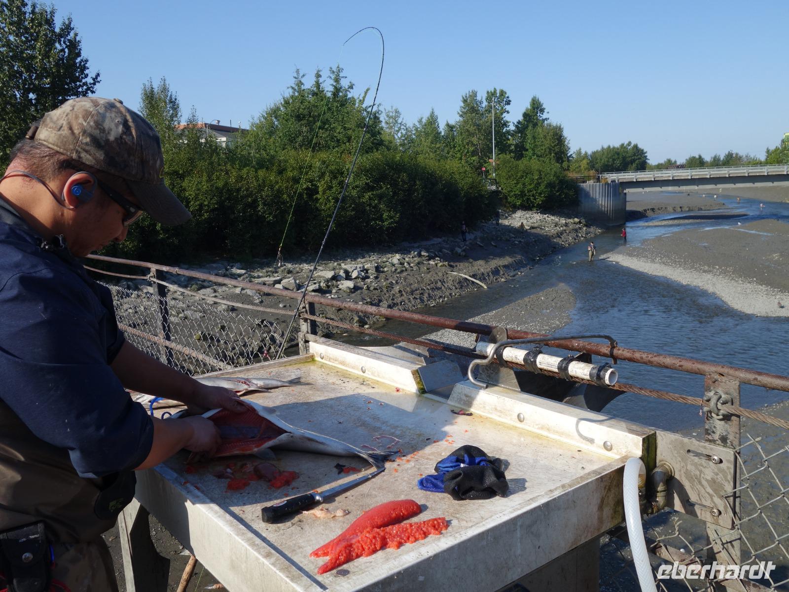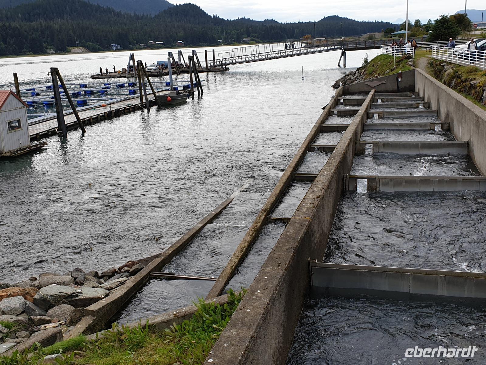 Weiter geht es in den Macaulay Lachszuchtbetrieb. Der Zuchtbetrieb hat vier Lachszuchten in der Umgebung von Junea und züchtet fünf verschiedene Lachsarten, die in Alaska heimisch sind. Wir sehen verschiedene Becken und Rampen, in denen sich die Wildlachse in verschiedenen Stadien ihres Lebens befinden. Die Lachse werden hier nicht wie auf einer herkömmlichen Fischfarm gehalten, sondern in das Meer zurück entlassen. Erst wenn die Lachse nach Jahren zum Laichen in ihr Heimatgewässer wiederkehren, werden sie von der Farm betäubt und ihrer Eier und Samen entnommen. Der Zyklus der Aufzucht beginnt von vorne.