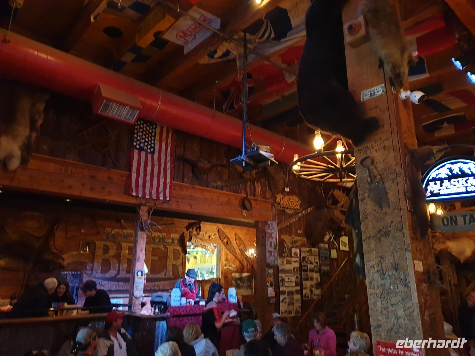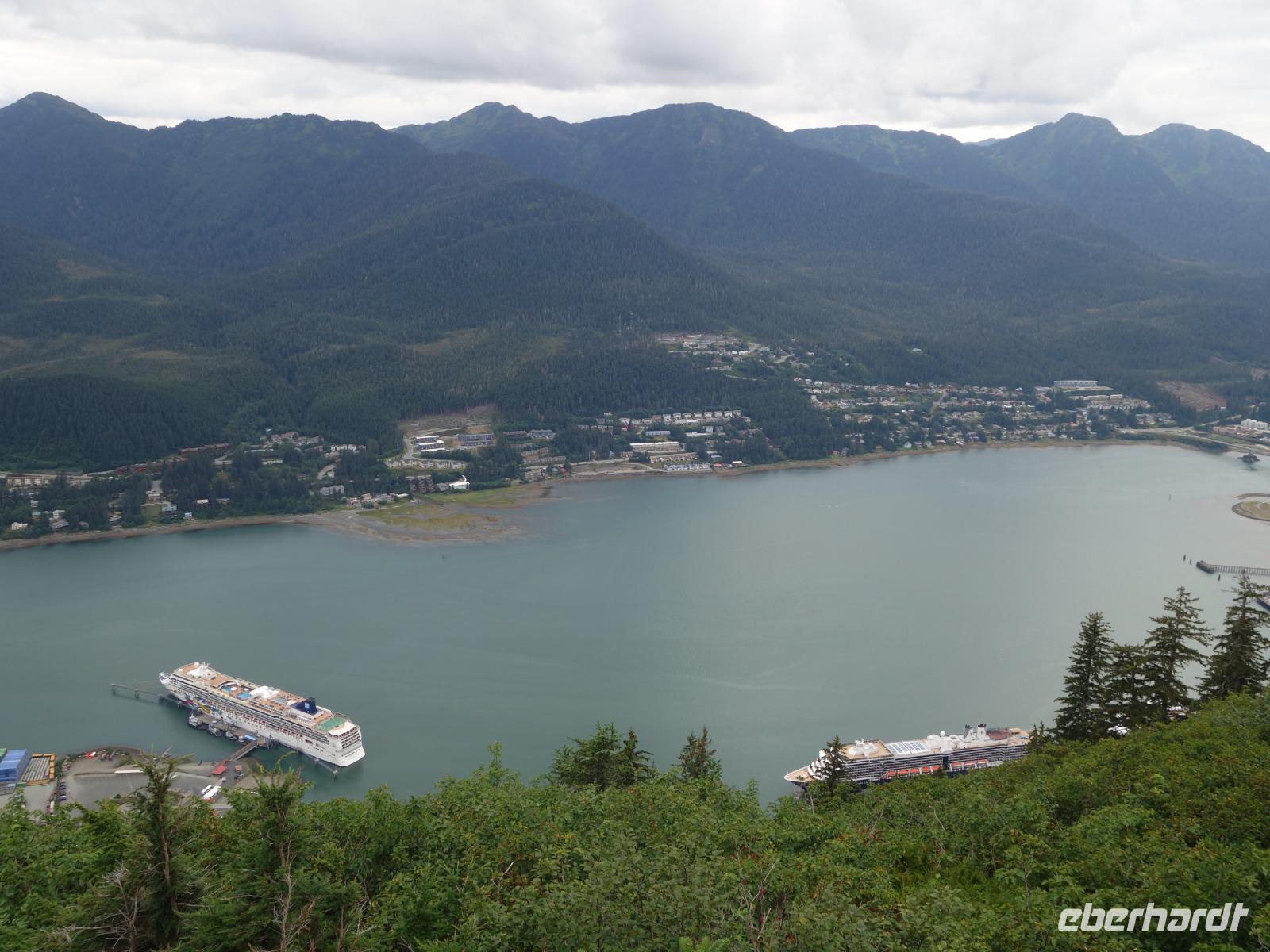 Unser letzter Stopp des Tages führt uns mit der Seilbahn hinauf auf den Mount Roberts. Die Seilbahn bringt uns hinauf auf 532m, von wo wir einen wunderbaren Blick über Juneau haben. Wir sehen Douglas Island und den Gastineau Kanal auf der einen Seite und die Berglandschaft auf der anderen. Wer Lust hat wandert ein wenig umher. Es gibt zahlreiche gut beschilderte Trails. Auch einem Abstieg zu Fuß steht nichts im Wege. Das Schiff legt heute spät ab, also haben wir genug Zeit, um uns noch auf eigene Faust in Juneau umzuschauen und vielleicht auf ein kühles Kaltgetränk im Red Dog Salon mit seinem urigen Ambiente vorbei zu schauen. Cheers!