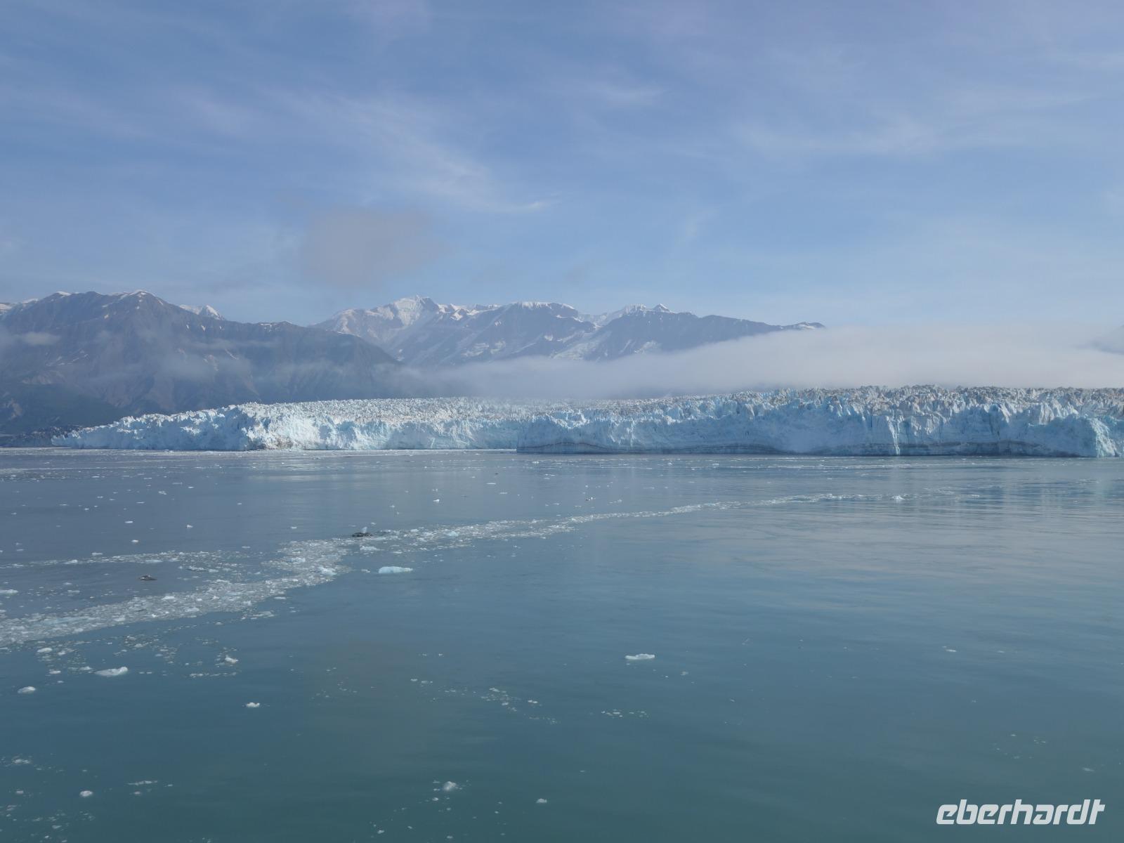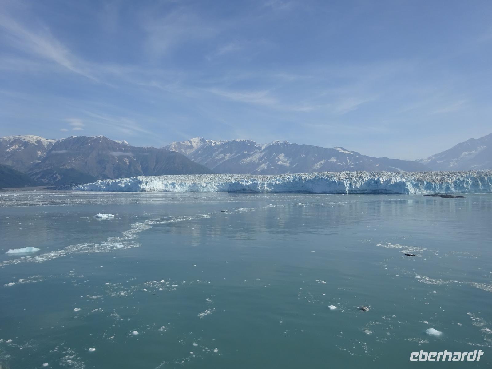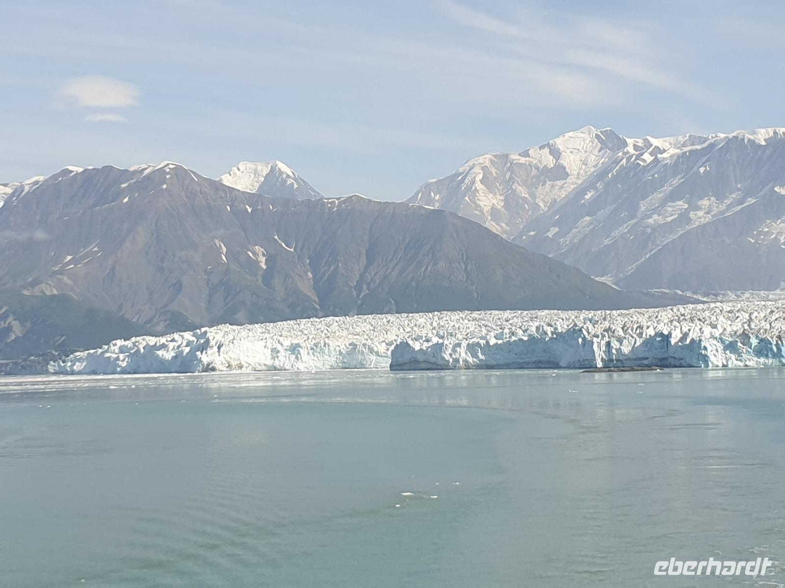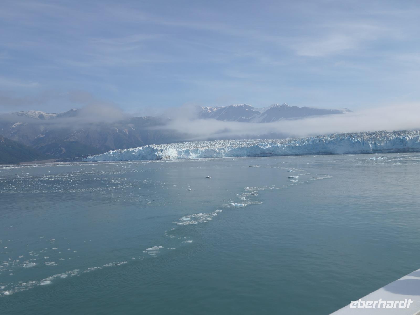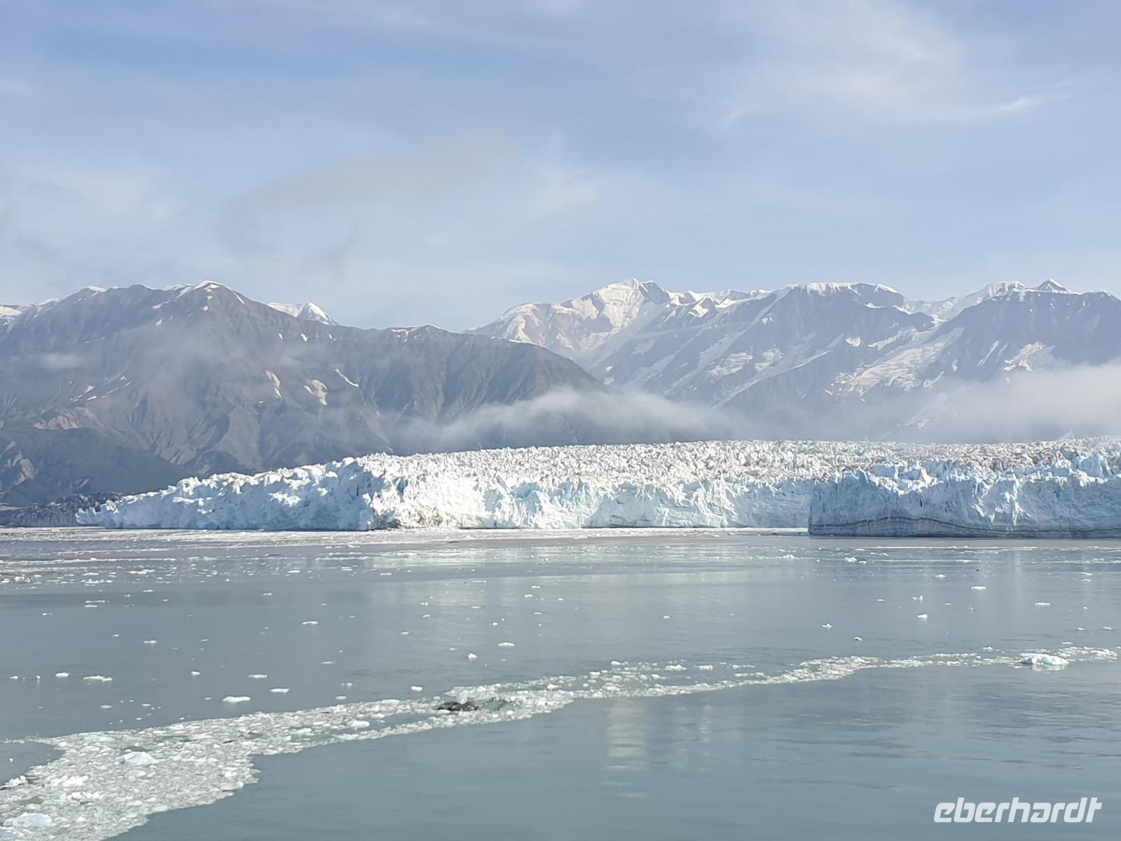 Der letzte Seetag bringt uns ganz nah an den gigantischen Hubbard Gletscher, Nordamerikas größten Gezeitengletscher. Er besteht aus 3.500km² blauen Eis und ist einer der aktivsten Gletscher in Alaska. Das können wir hautnah miterleben! Es klingt wie ein Gewitter, das aufzieht, kurz bevor der Gletscher kalbt. Der Hubbard Gletscher befindet sich zu einem Teil in Ostalaska und zum anderen Teil in Yukon, Kanada. Er wurde nach Gardiner Hubbard, dem Präsidenten der Bell Telefongesellschaft benannt. Bevor der Hubbard Gletscher das Meer erreicht, verbindet er sich im Westen mit den Valerie Gletscher. Es ist ein einmaliges Erlebnis und wieder einmal haben wir den Jackpot in Sachen Wetter gezogen. Ein herrlicher Morgen, erst liegt noch der Nebel über den „Hubbi", aber schon bald verschwindet diese und gibt die Sicht auf die wunderschönen in der Sonne glitzernde schneebedeckte Gipfel. Das auf dem Wasser treibende Eis mit dem gigantischen Gletscher im Hintergrund ist definitiv ein Bild für die Ewigkeit.