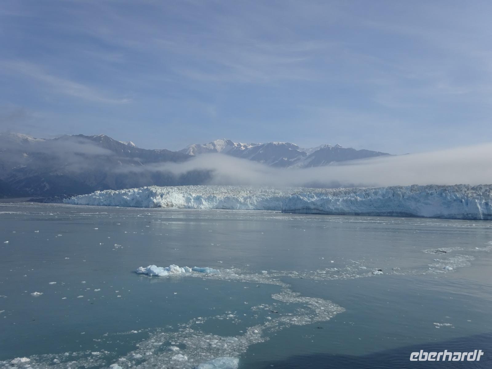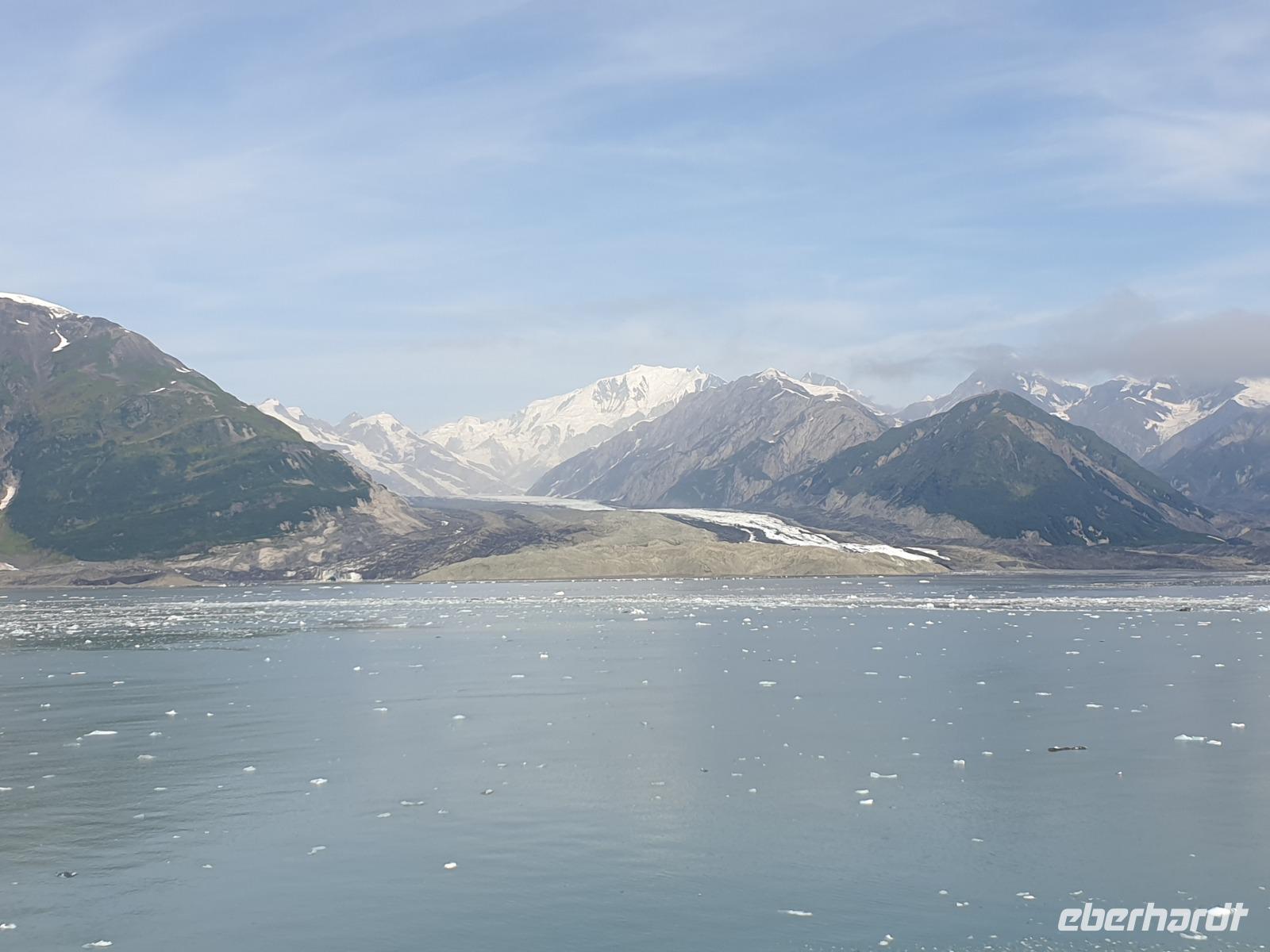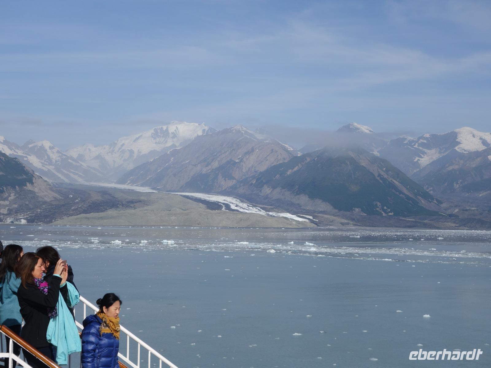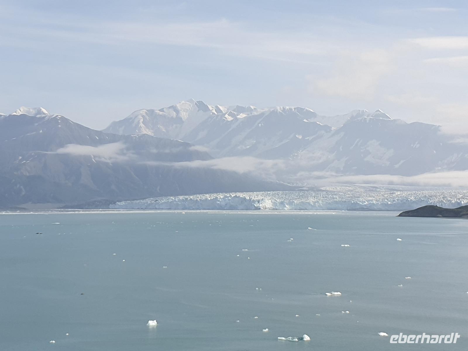 Der letzte Seetag bringt uns ganz nah an den gigantischen Hubbard Gletscher, Nordamerikas größten Gezeitengletscher. Er besteht aus 3.500km² blauen Eis und ist einer der aktivsten Gletscher in Alaska. Das können wir hautnah miterleben! Es klingt wie ein Gewitter, das aufzieht, kurz bevor der Gletscher kalbt. Der Hubbard Gletscher befindet sich zu einem Teil in Ostalaska und zum anderen Teil in Yukon, Kanada. Er wurde nach Gardiner Hubbard, dem Präsidenten der Bell Telefongesellschaft benannt. Bevor der Hubbard Gletscher das Meer erreicht, verbindet er sich im Westen mit den Valerie Gletscher. Es ist ein einmaliges Erlebnis und wieder einmal haben wir den Jackpot in Sachen Wetter gezogen. Ein herrlicher Morgen, erst liegt noch der Nebel über den „Hubbi", aber schon bald verschwindet diese und gibt die Sicht auf die wunderschönen in der Sonne glitzernde schneebedeckte Gipfel. Das auf dem Wasser treibende Eis mit dem gigantischen Gletscher im Hintergrund ist definitiv ein Bild für die Ewigkeit.
