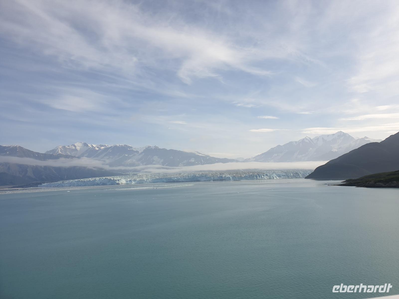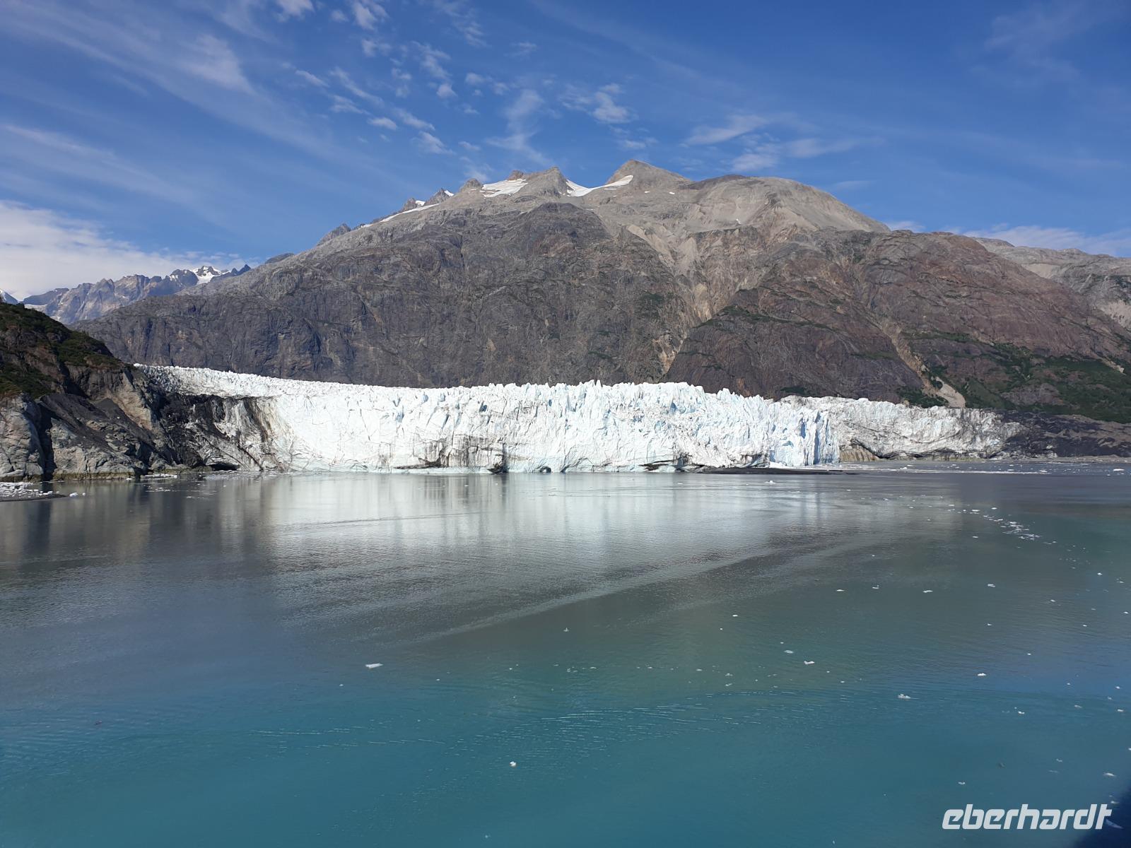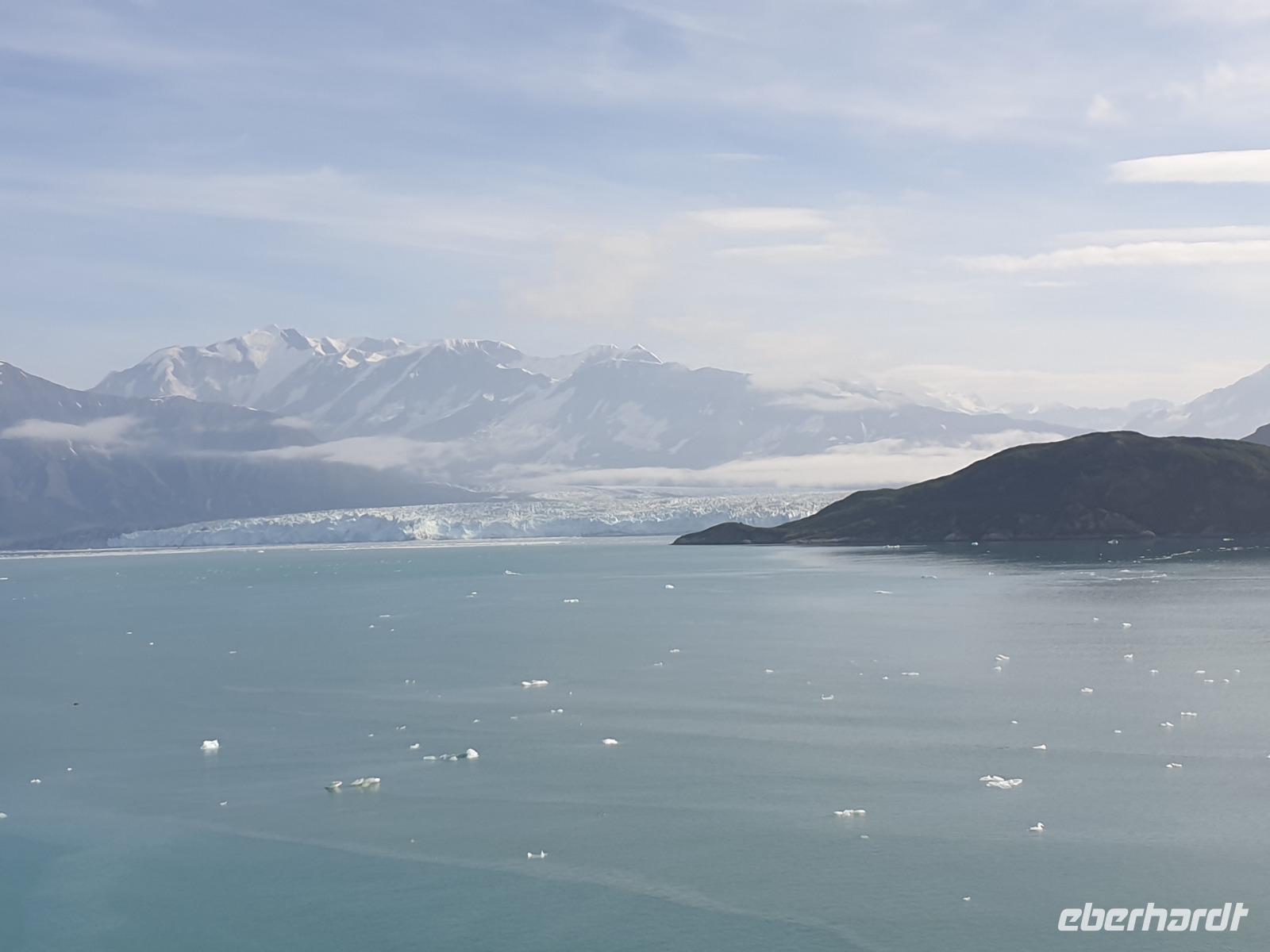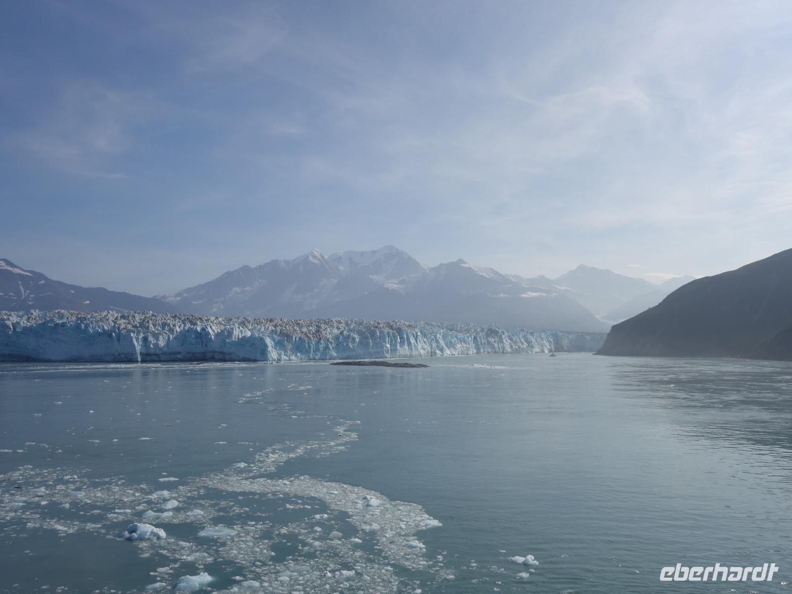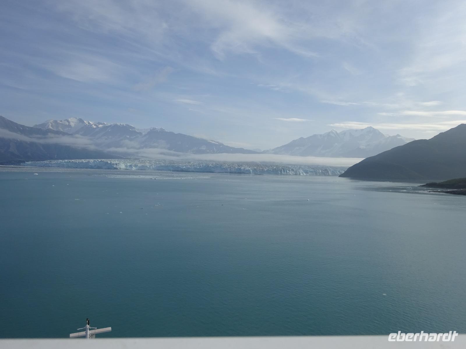 Der letzte Seetag bringt uns ganz nah an den gigantischen Hubbard Gletscher, Nordamerikas größten Gezeitengletscher. Er besteht aus 3.500km² blauen Eis und ist einer der aktivsten Gletscher in Alaska. Das können wir hautnah miterleben! Es klingt wie ein Gewitter, das aufzieht, kurz bevor der Gletscher kalbt. Der Hubbard Gletscher befindet sich zu einem Teil in Ostalaska und zum anderen Teil in Yukon, Kanada. Er wurde nach Gardiner Hubbard, dem Präsidenten der Bell Telefongesellschaft benannt. Bevor der Hubbard Gletscher das Meer erreicht, verbindet er sich im Westen mit den Valerie Gletscher. Es ist ein einmaliges Erlebnis und wieder einmal haben wir den Jackpot in Sachen Wetter gezogen. Ein herrlicher Morgen, erst liegt noch der Nebel über den „Hubbi", aber schon bald verschwindet diese und gibt die Sicht auf die wunderschönen in der Sonne glitzernde schneebedeckte Gipfel. Das auf dem Wasser treibende Eis mit dem gigantischen Gletscher im Hintergrund ist definitiv ein Bild für die Ewigkeit.