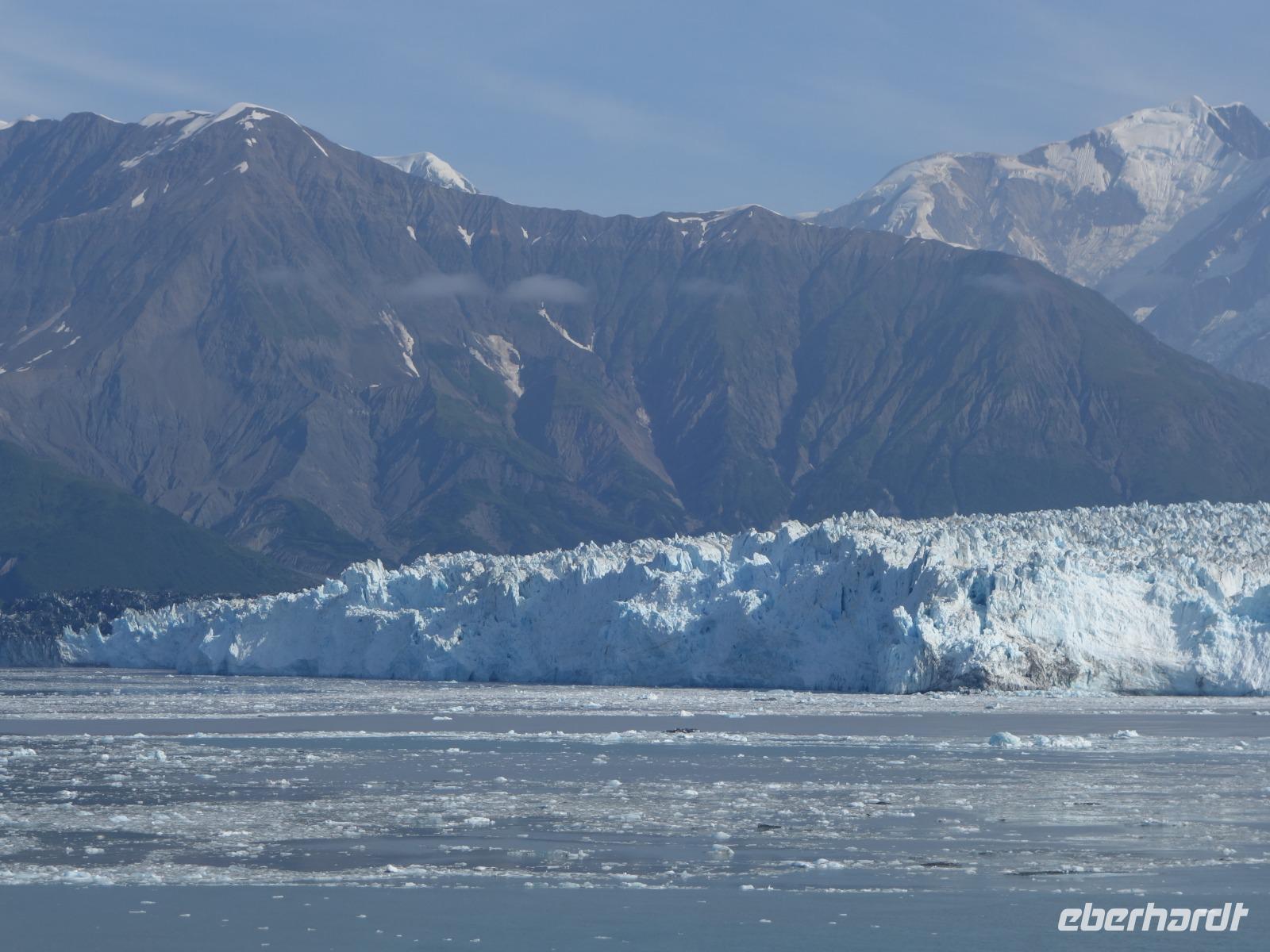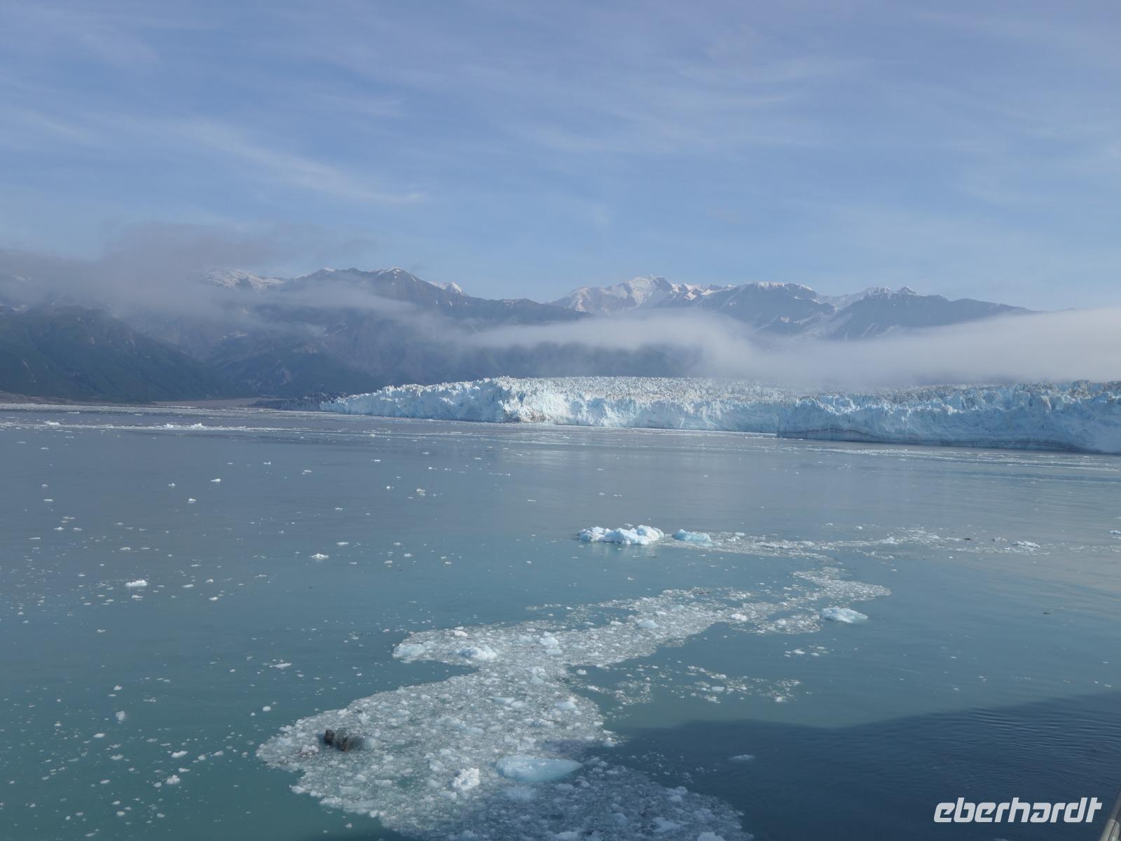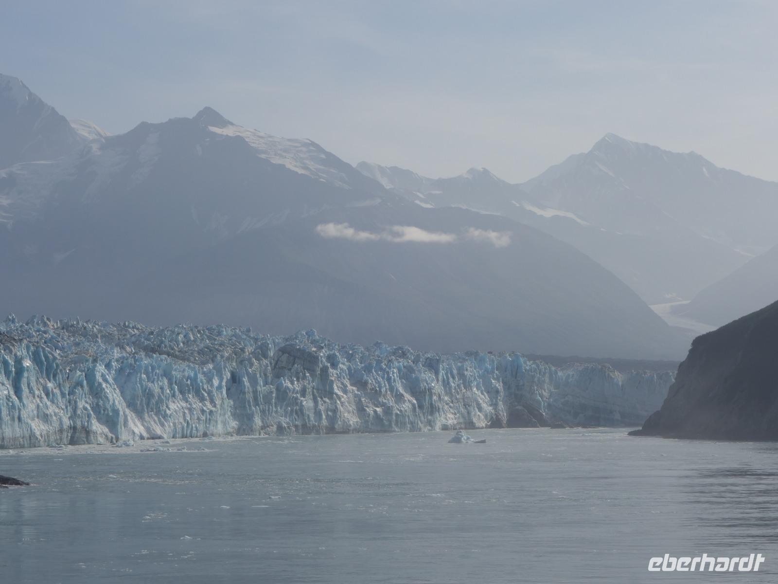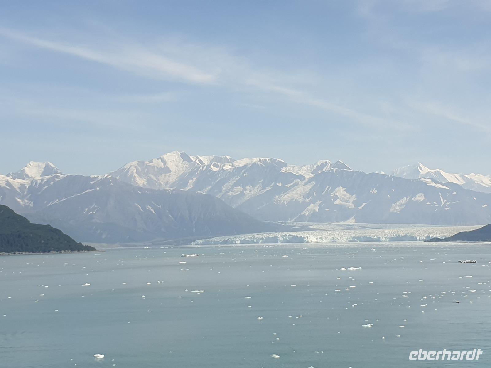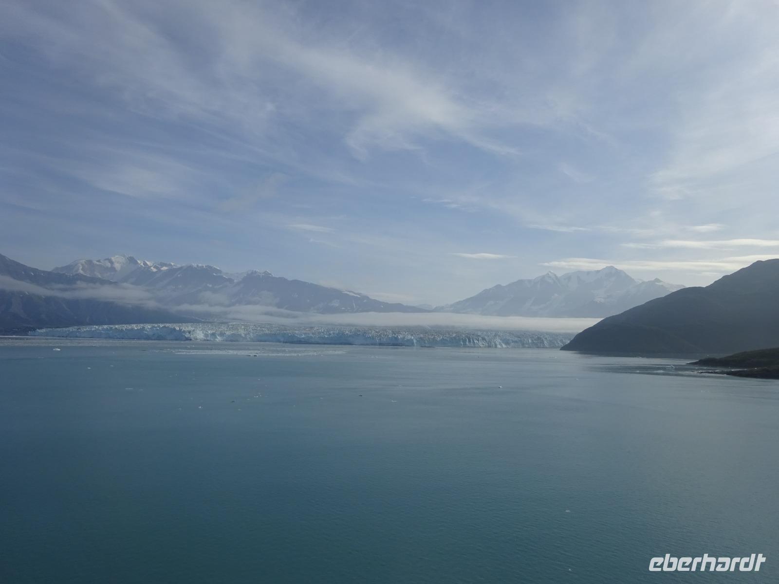 Der letzte Seetag bringt uns ganz nah an den gigantischen Hubbard Gletscher, Nordamerikas größten Gezeitengletscher. Er besteht aus 3.500km² blauen Eis und ist einer der aktivsten Gletscher in Alaska. Das können wir hautnah miterleben! Es klingt wie ein Gewitter, das aufzieht, kurz bevor der Gletscher kalbt. Der Hubbard Gletscher befindet sich zu einem Teil in Ostalaska und zum anderen Teil in Yukon, Kanada. Er wurde nach Gardiner Hubbard, dem Präsidenten der Bell Telefongesellschaft benannt. Bevor der Hubbard Gletscher das Meer erreicht, verbindet er sich im Westen mit den Valerie Gletscher. Es ist ein einmaliges Erlebnis und wieder einmal haben wir den Jackpot in Sachen Wetter gezogen. Ein herrlicher Morgen, erst liegt noch der Nebel über den „Hubbi", aber schon bald verschwindet diese und gibt die Sicht auf die wunderschönen in der Sonne glitzernde schneebedeckte Gipfel. Das auf dem Wasser treibende Eis mit dem gigantischen Gletscher im Hintergrund ist definitiv ein Bild für die Ewigkeit.