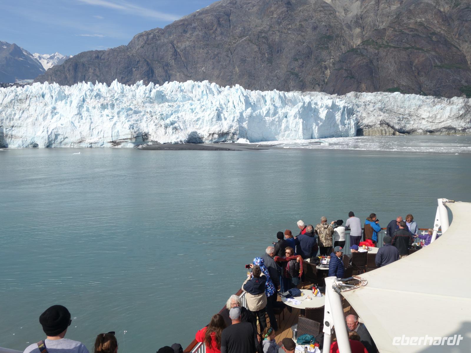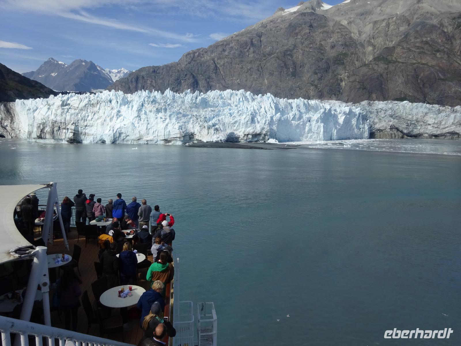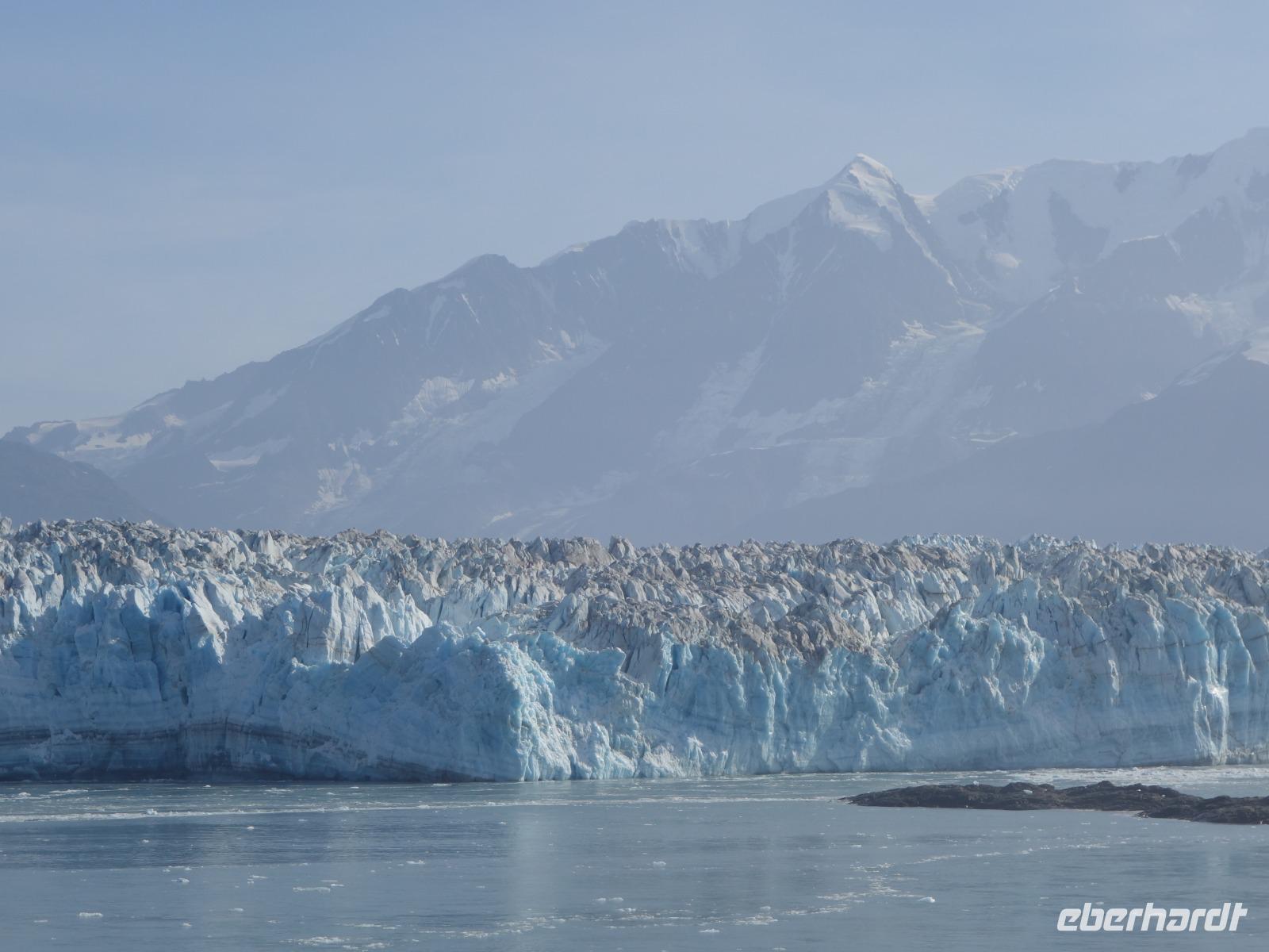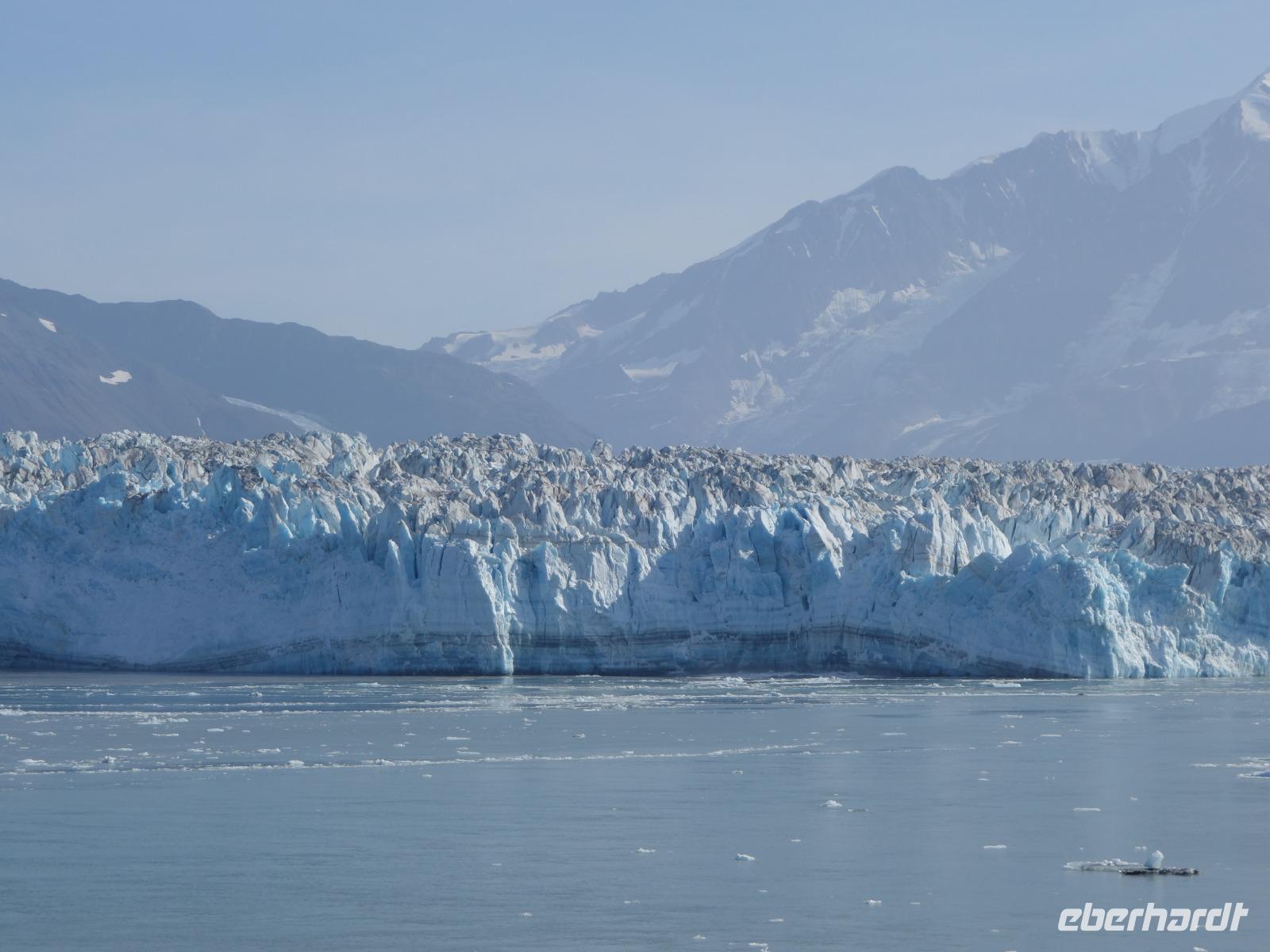 Der letzte Seetag bringt uns ganz nah an den gigantischen Hubbard Gletscher, Nordamerikas größten Gezeitengletscher. Er besteht aus 3.500km² blauen Eis und ist einer der aktivsten Gletscher in Alaska. Das können wir hautnah miterleben! Es klingt wie ein Gewitter, das aufzieht, kurz bevor der Gletscher kalbt. Der Hubbard Gletscher befindet sich zu einem Teil in Ostalaska und zum anderen Teil in Yukon, Kanada. Er wurde nach Gardiner Hubbard, dem Präsidenten der Bell Telefongesellschaft benannt. Bevor der Hubbard Gletscher das Meer erreicht, verbindet er sich im Westen mit den Valerie Gletscher. Es ist ein einmaliges Erlebnis und wieder einmal haben wir den Jackpot in Sachen Wetter gezogen. Ein herrlicher Morgen, erst liegt noch der Nebel über den „Hubbi", aber schon bald verschwindet diese und gibt die Sicht auf die wunderschönen in der Sonne glitzernde schneebedeckte Gipfel. Das auf dem Wasser treibende Eis mit dem gigantischen Gletscher im Hintergrund ist definitiv ein Bild für die Ewigkeit.