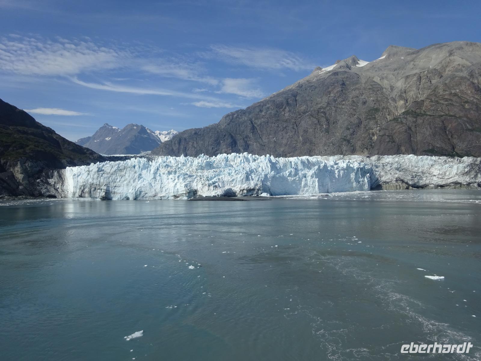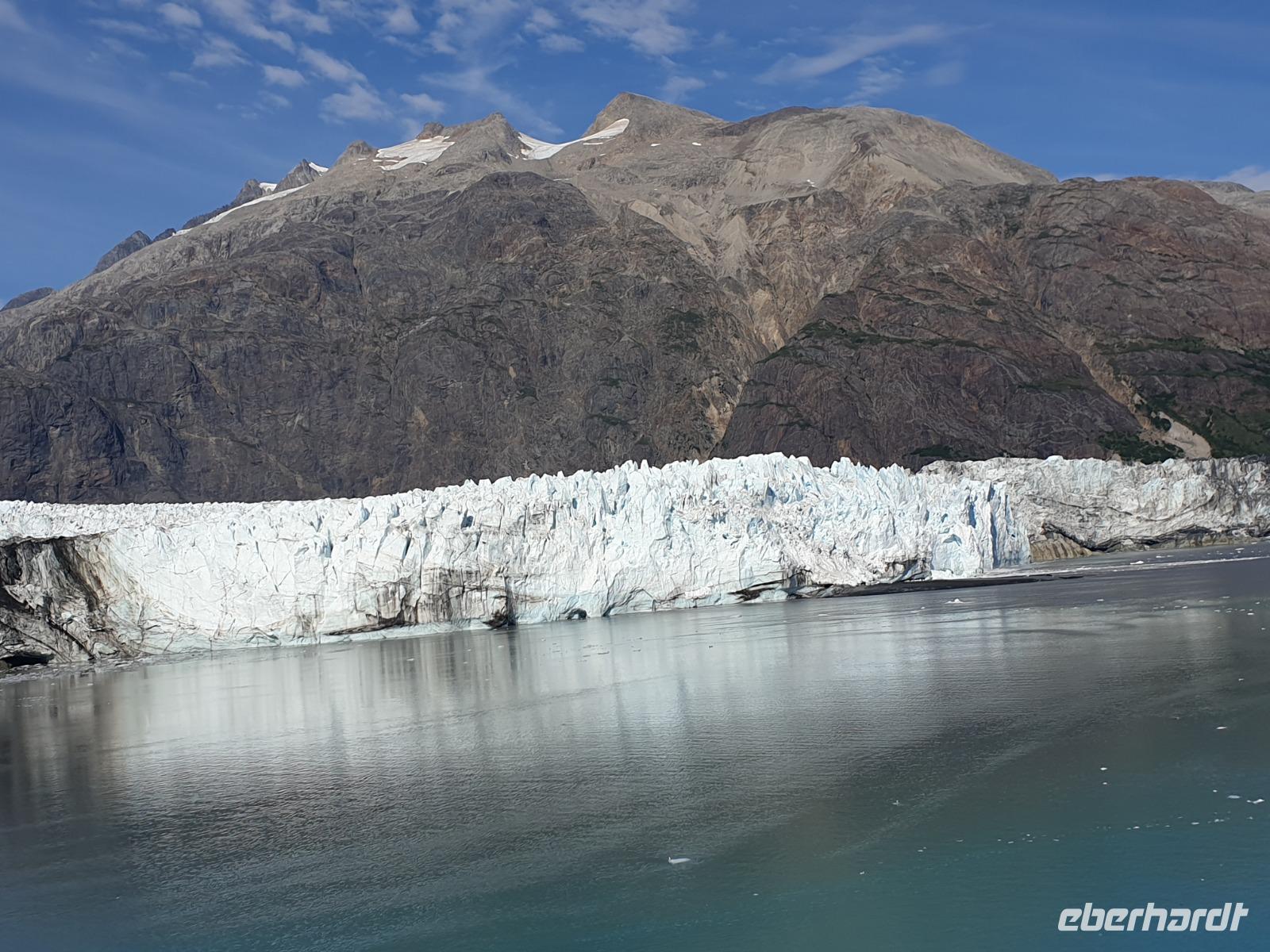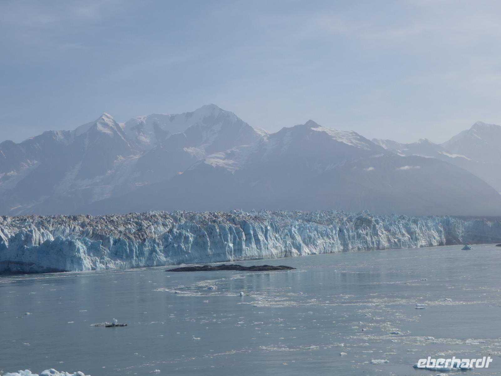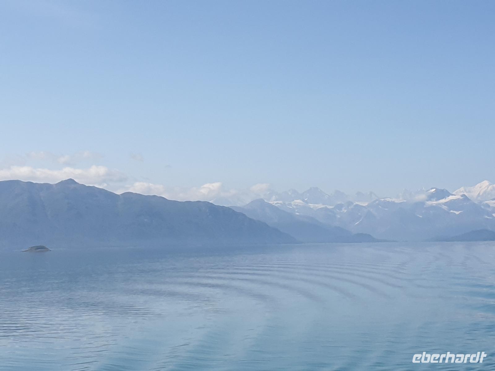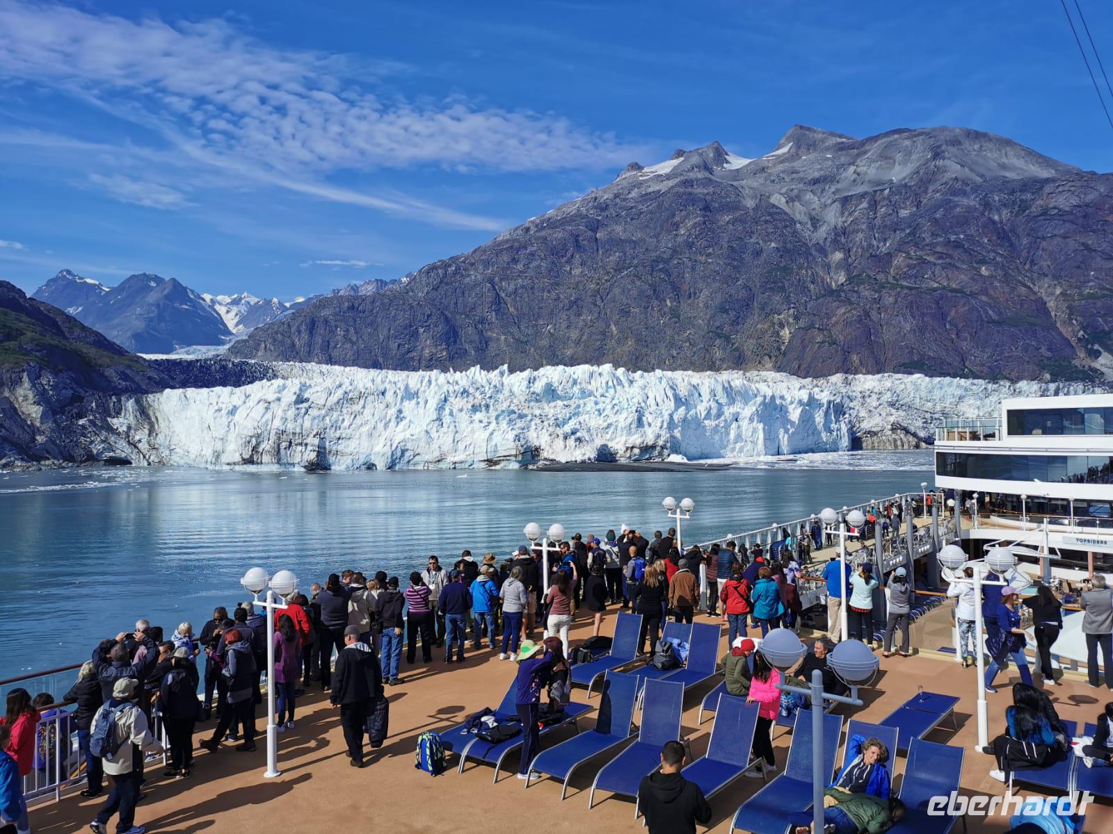 Der letzte Seetag bringt uns ganz nah an den gigantischen Hubbard Gletscher, Nordamerikas größten Gezeitengletscher. Er besteht aus 3.500km² blauen Eis und ist einer der aktivsten Gletscher in Alaska. Das können wir hautnah miterleben! Es klingt wie ein Gewitter, das aufzieht, kurz bevor der Gletscher kalbt. Der Hubbard Gletscher befindet sich zu einem Teil in Ostalaska und zum anderen Teil in Yukon, Kanada. Er wurde nach Gardiner Hubbard, dem Präsidenten der Bell Telefongesellschaft benannt. Bevor der Hubbard Gletscher das Meer erreicht, verbindet er sich im Westen mit den Valerie Gletscher. Es ist ein einmaliges Erlebnis und wieder einmal haben wir den Jackpot in Sachen Wetter gezogen. Ein herrlicher Morgen, erst liegt noch der Nebel über den „Hubbi", aber schon bald verschwindet diese und gibt die Sicht auf die wunderschönen in der Sonne glitzernde schneebedeckte Gipfel. Das auf dem Wasser treibende Eis mit dem gigantischen Gletscher im Hintergrund ist definitiv ein Bild für die Ewigkeit.