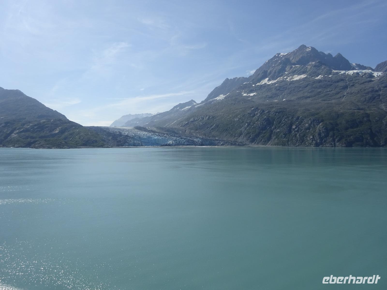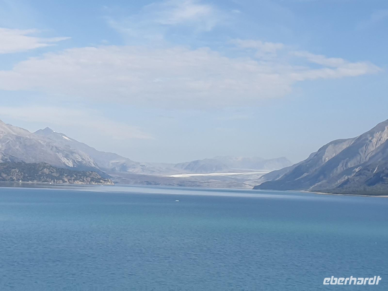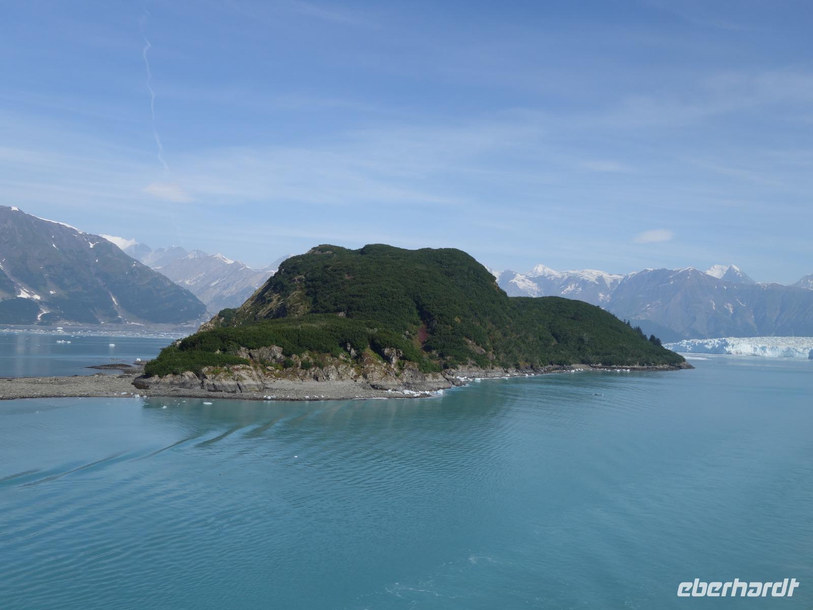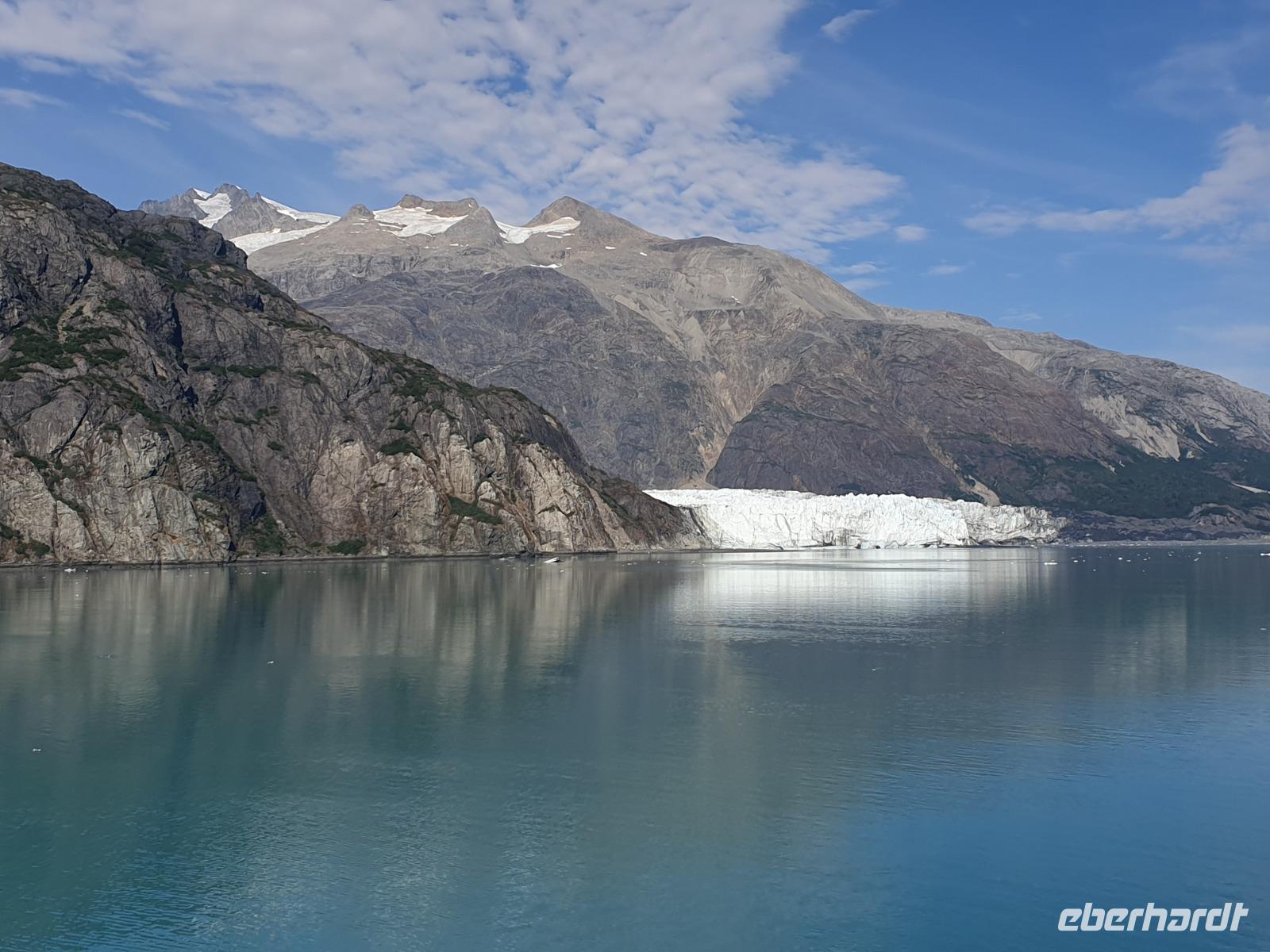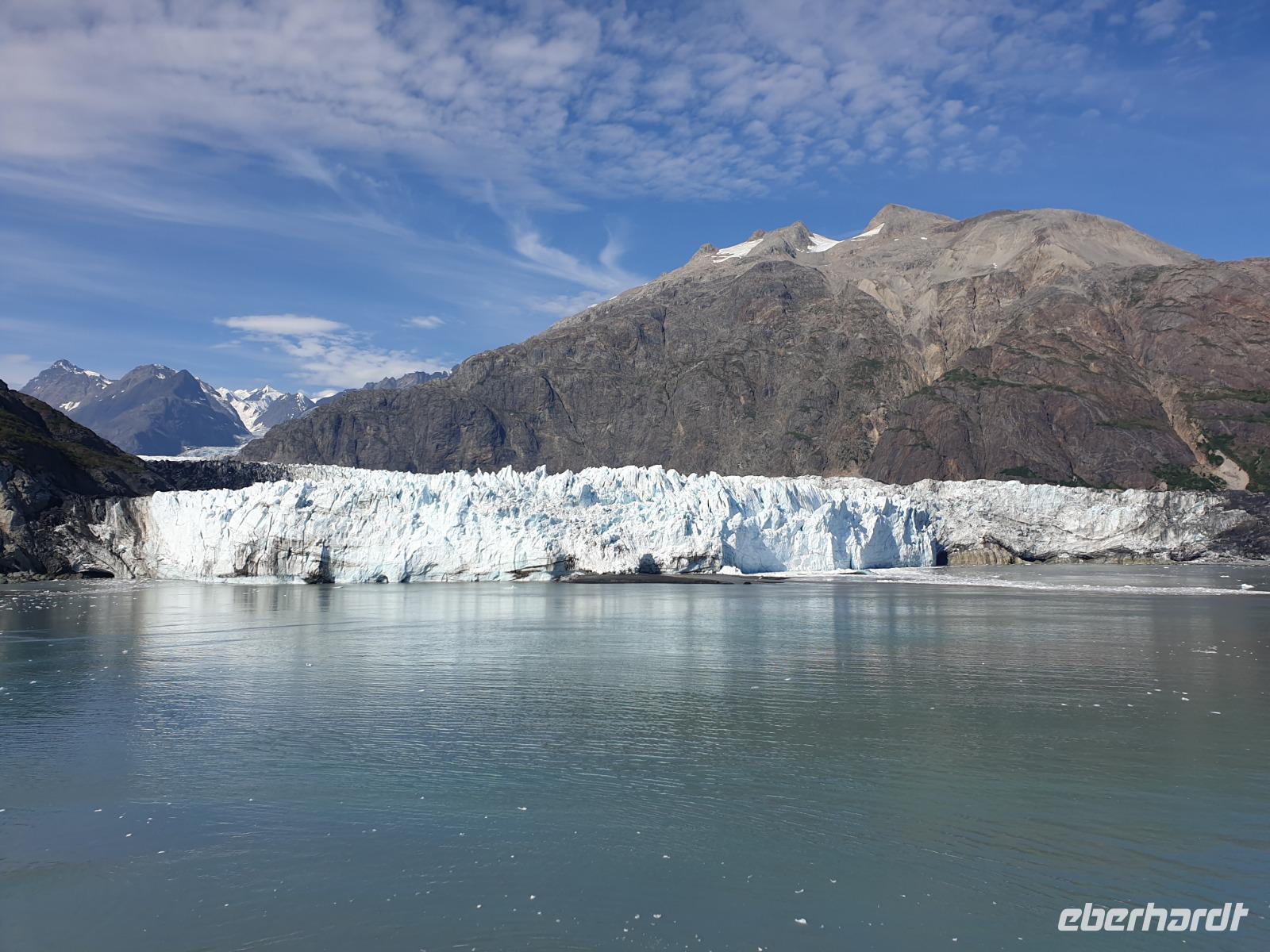 Der letzte Seetag bringt uns ganz nah an den gigantischen Hubbard Gletscher, Nordamerikas größten Gezeitengletscher. Er besteht aus 3.500km² blauen Eis und ist einer der aktivsten Gletscher in Alaska. Das können wir hautnah miterleben! Es klingt wie ein Gewitter, das aufzieht, kurz bevor der Gletscher kalbt. Der Hubbard Gletscher befindet sich zu einem Teil in Ostalaska und zum anderen Teil in Yukon, Kanada. Er wurde nach Gardiner Hubbard, dem Präsidenten der Bell Telefongesellschaft benannt. Bevor der Hubbard Gletscher das Meer erreicht, verbindet er sich im Westen mit den Valerie Gletscher. Es ist ein einmaliges Erlebnis und wieder einmal haben wir den Jackpot in Sachen Wetter gezogen. Ein herrlicher Morgen, erst liegt noch der Nebel über den „Hubbi", aber schon bald verschwindet diese und gibt die Sicht auf die wunderschönen in der Sonne glitzernde schneebedeckte Gipfel. Das auf dem Wasser treibende Eis mit dem gigantischen Gletscher im Hintergrund ist definitiv ein Bild für die Ewigkeit.