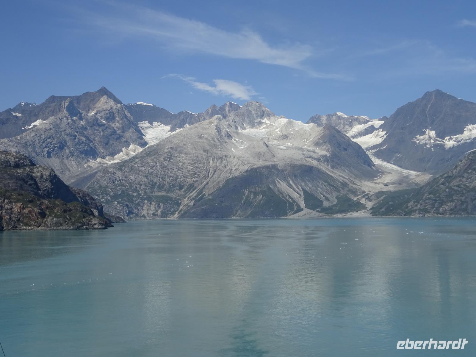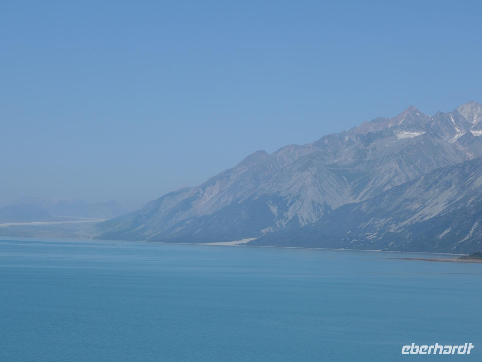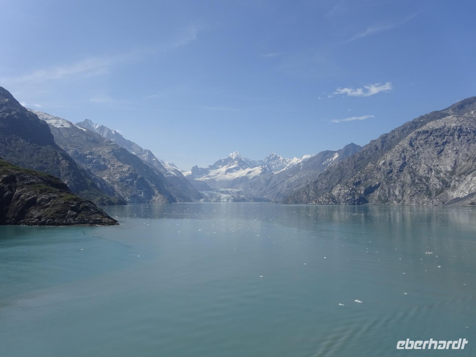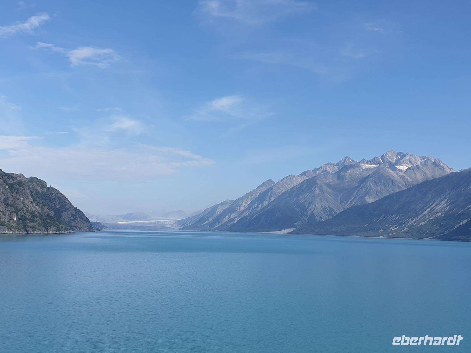 Der letzte Seetag bringt uns ganz nah an den gigantischen Hubbard Gletscher, Nordamerikas größten Gezeitengletscher. Er besteht aus 3.500km² blauen Eis und ist einer der aktivsten Gletscher in Alaska. Das können wir hautnah miterleben! Es klingt wie ein Gewitter, das aufzieht, kurz bevor der Gletscher kalbt. Der Hubbard Gletscher befindet sich zu einem Teil in Ostalaska und zum anderen Teil in Yukon, Kanada. Er wurde nach Gardiner Hubbard, dem Präsidenten der Bell Telefongesellschaft benannt. Bevor der Hubbard Gletscher das Meer erreicht, verbindet er sich im Westen mit den Valerie Gletscher. Es ist ein einmaliges Erlebnis und wieder einmal haben wir den Jackpot in Sachen Wetter gezogen. Ein herrlicher Morgen, erst liegt noch der Nebel über den „Hubbi", aber schon bald verschwindet diese und gibt die Sicht auf die wunderschönen in der Sonne glitzernde schneebedeckte Gipfel. Das auf dem Wasser treibende Eis mit dem gigantischen Gletscher im Hintergrund ist definitiv ein Bild für die Ewigkeit.